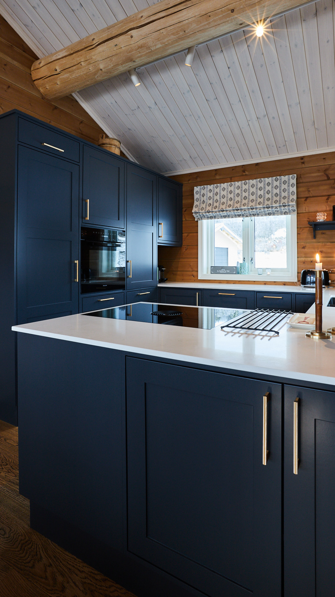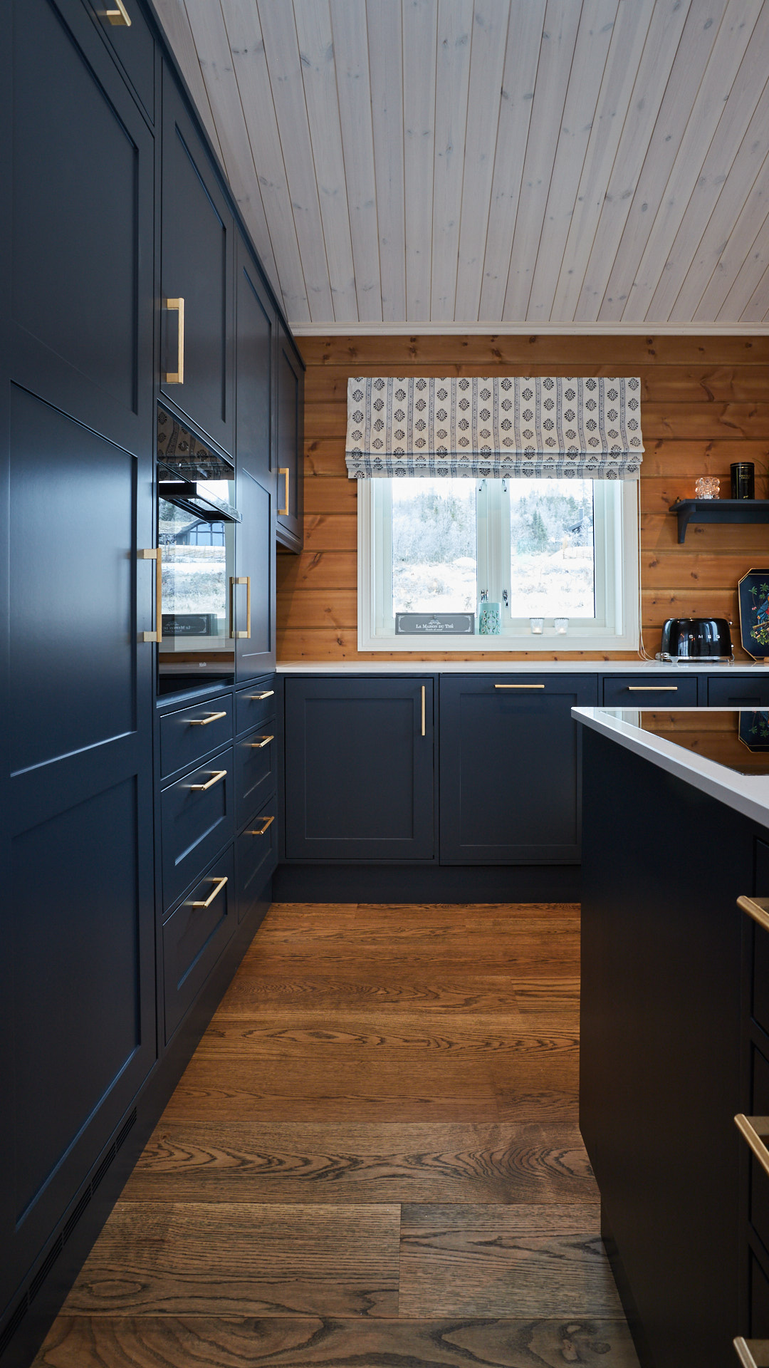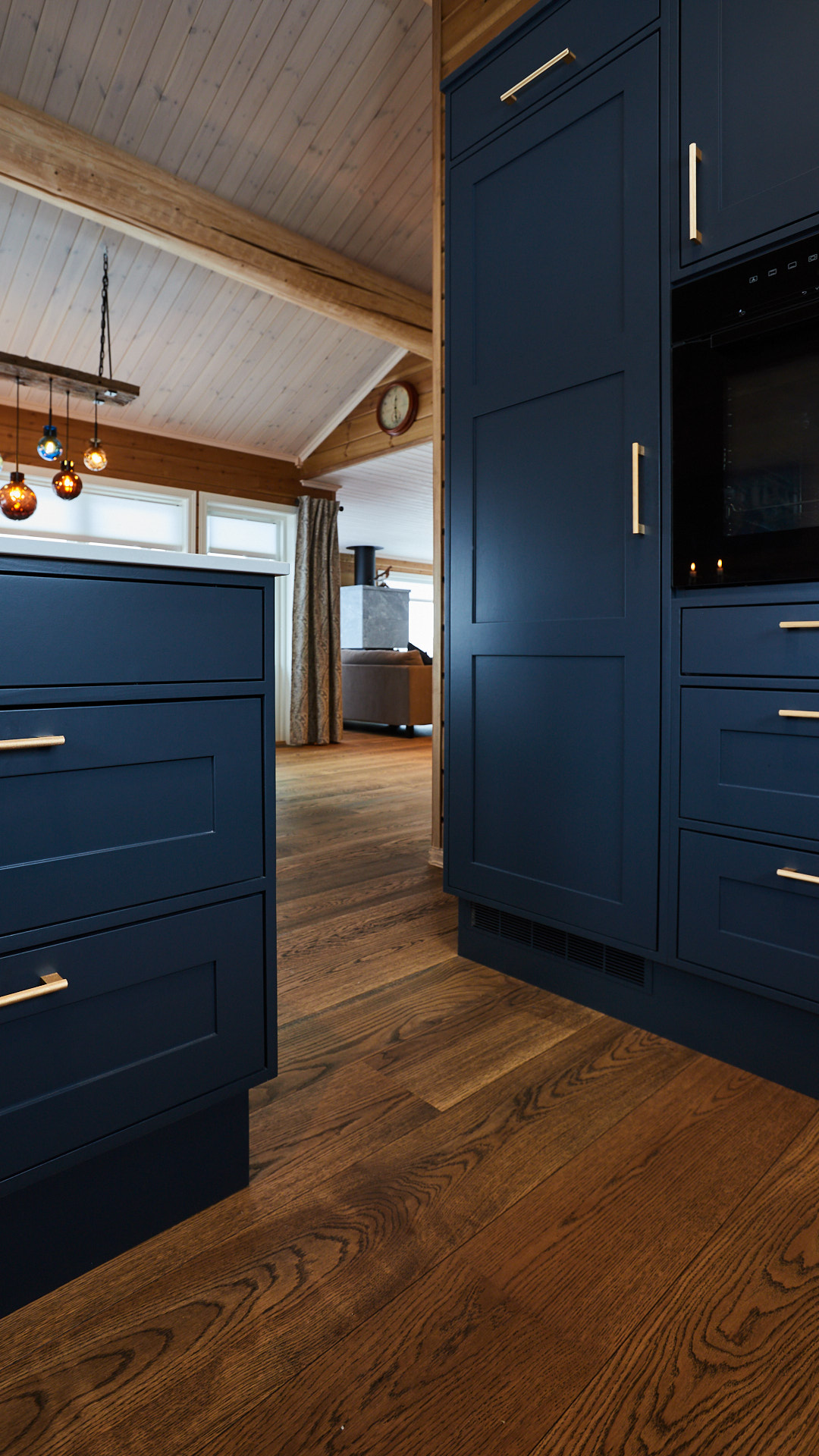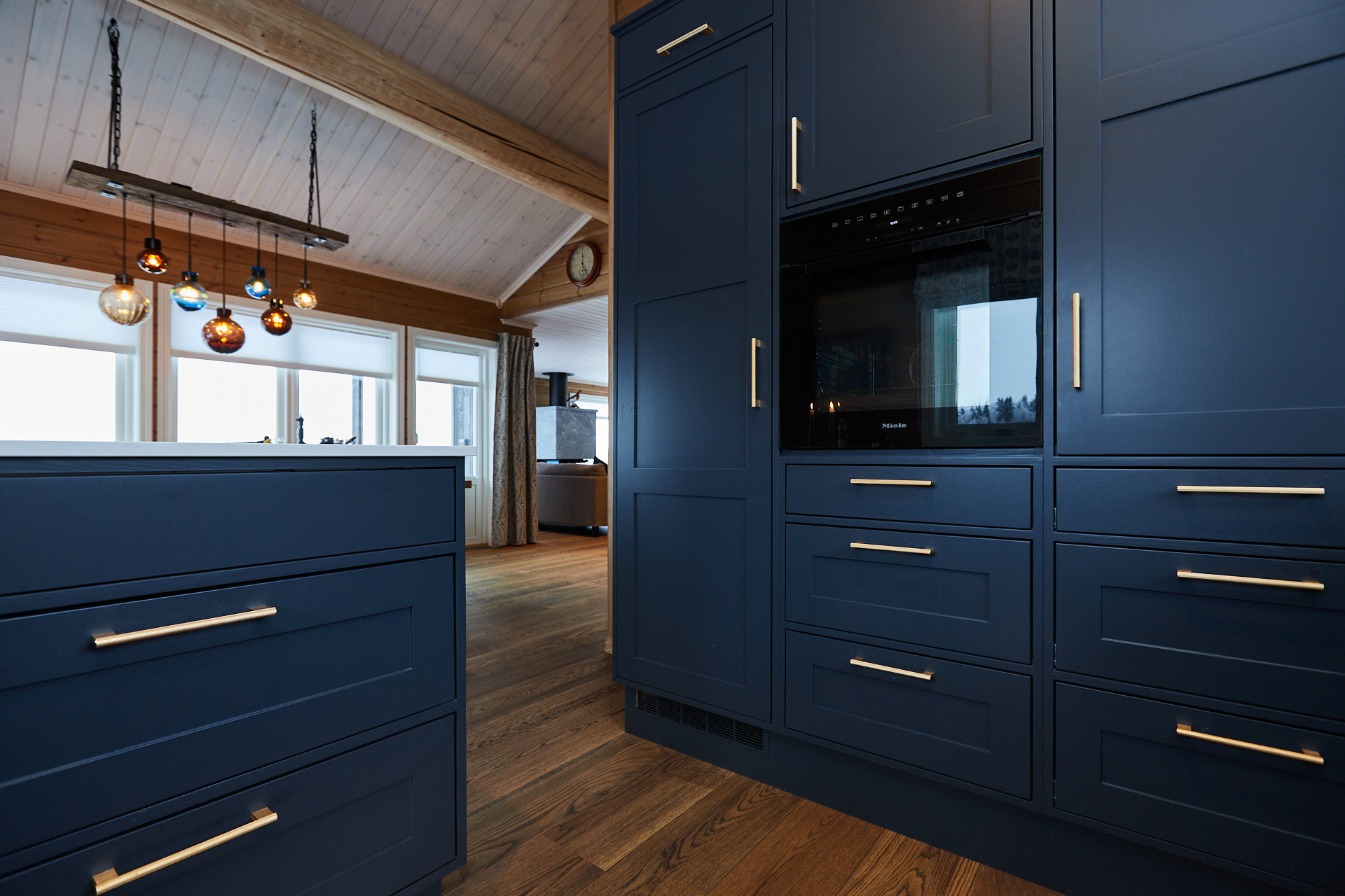 Denne markante og dype blåfargen heter Sophisticated Blue. Alle skrog er laget av kvistfri furu, med fronter av valchromat. Skuffer og skap har grep med børstet gull-farge som utgjør en god kontrast mot det kalde. Benkeplaten er 2cm Silestone og hvitevarene er levert av Bergro As.