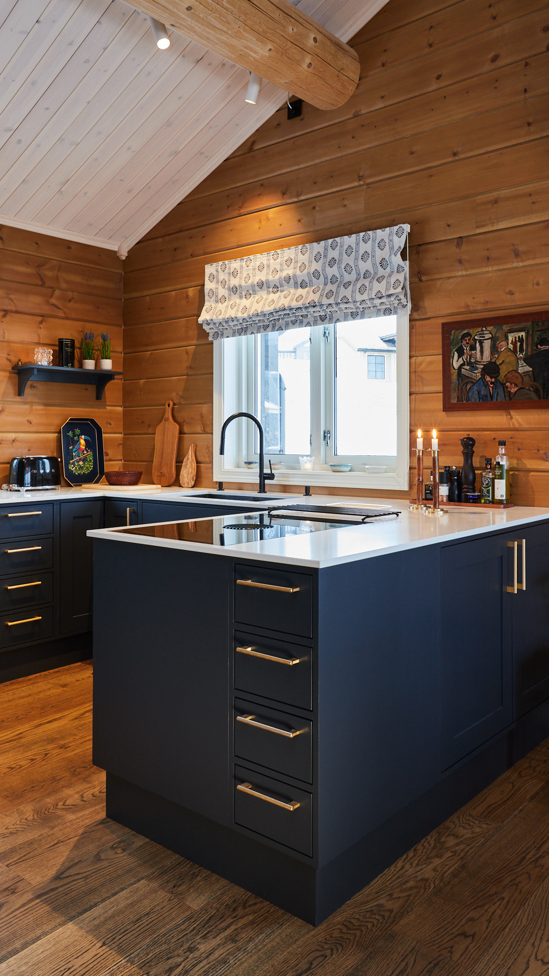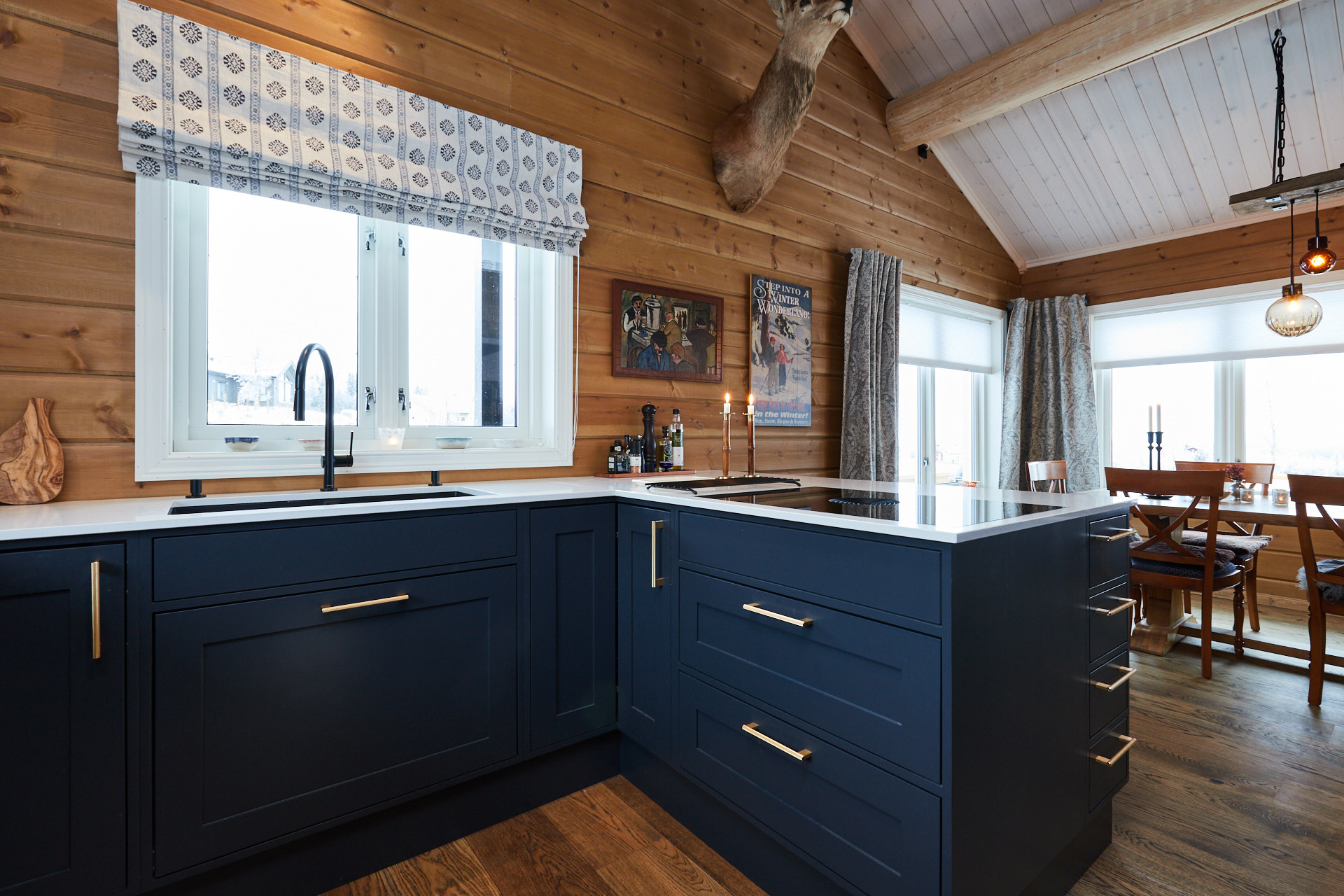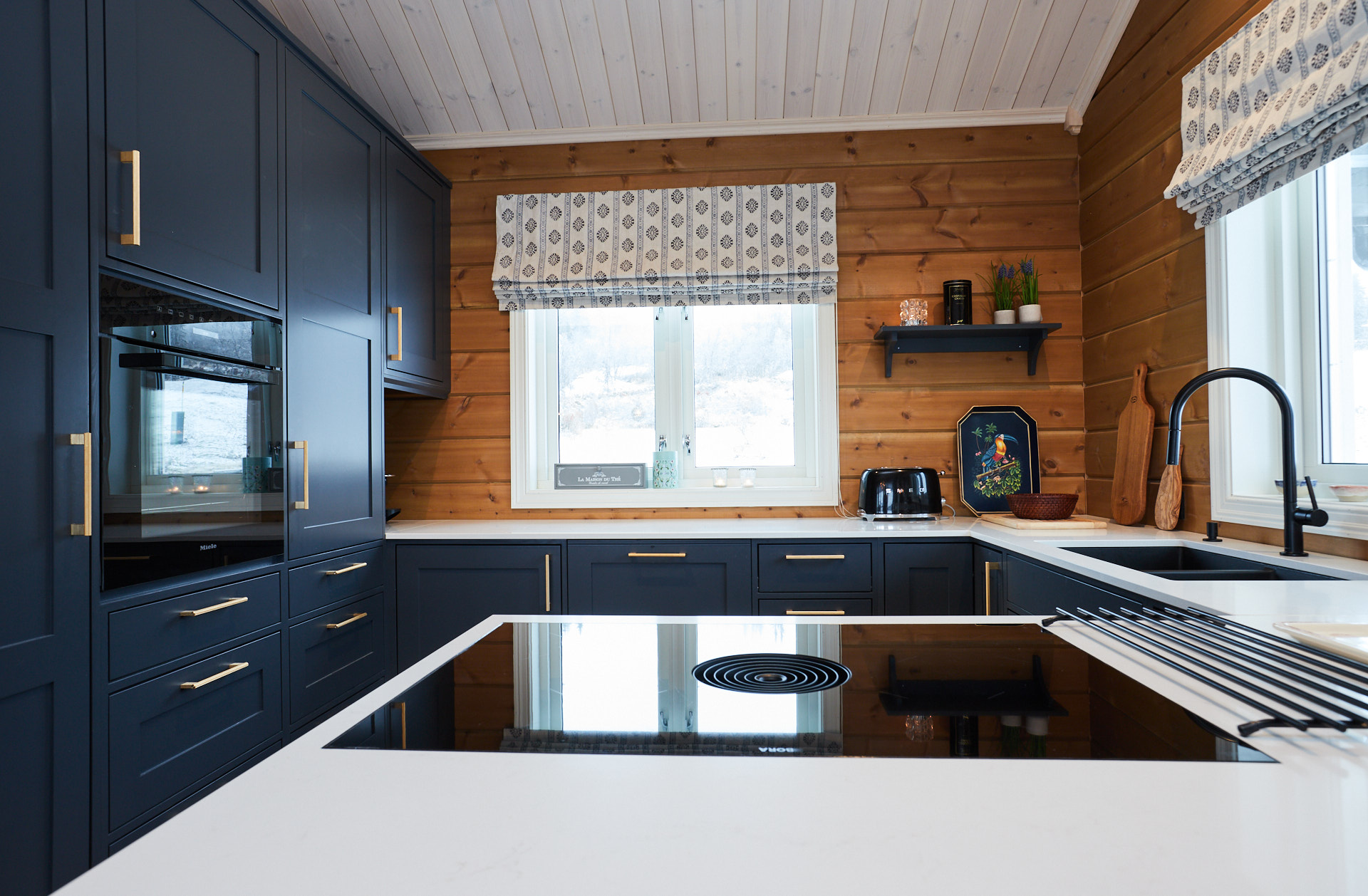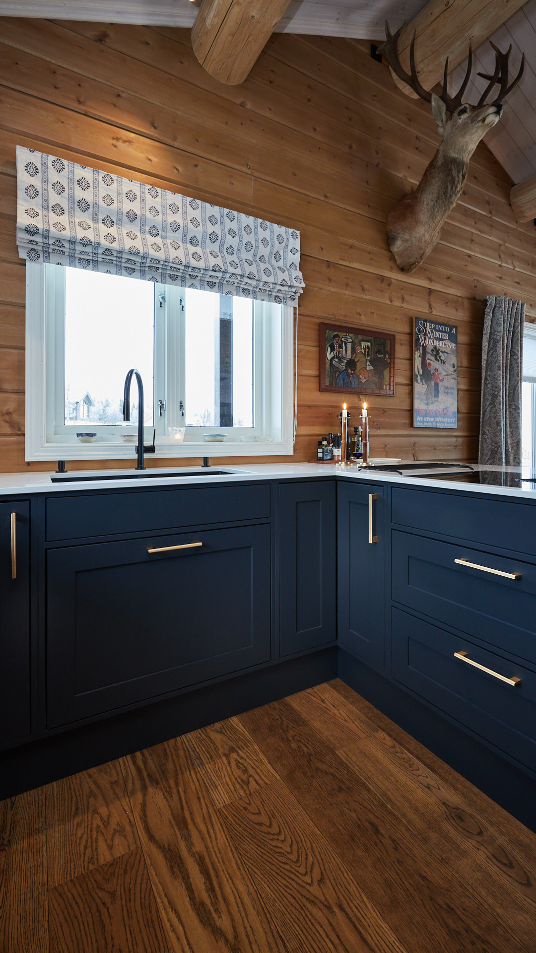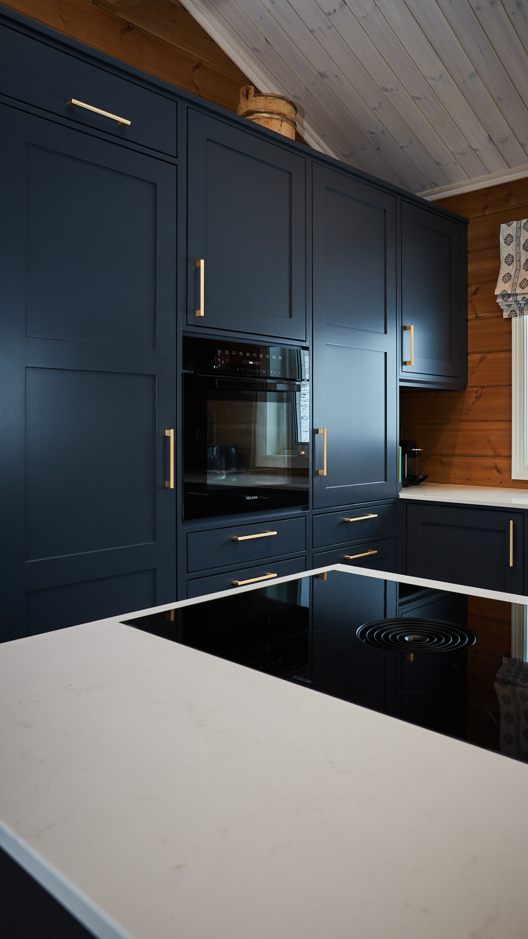 Denne markante og dype blåfargen heter Sophisticated Blue. Alle skrog er laget av kvistfri furu, med fronter av valchromat. Skuffer og skap har grep med børstet gull-farge som utgjør en god kontrast mot det kalde. Benkeplaten er 2cm Silestone og hvitevarene er levert av Bergro As.