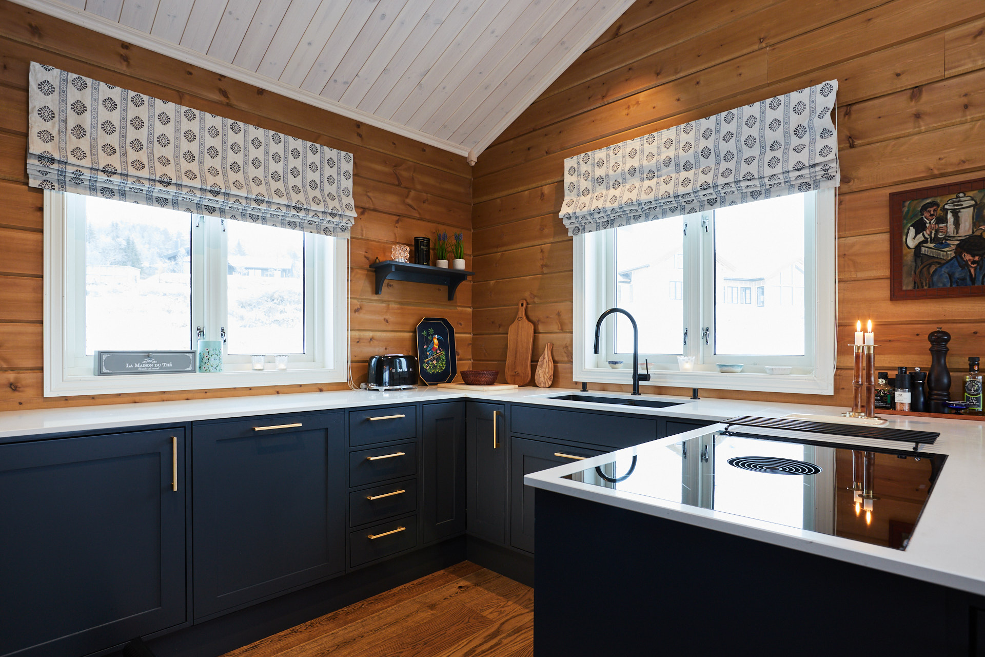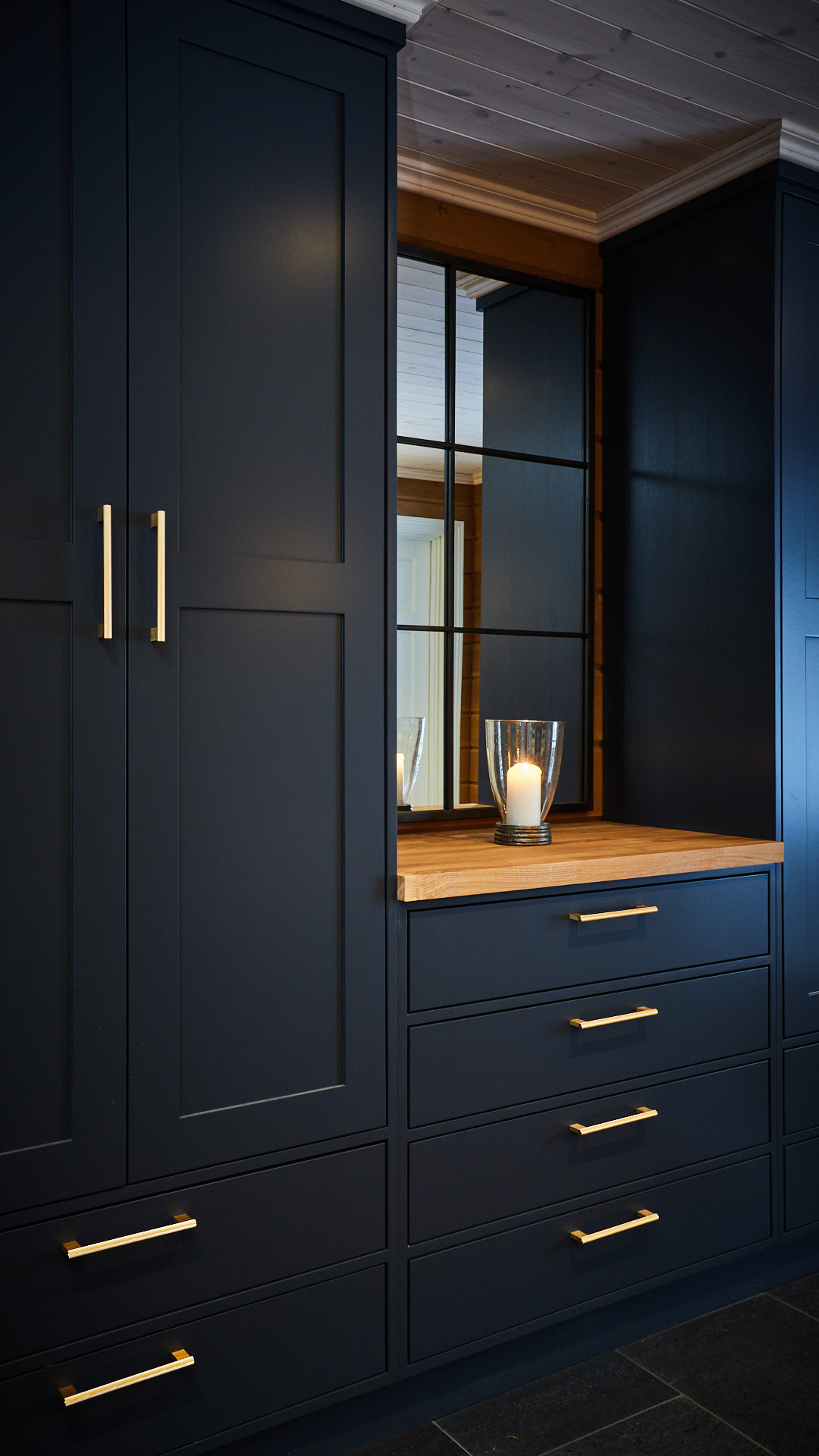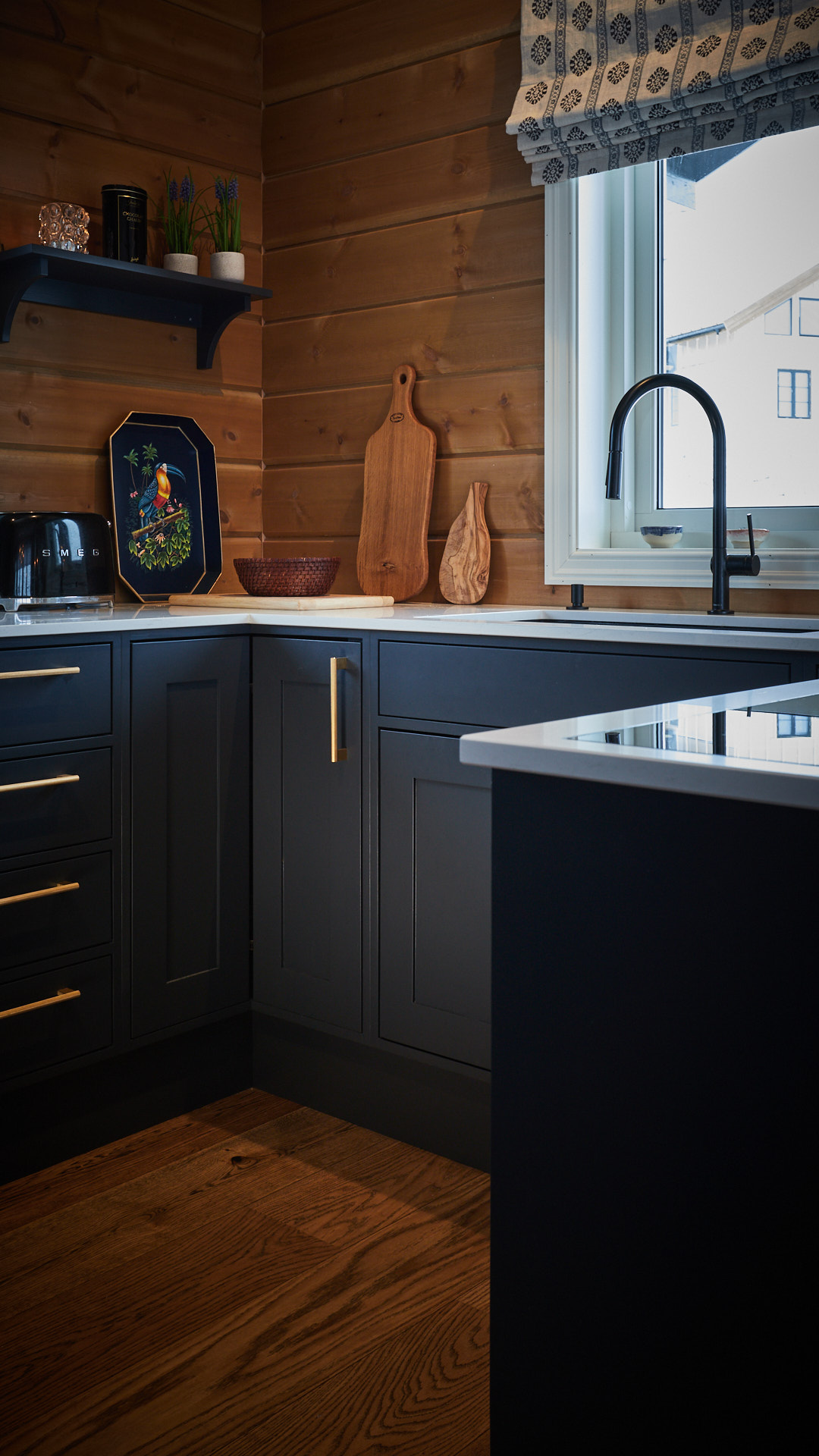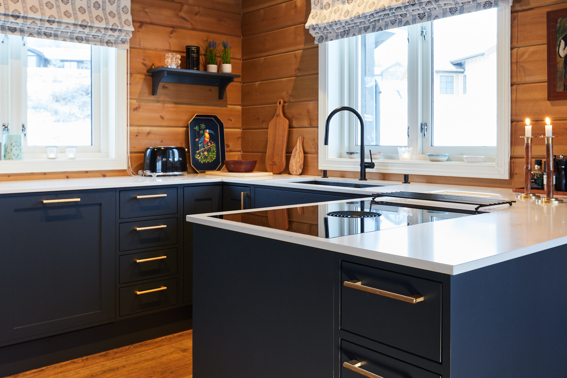 Denne markante og dype blåfargen heter Sophisticated Blue. Alle skrog er laget av kvistfri furu, med fronter av valchromat. Skuffer og skap har grep med børstet gull-farge som utgjør en god kontrast mot det kalde. Benkeplaten er 2cm Silestone og hvitevarene er levert av Bergro As.