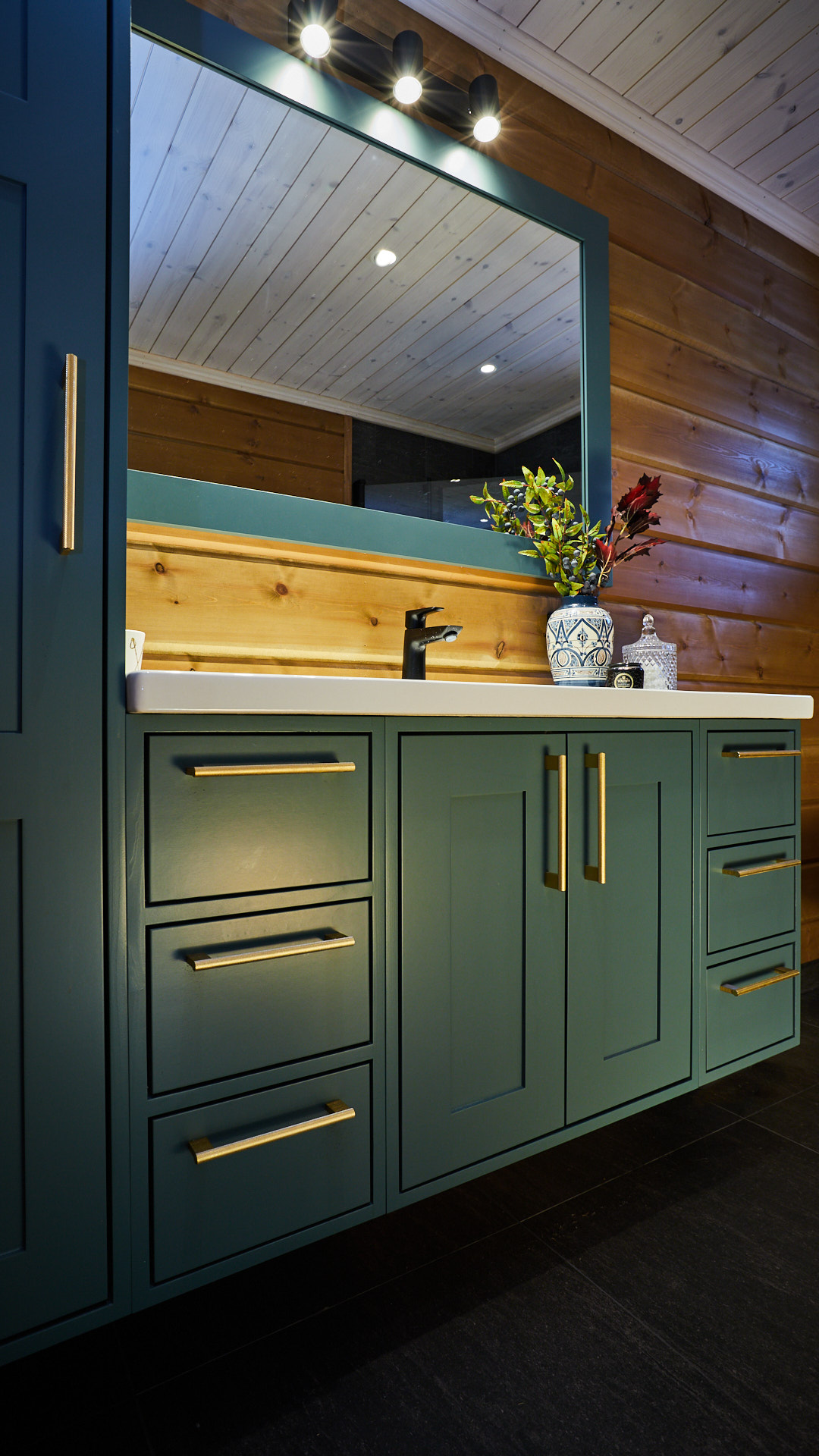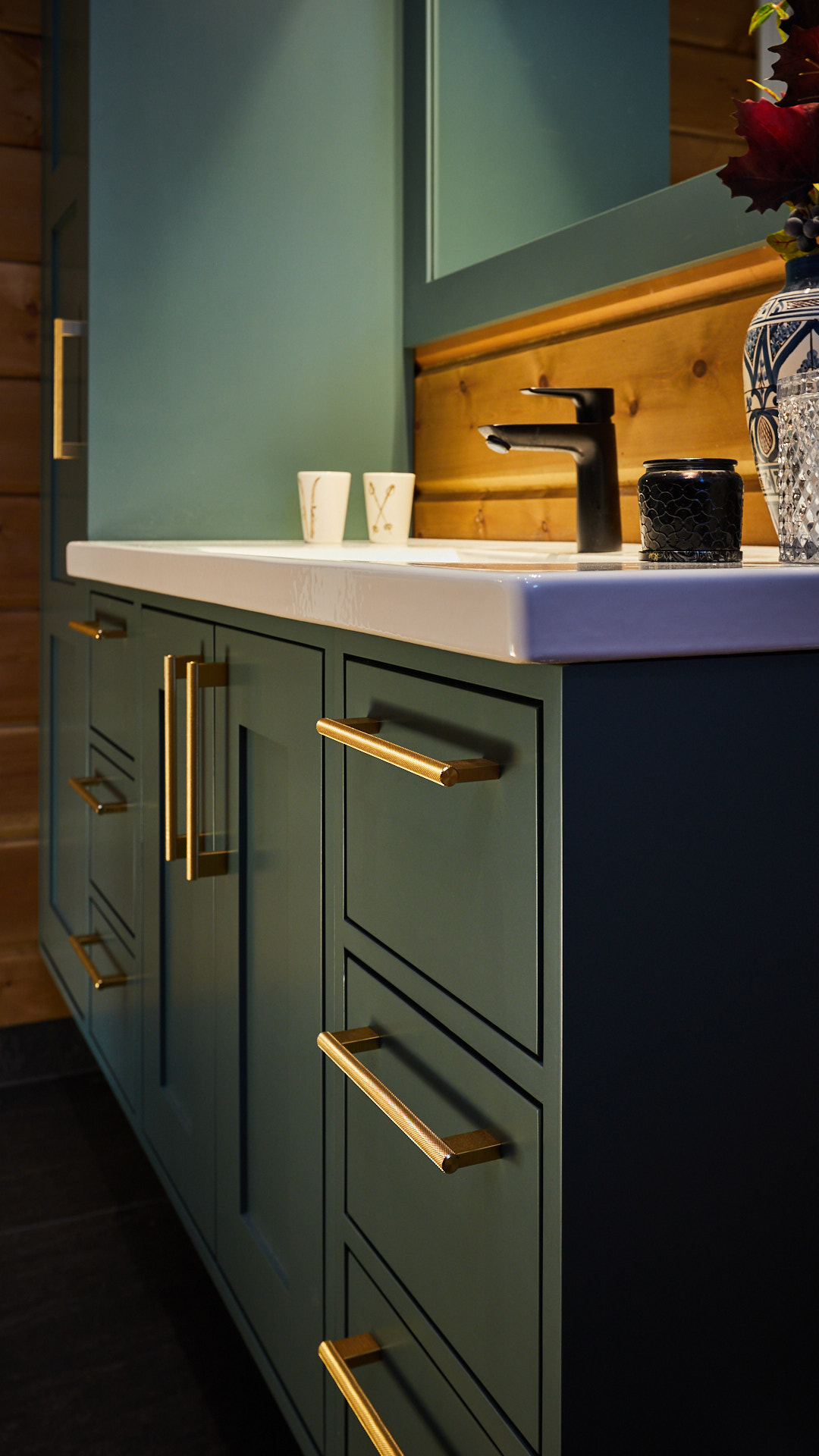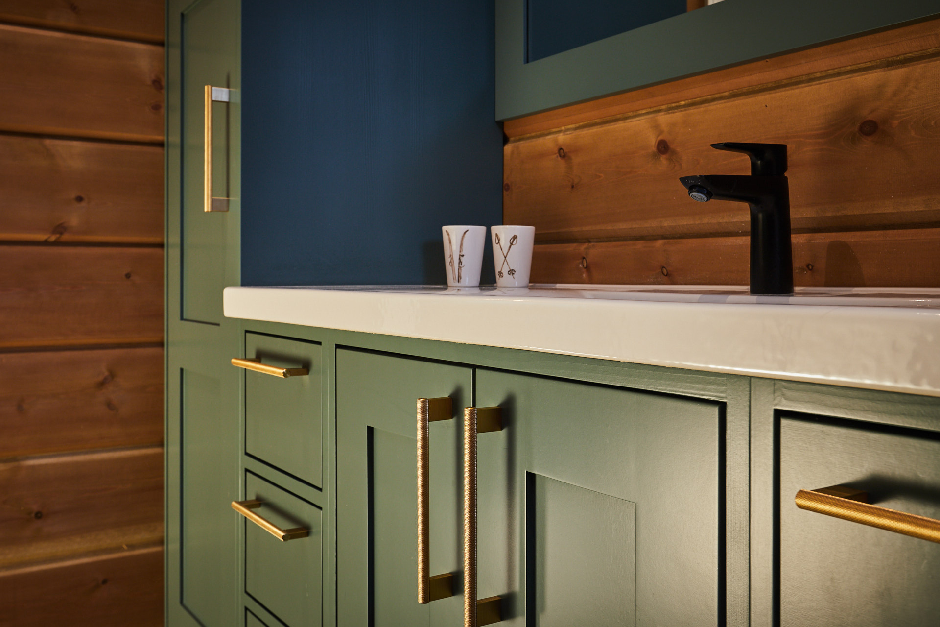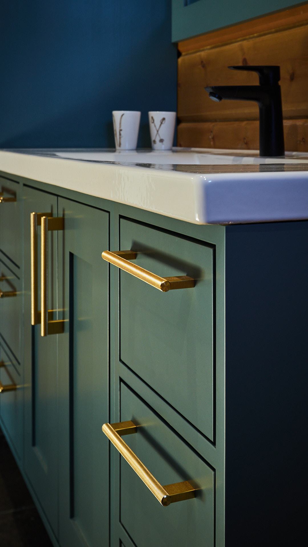 Baderomsinnredningen byr også på oppbevaringsplass, med skuffer og høyskap. Skrogene er laget av kvistfri furu og fronter er av valchromat malt i en farge som heter Balance - en nydelig kombinasjon med skuffehåndtak i gullfarge.