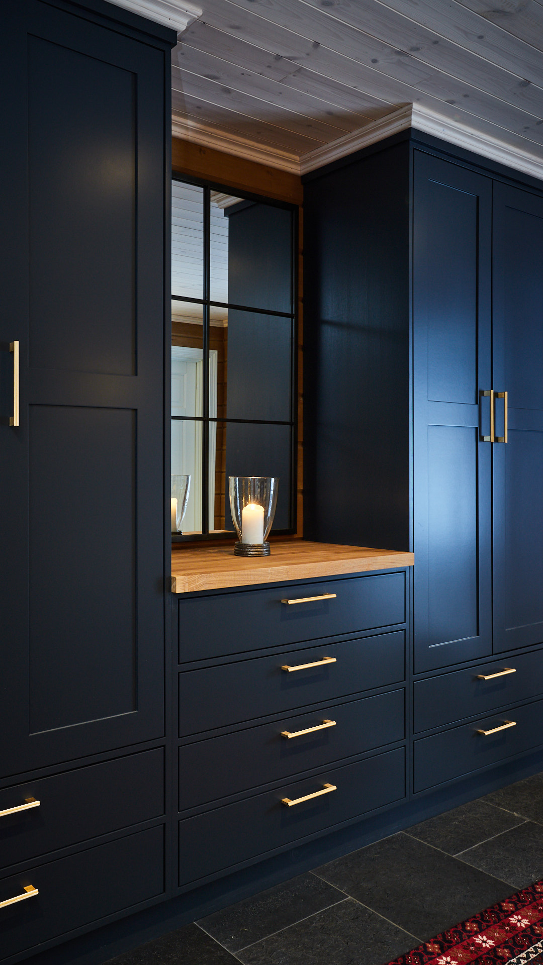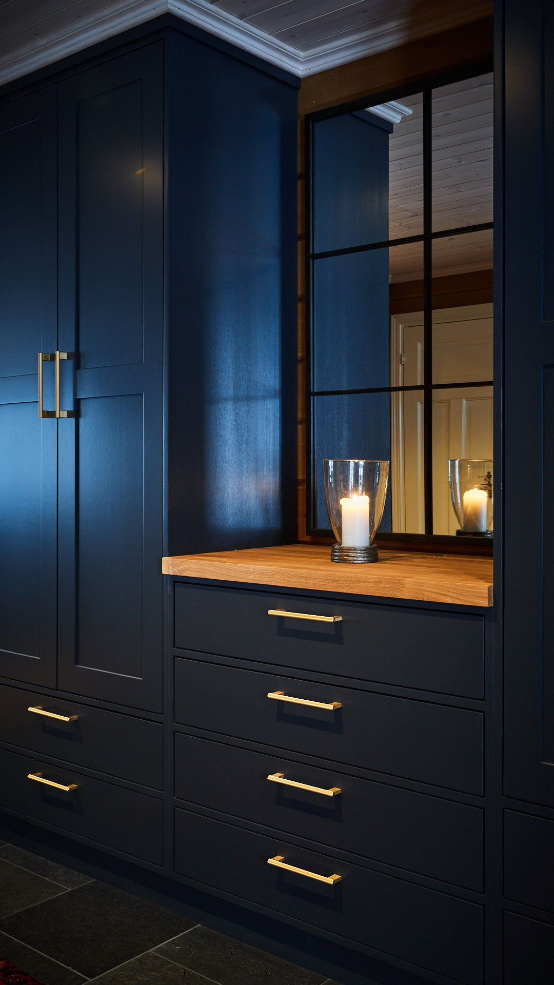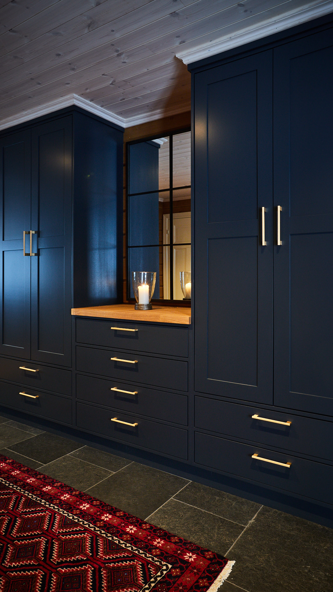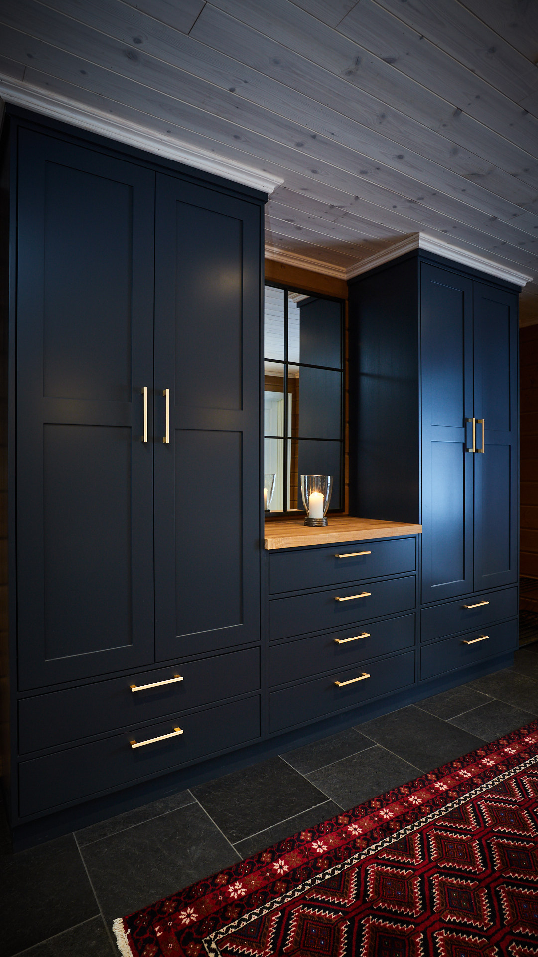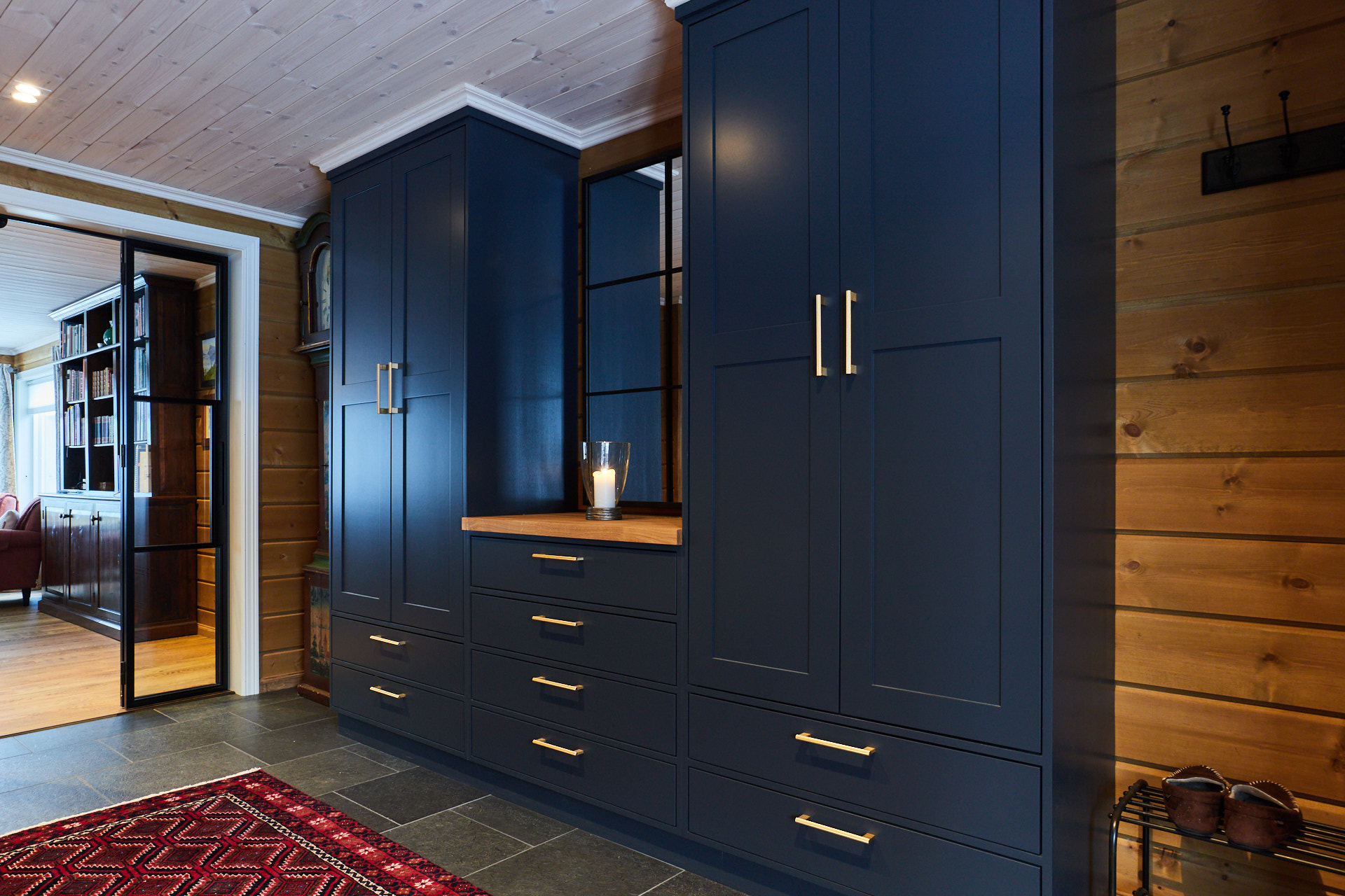 I entreen har vi laget en garderobeløsning med to store skap som går til tak, samt åtte romslige skuffer. I midten er det laget en benk av eik. Fargen her er samme som på kjøkkenet - Sophisticated Blue.