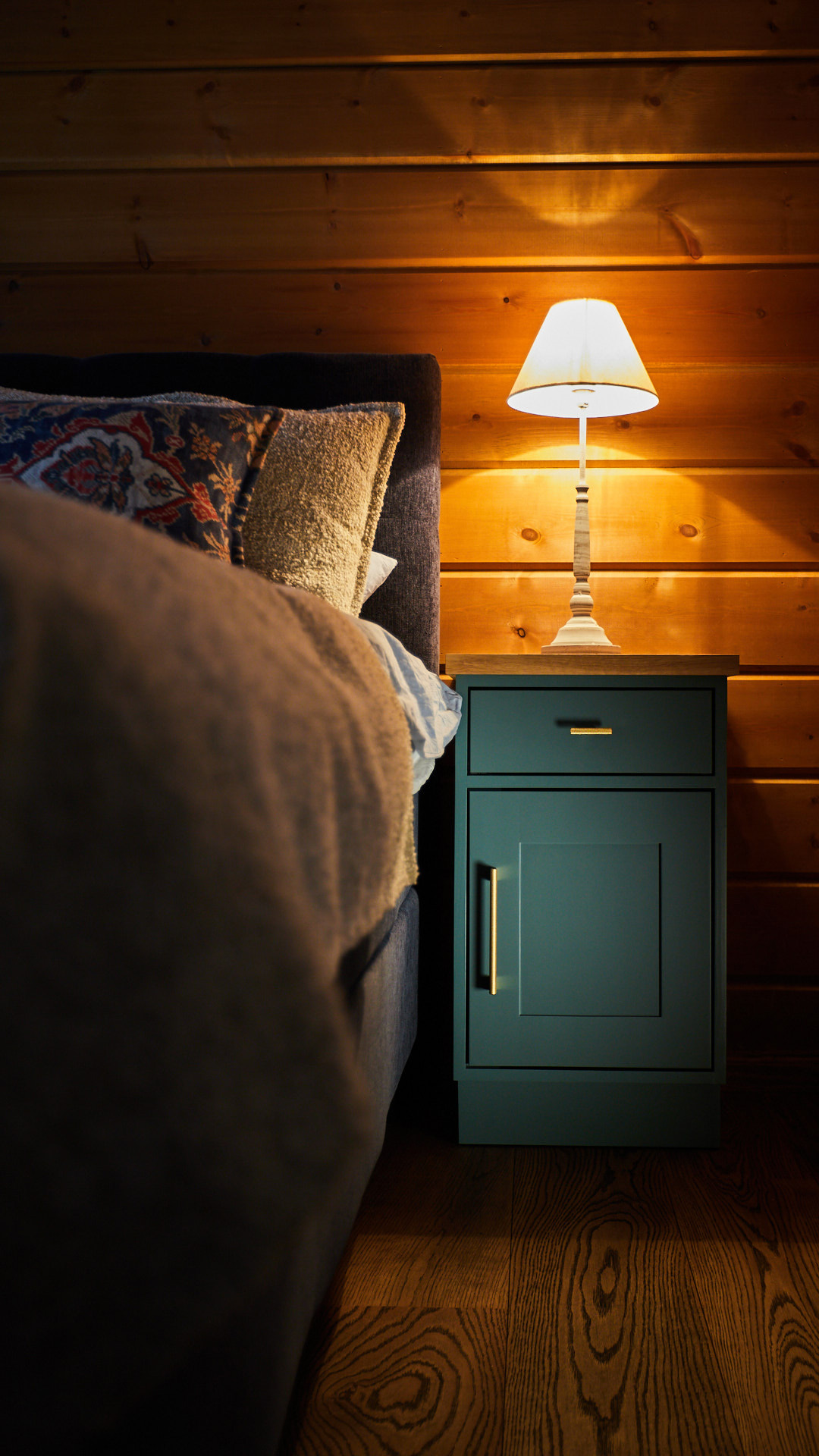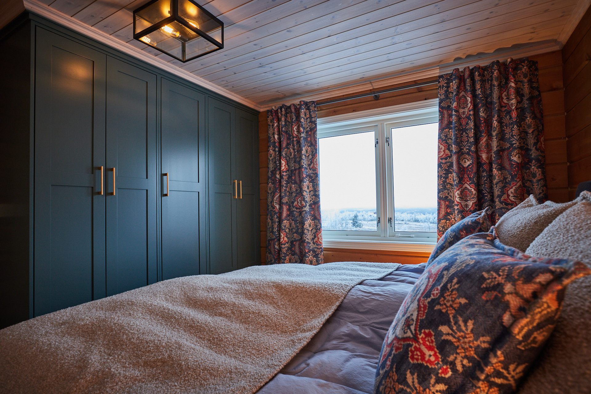 I denne hytta harmonerer all innredning i hele hytta. Alt har samme utførelse og stil, med en variasjon mellom blått og grønt i fargene.