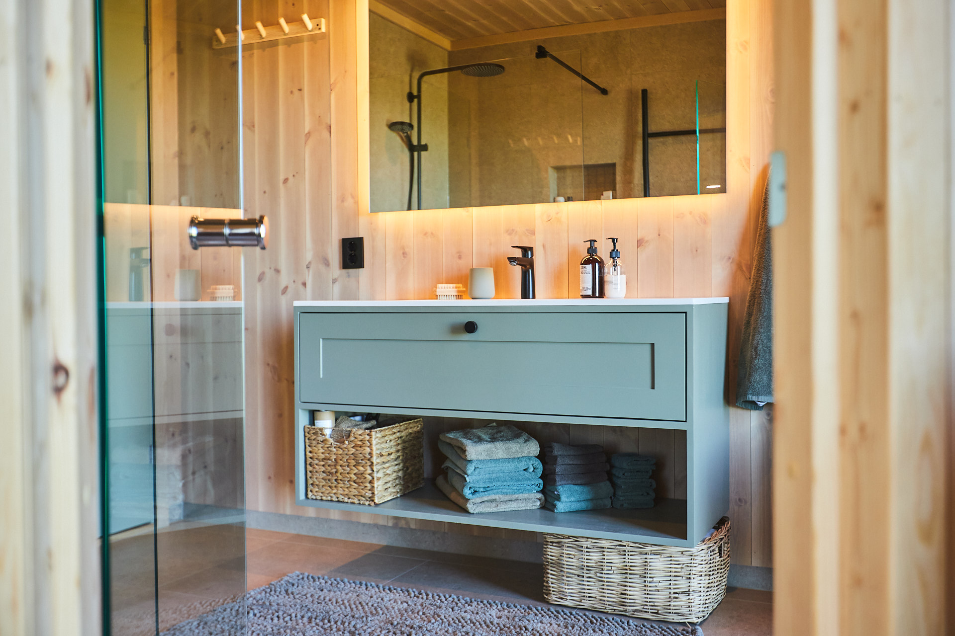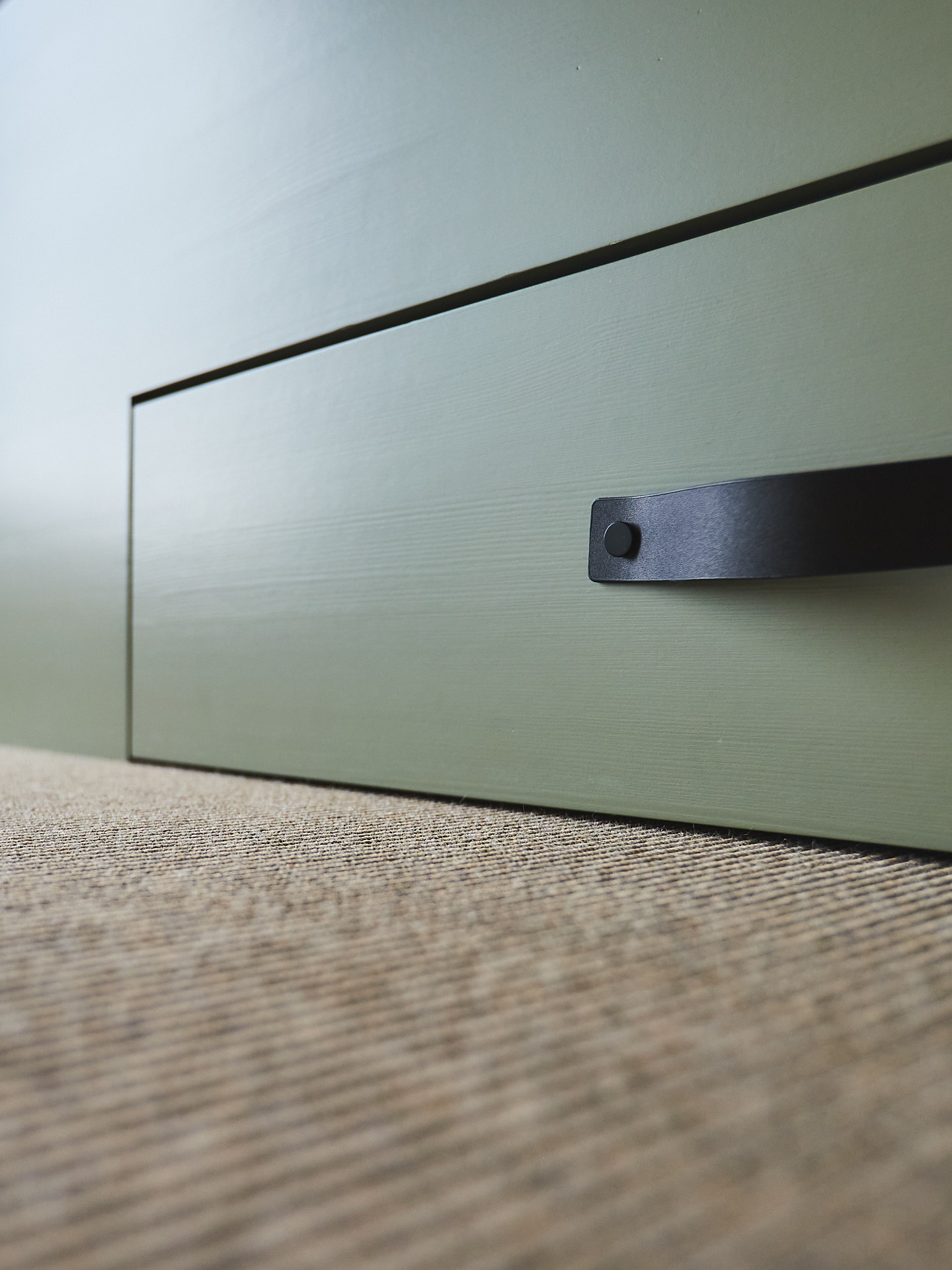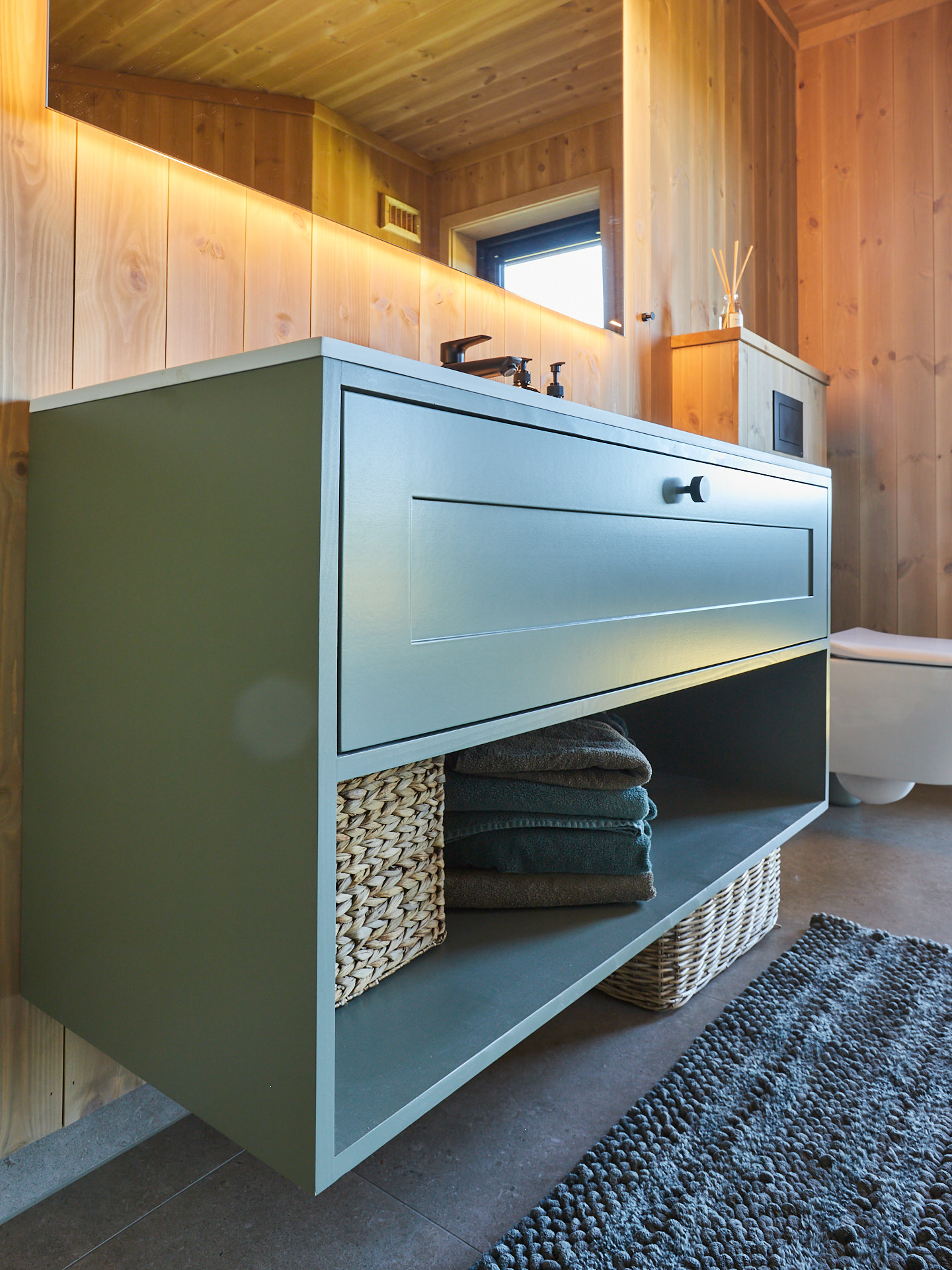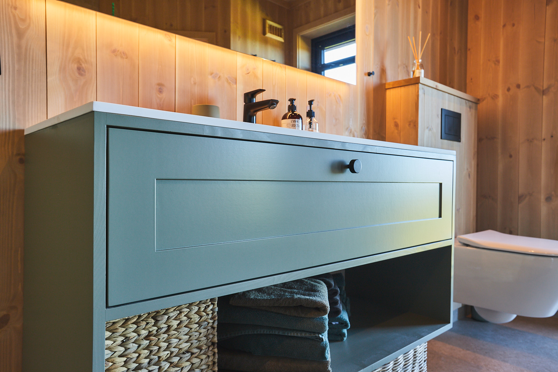Servantskap med skuff og hylle. Dette er malt i fargen Green Leaf, som de andre innredningene i hytta.