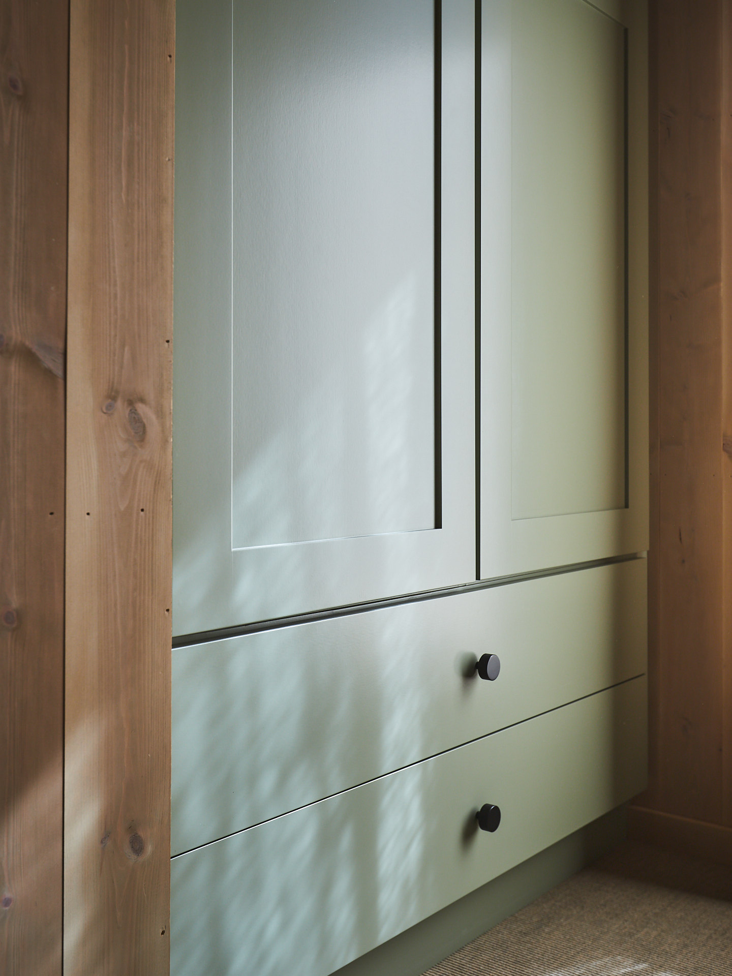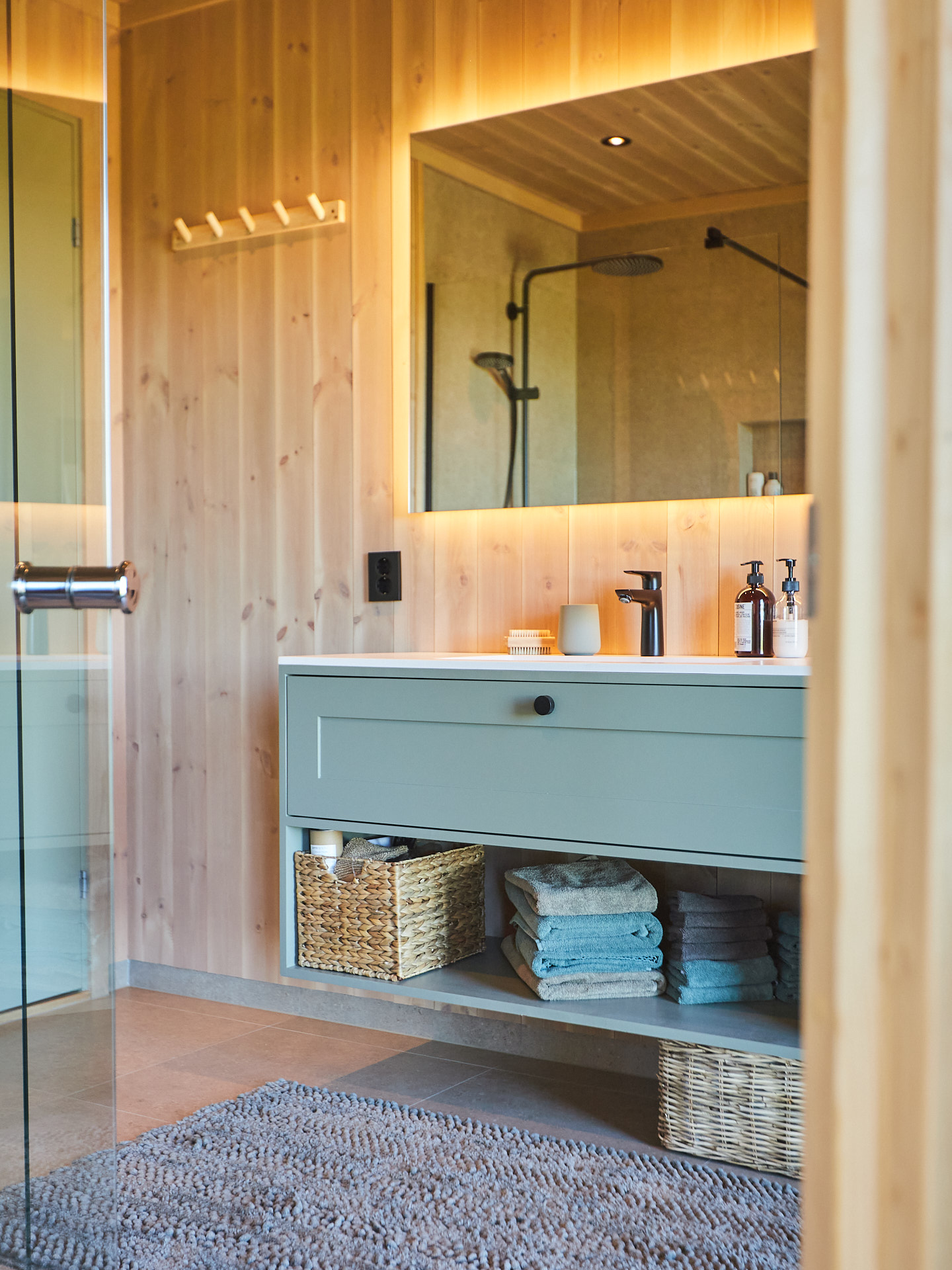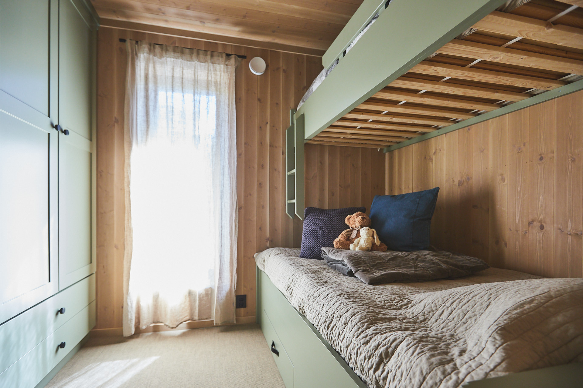 Servantskap med skuff og hylle. Dette er malt i fargen Green Leaf, som de andre innredningene i hytta.