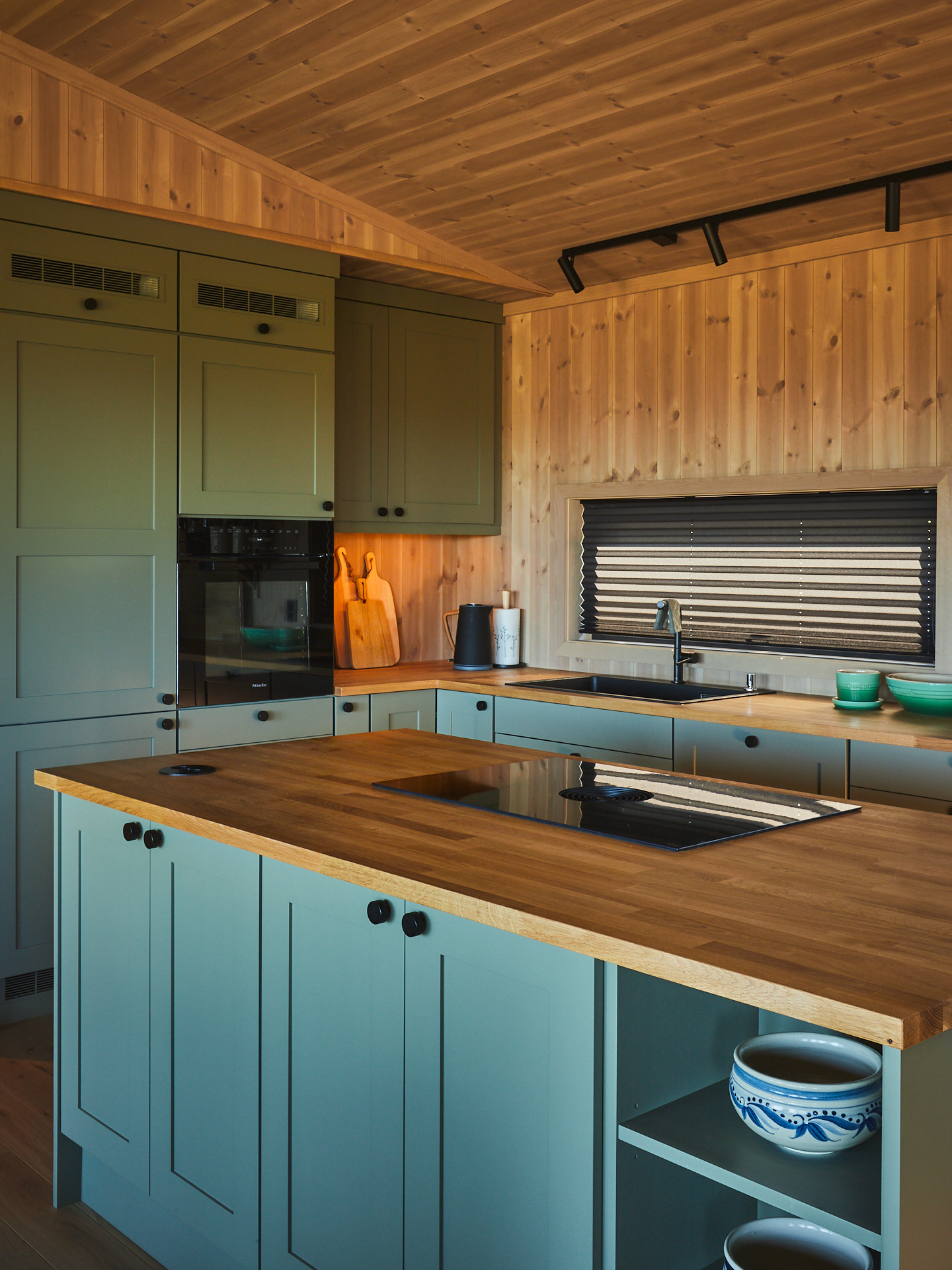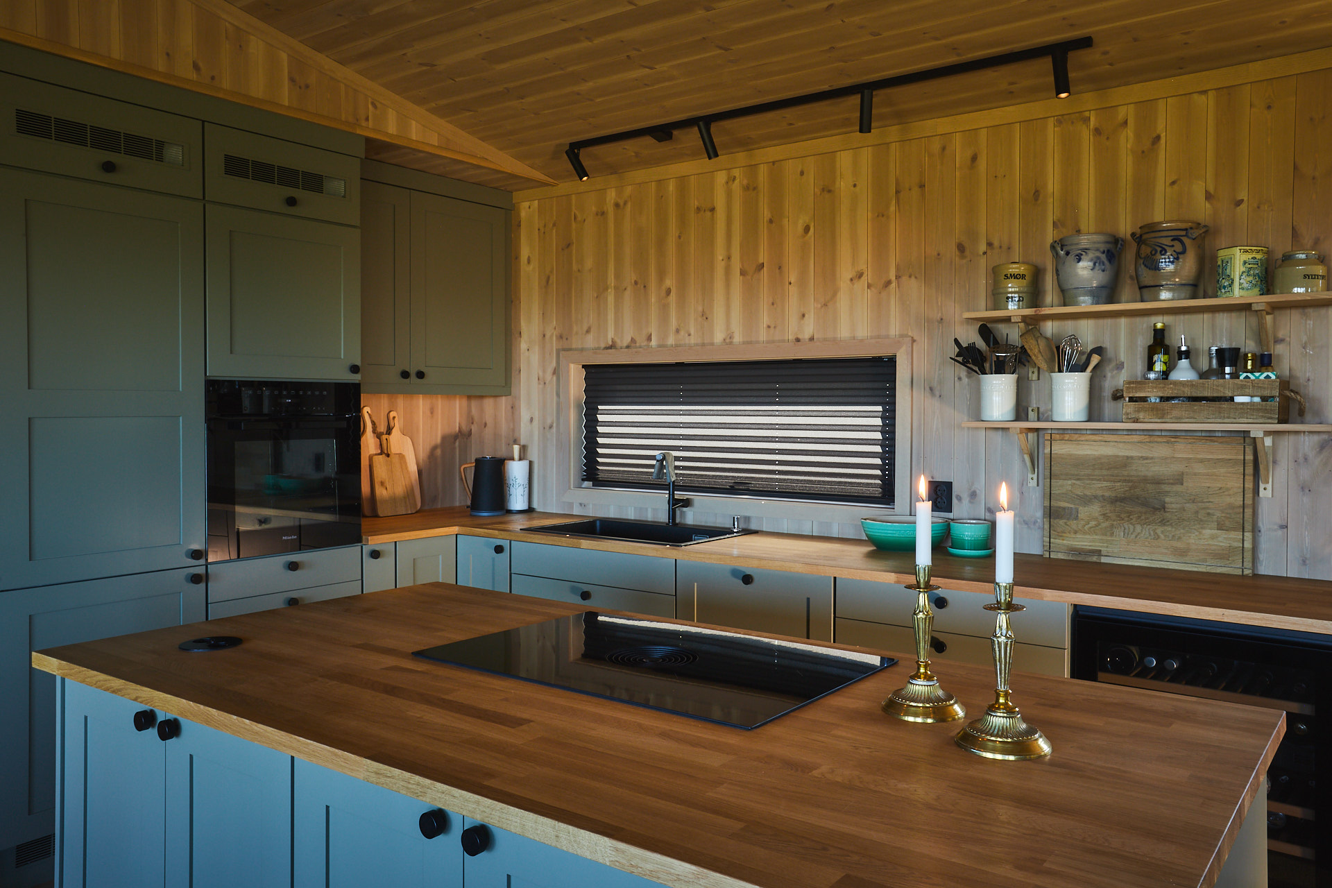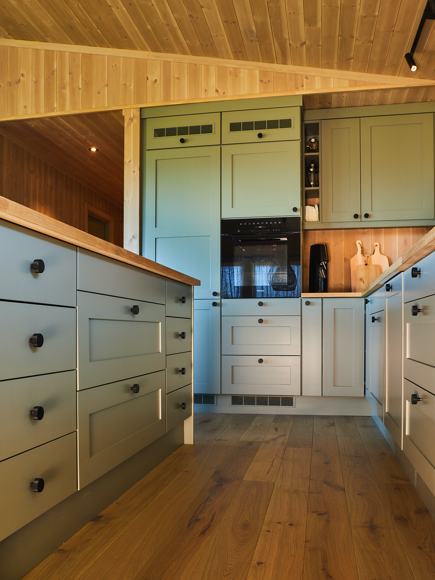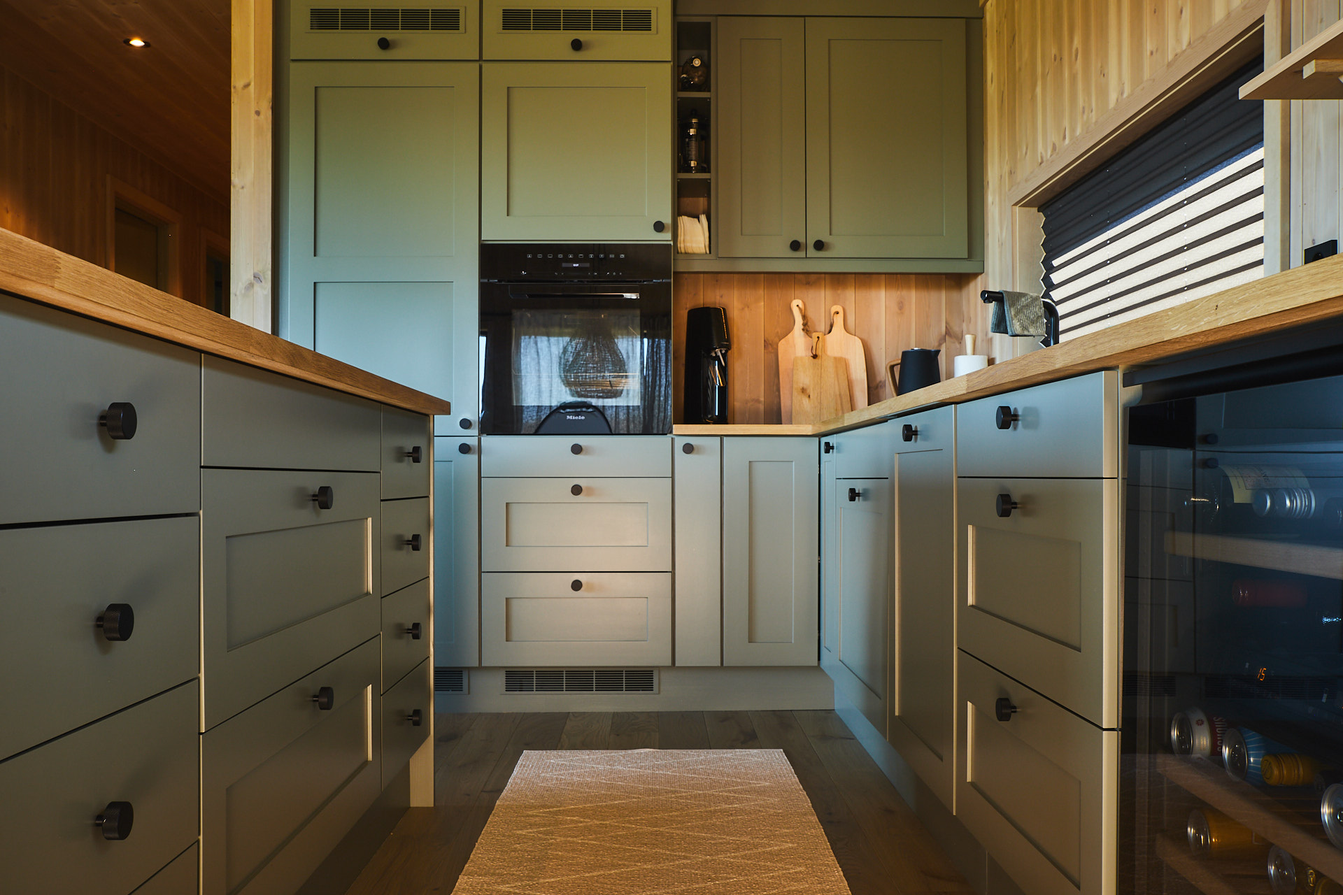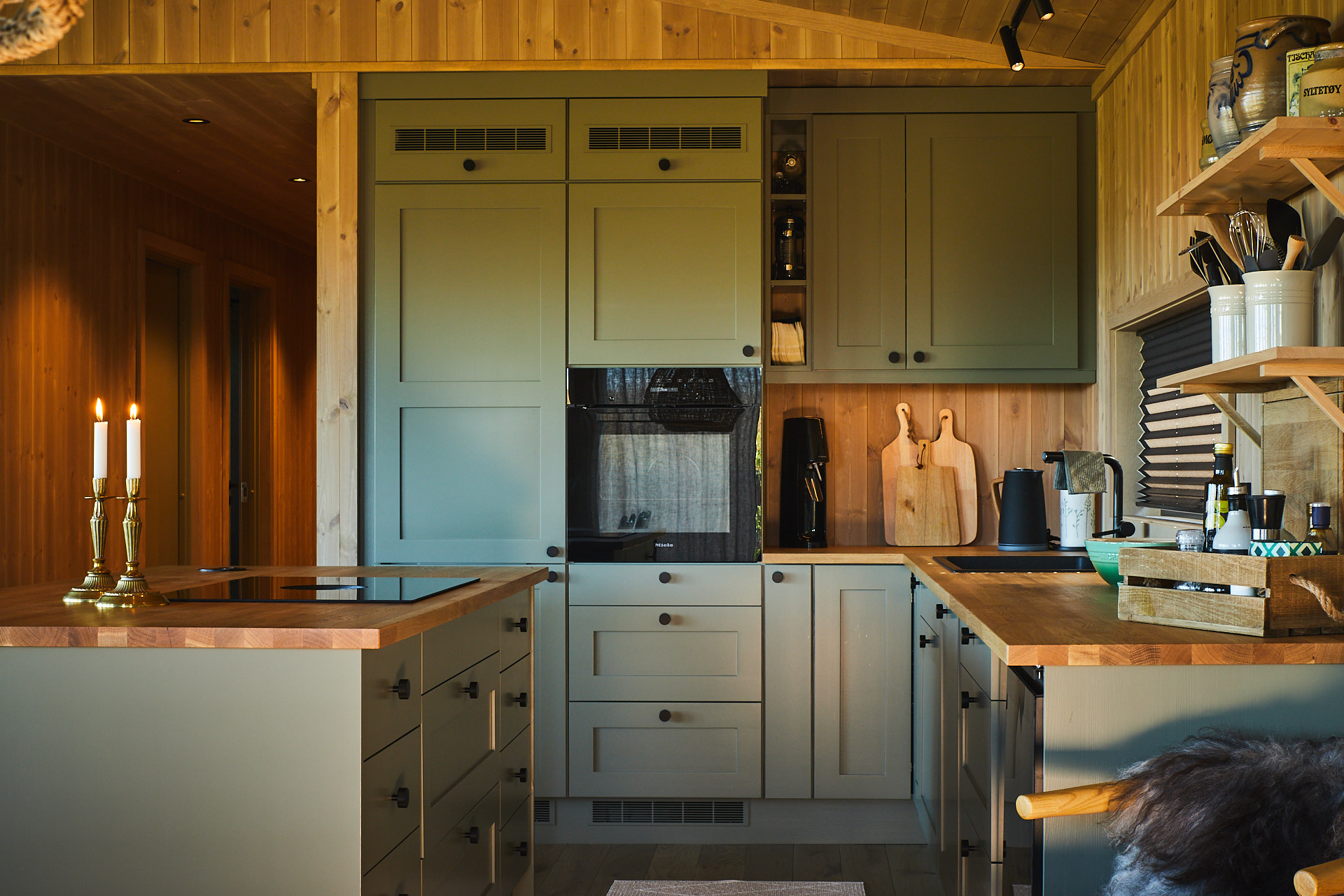 Dette lune hyttekjøkkenet er laget av kvistrfri furu og valchromat som er malt i fargen Green Leaf. Benkeplaten 3cm tykk eik, behandlet med Osmo Naturell. Hvitevarene er levert av Bergro AS, og består blant annet av en Bora koketopp med nedtrekksvifte som går i ett med benkeplaten på kjøkkenøya.