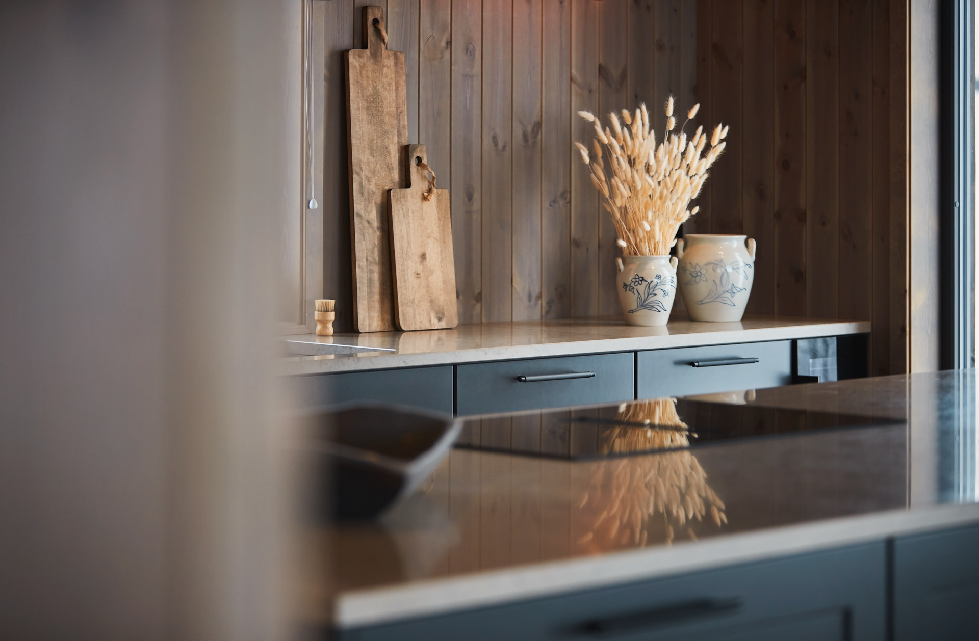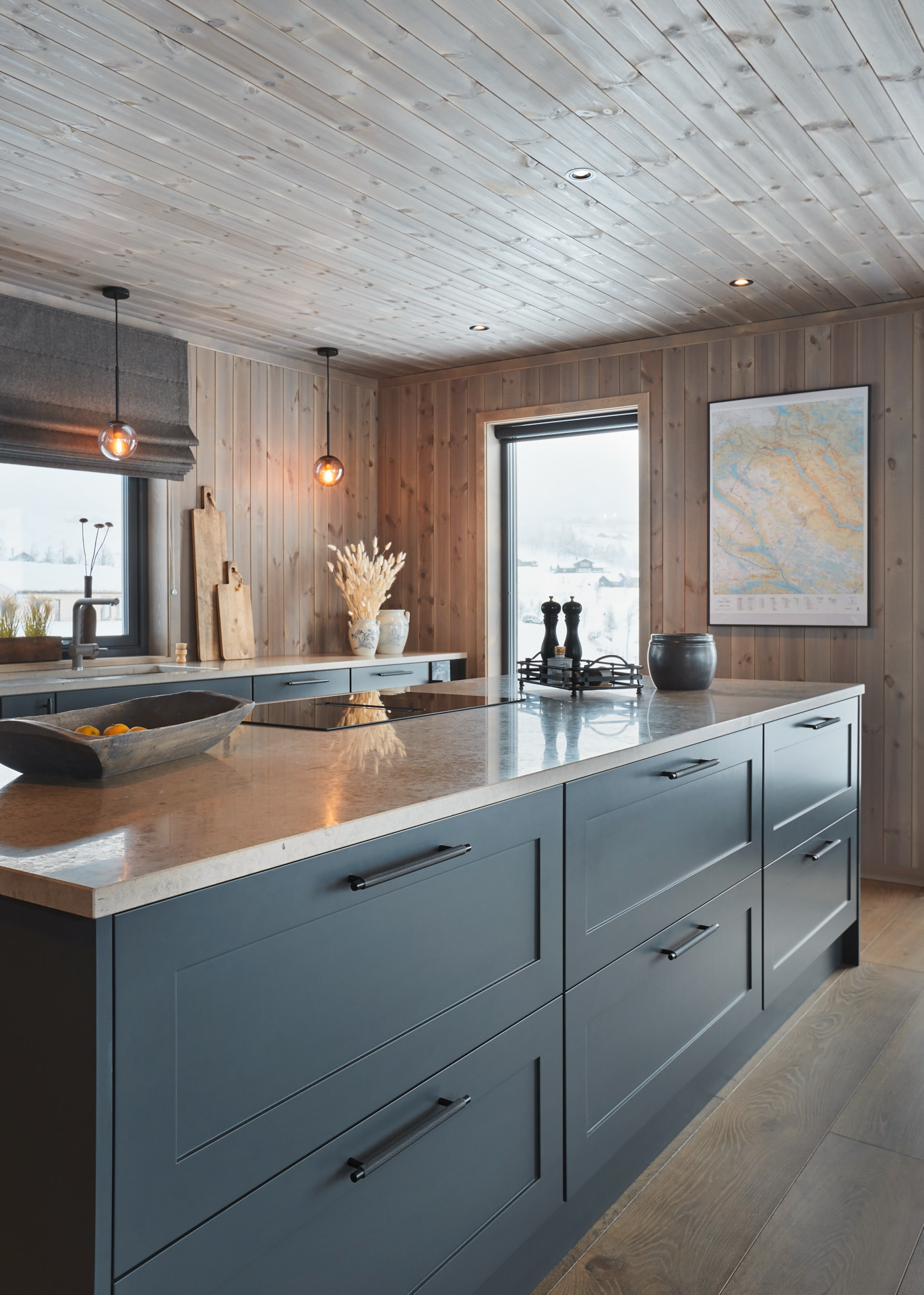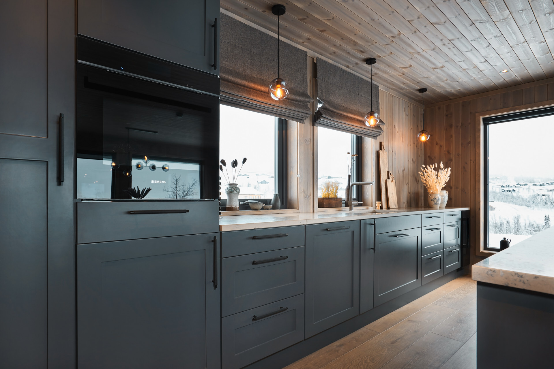 Kjøkkenbenken er langstrakt og strekker seg fra høyskapene i ene endren,til vegg i andre enden. Kjøkkenøya er både bred og lang, som byr på et fantastisk arbeidsområde. Her har Bergro levert alle hvitevarer, inkludert det lille vinskapet i enden på kjøkkenbenken. Steketopp med nedtrekk sørger for en uforstyrret look på arbeidsområdet. Skapdører og skuffefronter har en profil som vi her på huset kaller Beitostølen nr. 7.
