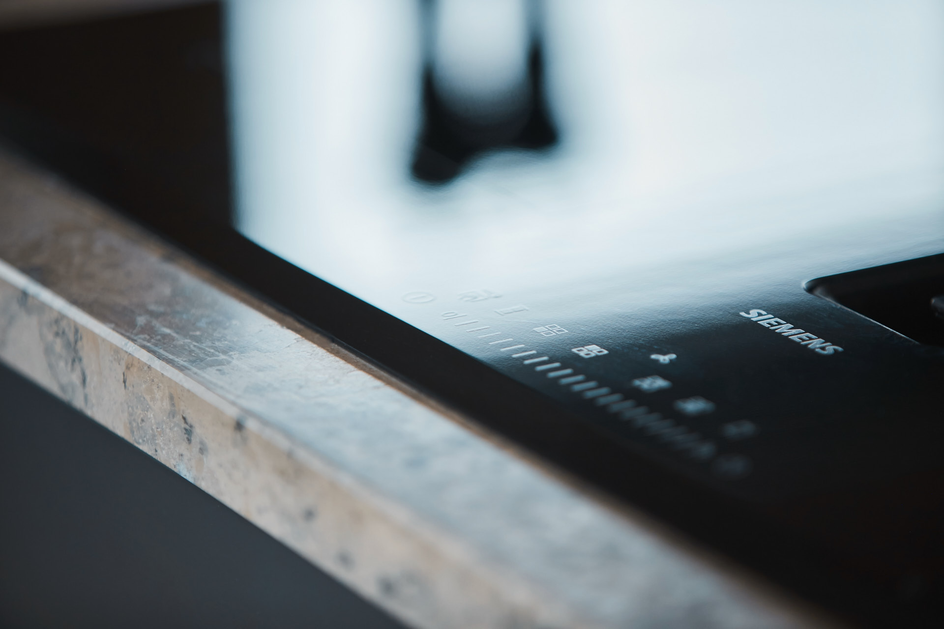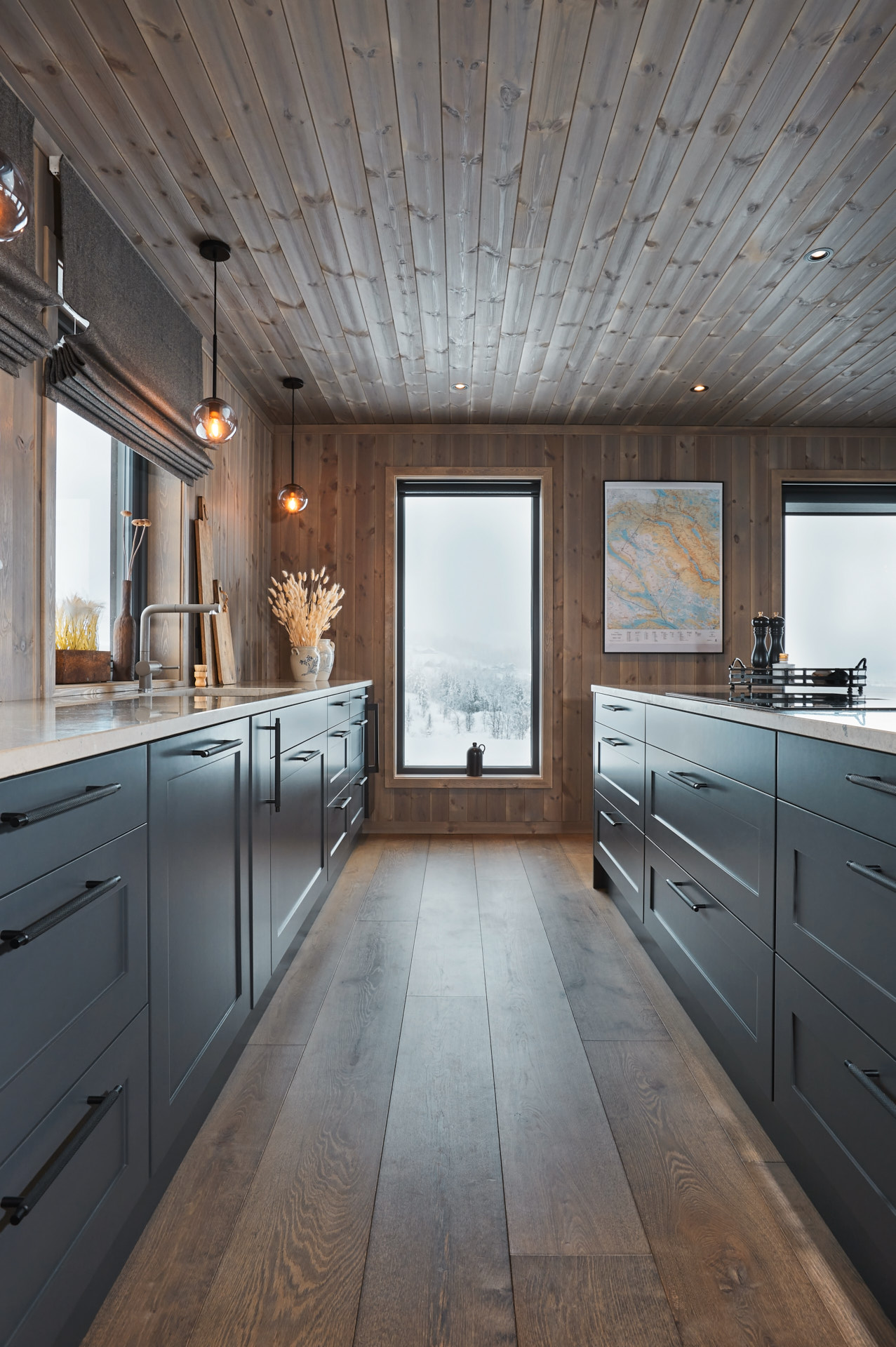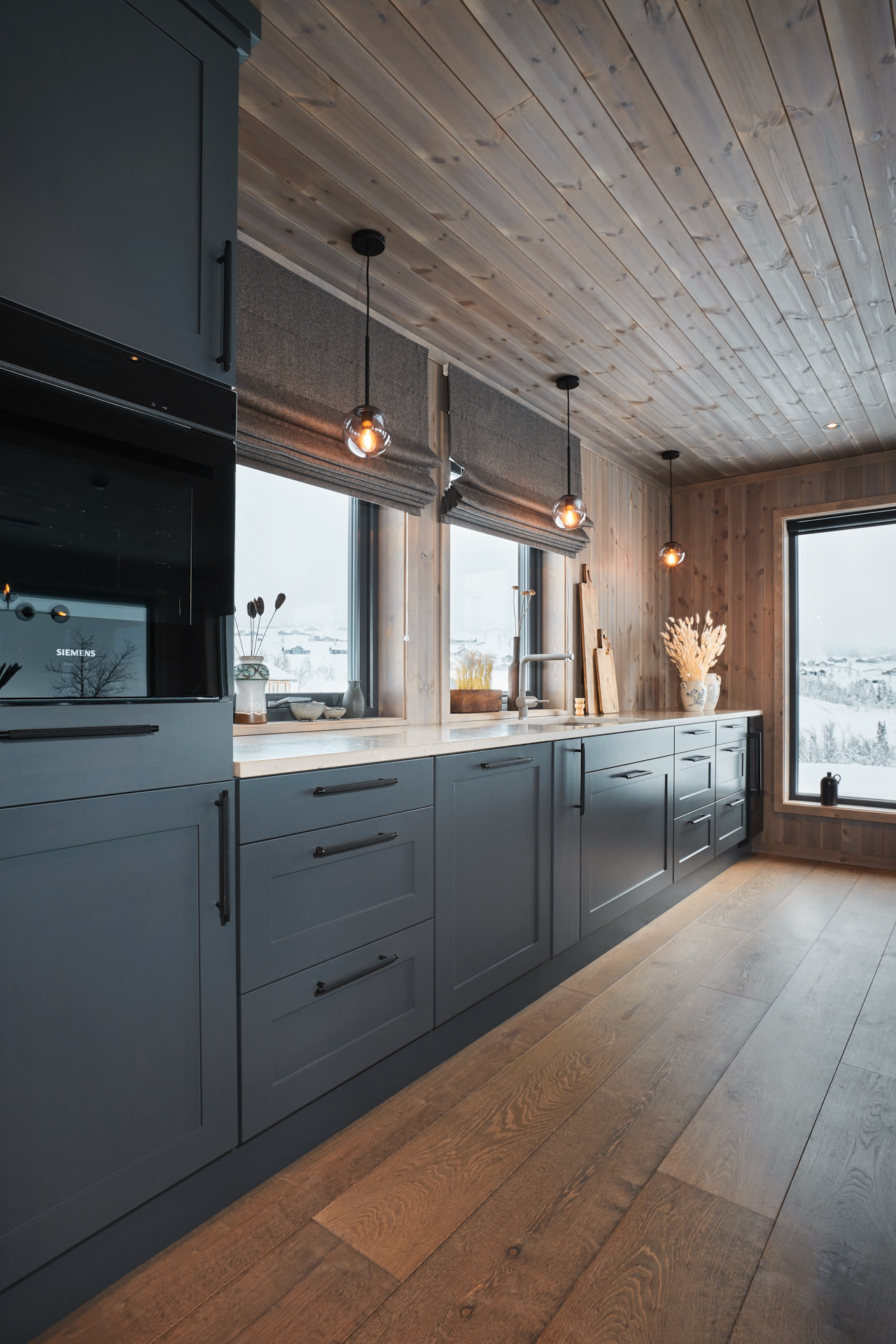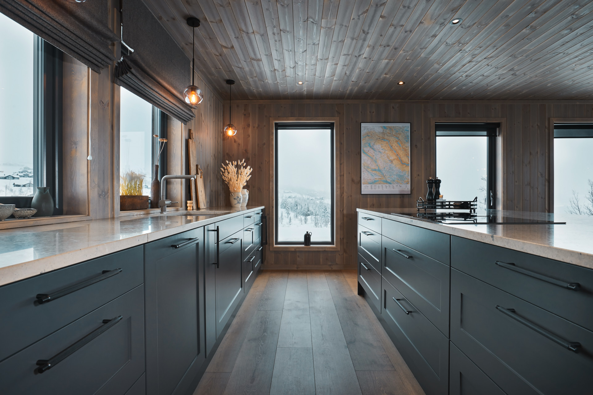 Kjøkkenbenken er langstrakt og strekker seg fra høyskapene i ene endren,til vegg i andre enden. Kjøkkenøya er både bred og lang, som byr på et fantastisk arbeidsområde. Her har Bergro levert alle hvitevarer, inkludert det lille vinskapet i enden på kjøkkenbenken. Steketopp med nedtrekk sørger for en uforstyrret look på arbeidsområdet. Skapdører og skuffefronter har en profil som vi her på huset kaller Beitostølen nr. 7.