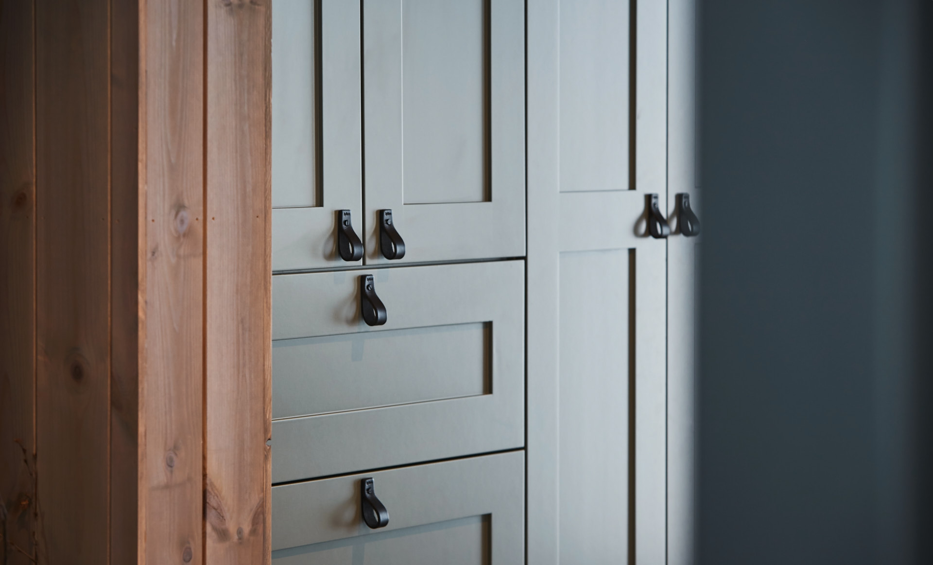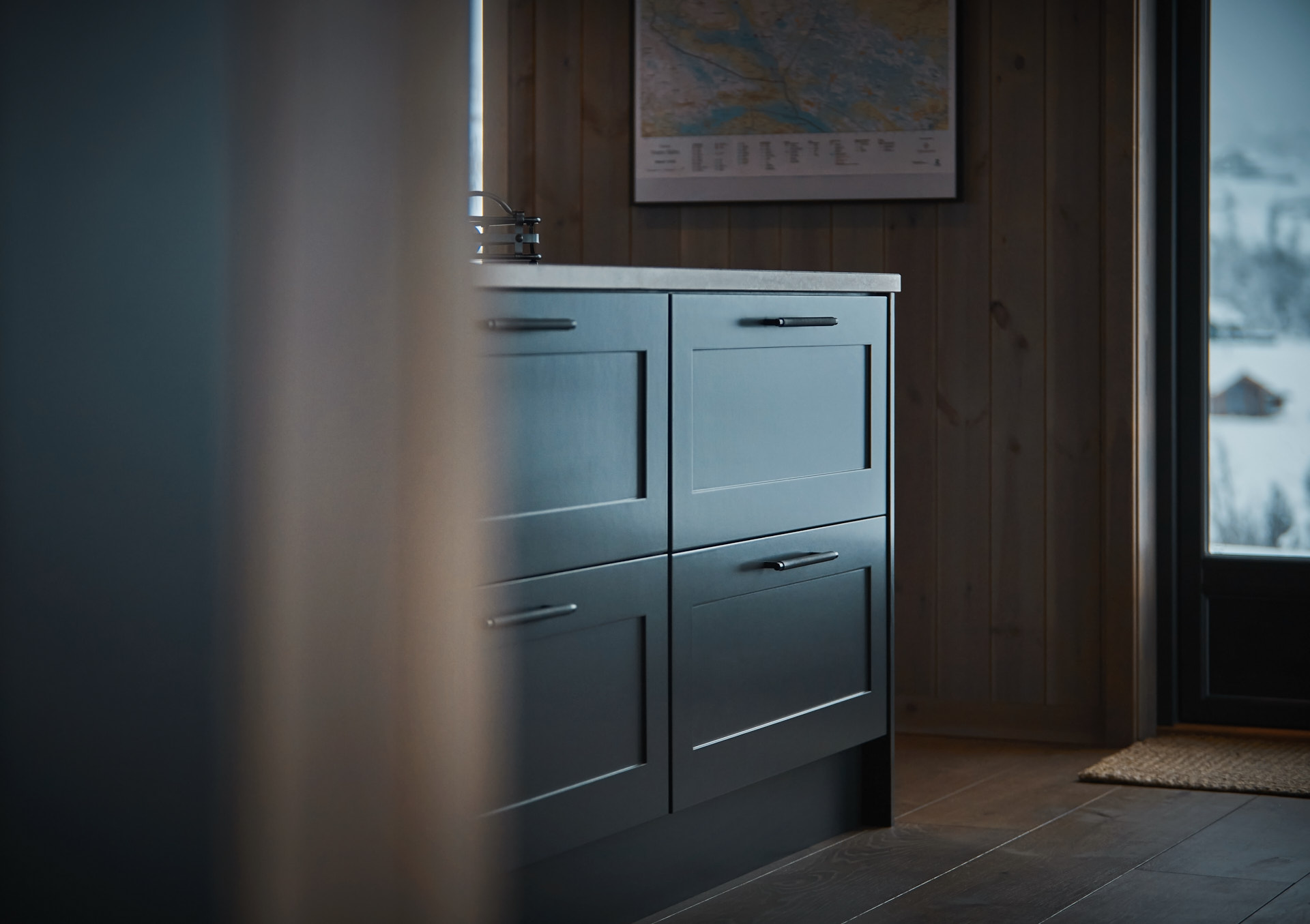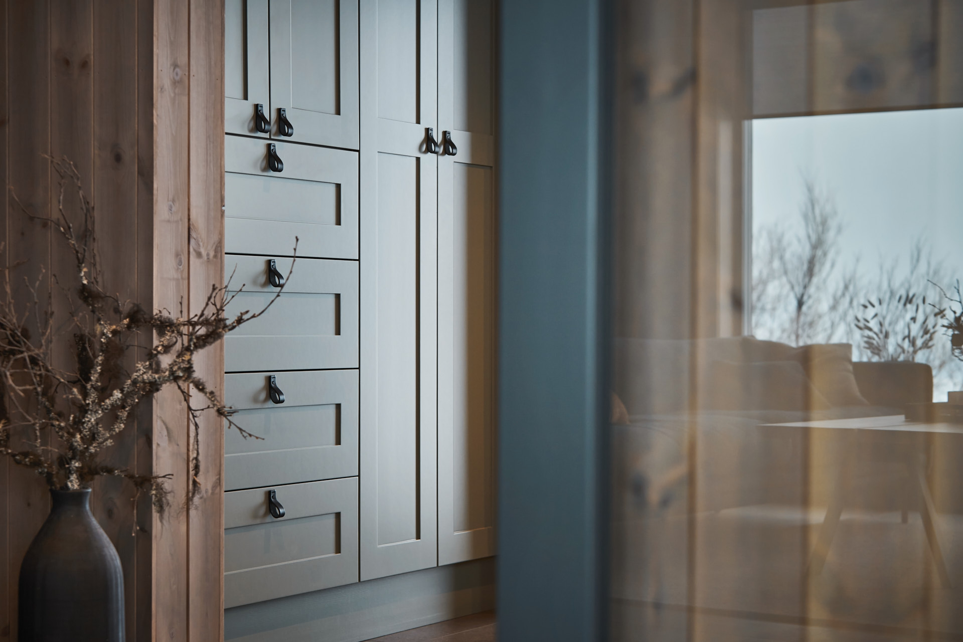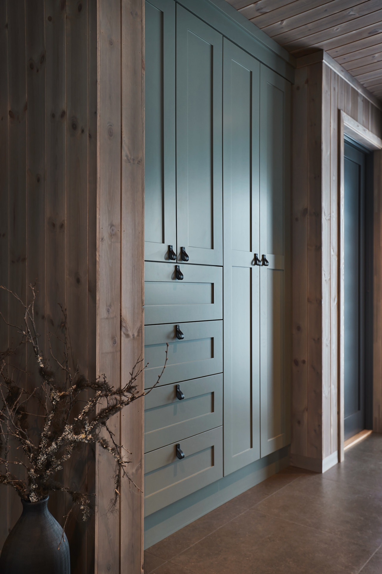 I entréen finner man et innebygd garderobeskap med fire skuffer og to skap. Bygget fra gulv til tak og fra vegg til vegg. Garderoben har fått en nøytral grønnfarge som harmonerer med kjøkken og innredning ellers i hytta.