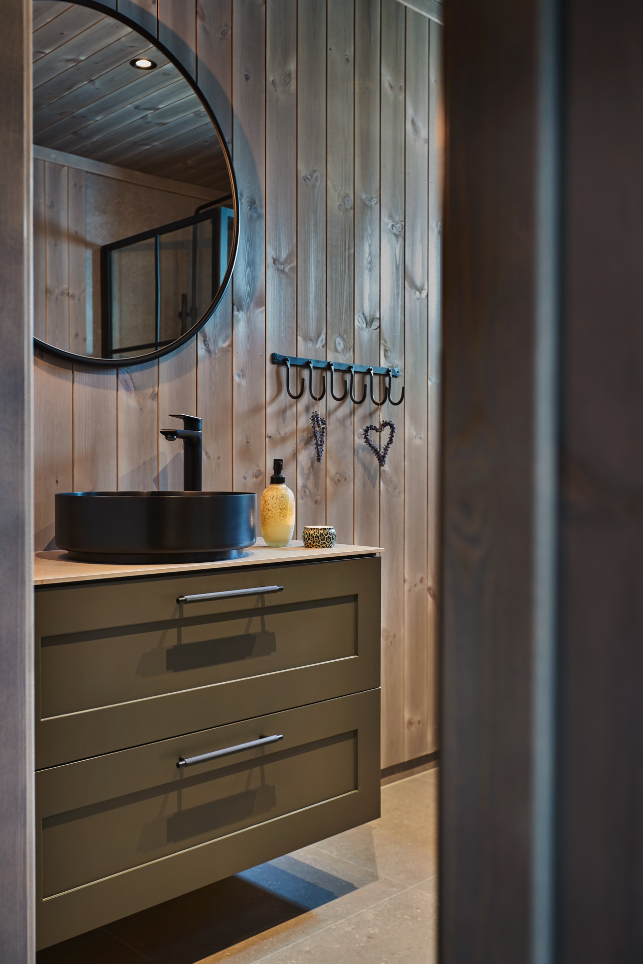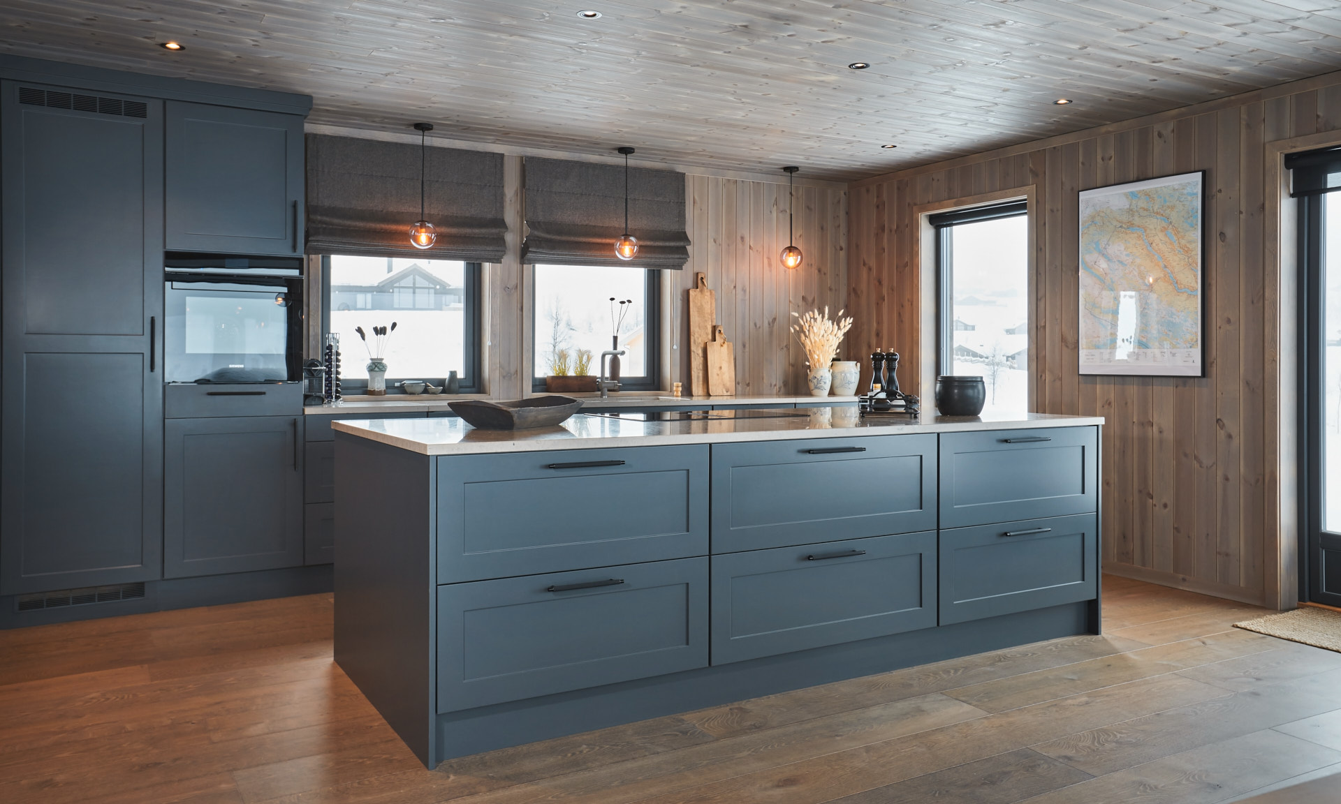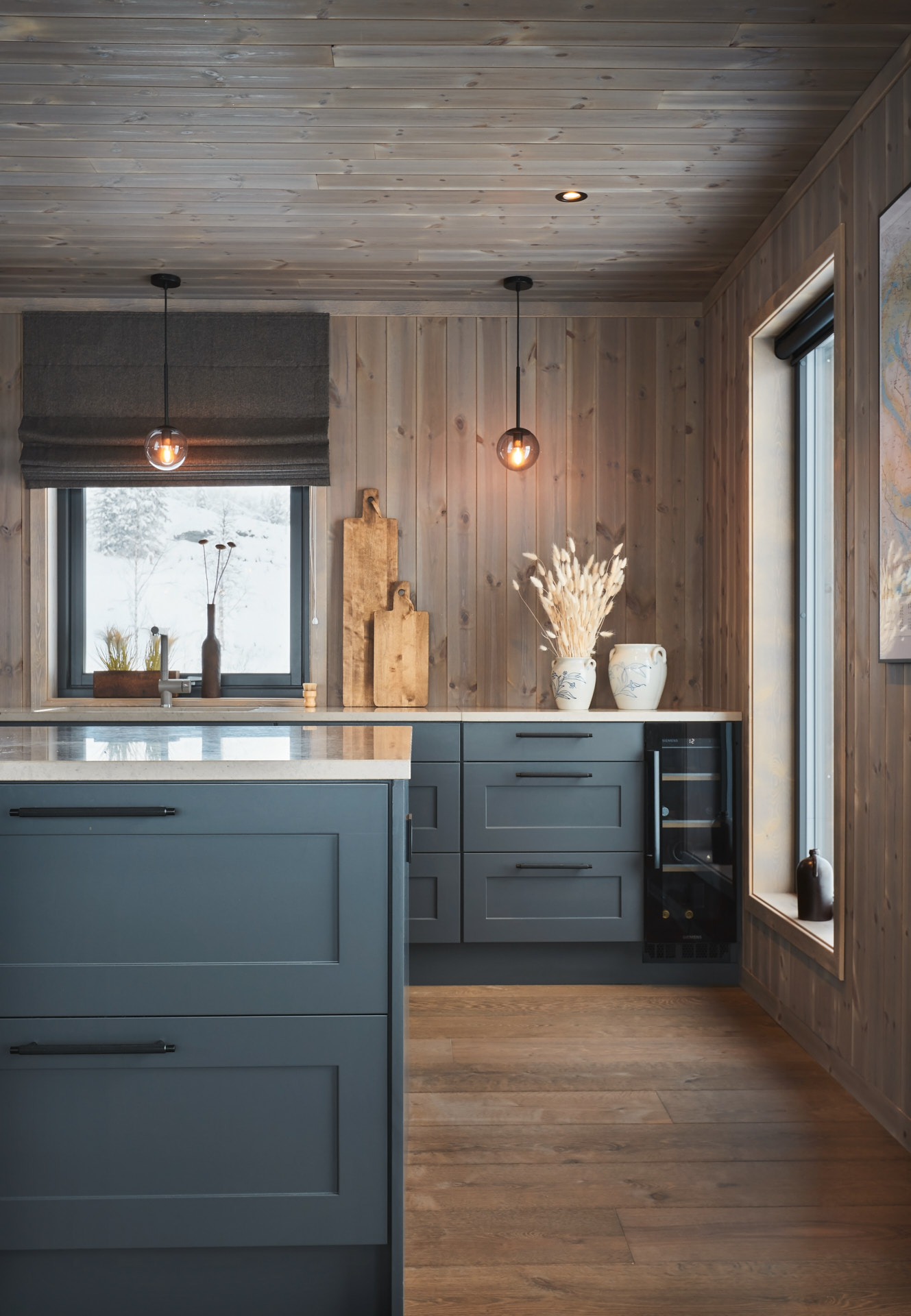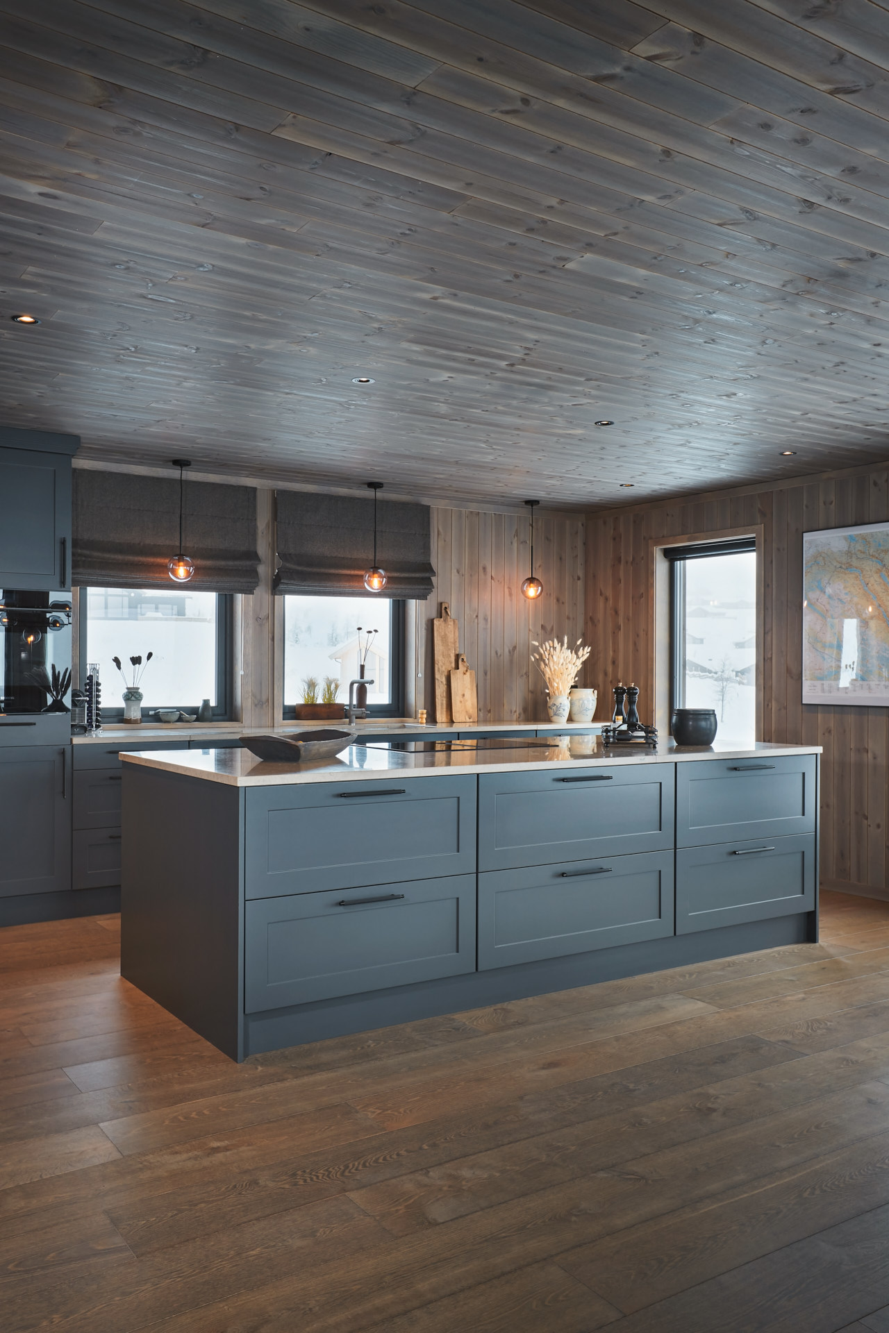 Hyttekjøkken i tidløs, nøytral gråfarge og med stor kjøkkenøy. Baderom og entré i dus grønn.