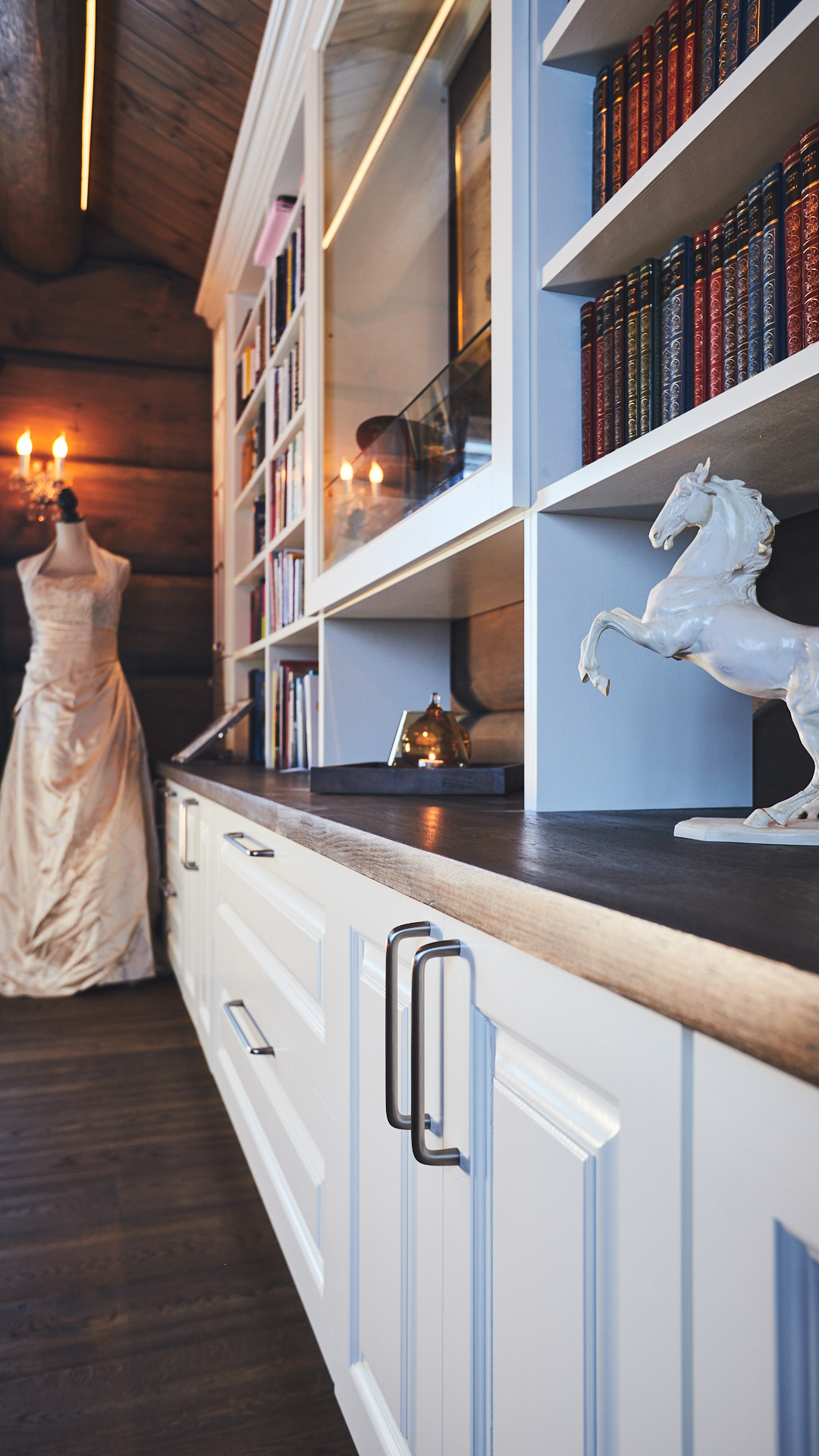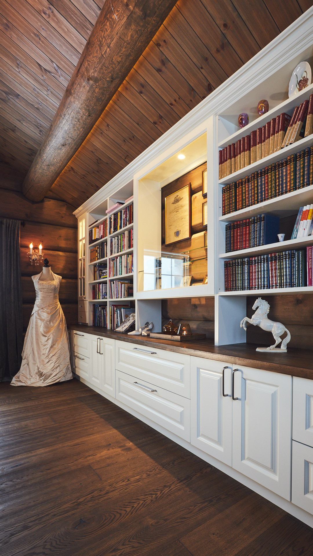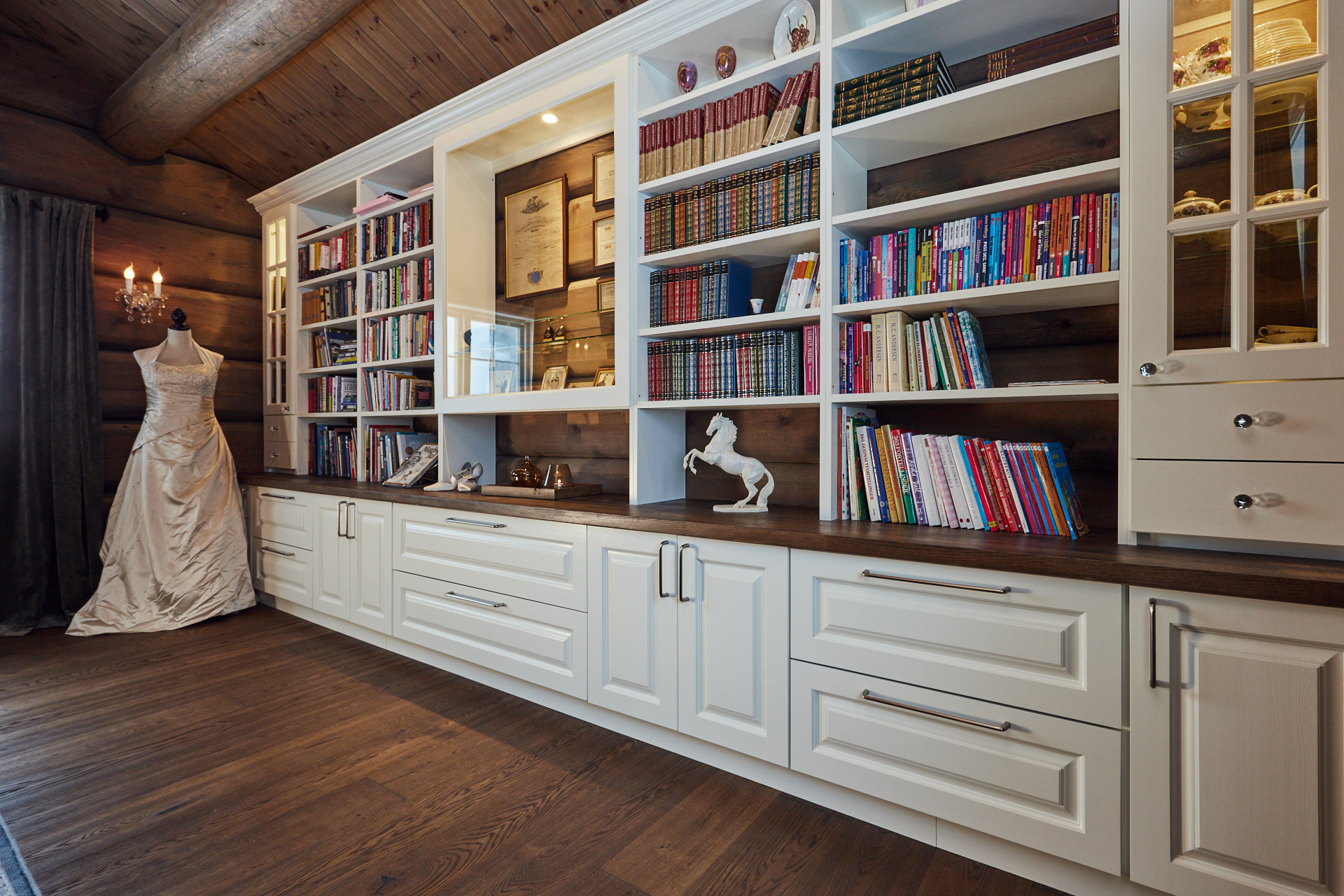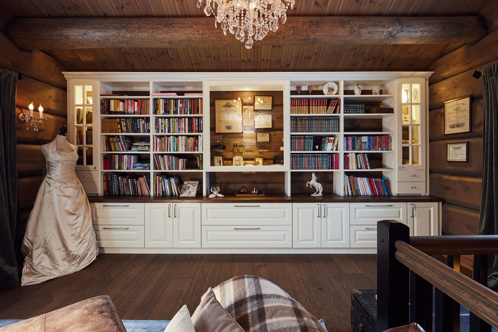 Stor bokhylle som går fra vegg til vegg i stue gir nesten følelsen av å ha et eget bibliotek hjemme. På midten av bokhylla er et glassmonter med belysning. Dette er laget av kvistfri furu, malt i fargen bomull, med profilerte dører. Benkeplaten er av eik, behandlet med Osmo.