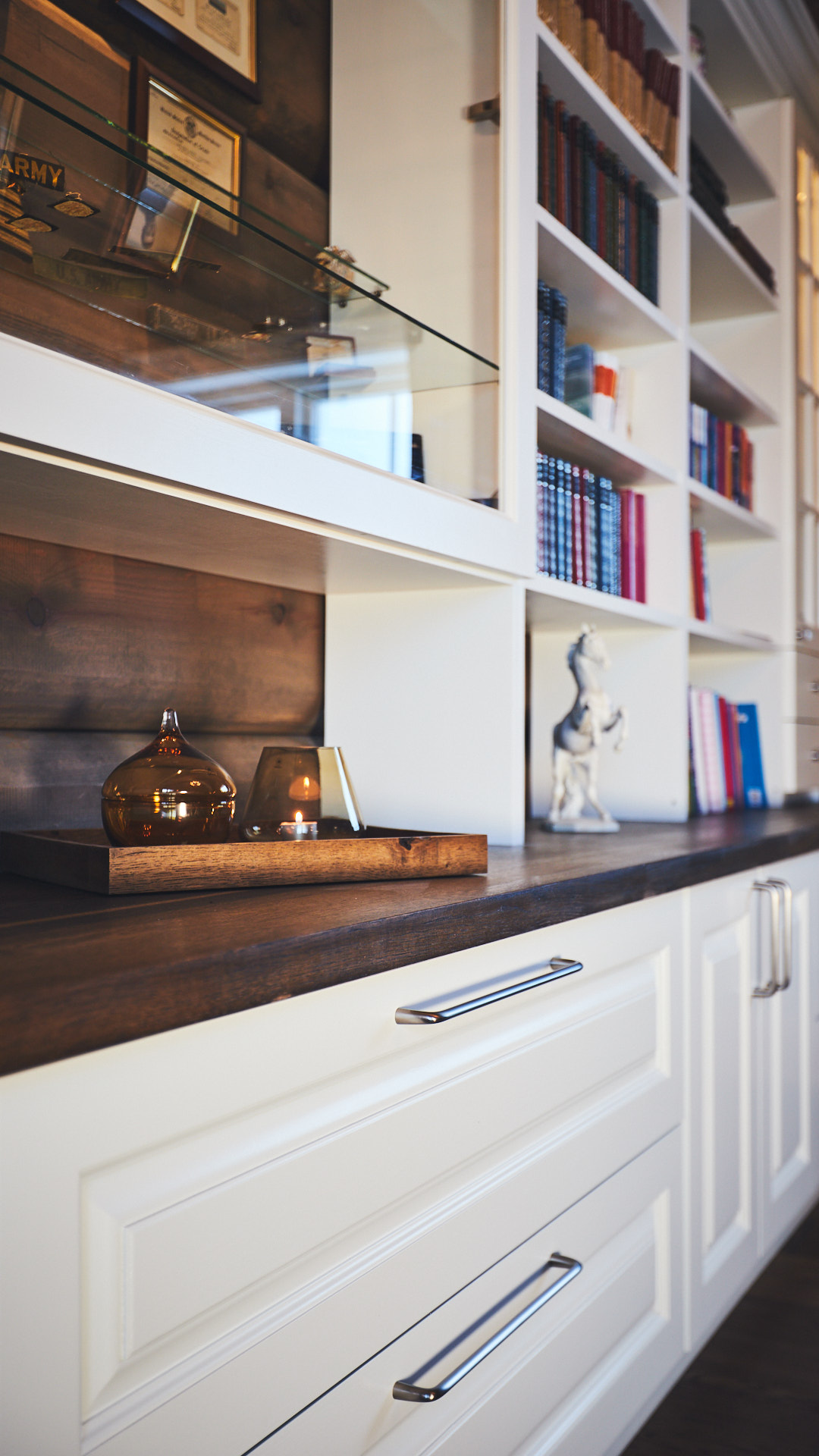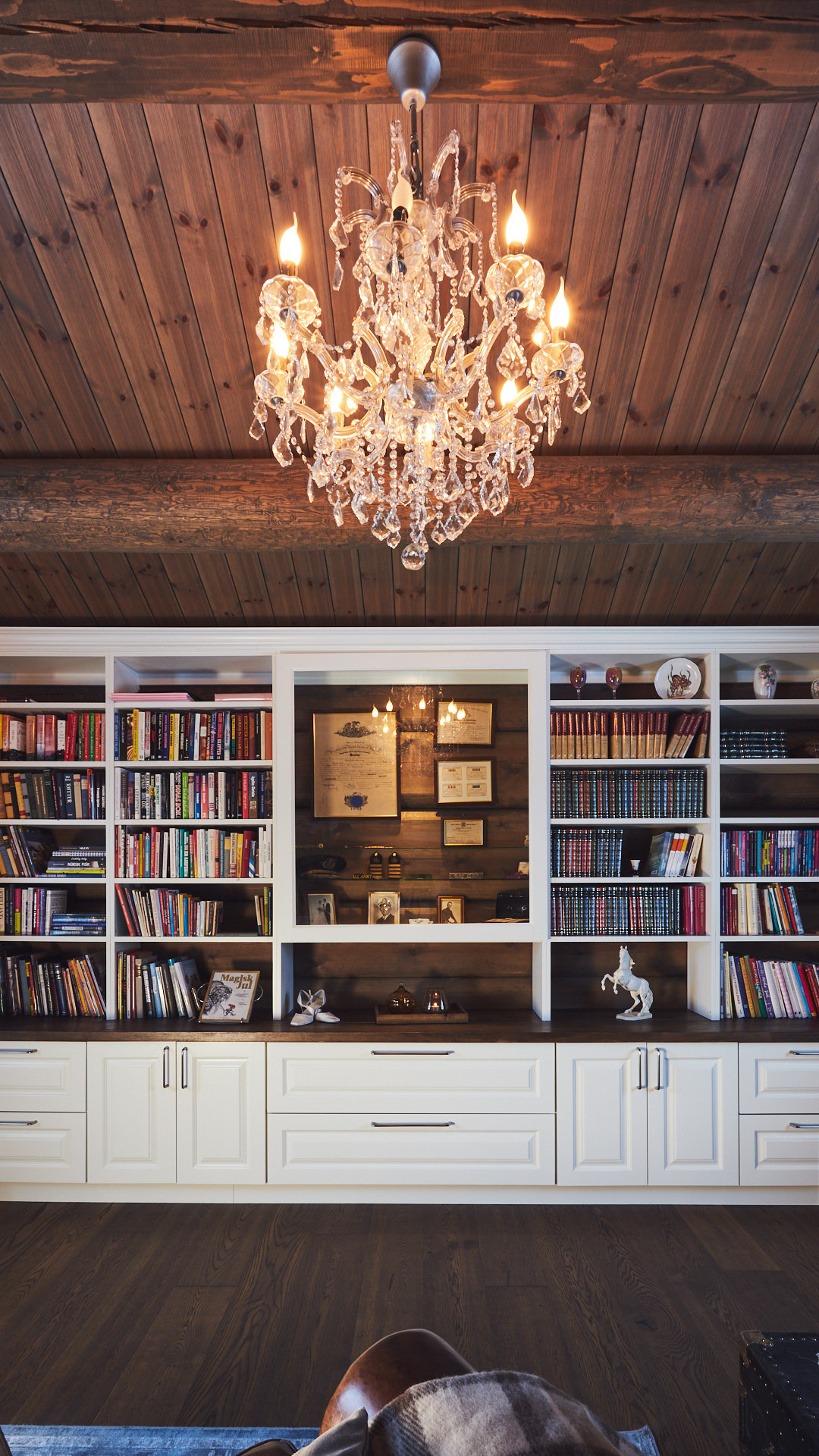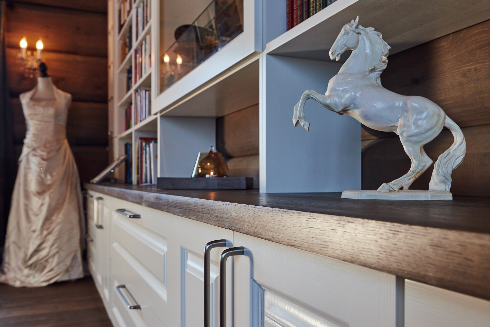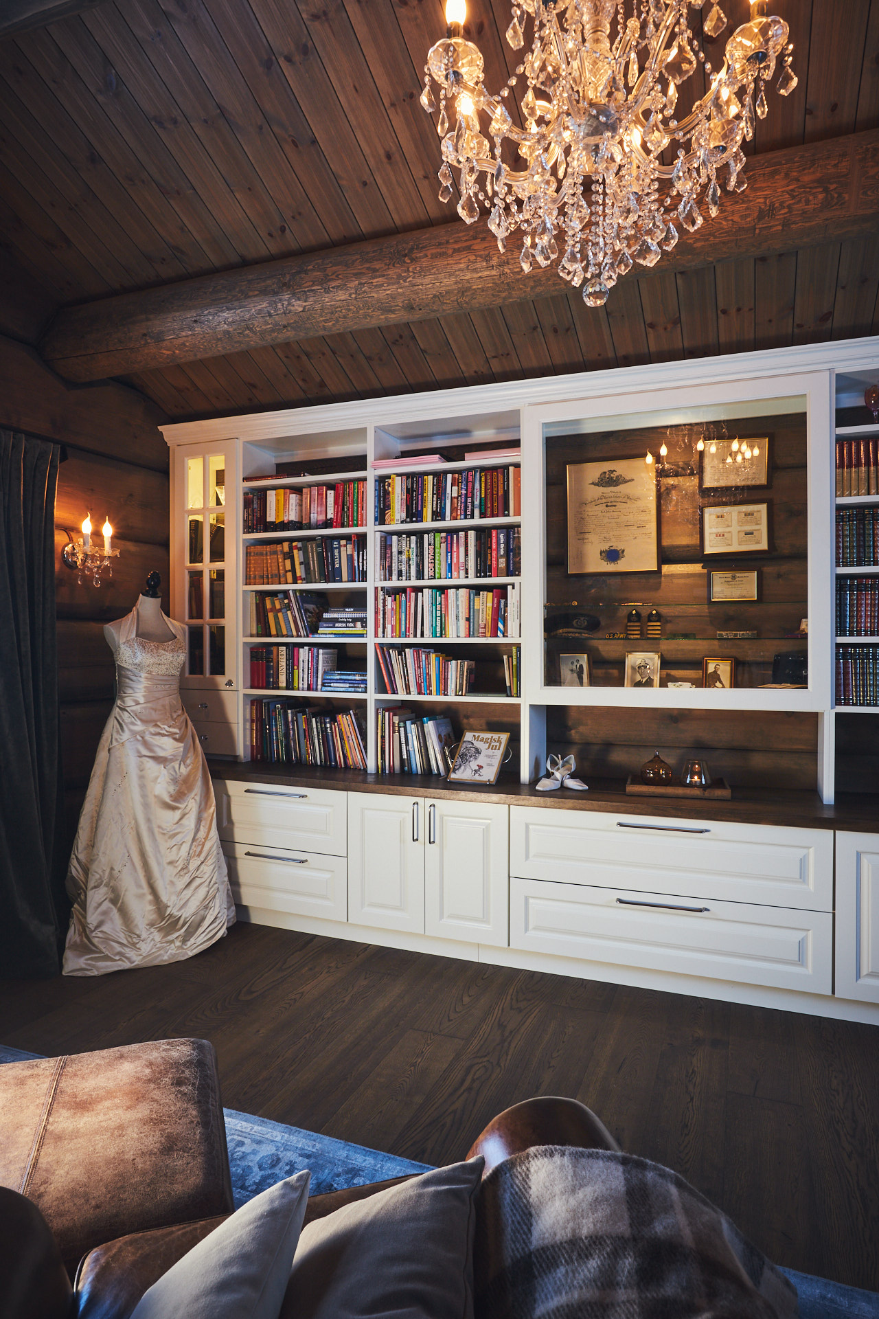 Stor bokhylle som går fra vegg til vegg i stue gir nesten følelsen av å ha et eget bibliotek hjemme. På midten av bokhylla er et glassmonter med belysning. Dette er laget av kvistfri furu, malt i fargen bomull, med profilerte dører. Benkeplaten er av eik, behandlet med Osmo.