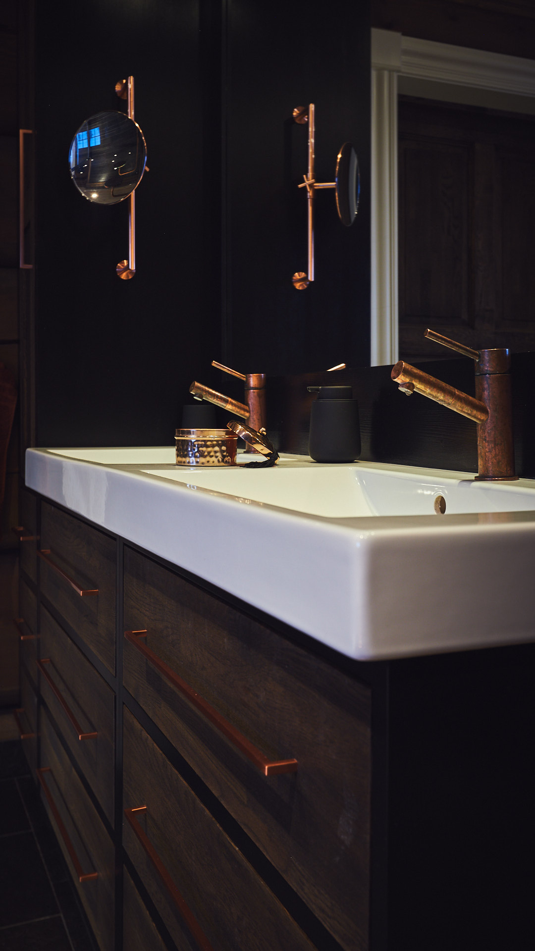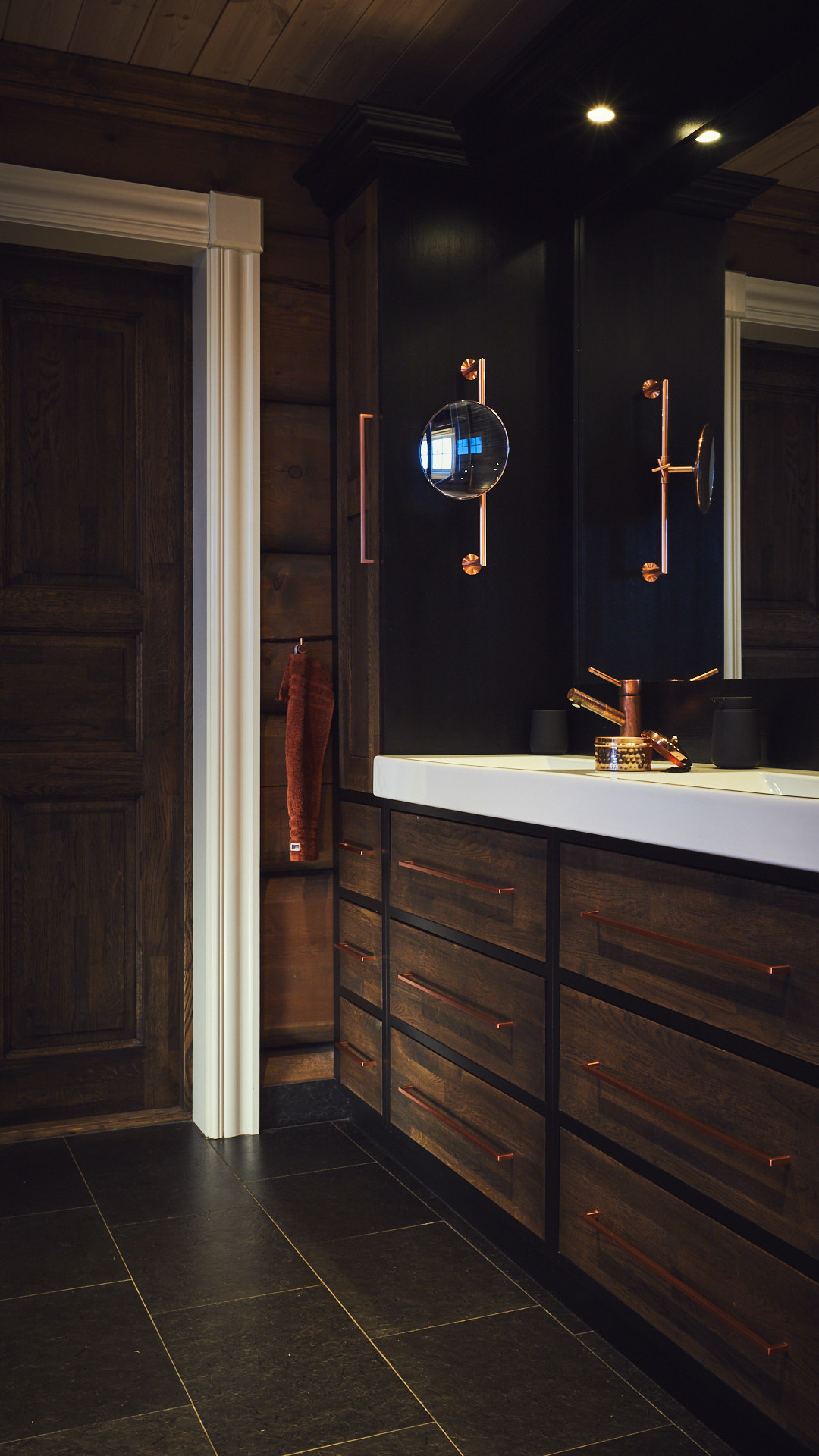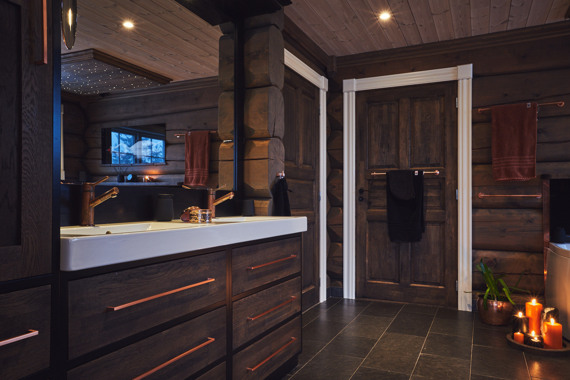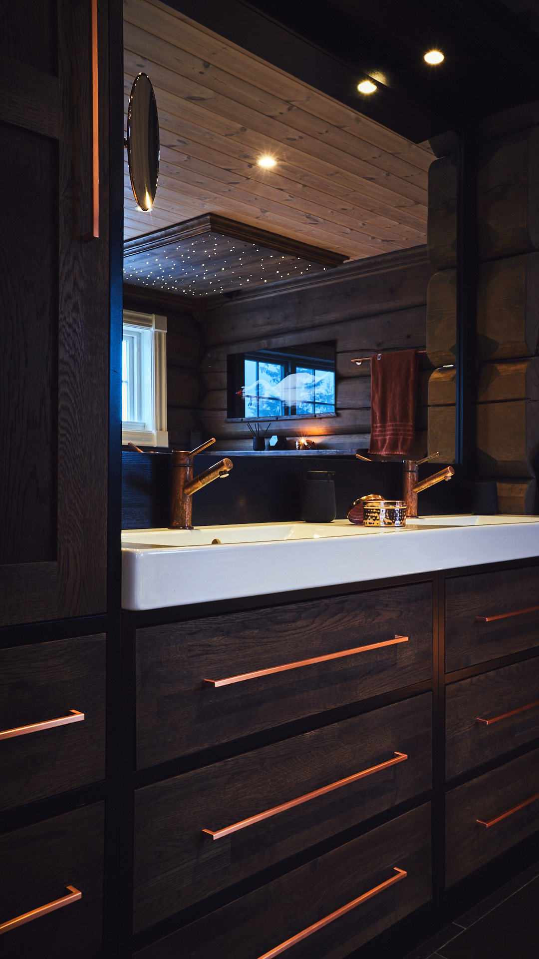 Hovedbadet har en lun atmosfære, med skrog av kvistfri furu, malt i sort, og fronter av eik behandlet med Osmo dekorvoks. Over badekaret har vi utformet en stemningsfull "stjernehimmel" i taket. Godt med oppbevaringsplass i skuffer og høyskap.