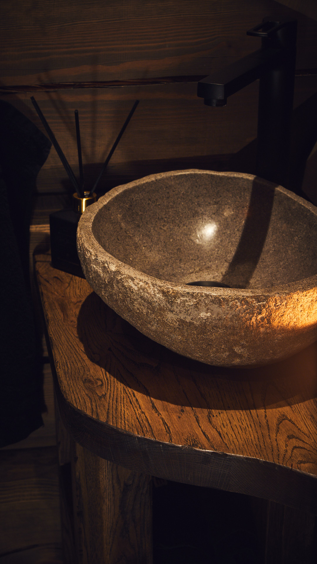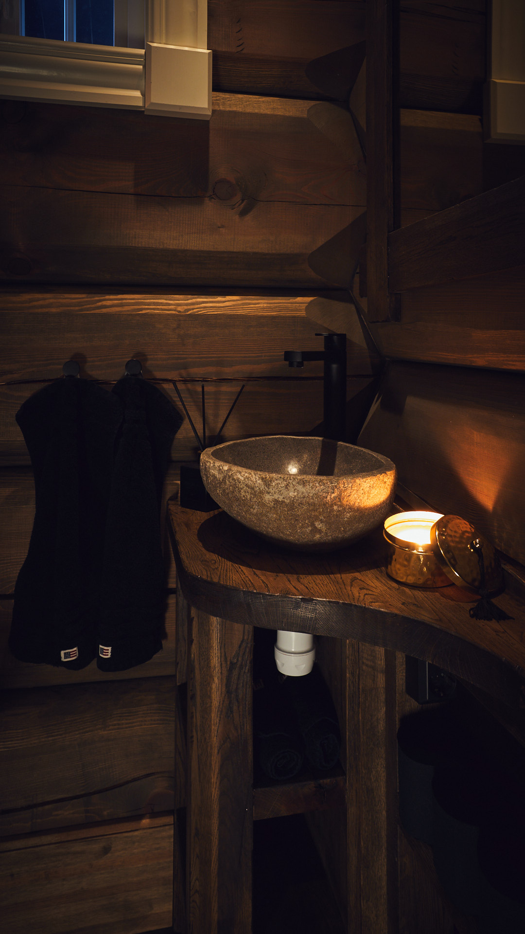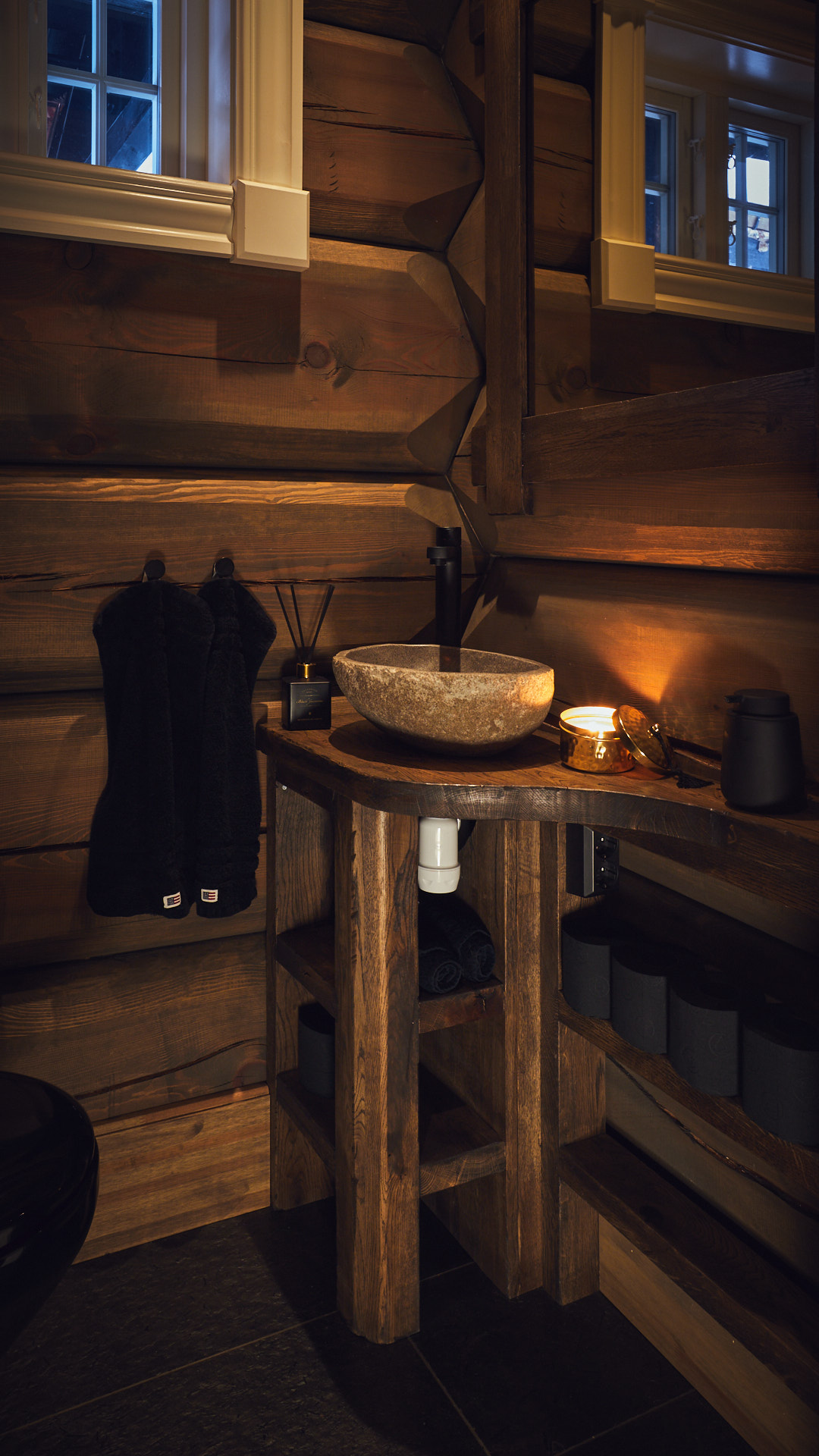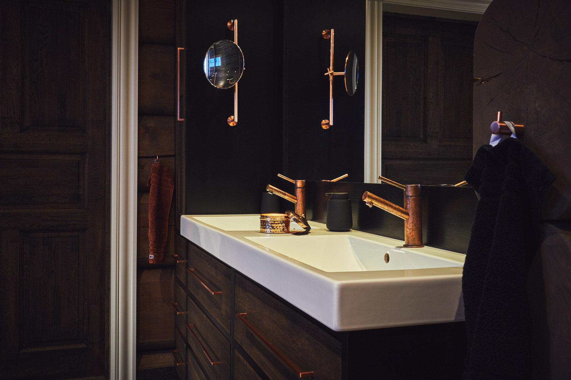 Hovedbadet har en lun atmosfære, med skrog av kvistfri furu, malt i sort, og fronter av eik behandlet med Osmo dekorvoks. Over badekaret har vi utformet en stemningsfull "stjernehimmel" i taket. Godt med oppbevaringsplass i skuffer og høyskap.