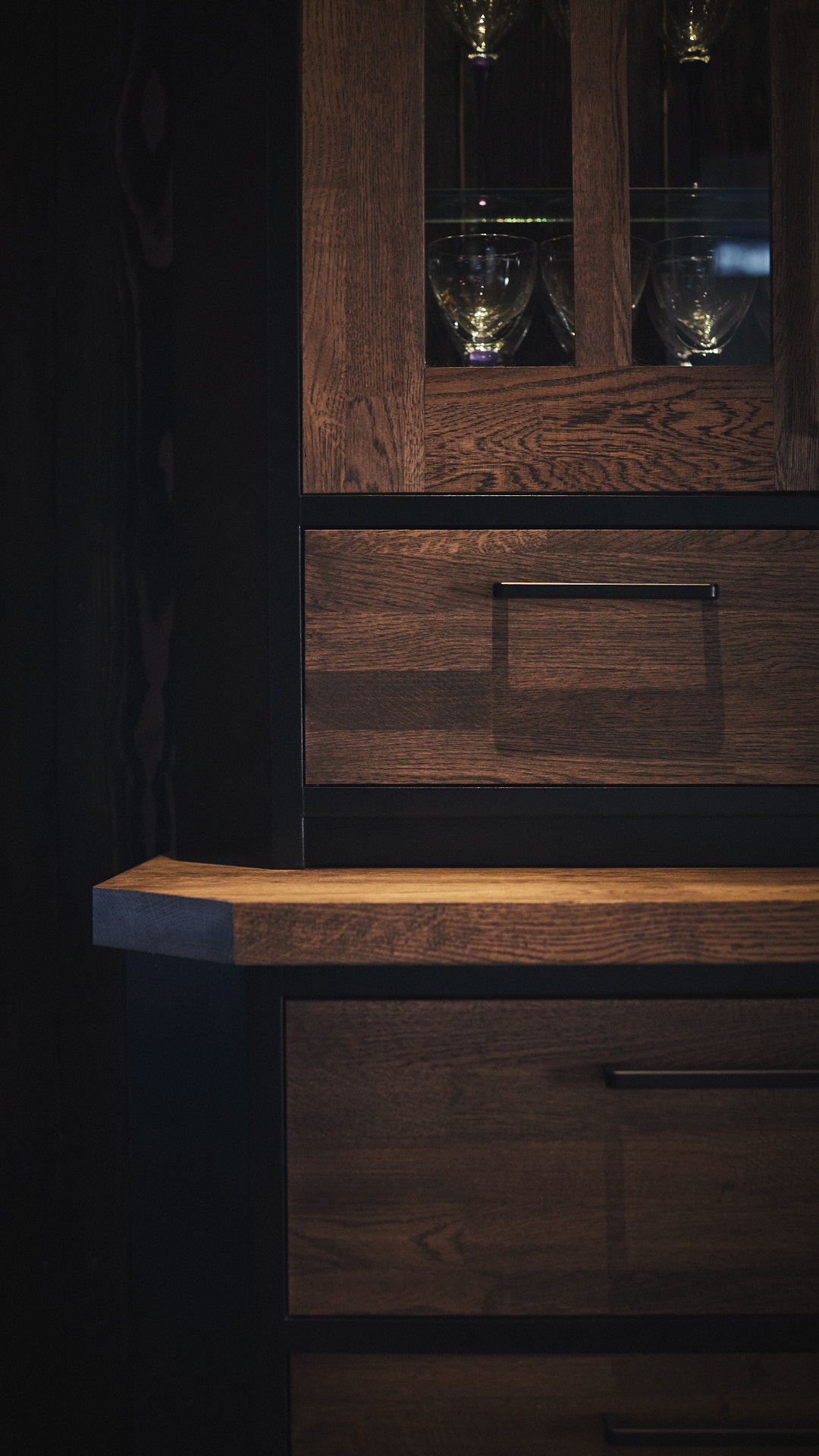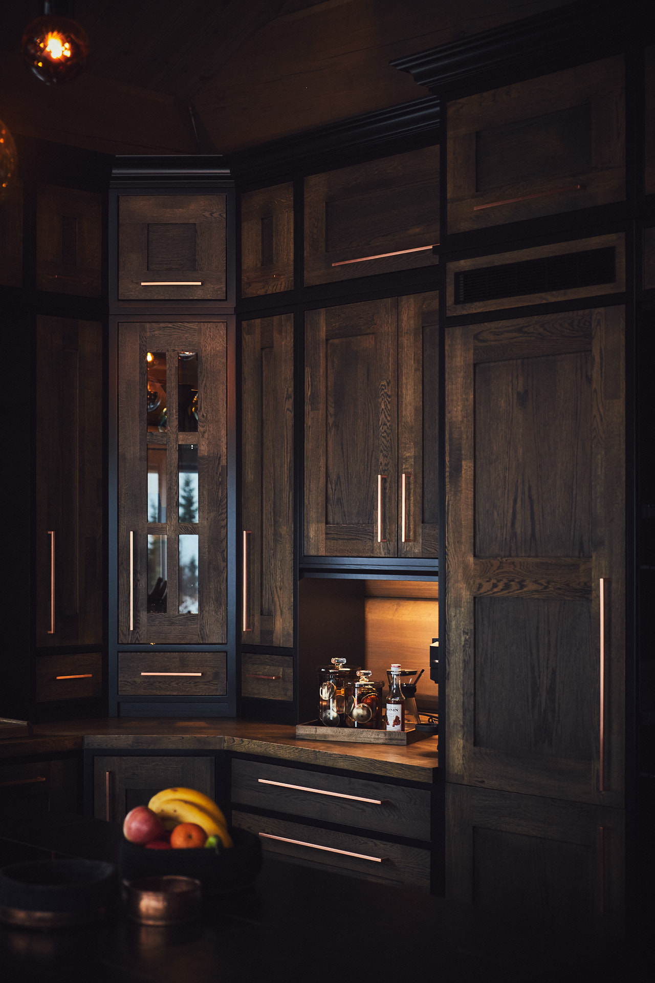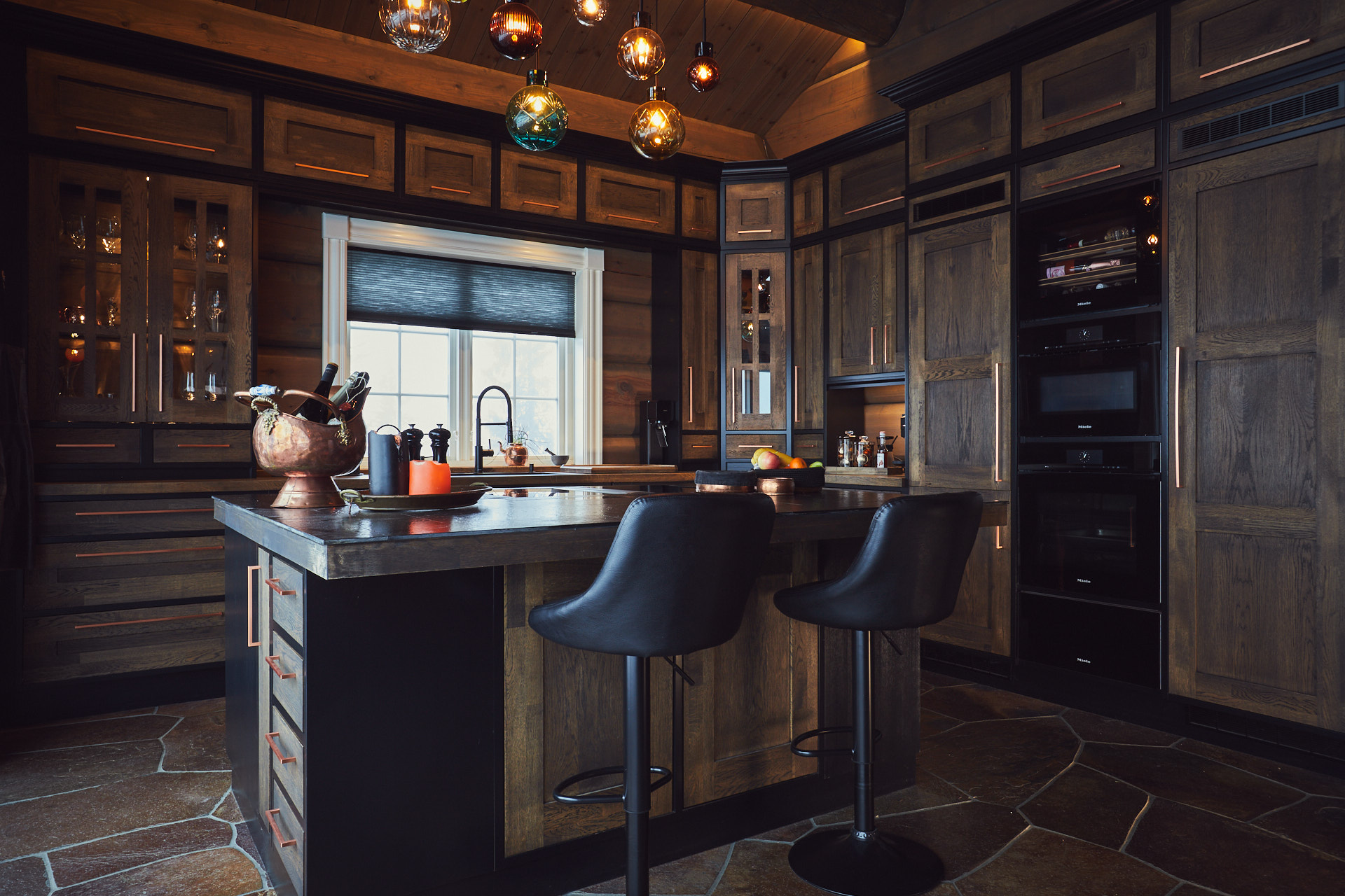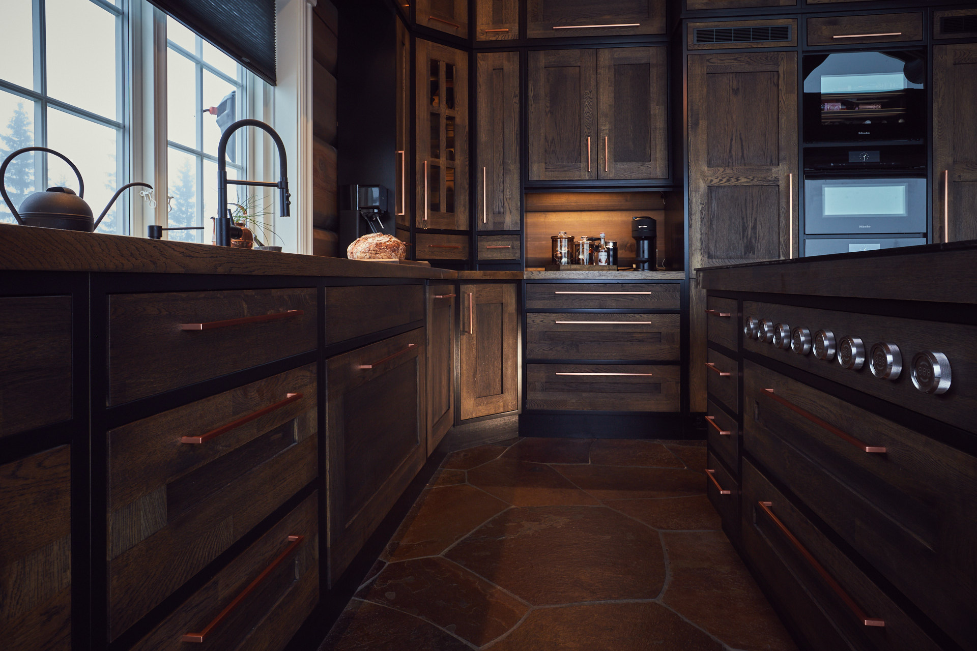 Kjøkkenet har skrog av kvistfri furu, malt i fargen dempet sort. Alle dører og skuffefronter er av eik behandlet med dekorvoks. Her har vi levert komplett løsning med hvitevarer og belysning fra Bergro AS.