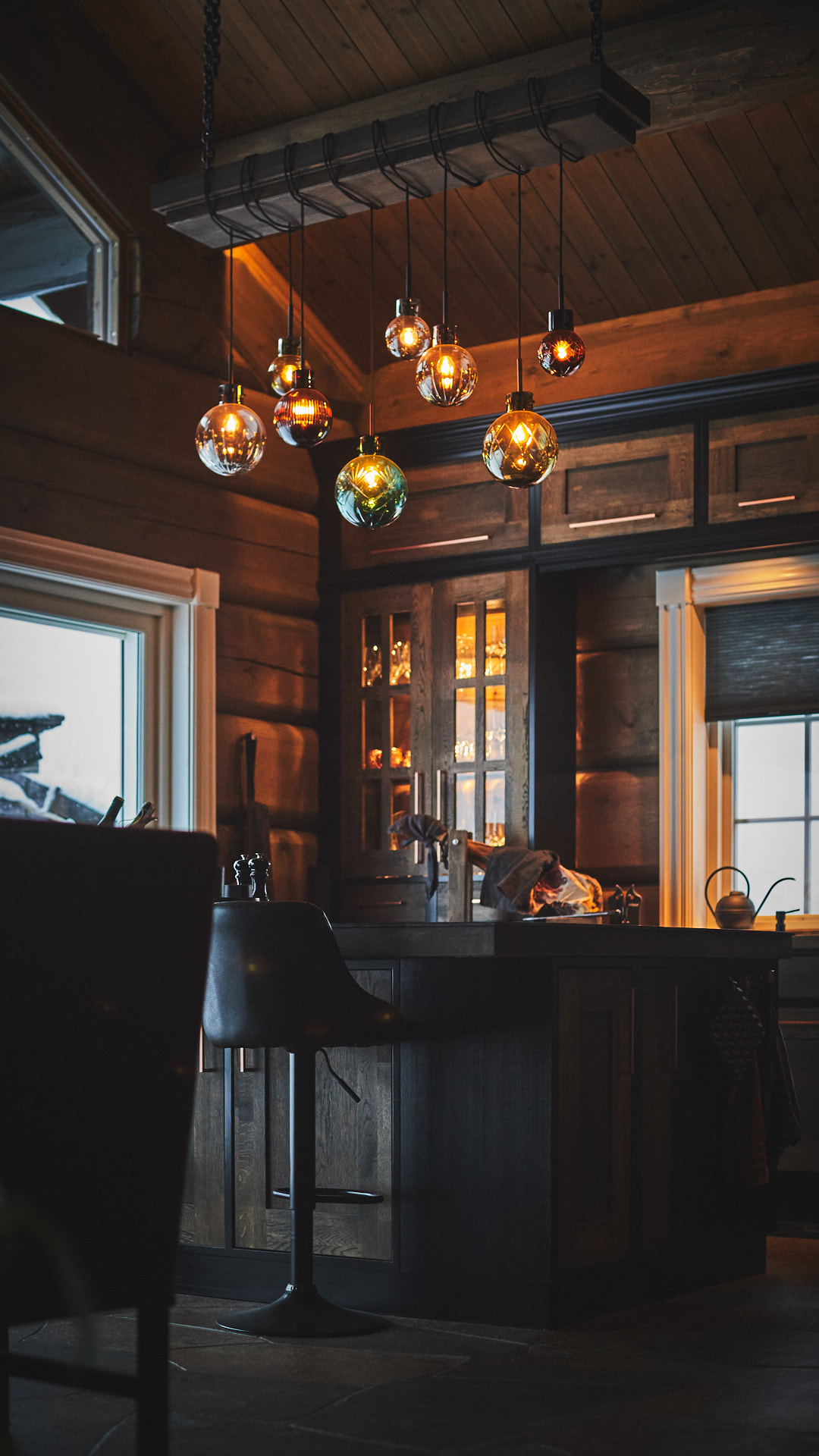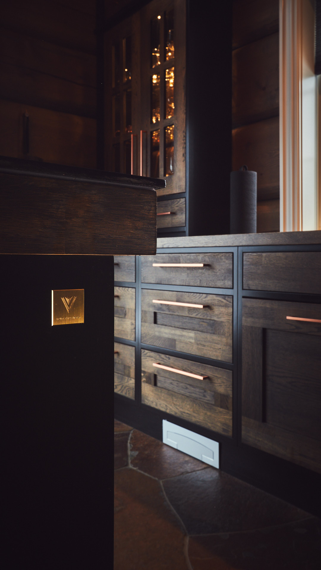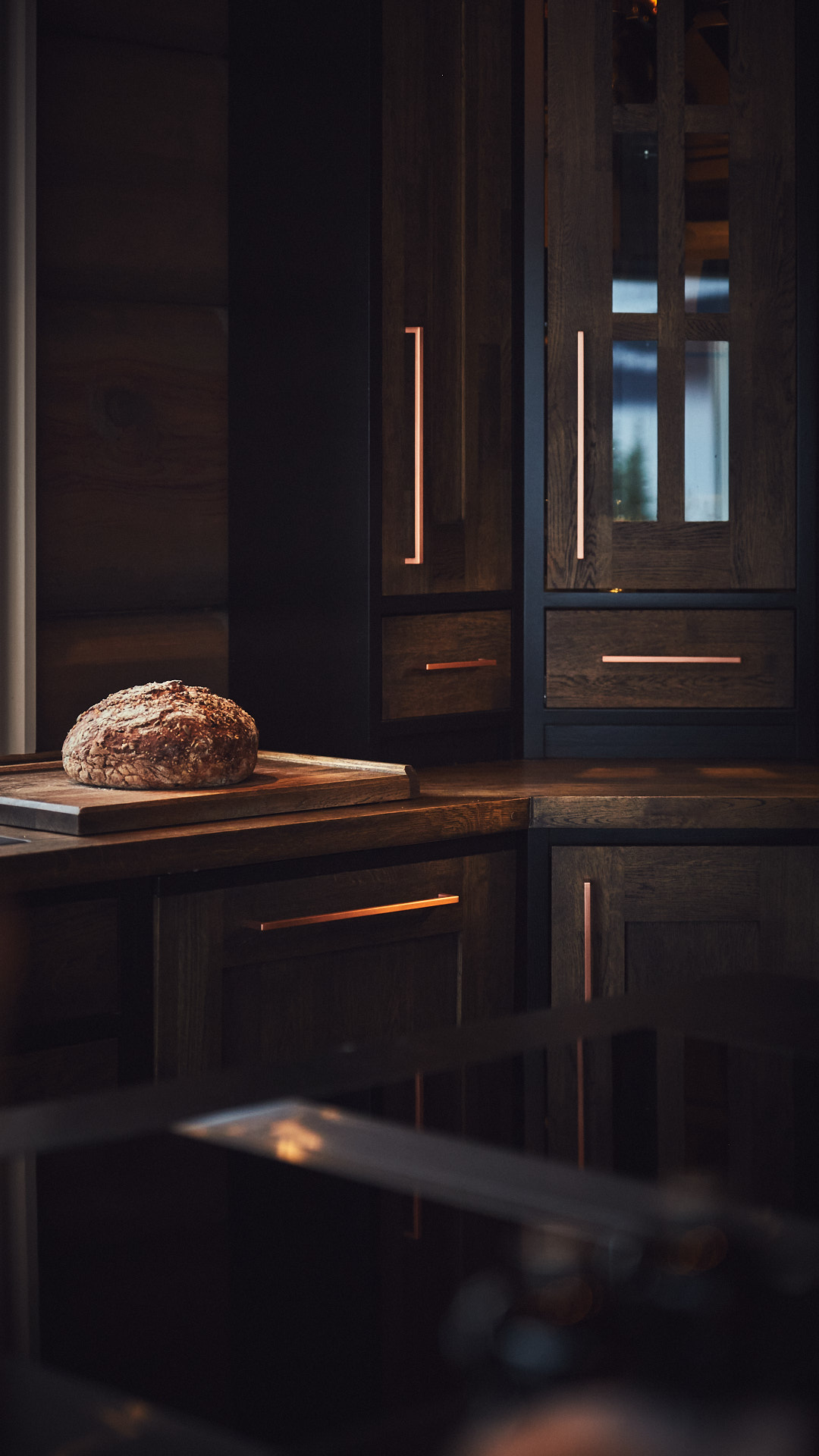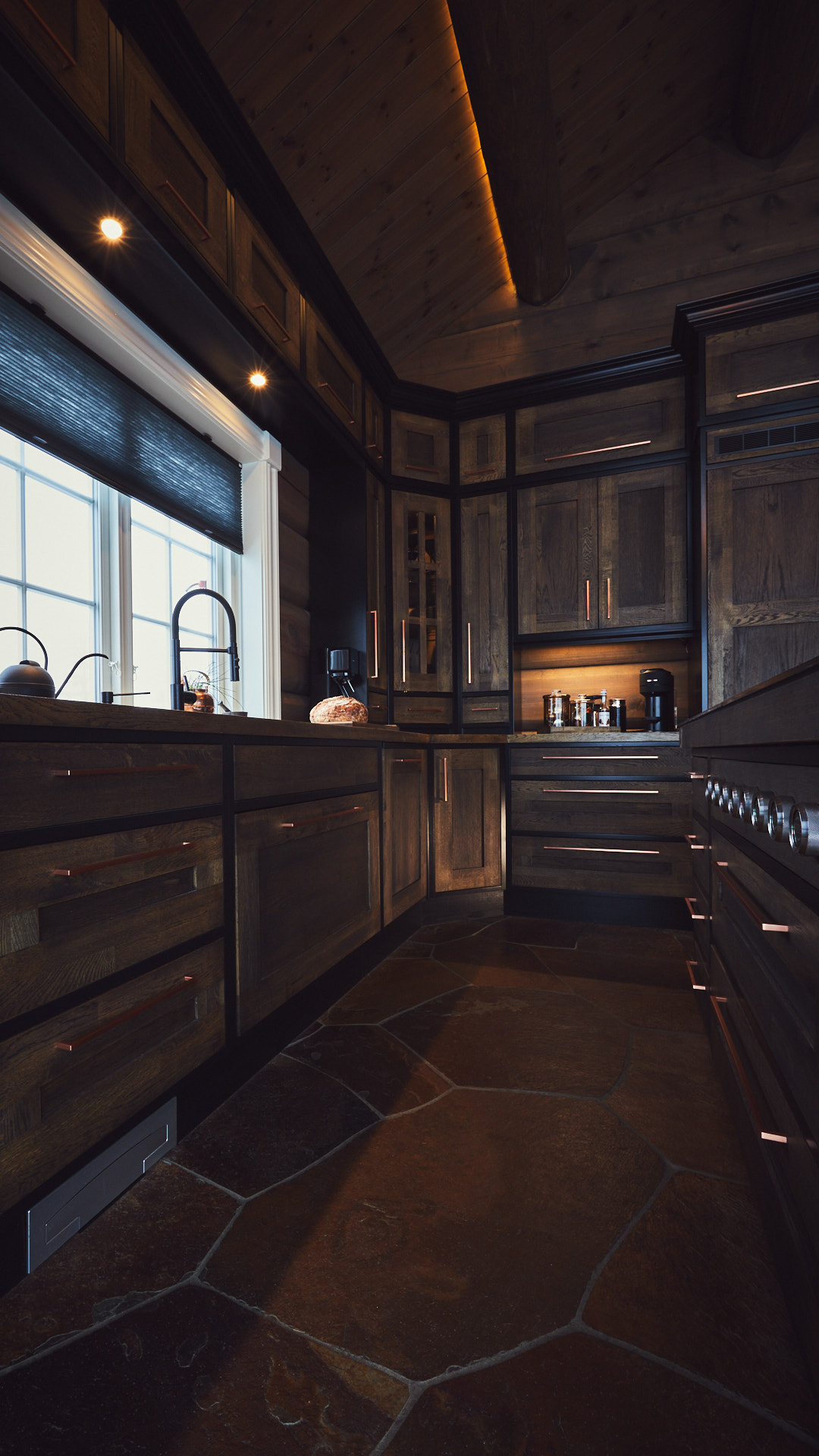 Kjøkkenet har skrog av kvistfri furu, malt i fargen dempet sort. Alle dører og skuffefronter er av eik behandlet med dekorvoks. Her har vi levert komplett løsning med hvitevarer og belysning fra Bergro AS.
