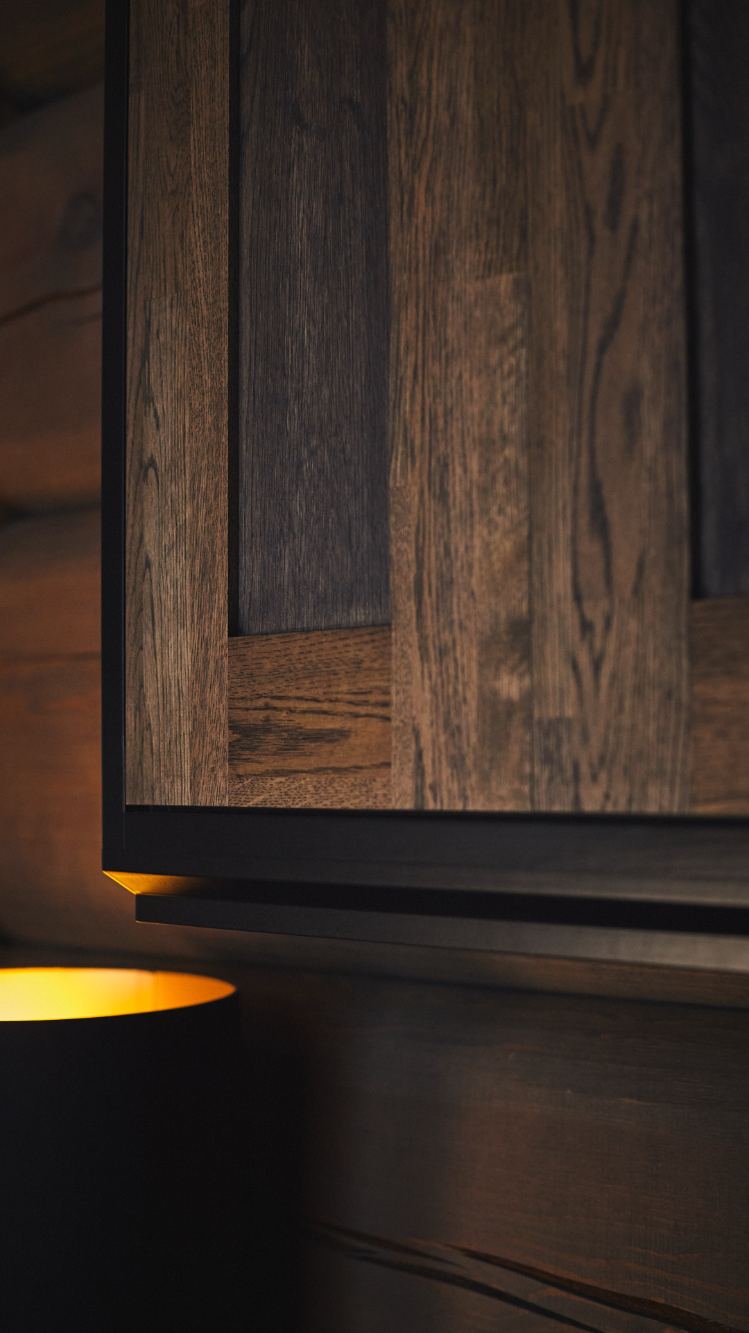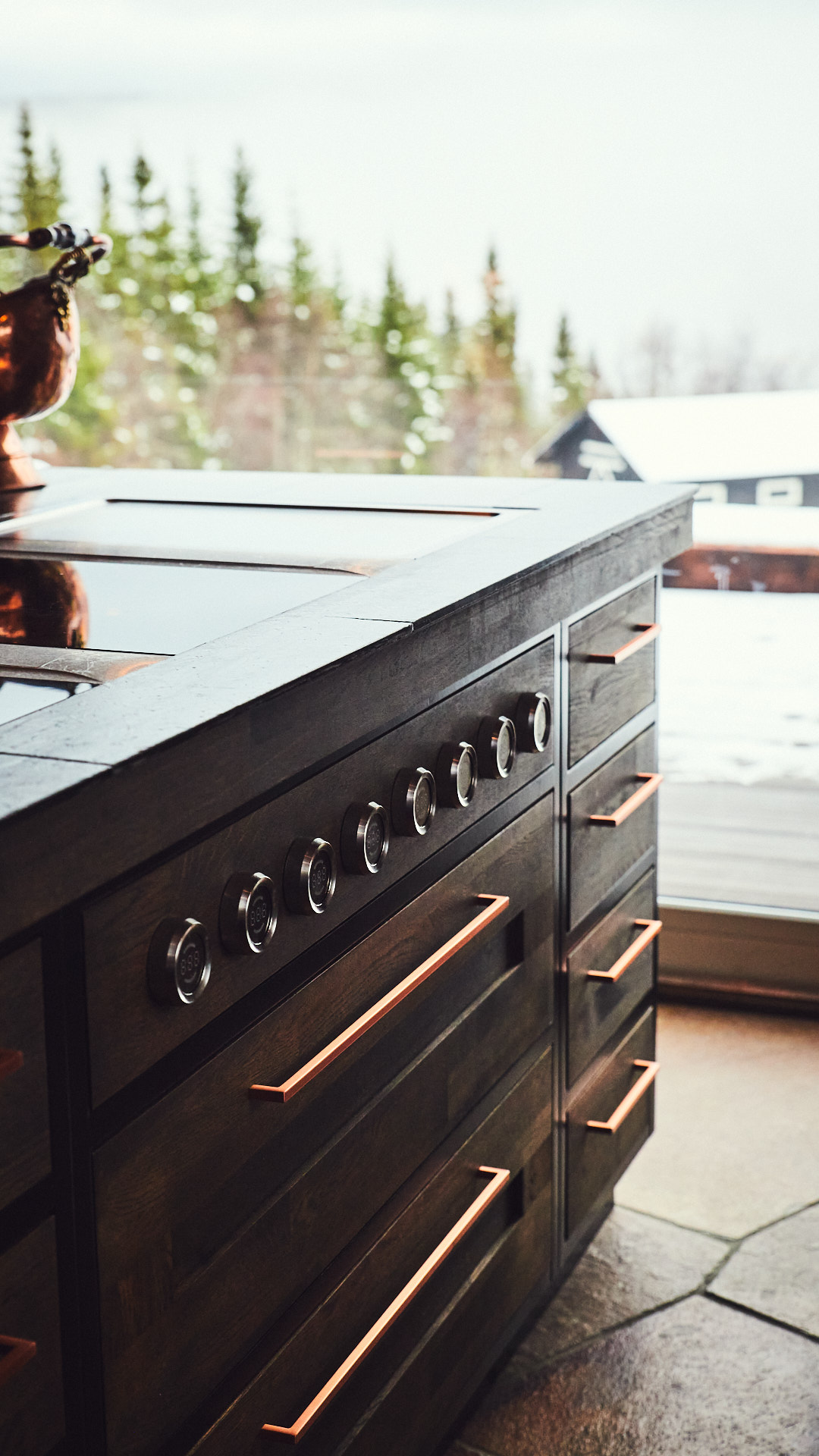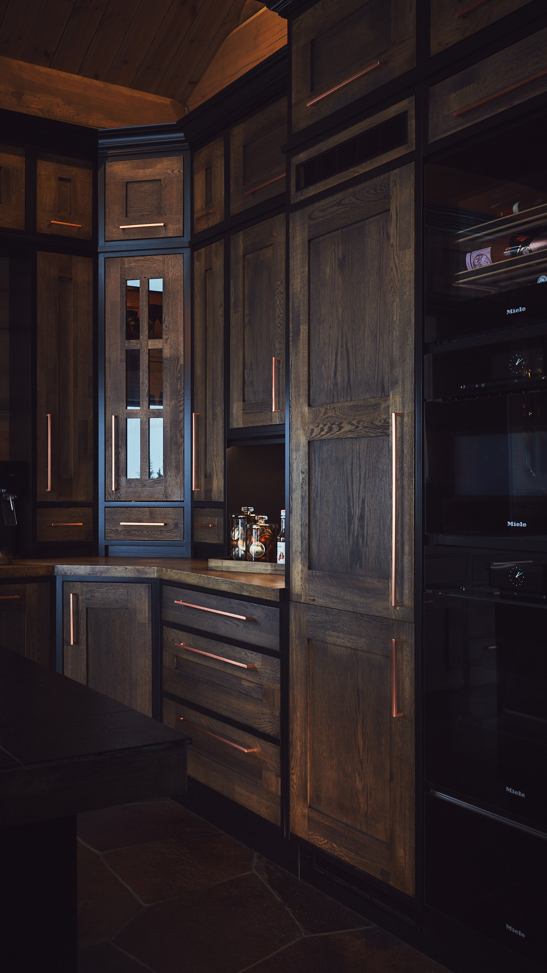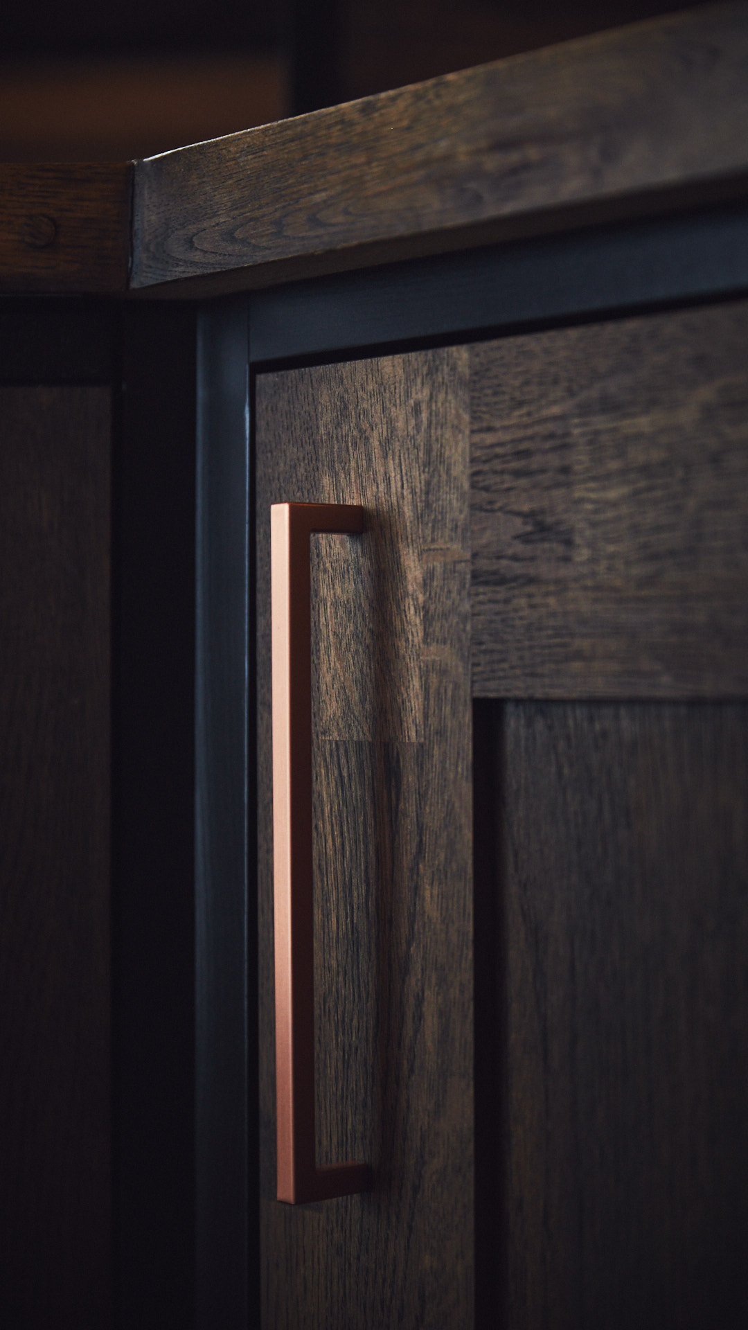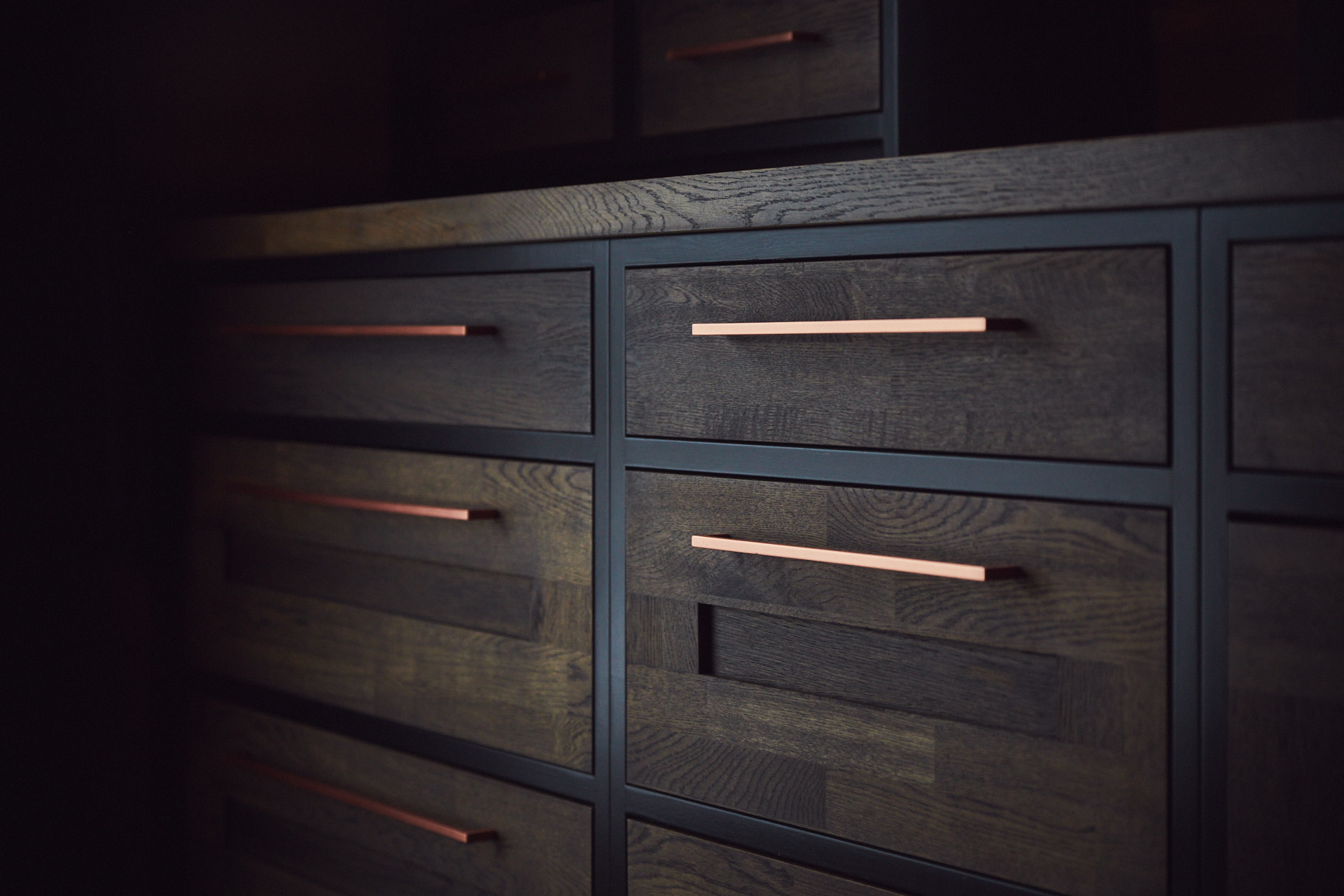 Kjøkkenet har skrog av kvistfri furu, malt i fargen dempet sort. Alle dører og skuffefronter er av eik behandlet med dekorvoks. Her har vi levert komplett løsning med hvitevarer og belysning fra Bergro AS.