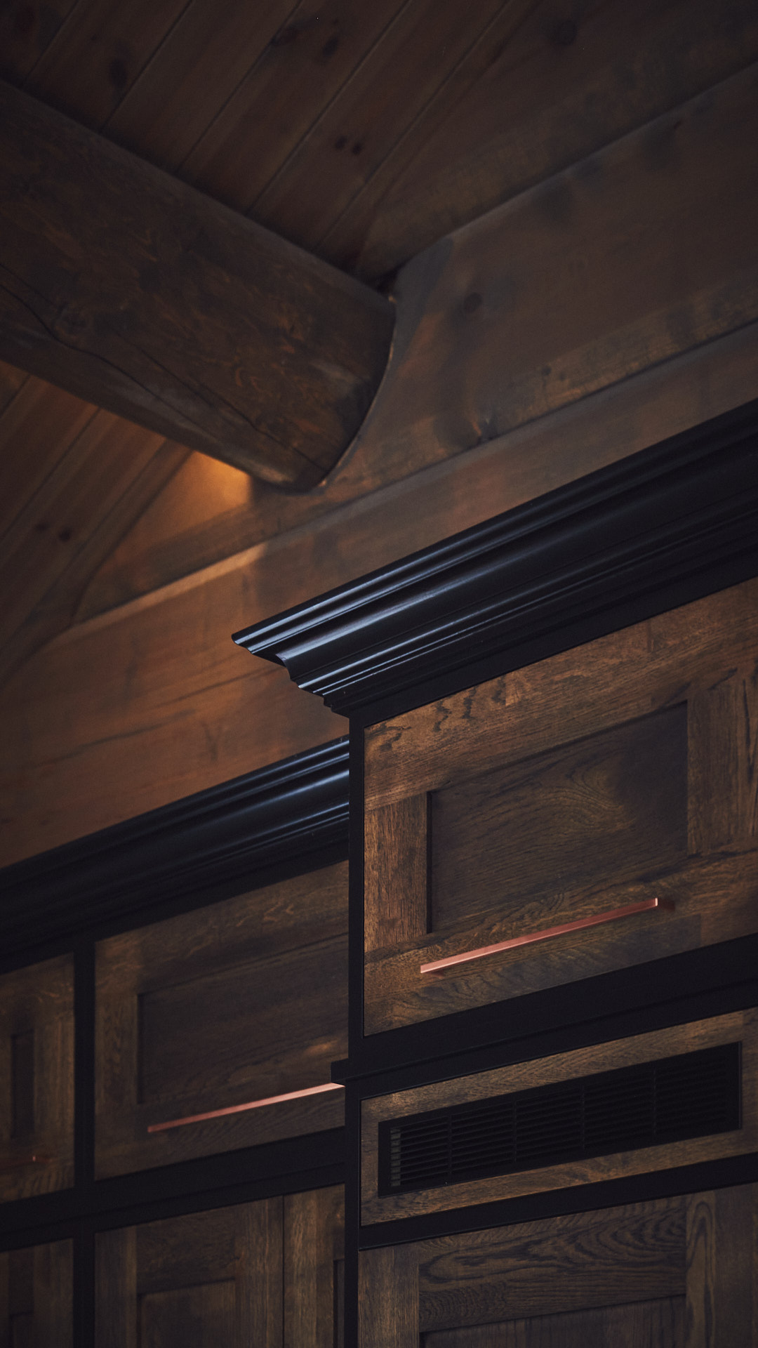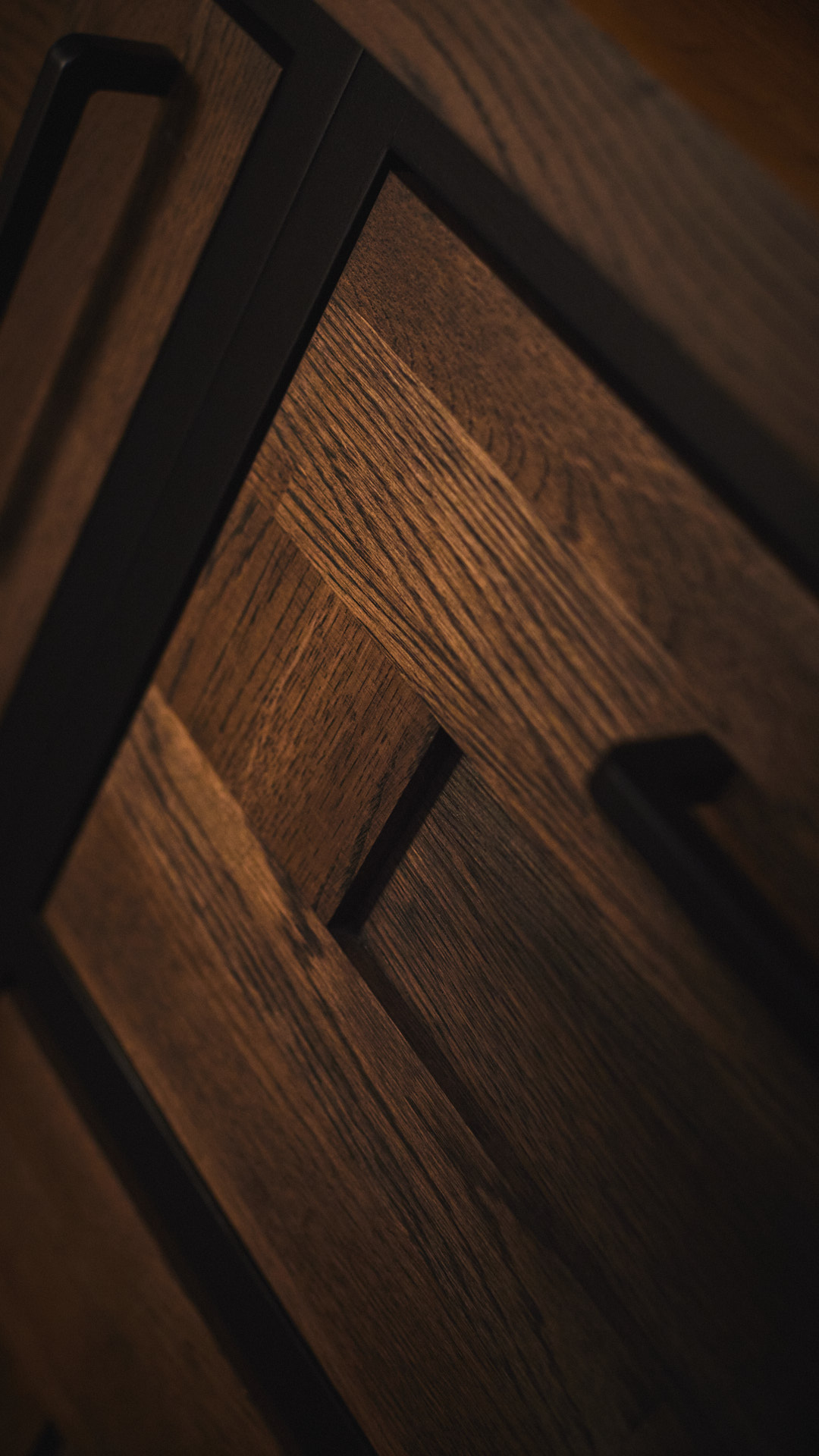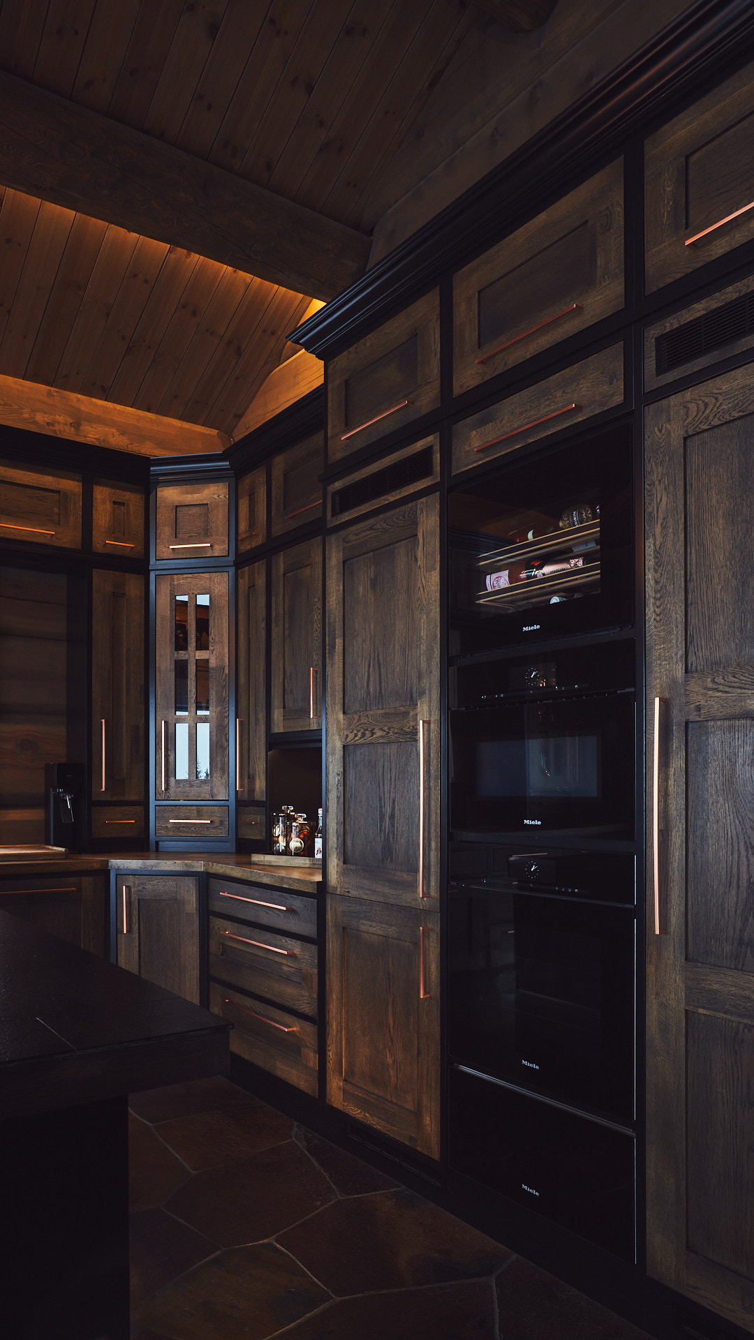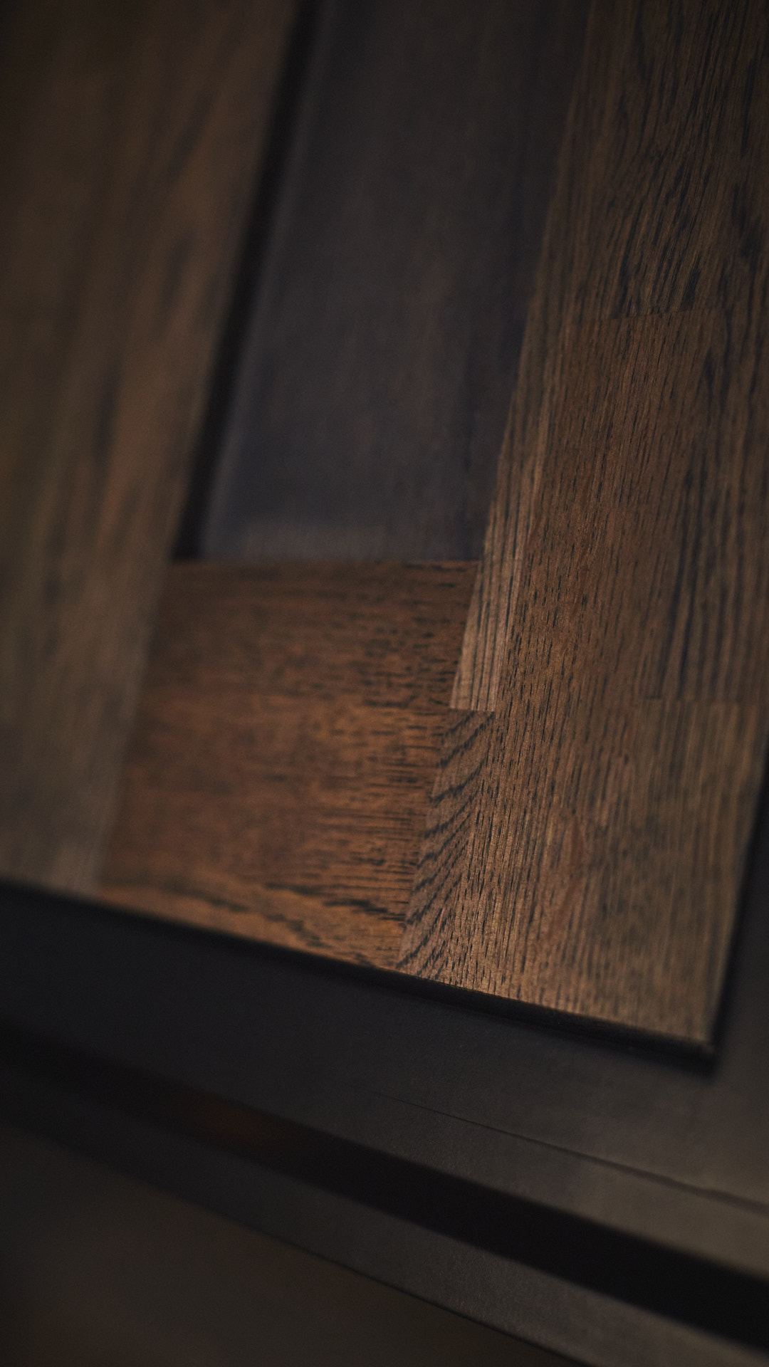 Kjøkkenet har skrog av kvistfri furu, malt i fargen dempet sort. Alle dører og skuffefronter er av eik behandlet med dekorvoks. Her har vi levert komplett løsning med hvitevarer og belysning fra Bergro AS.