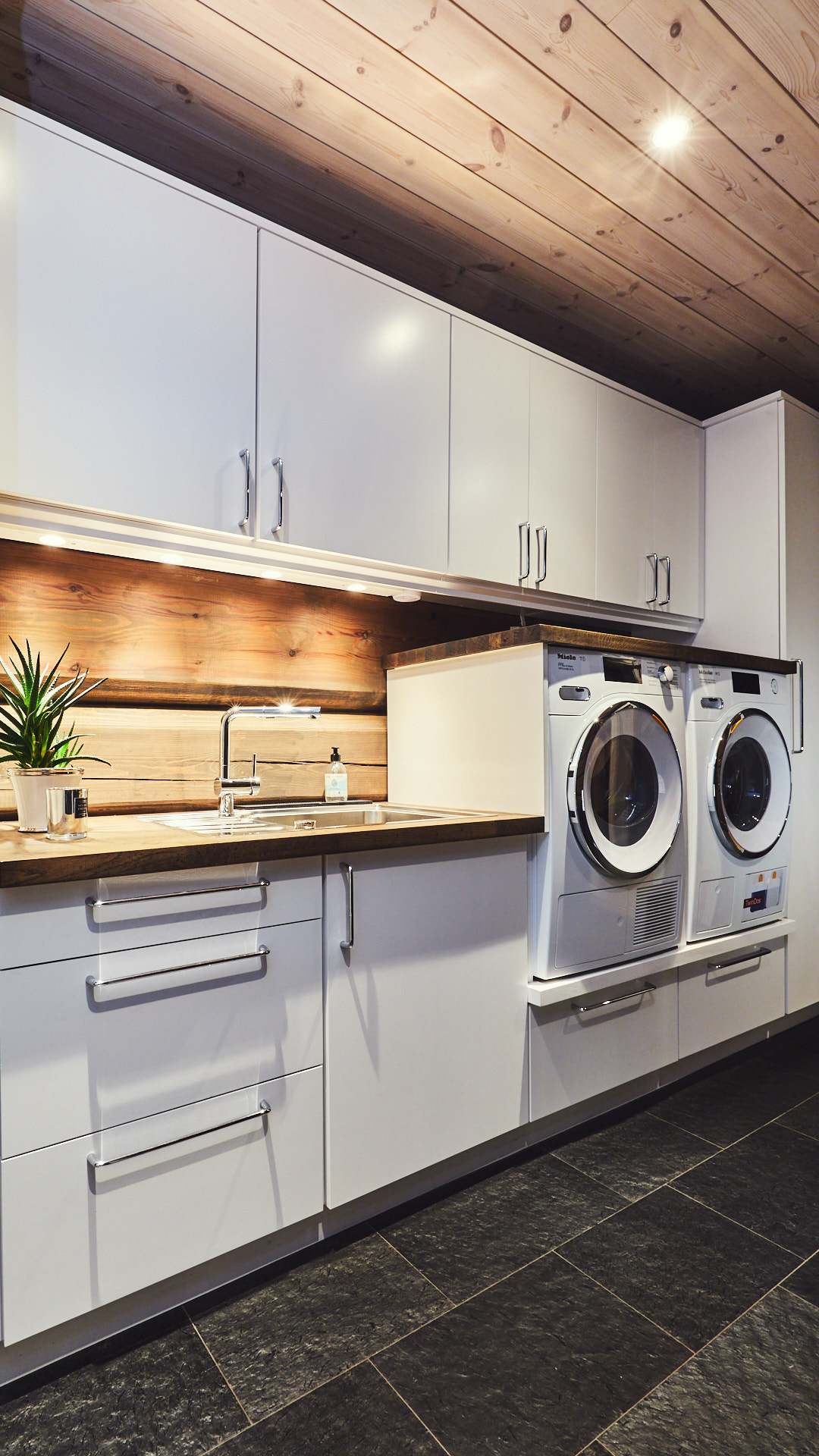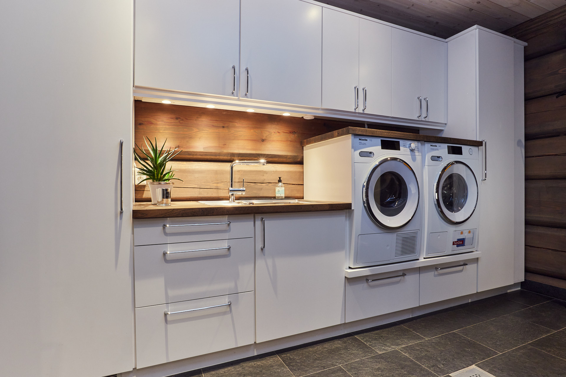 På vaskerommet er skrogene av kvistfri furu. Fronter og skap er av valchromat. Alt er malt i fargen bomull. Plassering av vaskemaskin og tørketrommel er tilpasset behagelig høyde for håndtering. Benkeplaten av eik er behandlet med Osmo dekorvoks.