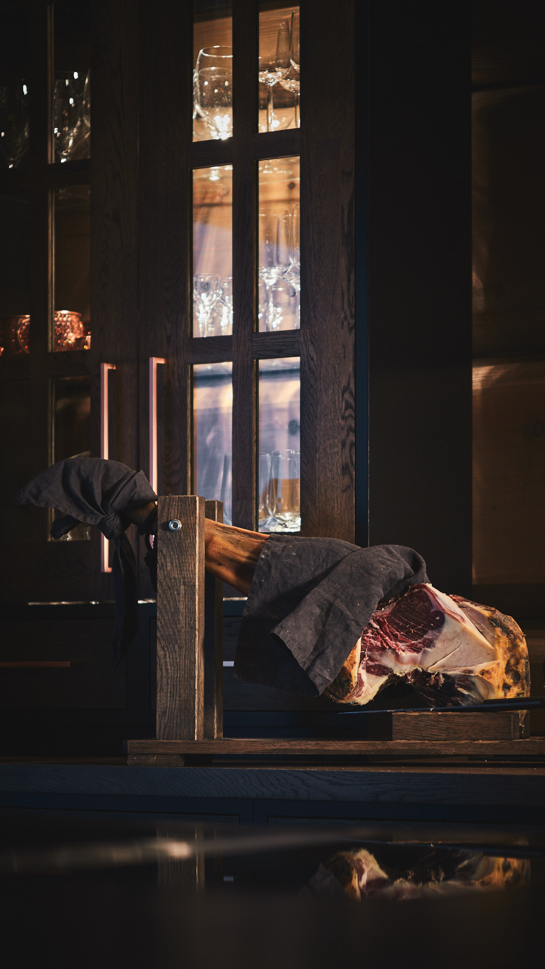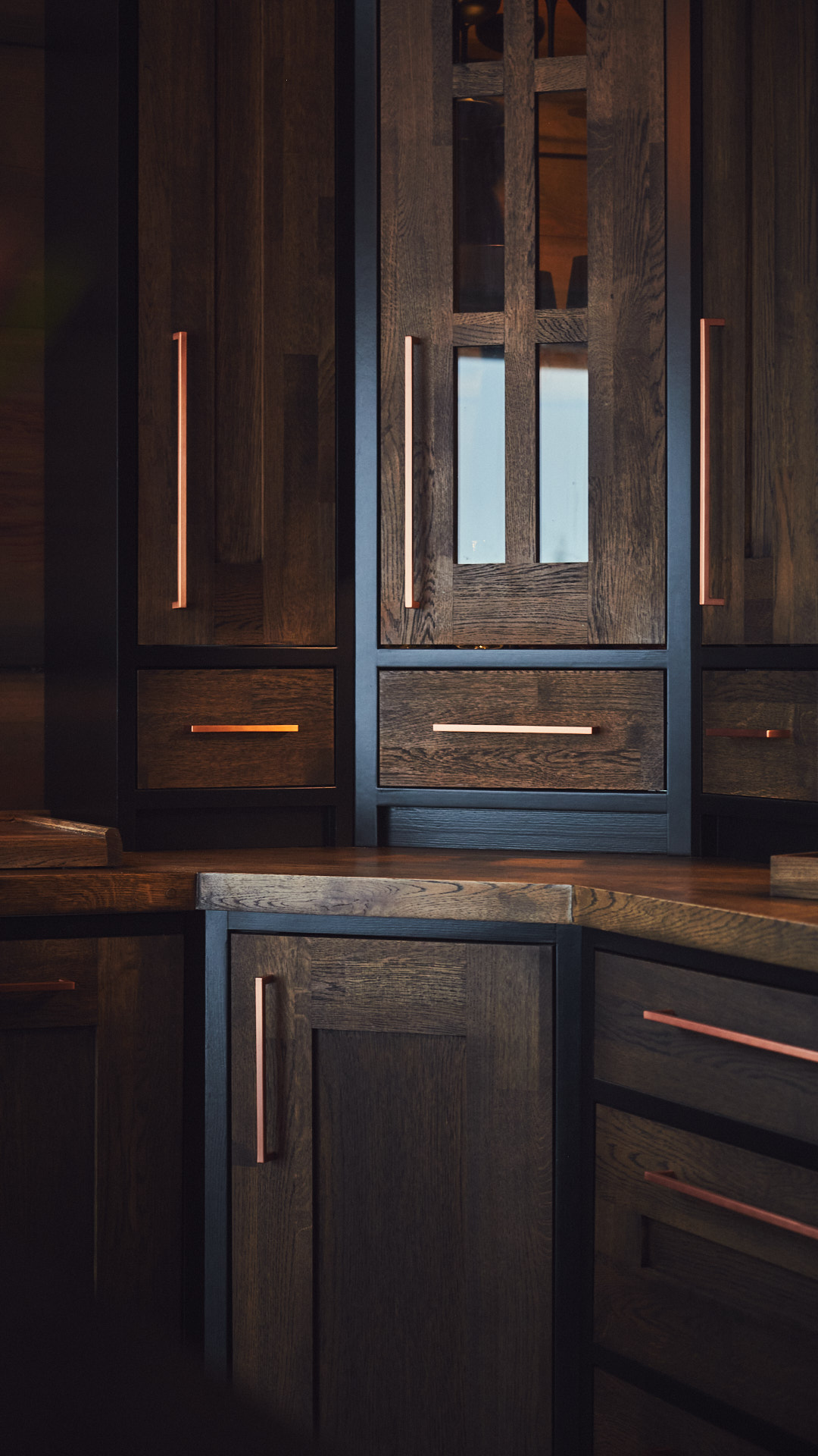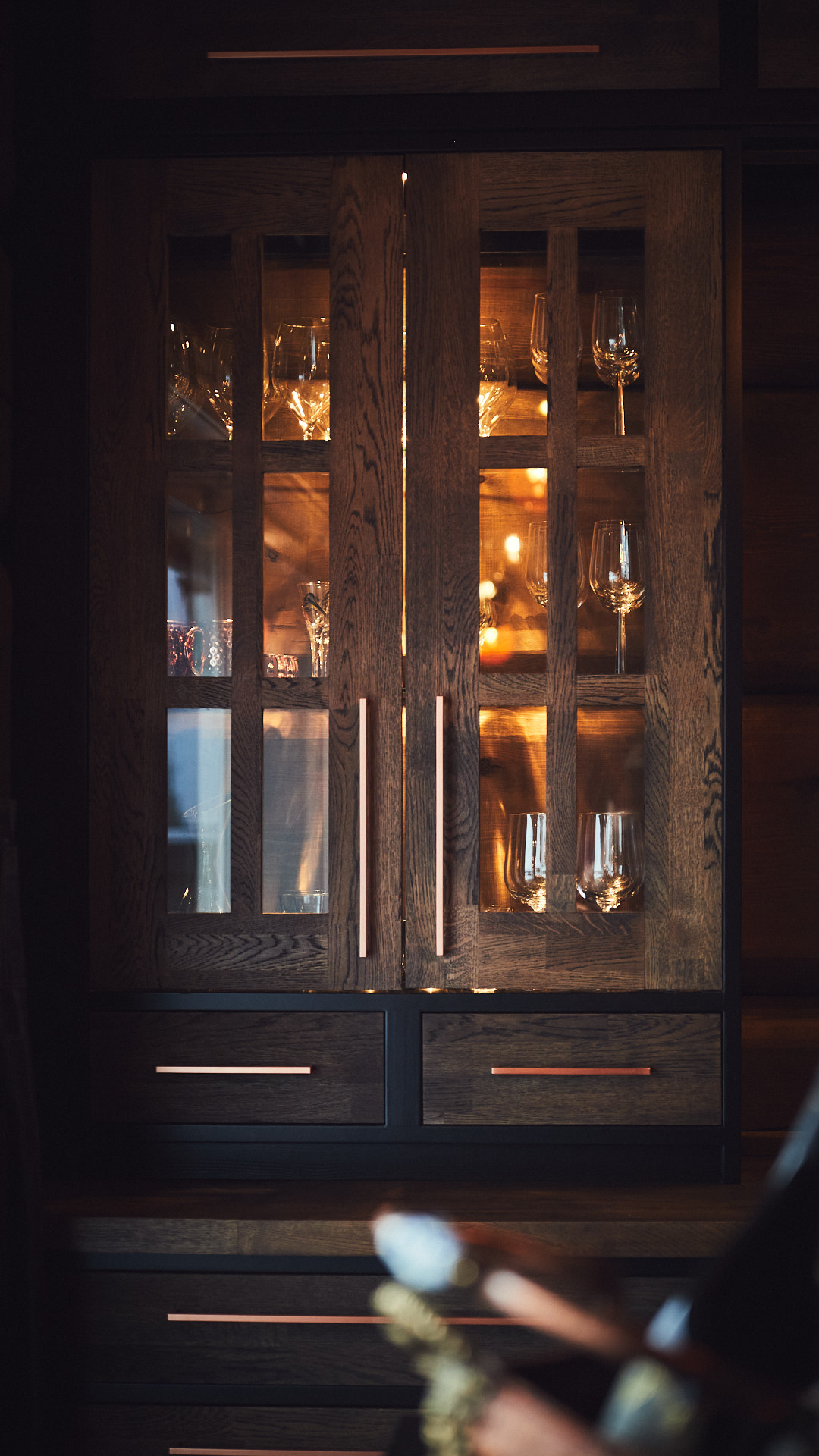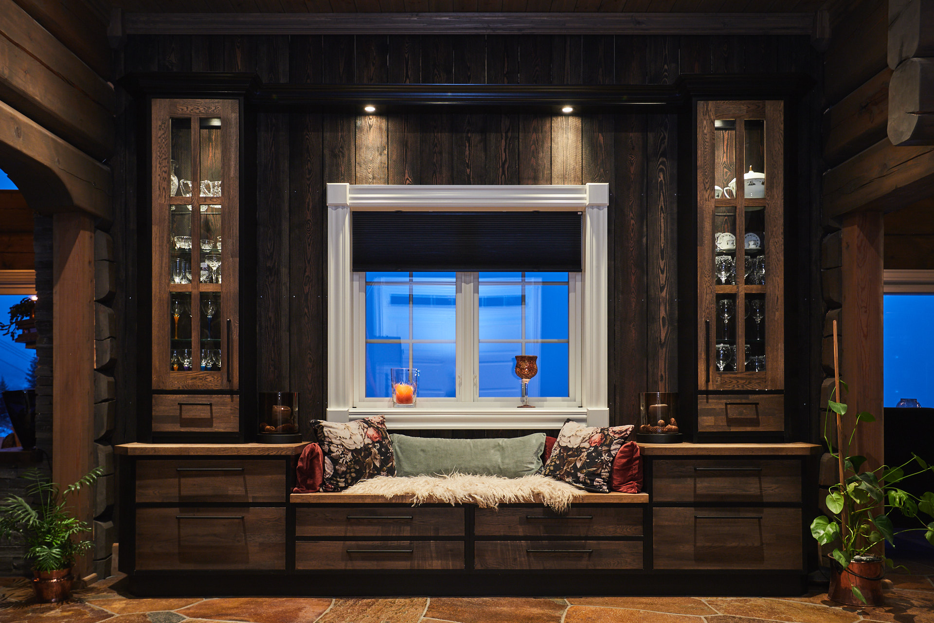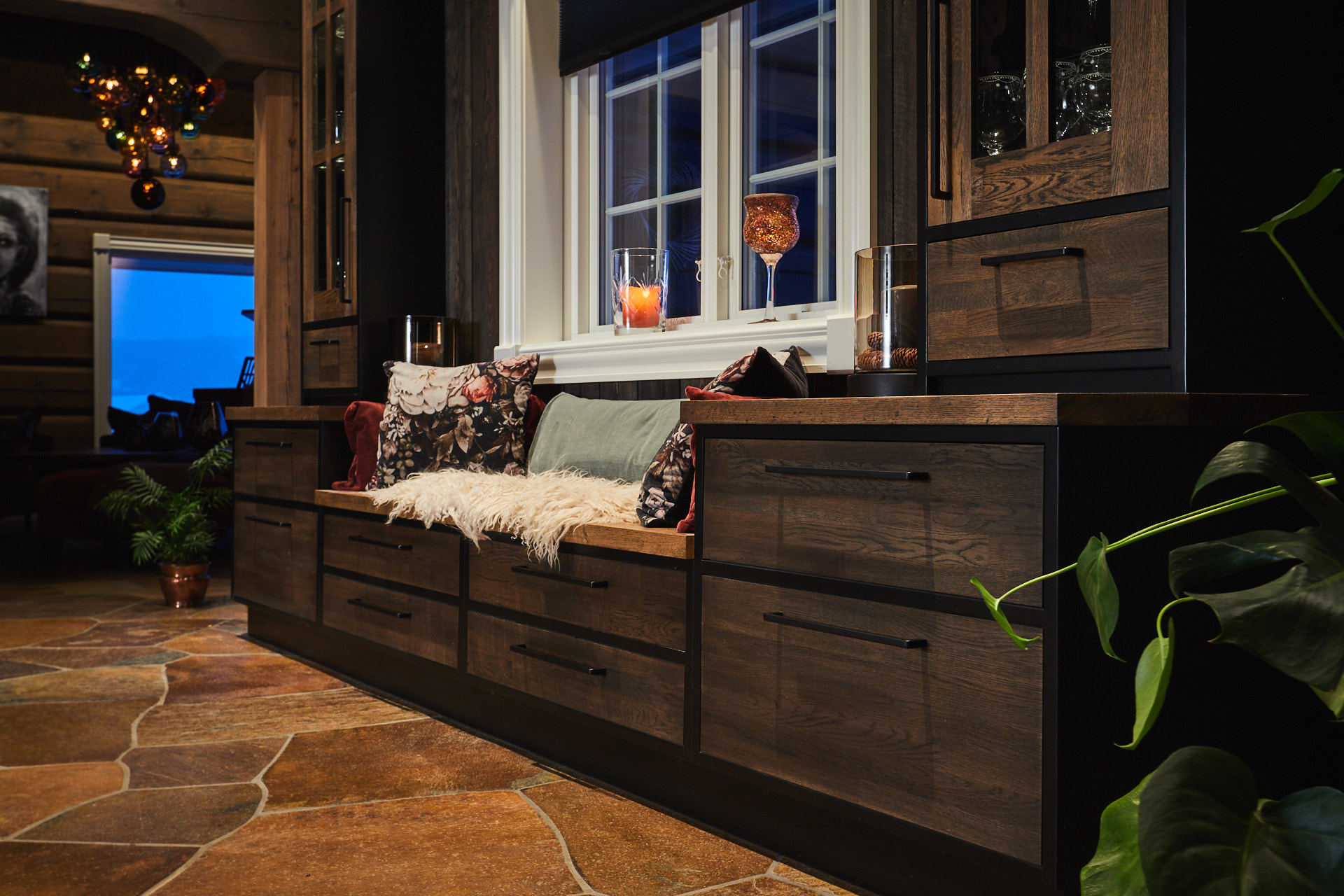 Kombinert seksjon og sittebenk gir både oppbevaringsplass og atmosfære til entreen. Her med praktisk oppbevaring i skuffer i bunnen og vitrineskap med belysning på topp.