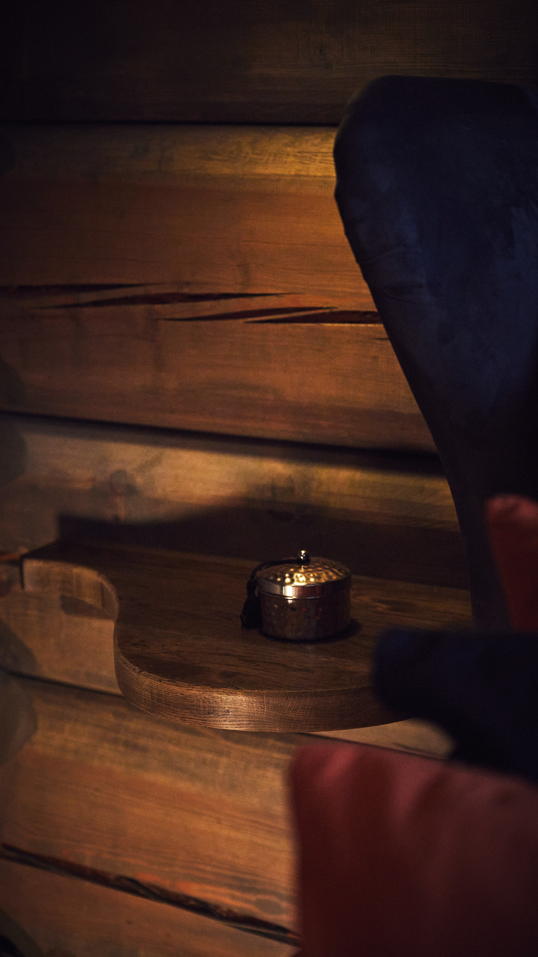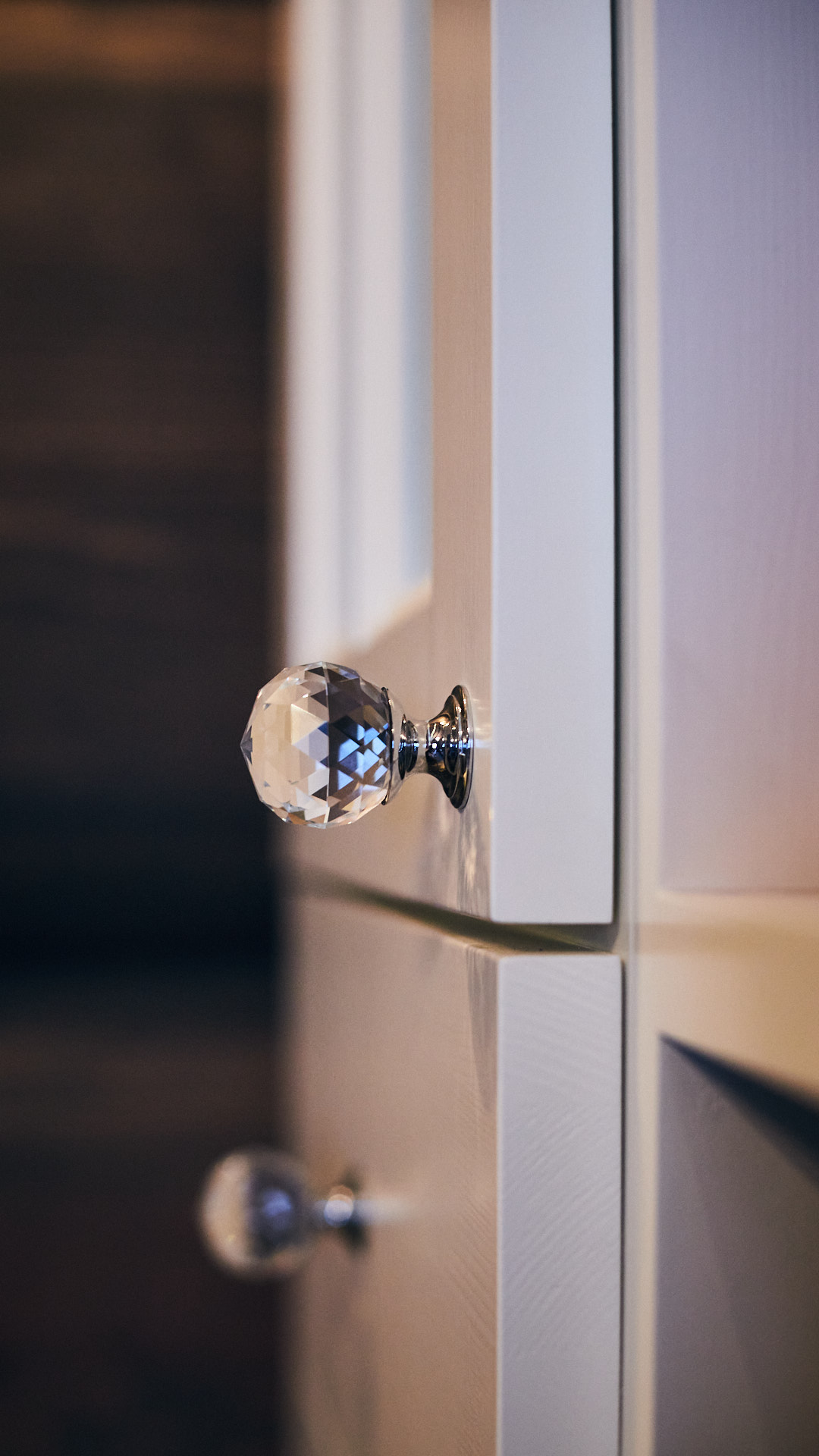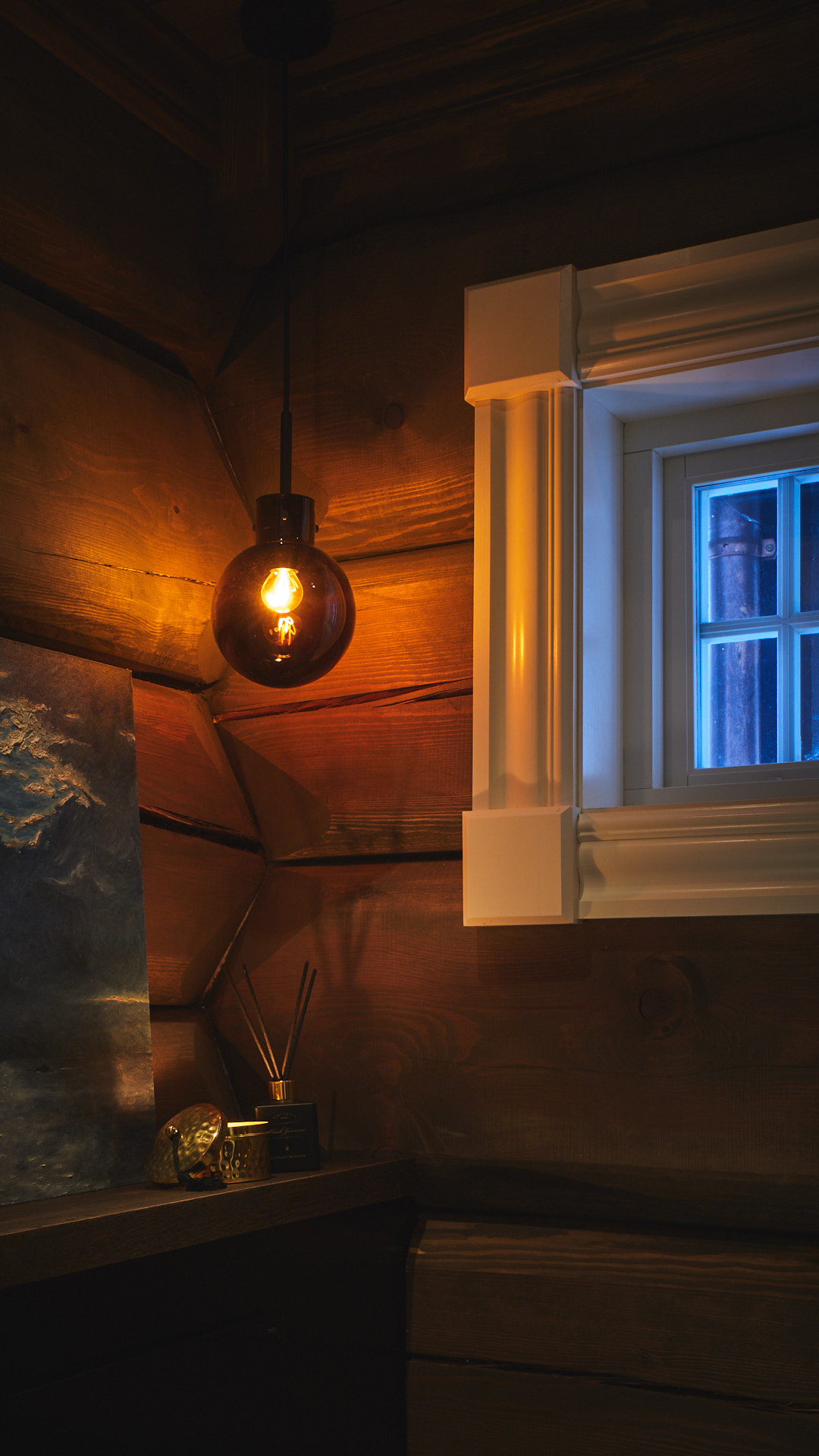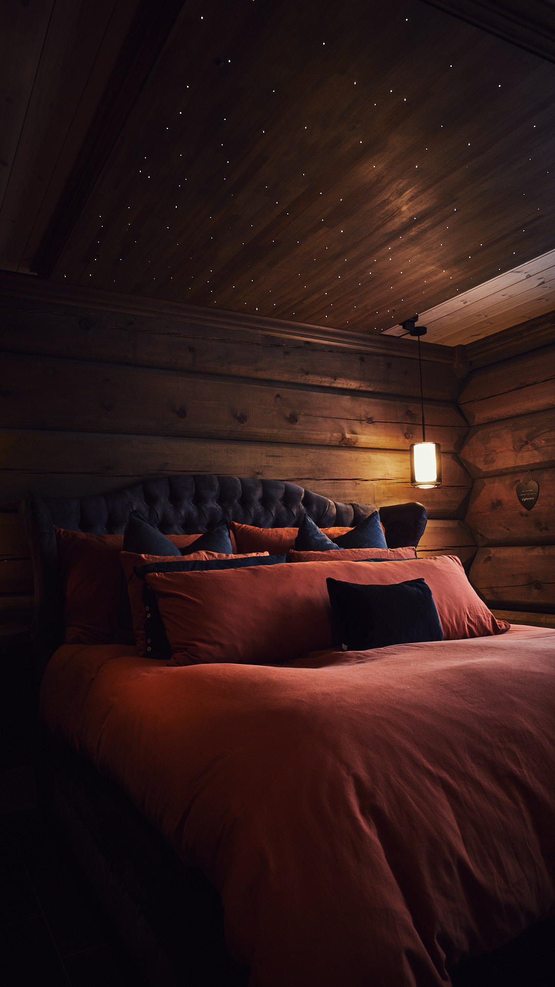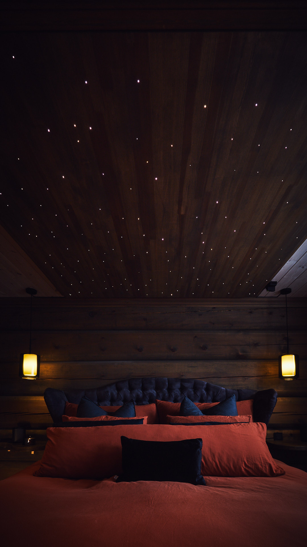 Soverommet har egen stjernehimmel og elegante vegghengte nattbord av tykk eik. Dette soverommet har også fått et garderobeskap av kvistfri furu, malt i fargen bomull, med profilerte dører og benkeplate av eik.