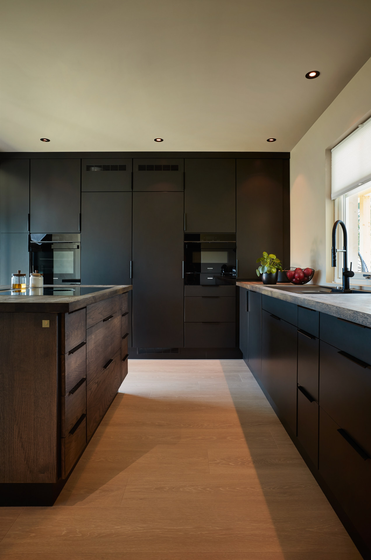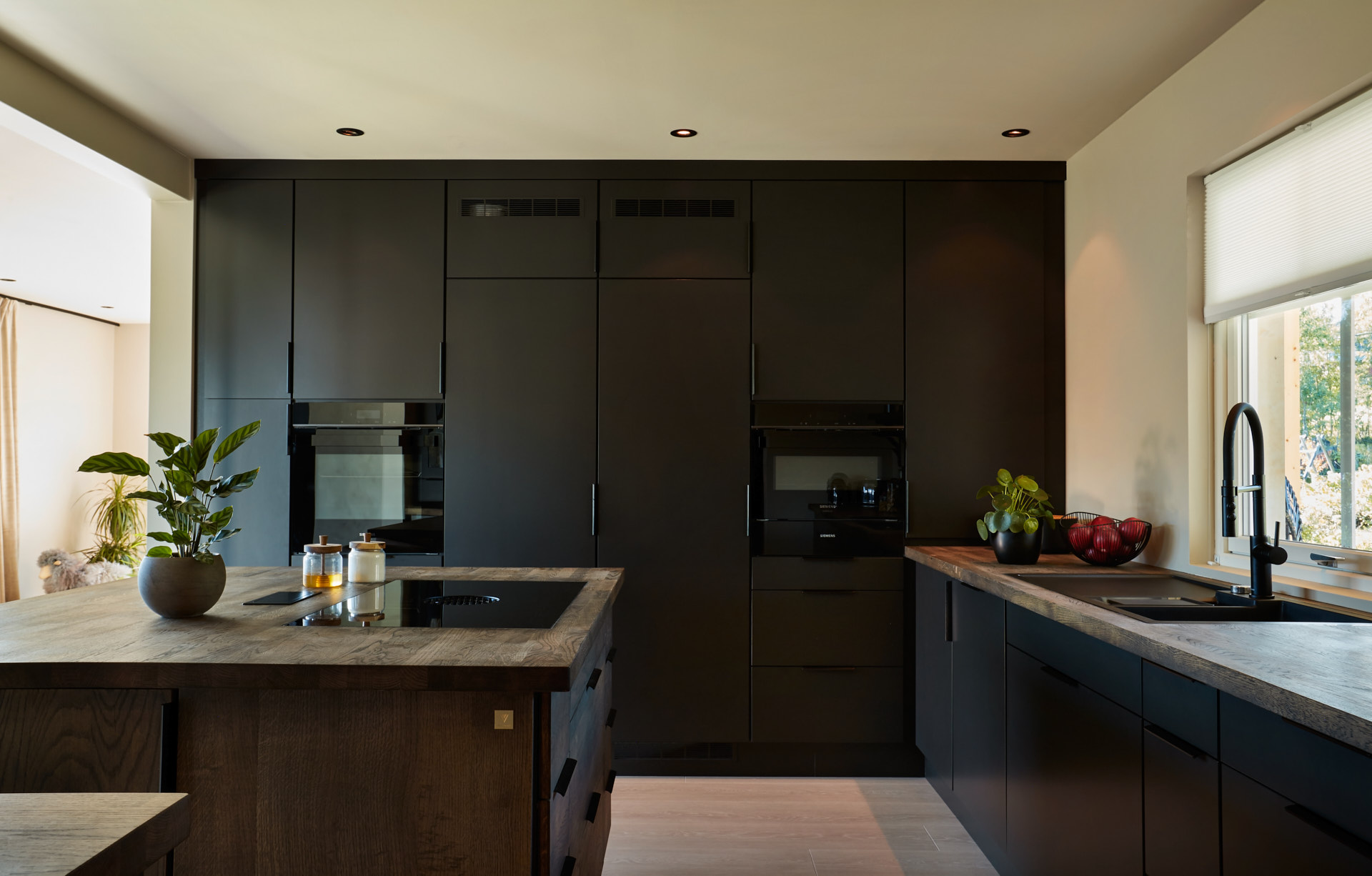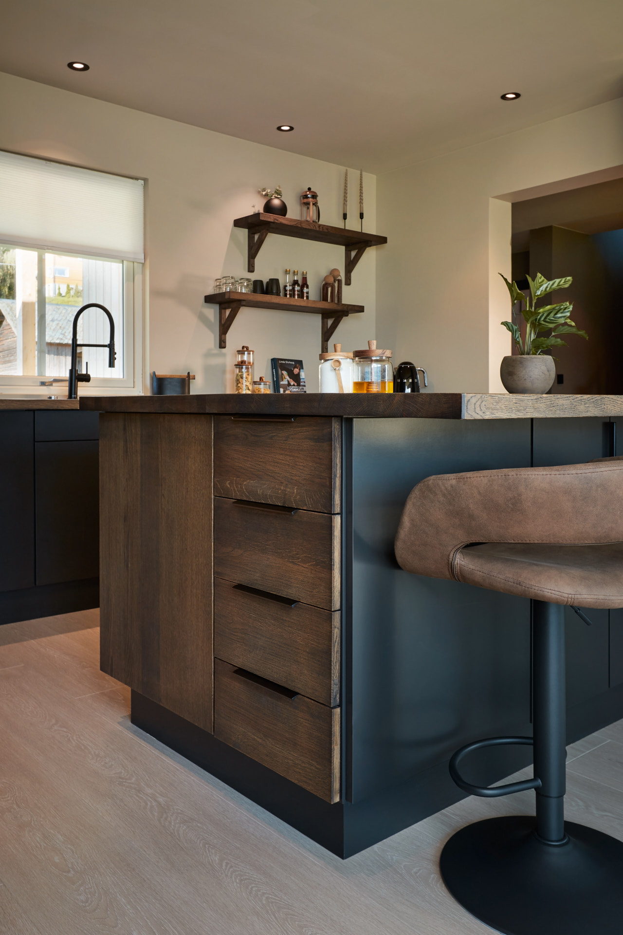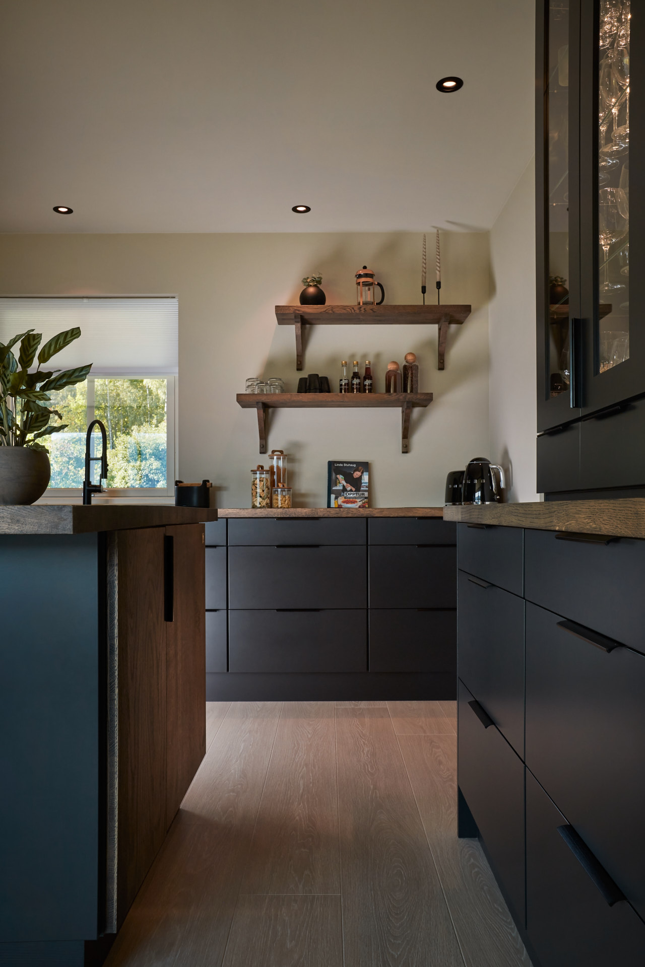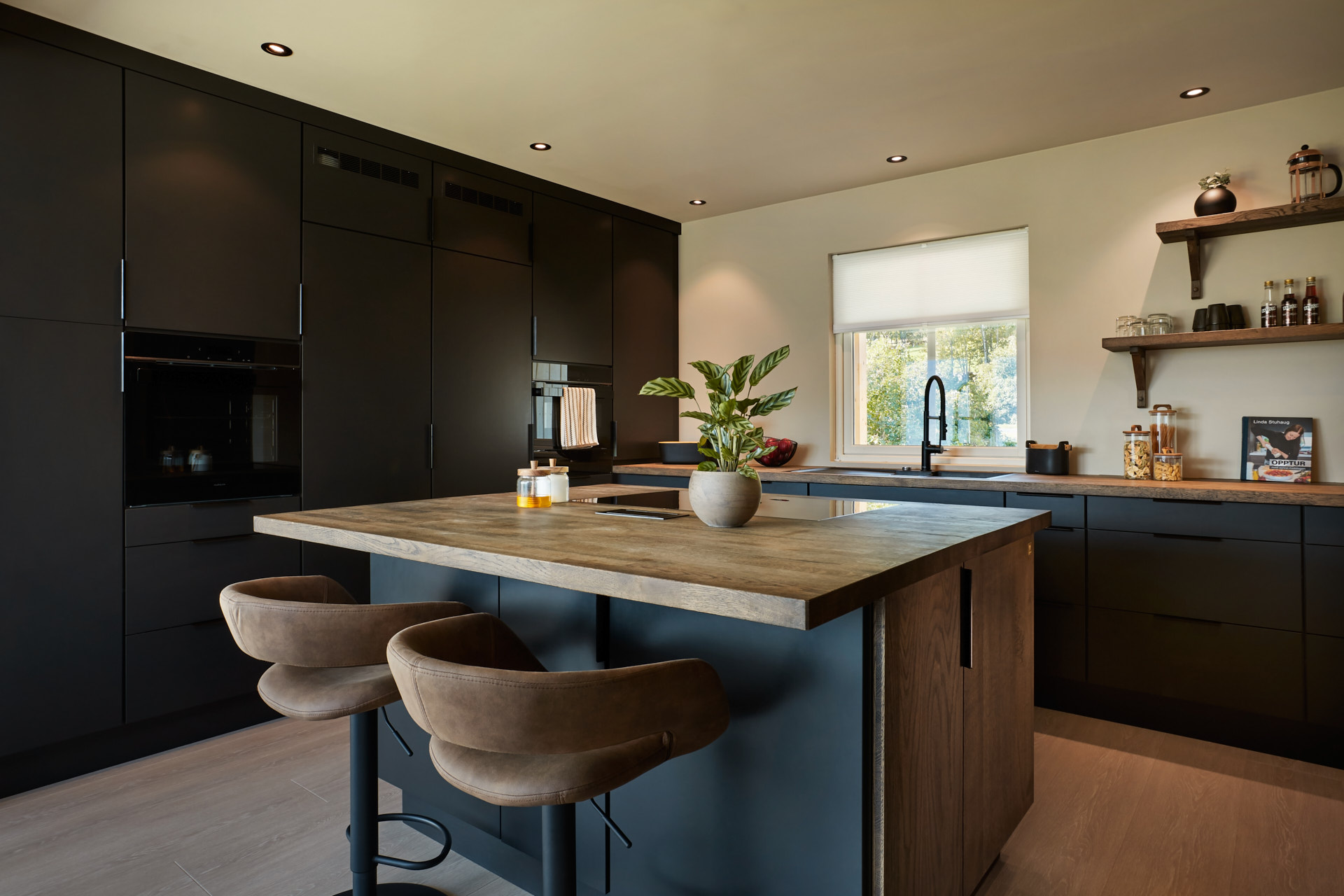 En hel vegg med høyskap frigjør en hel masse plass til benk og arbeidsområde. Dette kjøkkenet har en langstrakt kjøkkenbenk og en romslig kjøkkenøy med sitteplasser. Hvitevarene er elegante og integrert i interiøret, og fremhever kjøkkenets linjer og design. Alle skrog er laget av kvistfri furu, malt i fargen Dempet Sort. Benkeplater, samt skuffefronter og dører på kjøkkenøy er av eik og er behandlet med sort Osmo dekorvoks.