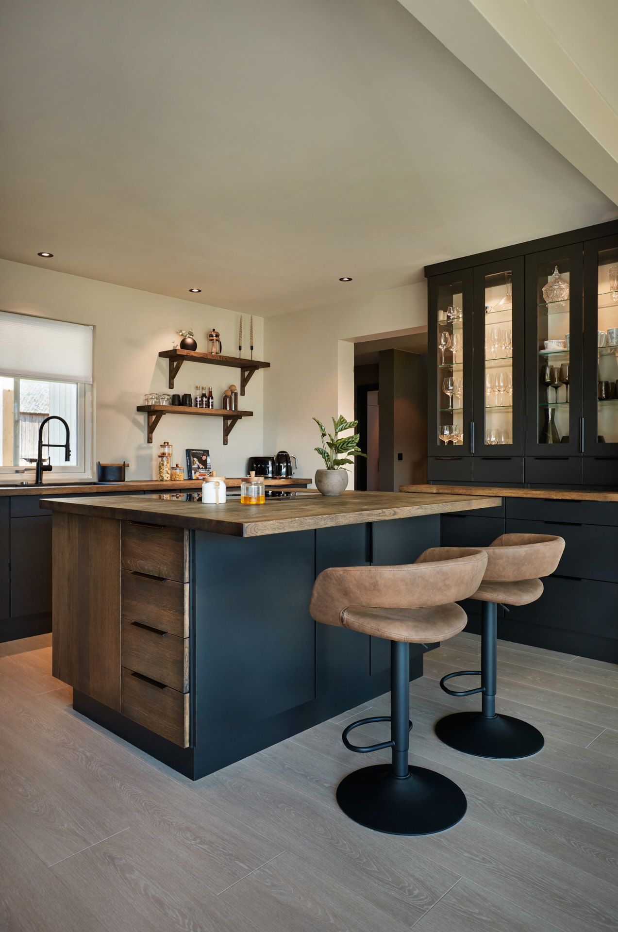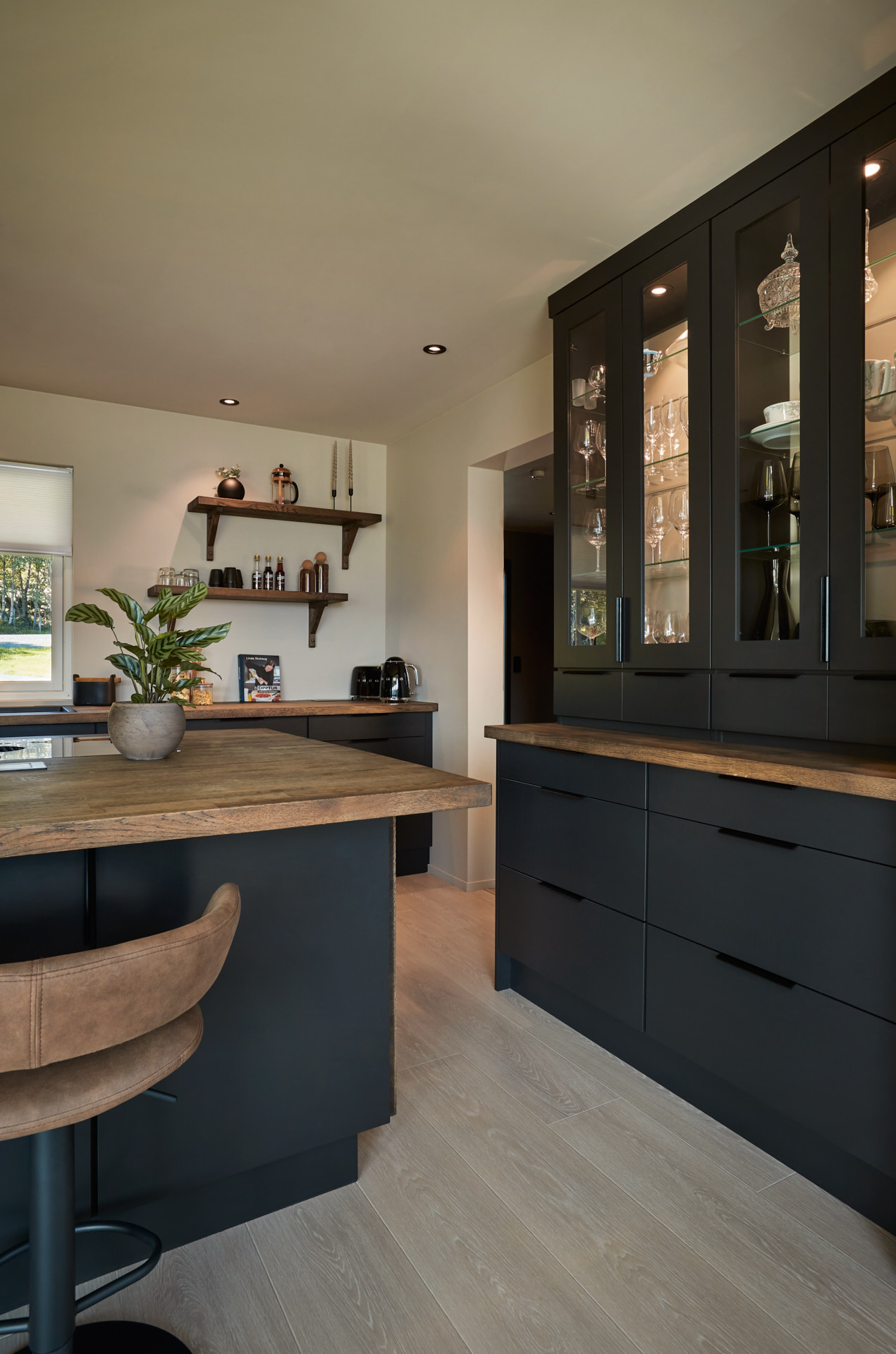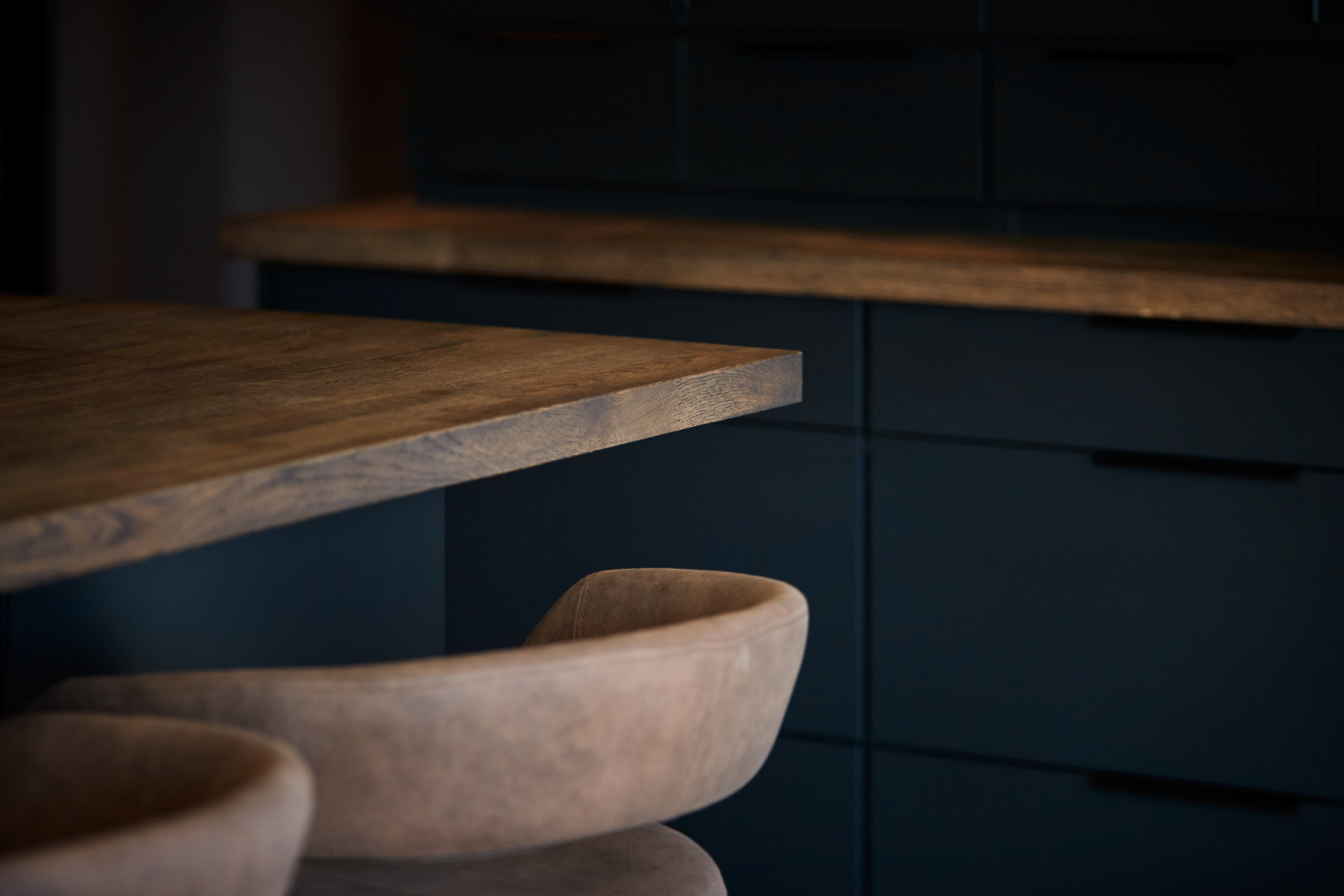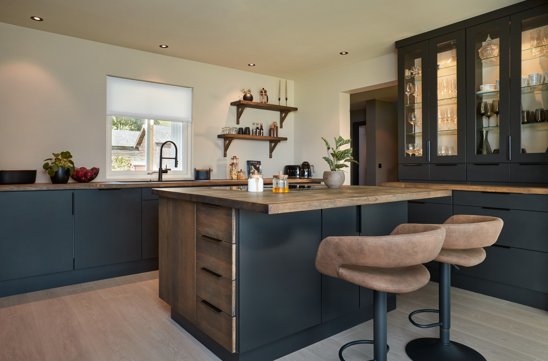 En hel vegg med høyskap frigjør en hel masse plass til benk og arbeidsområde. Dette kjøkkenet har en langstrakt kjøkkenbenk og en romslig kjøkkenøy med sitteplasser. Hvitevarene er elegante og integrert i interiøret, og fremhever kjøkkenets linjer og design. Alle skrog er laget av kvistfri furu, malt i fargen Dempet Sort. Benkeplater, samt skuffefronter og dører på kjøkkenøy er av eik og er behandlet med sort Osmo dekorvoks.