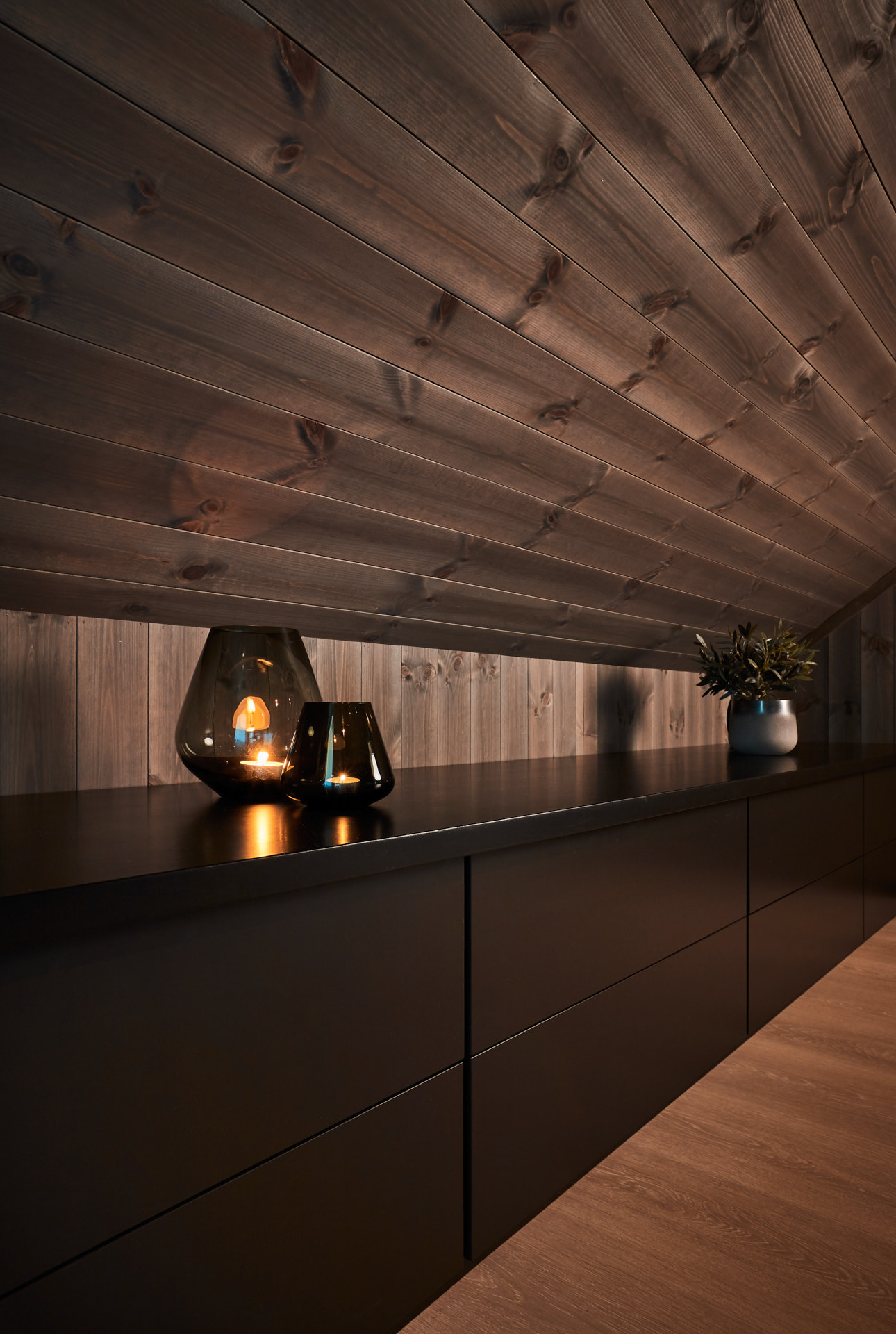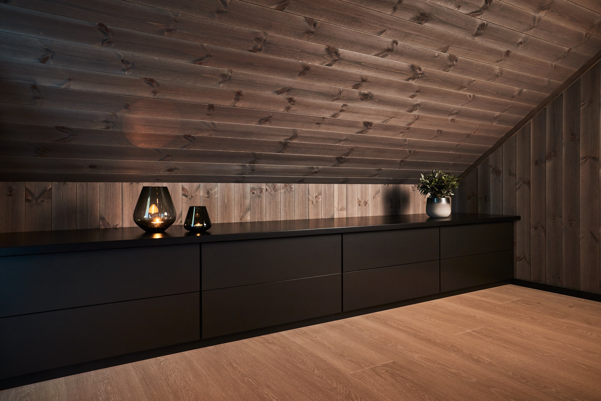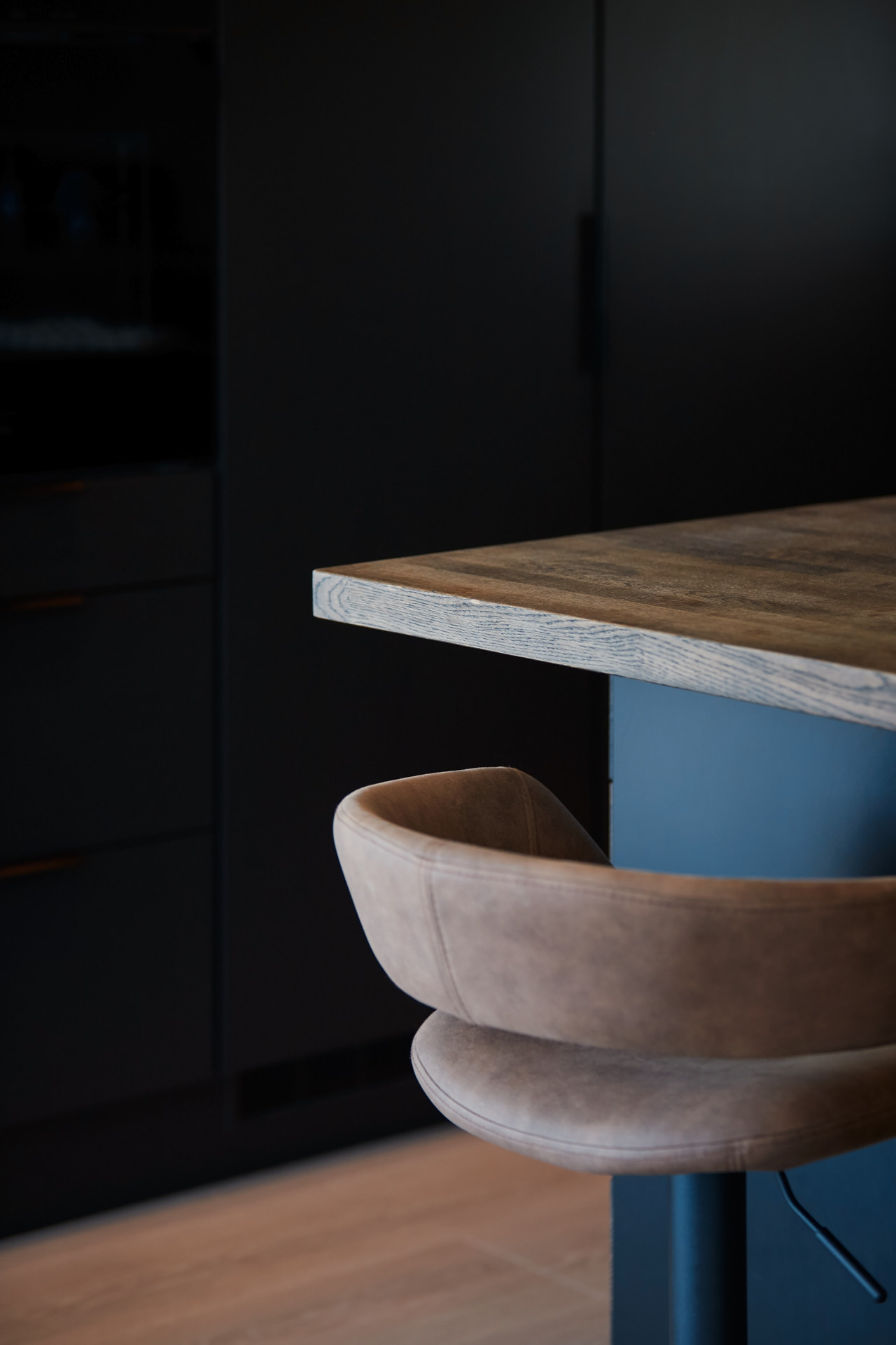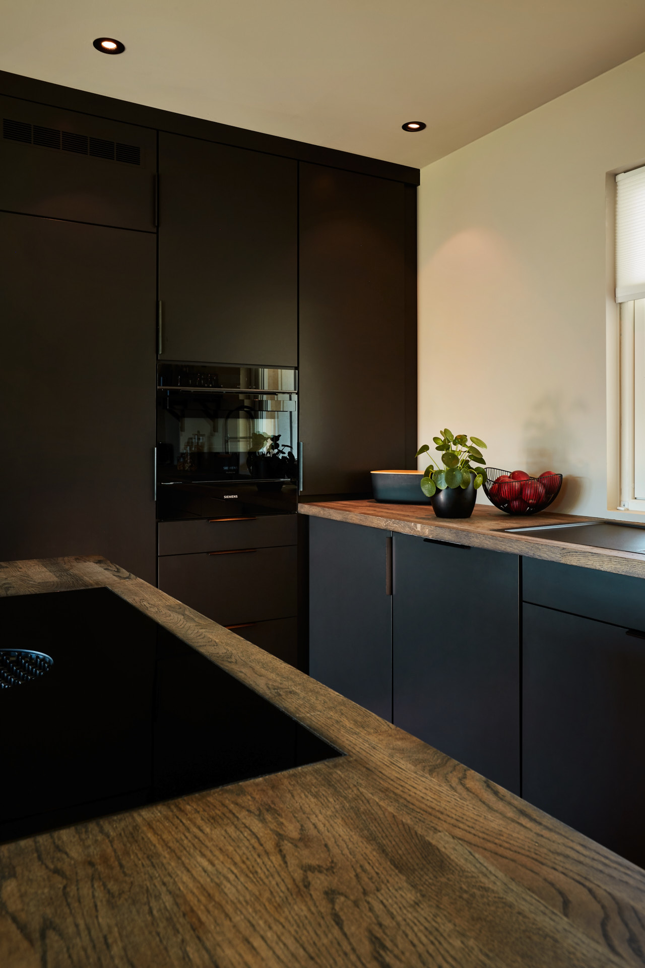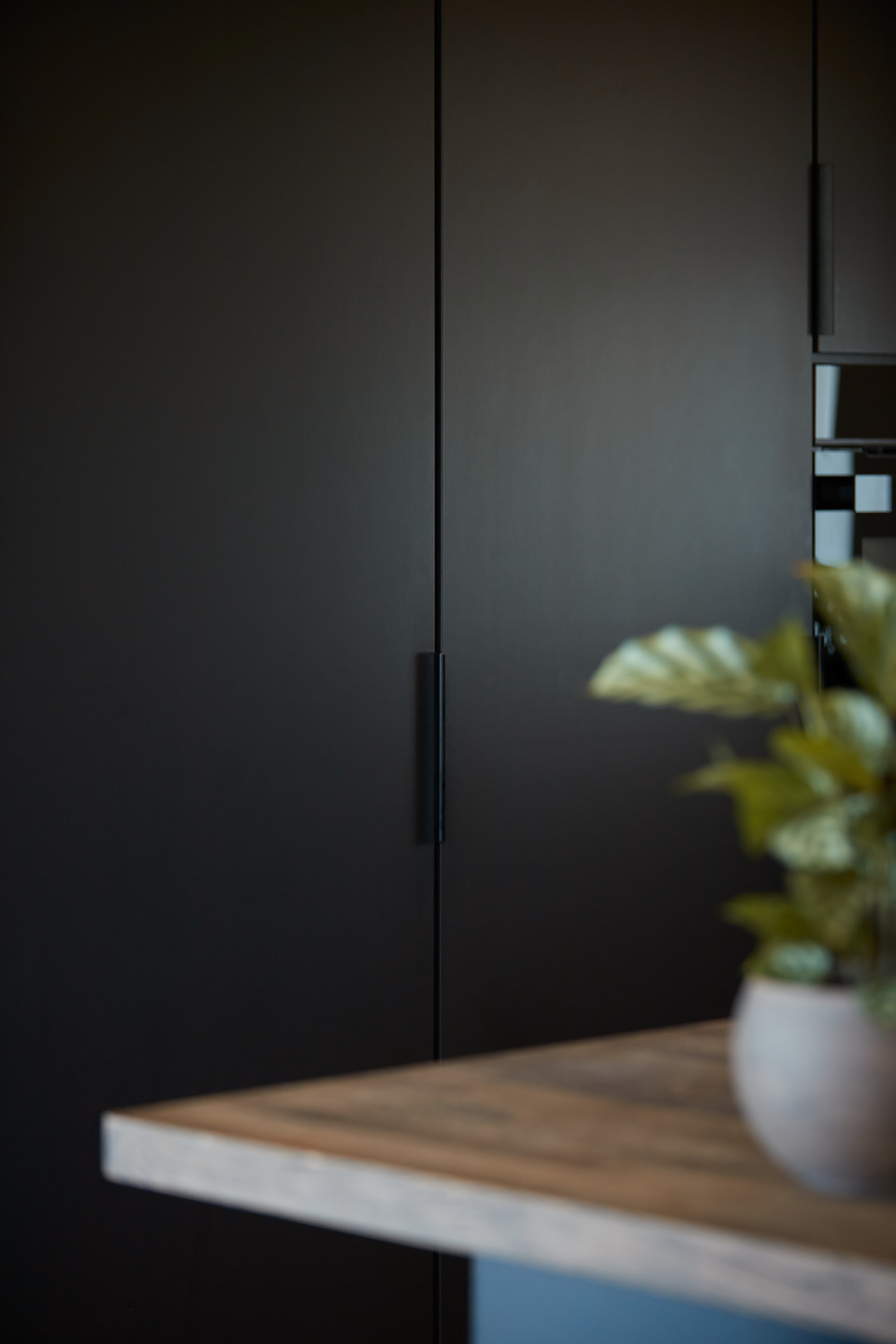 En hel vegg med høyskap frigjør en hel masse plass til benk og arbeidsområde. Dette kjøkkenet har en langstrakt kjøkkenbenk og en romslig kjøkkenøy med sitteplasser. Hvitevarene er elegante og integrert i interiøret, og fremhever kjøkkenets linjer og design. Alle skrog er laget av kvistfri furu, malt i fargen Dempet Sort. Benkeplater, samt skuffefronter og dører på kjøkkenøy er av eik og er behandlet med sort Osmo dekorvoks.