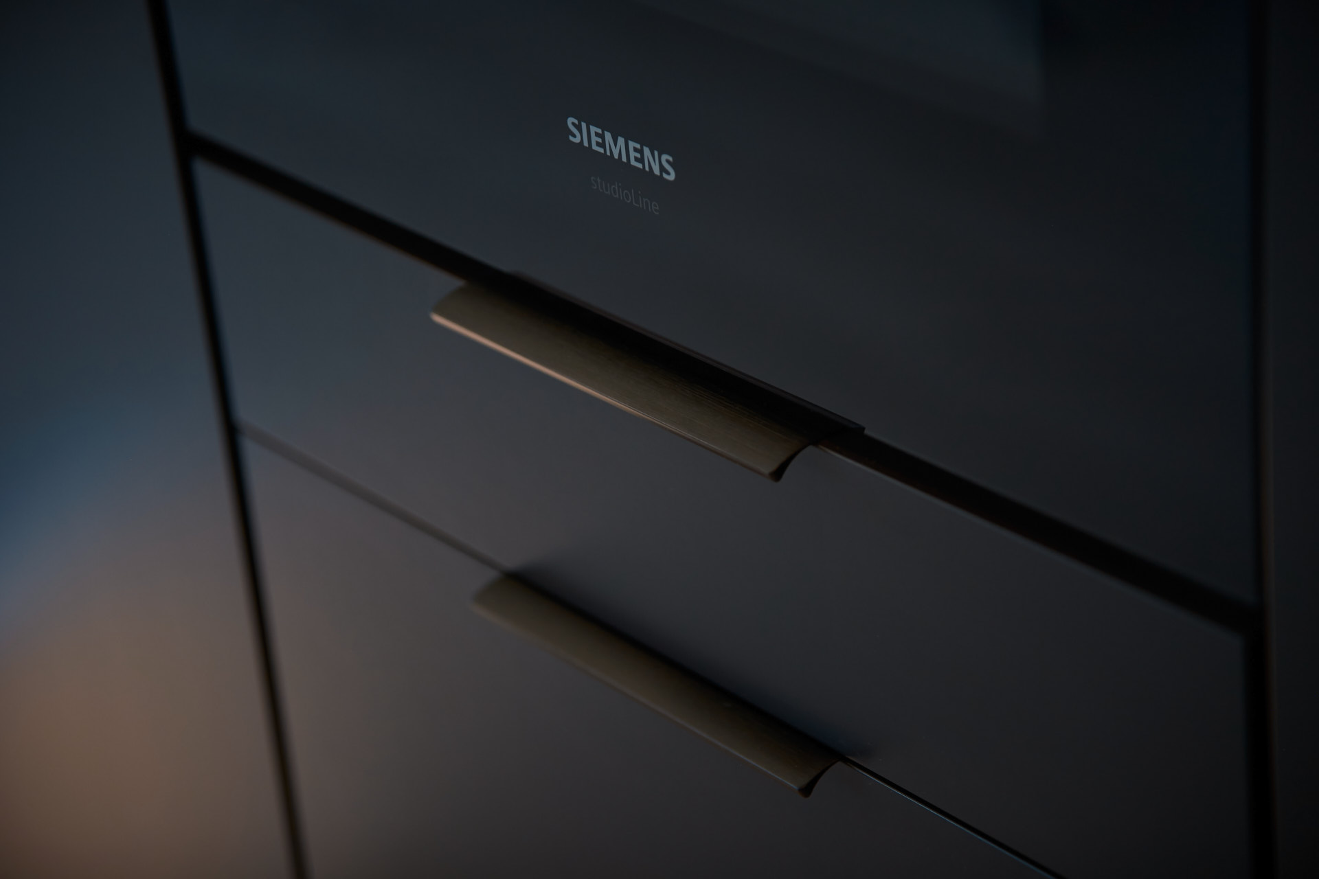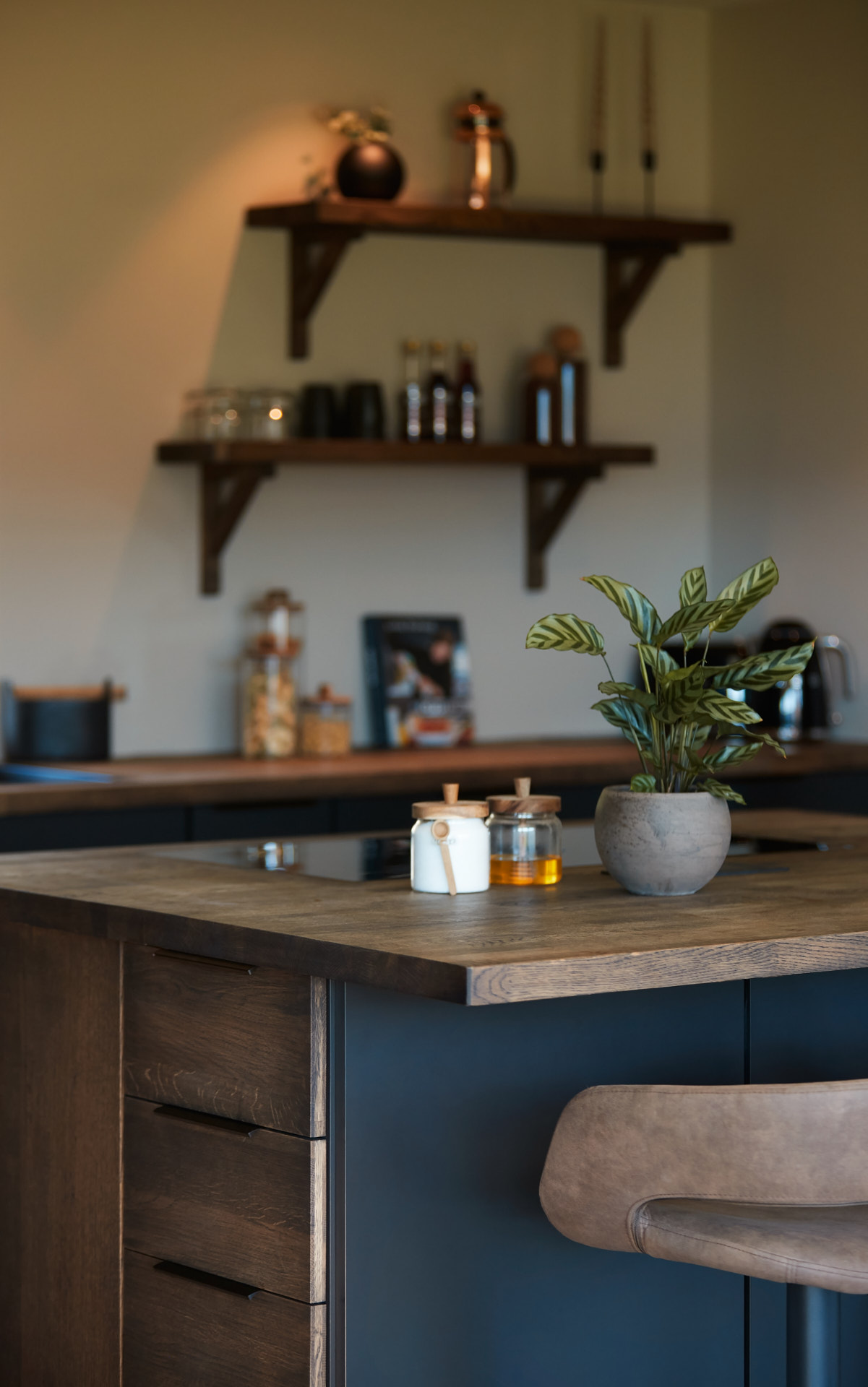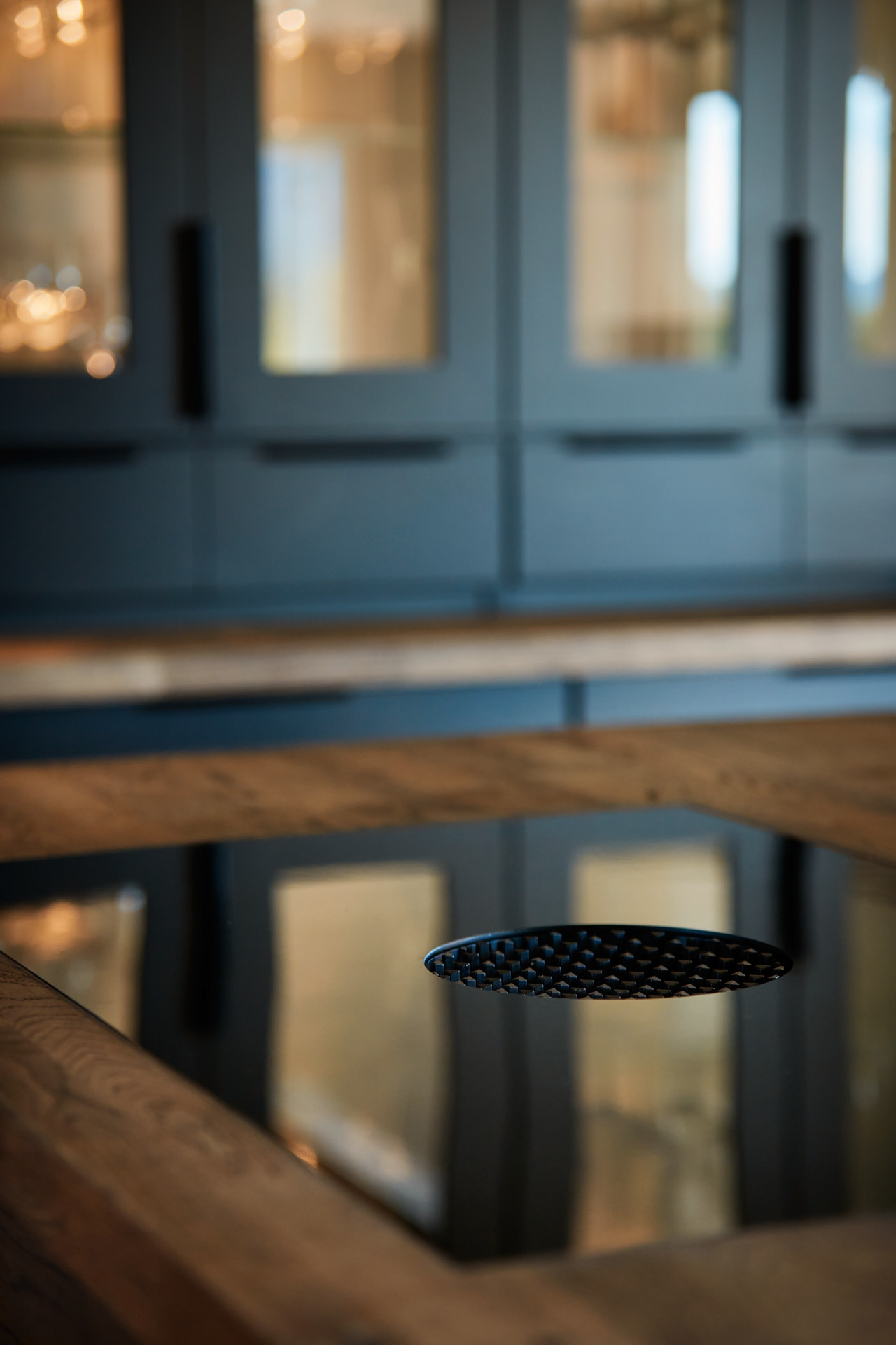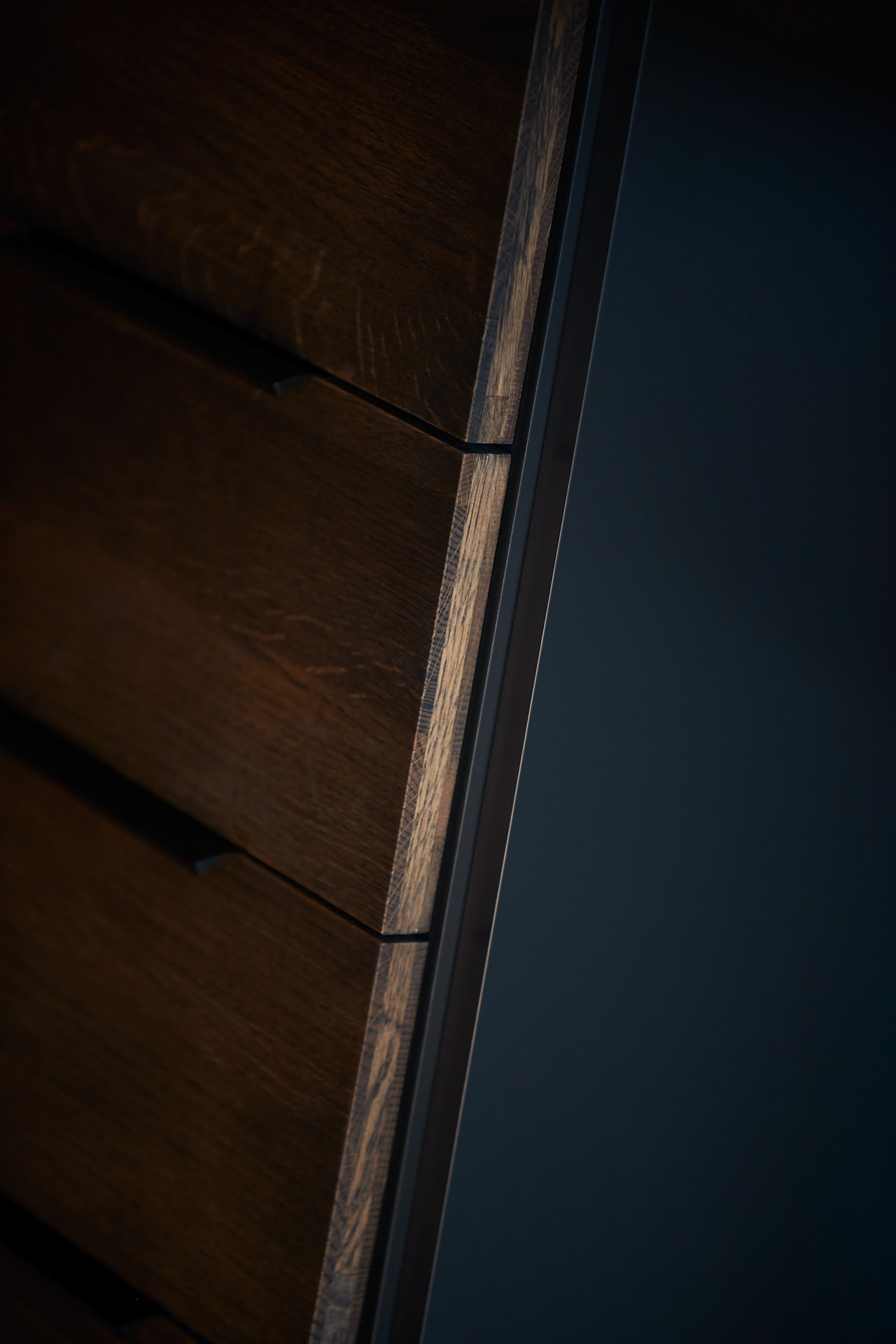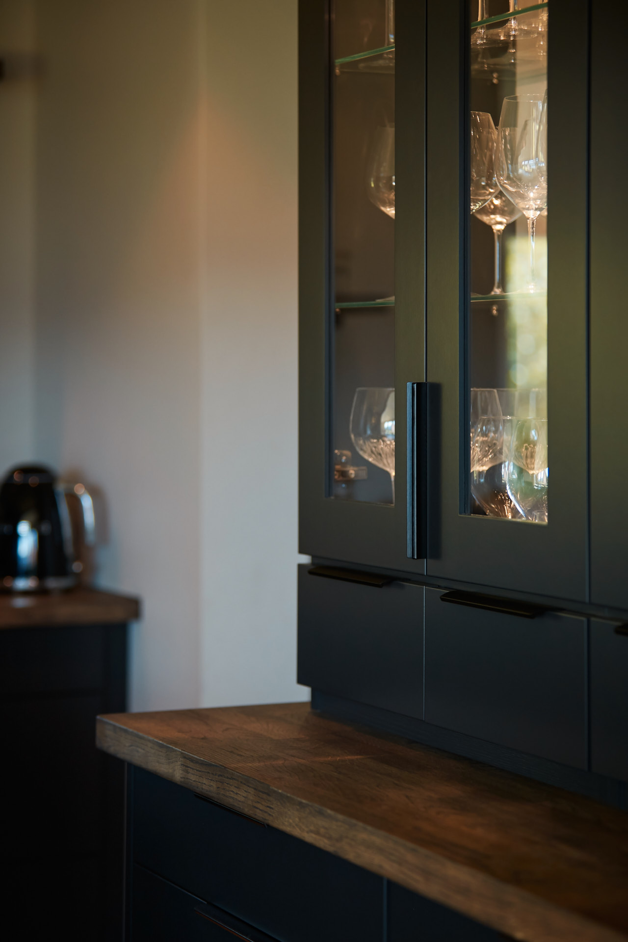 En hel vegg med høyskap frigjør en hel masse plass til benk og arbeidsområde. Dette kjøkkenet har en langstrakt kjøkkenbenk og en romslig kjøkkenøy med sitteplasser. Hvitevarene er elegante og integrert i interiøret, og fremhever kjøkkenets linjer og design. Alle skrog er laget av kvistfri furu, malt i fargen Dempet Sort. Benkeplater, samt skuffefronter og dører på kjøkkenøy er av eik og er behandlet med sort Osmo dekorvoks.