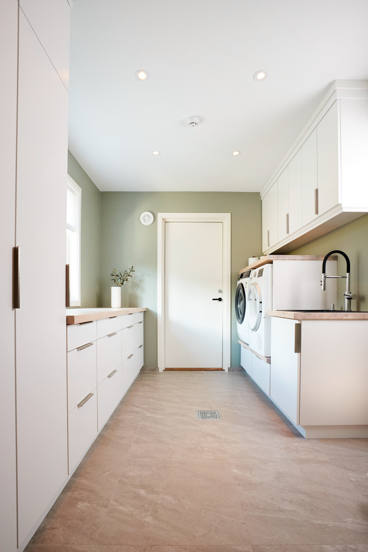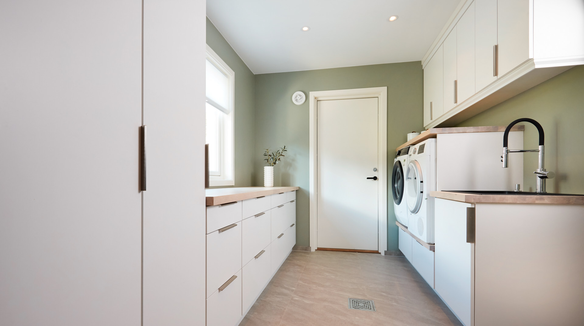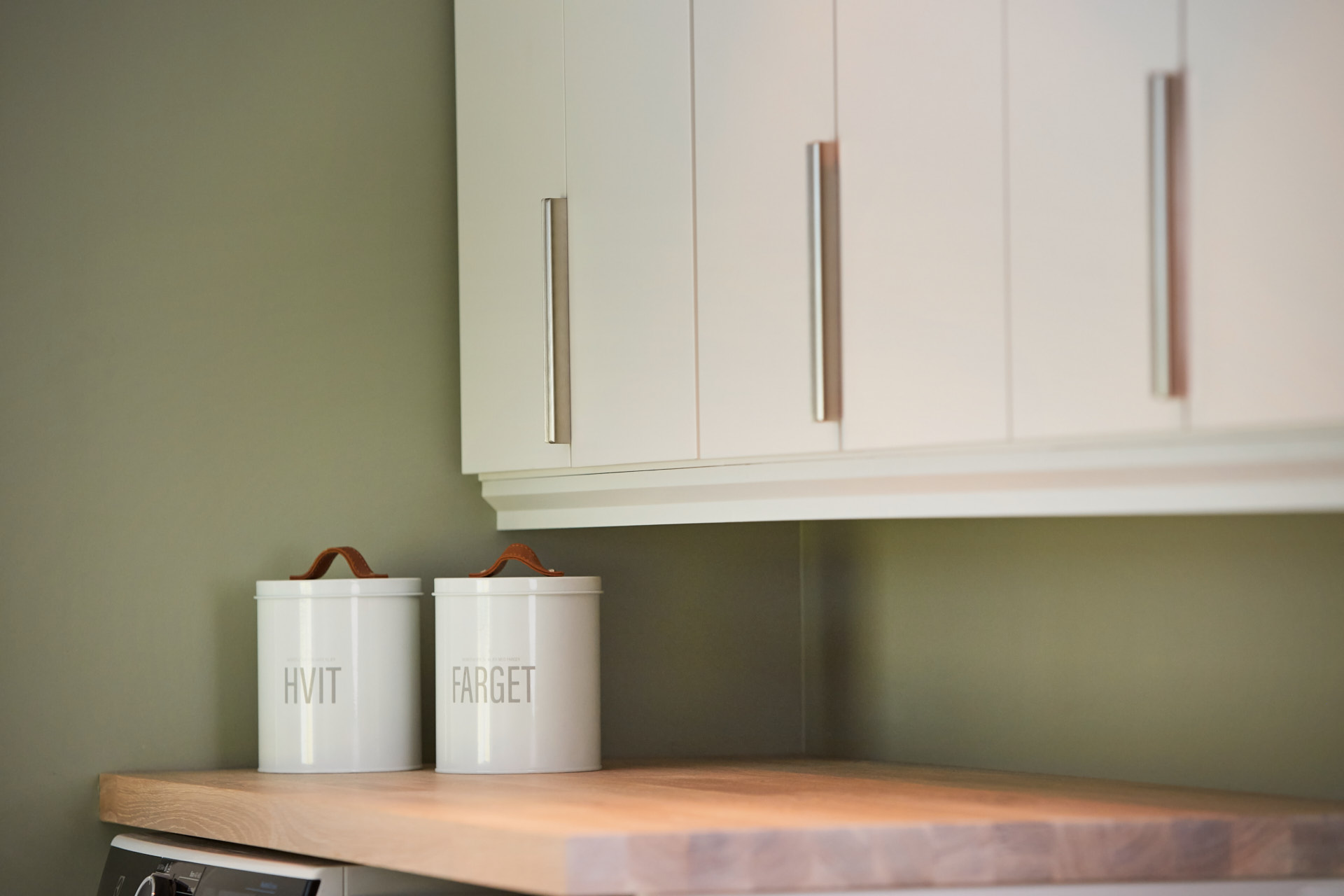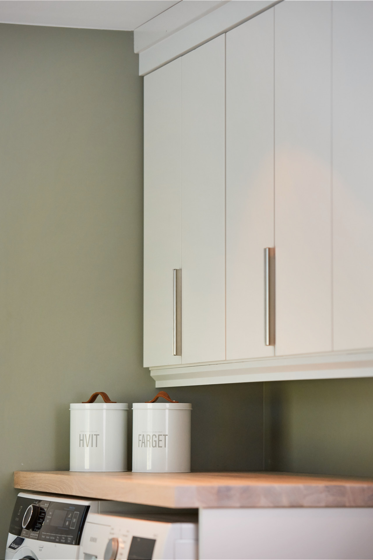 Lyst vaskerom med skrog av kvistfri furu, med fronter og dører av valchromat. Alt malt i fargen Klassisk Hvit. Benkeplaten er av eik. Rikelig med oppbevaring og praktiske løsninger. Man skal ha det godt på vaskerommet også.