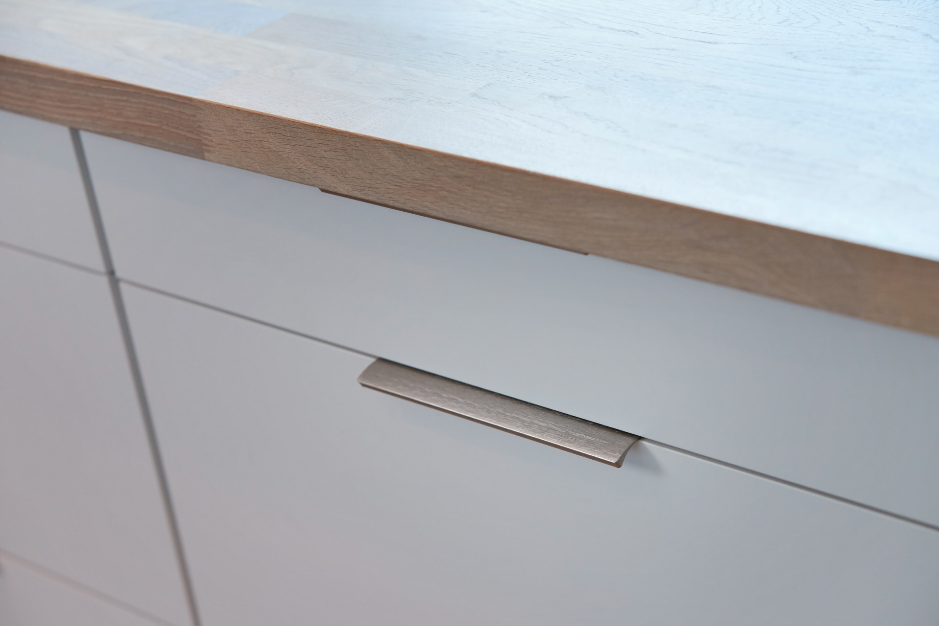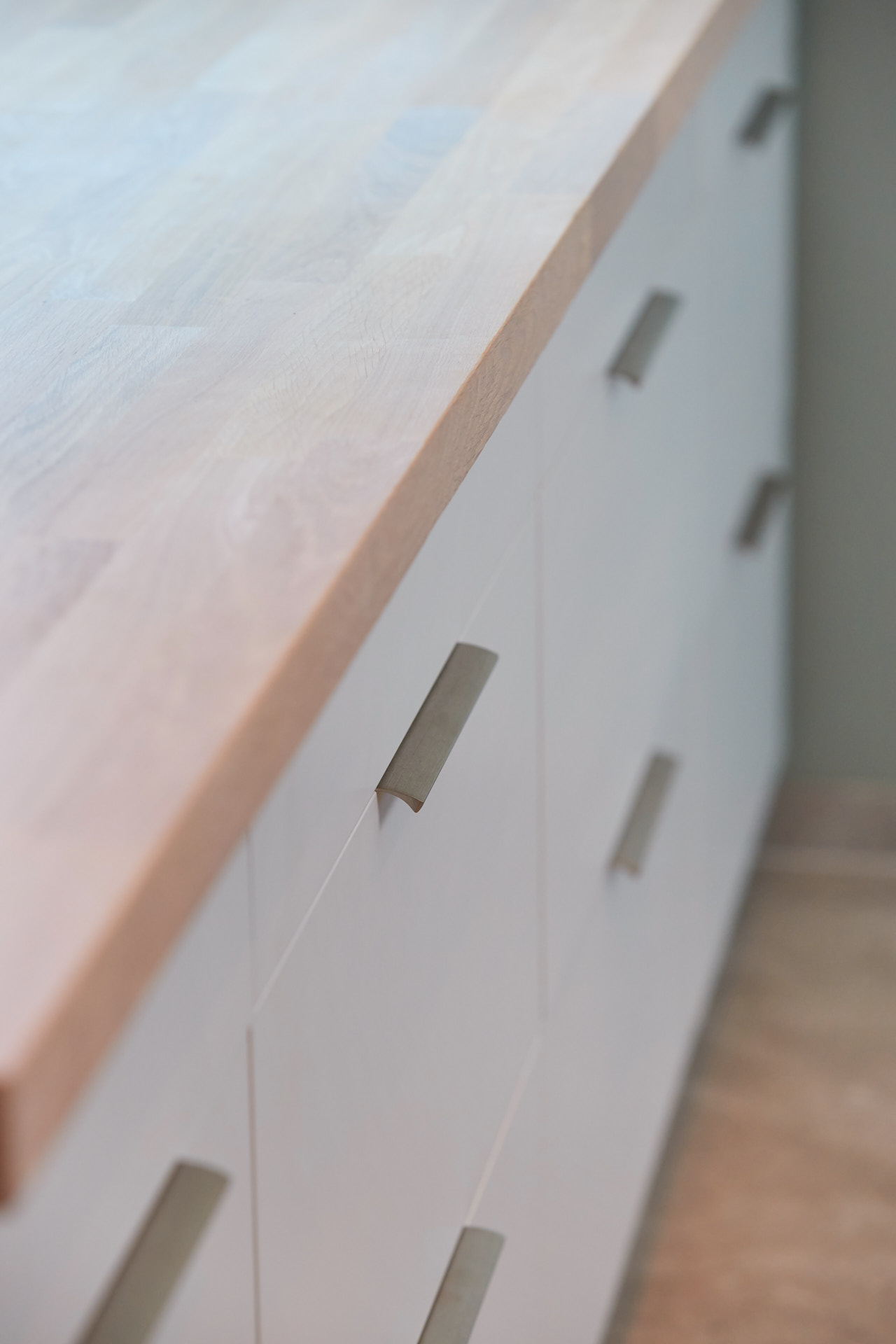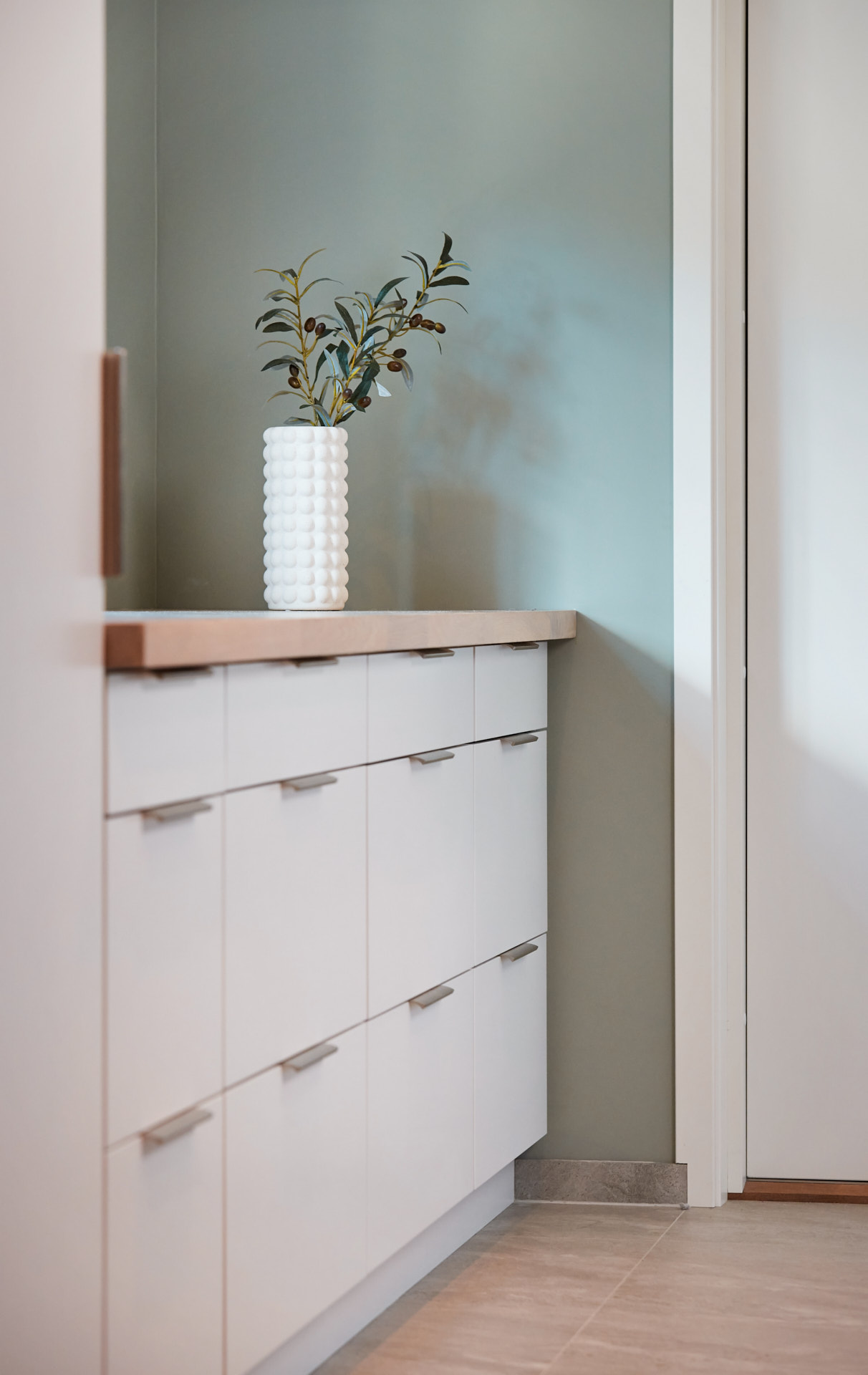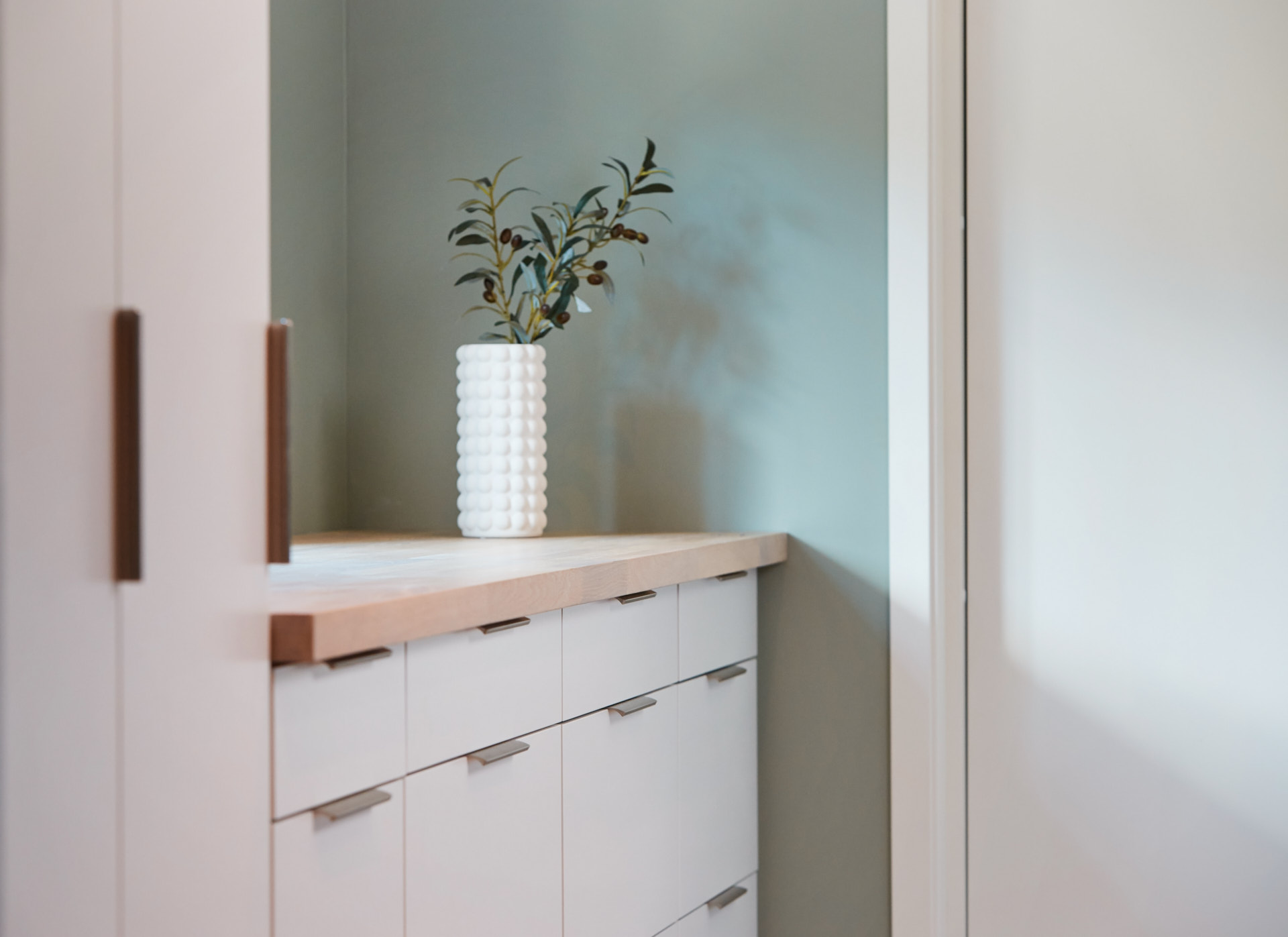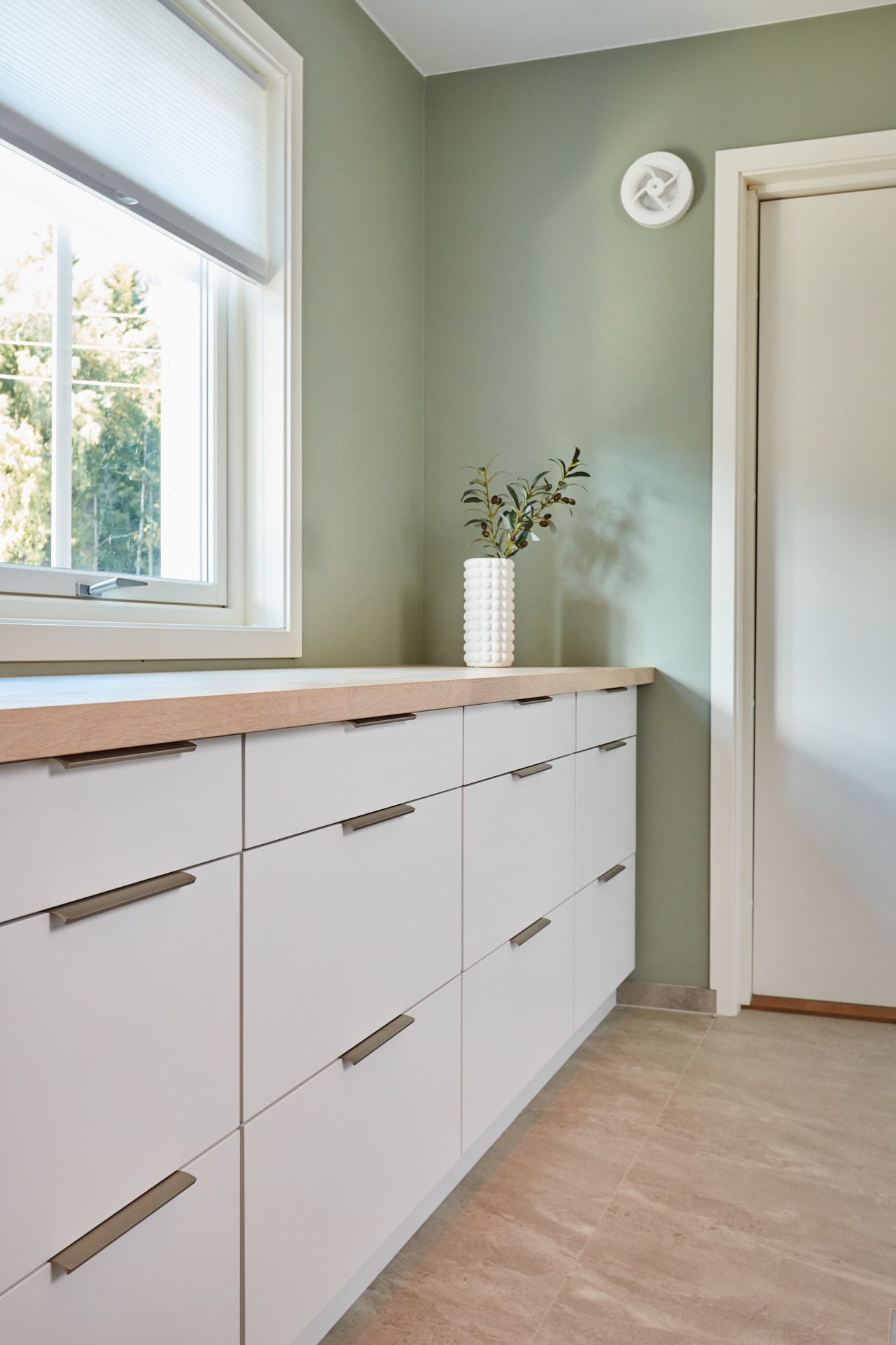Lyst vaskerom med skrog av kvistfri furu, med fronter og dører av valchromat. Alt malt i fargen Klassisk Hvit. Benkeplaten er av eik. Rikelig med oppbevaring og praktiske løsninger. Man skal ha det godt på vaskerommet også.