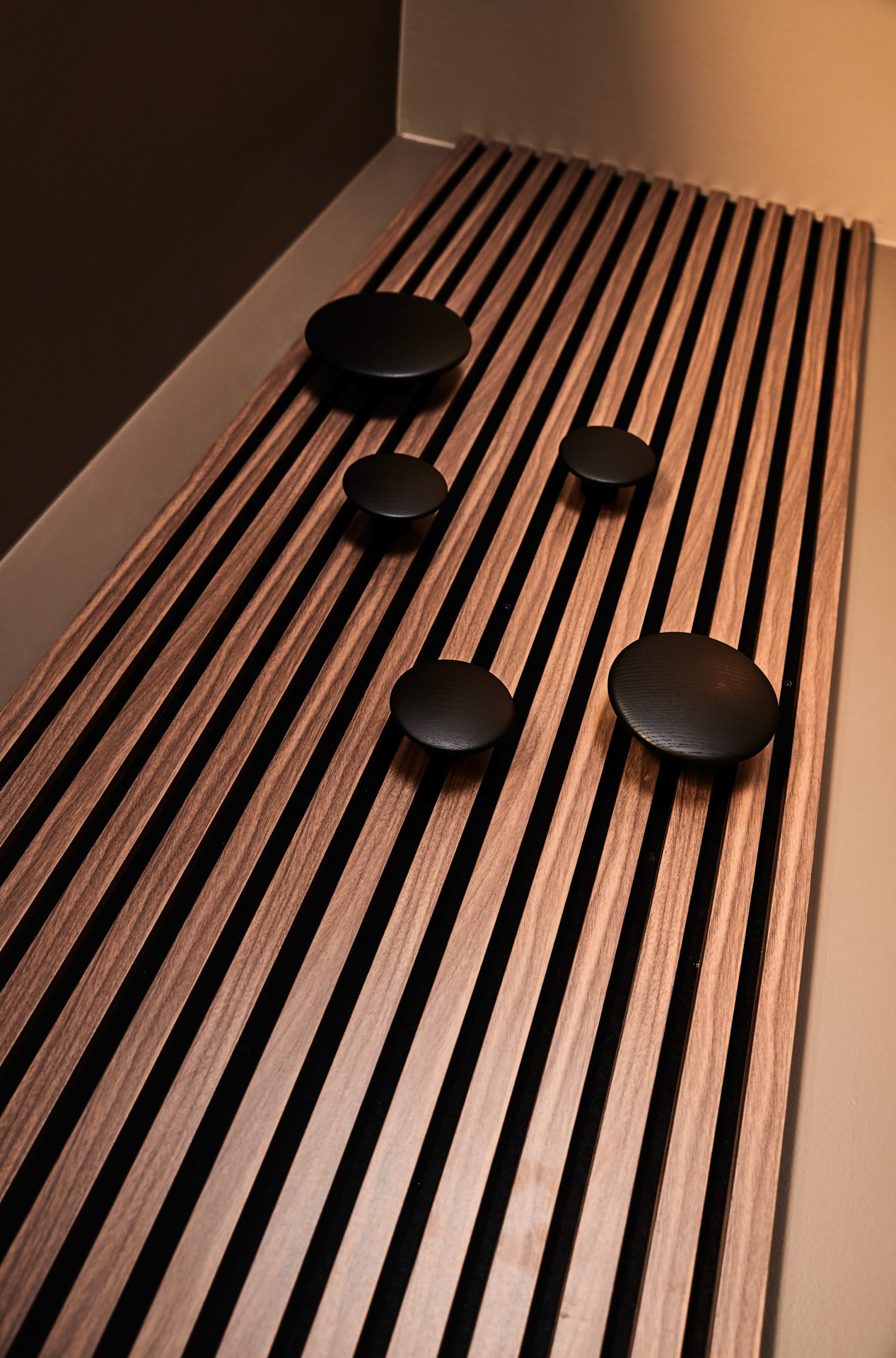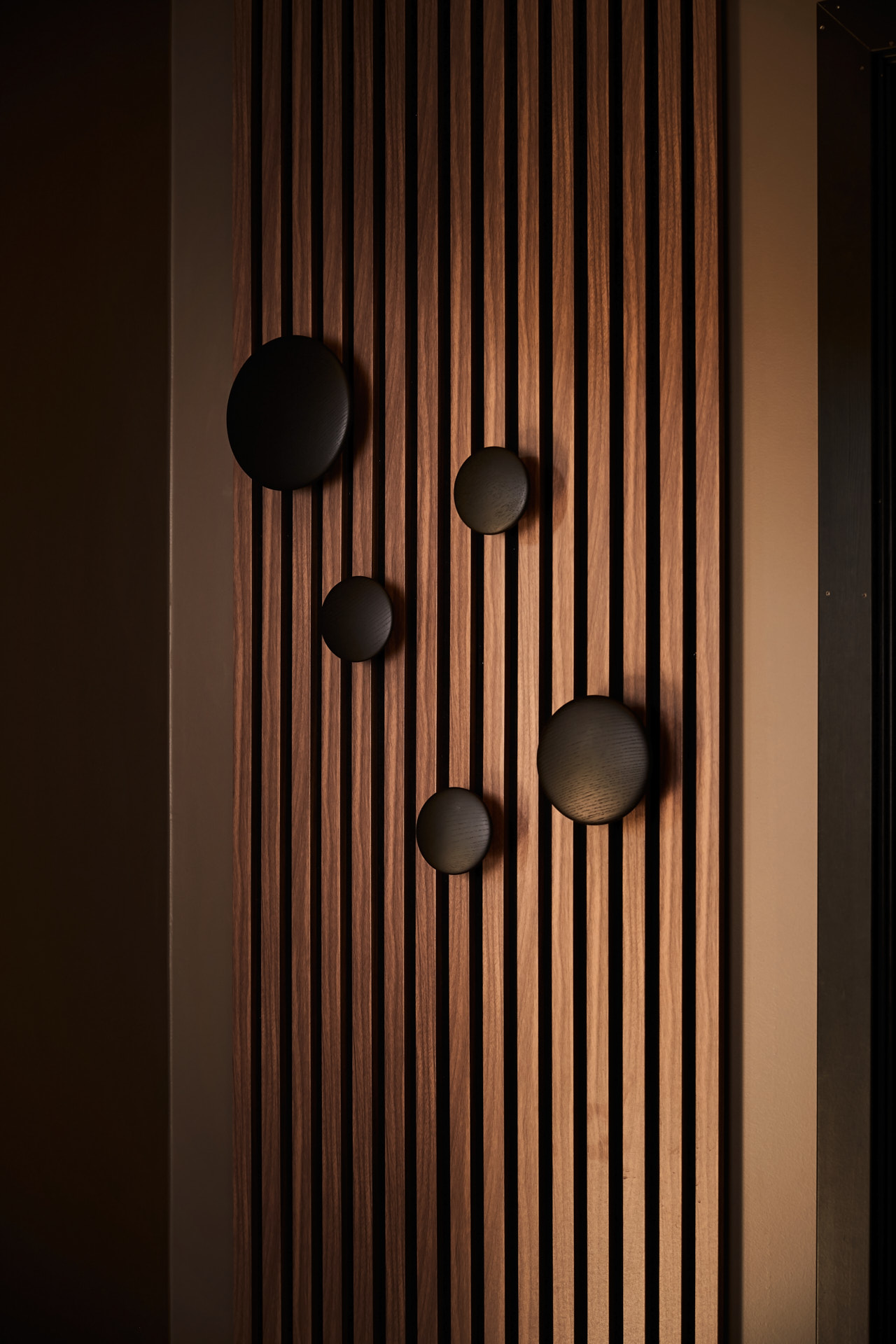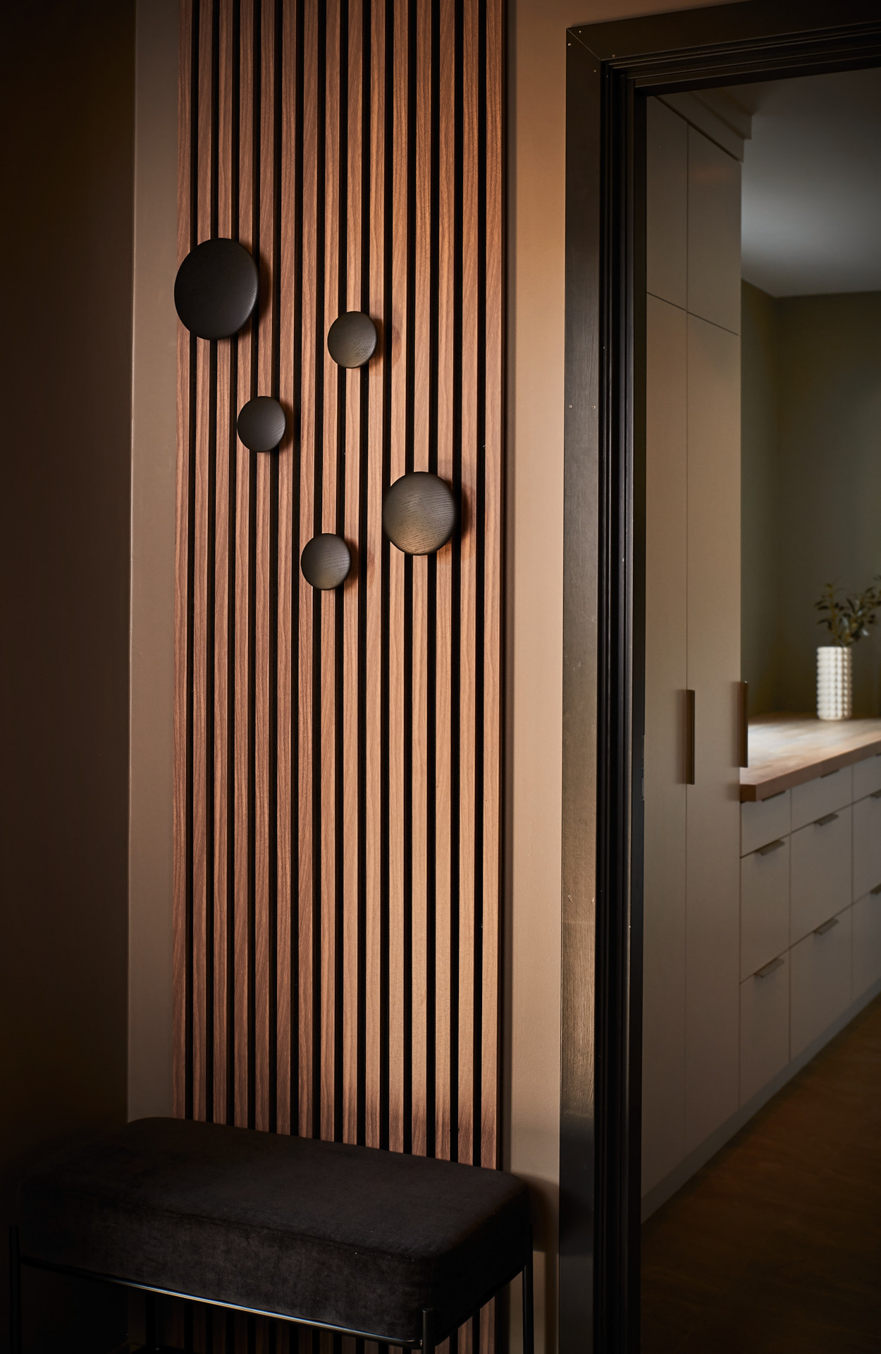 I entreen har vi også bygget en spilevegg, tilsvarende den som er i stua. Her har kunden selv montert dekorative knagger.