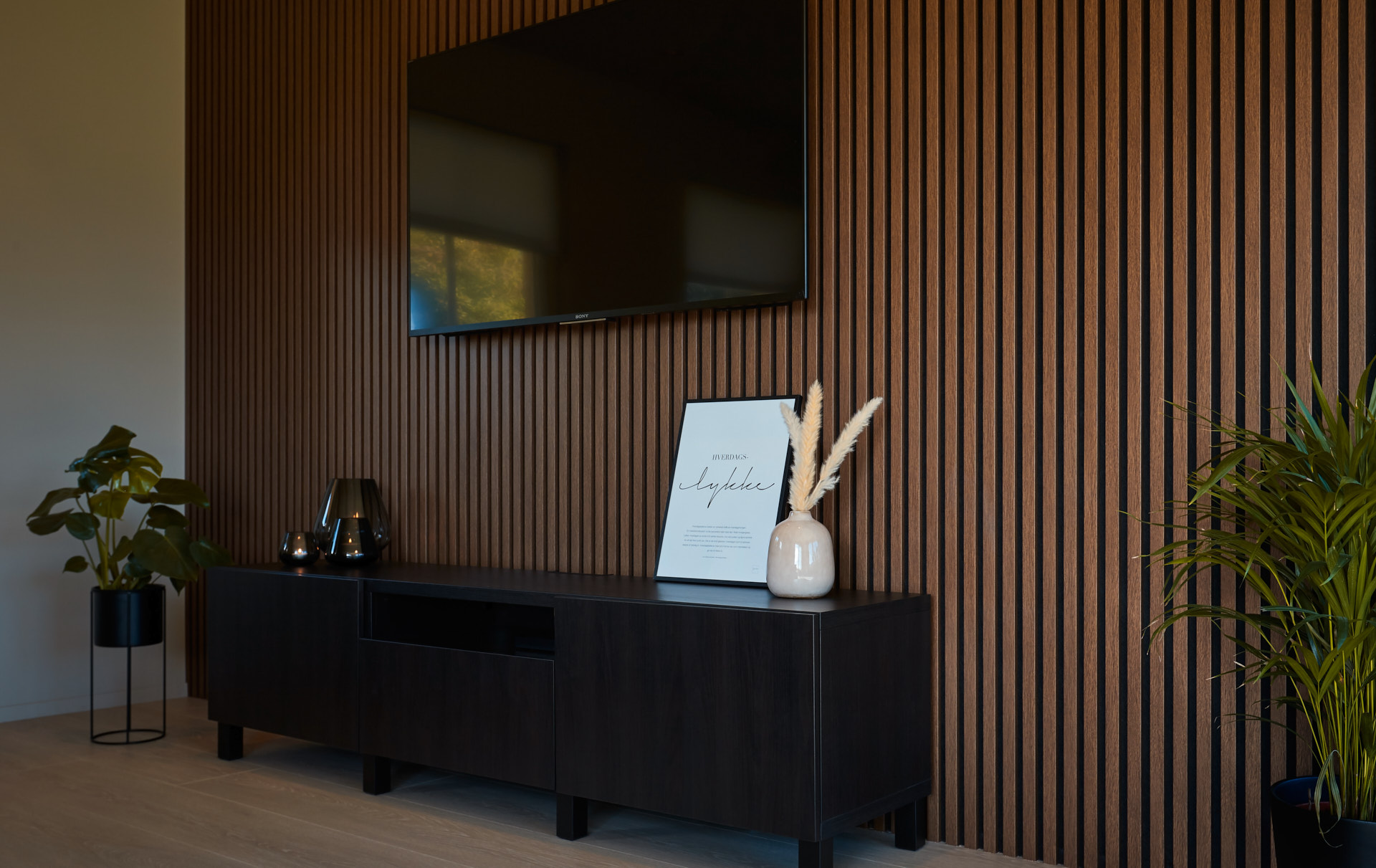 I stua har vi bygget en spilevegg. Denne harmonerer med fargene på kjøkkenet, da man delvis ser kjøkkenet fra stua.