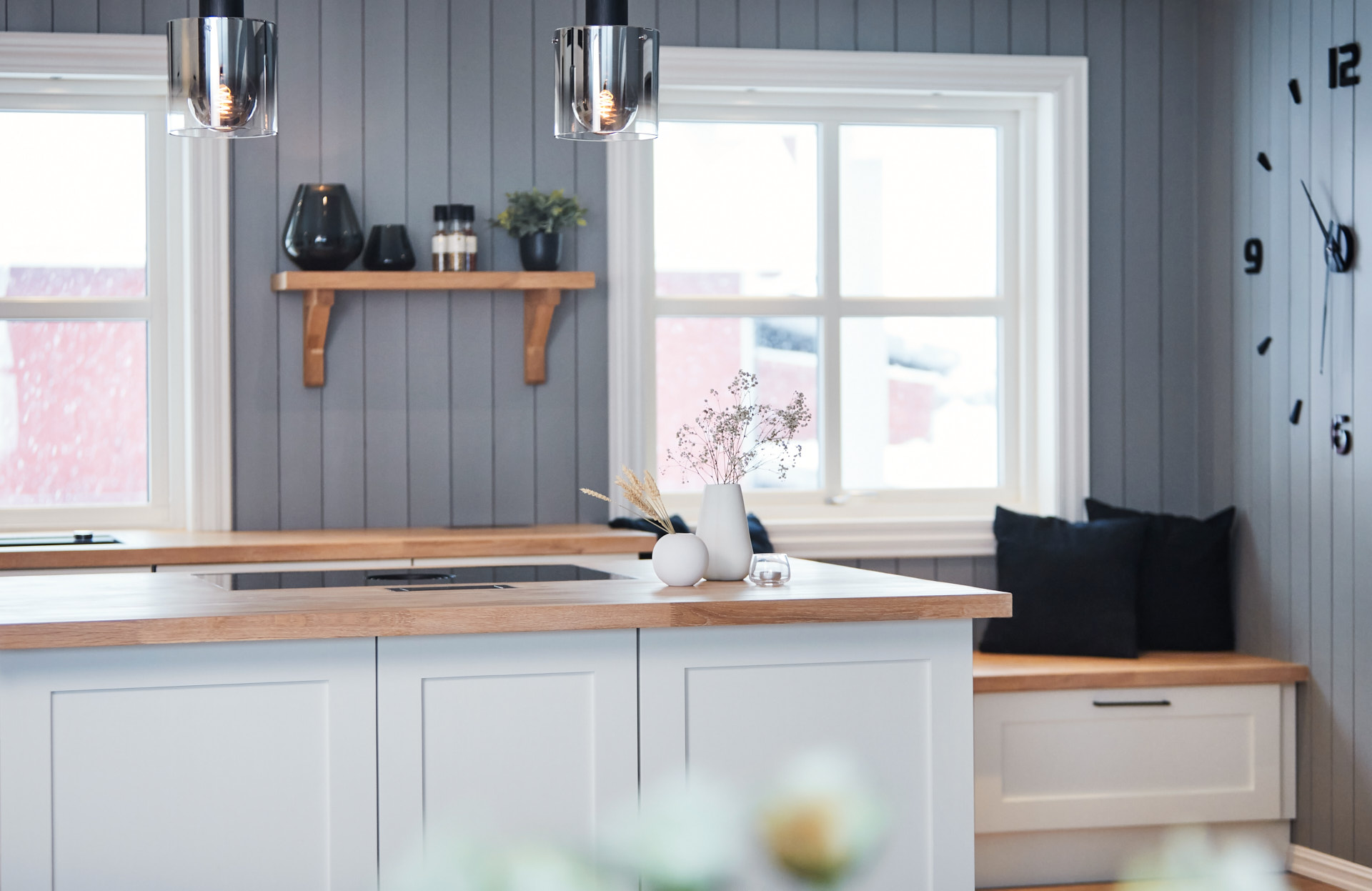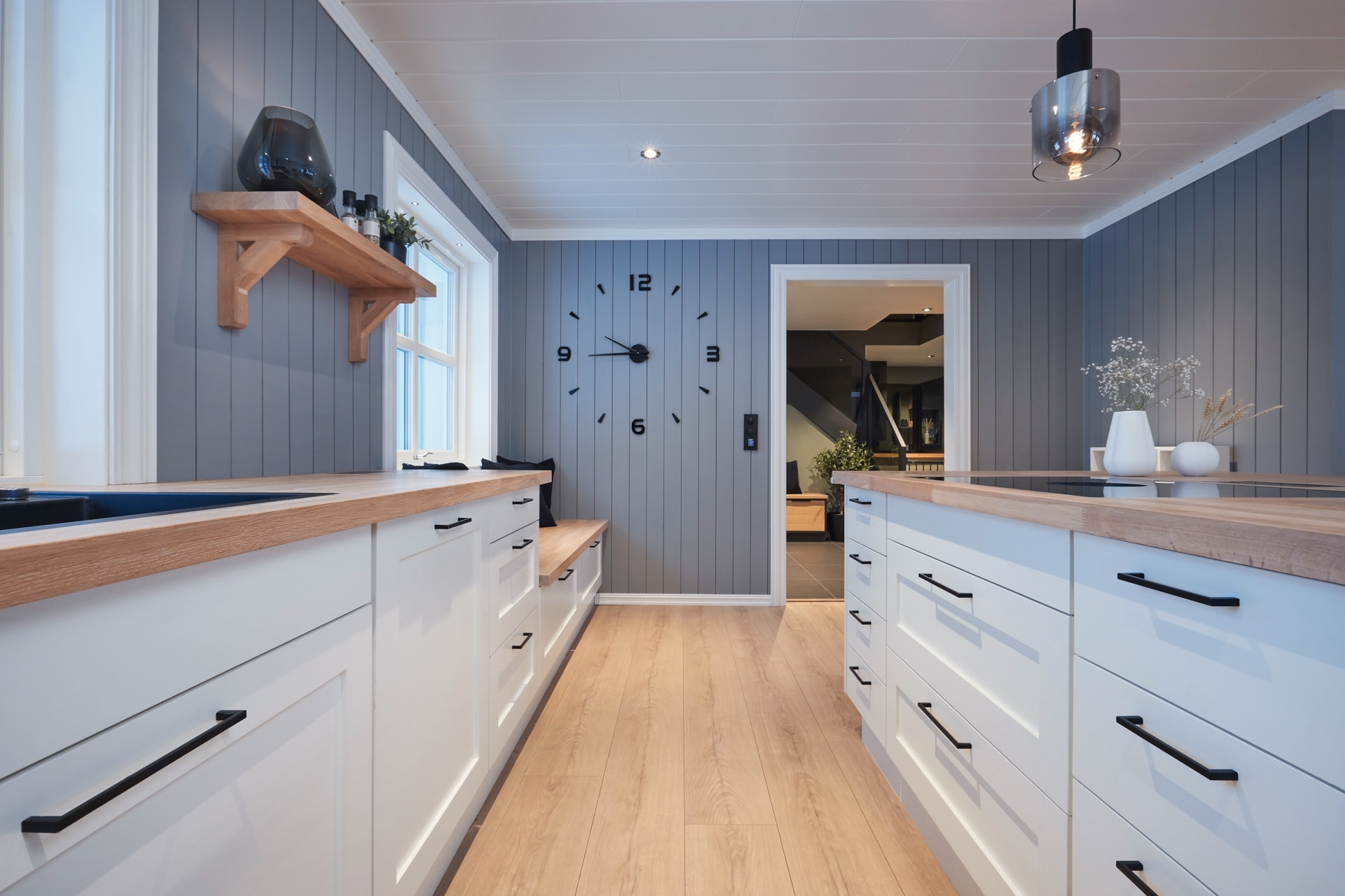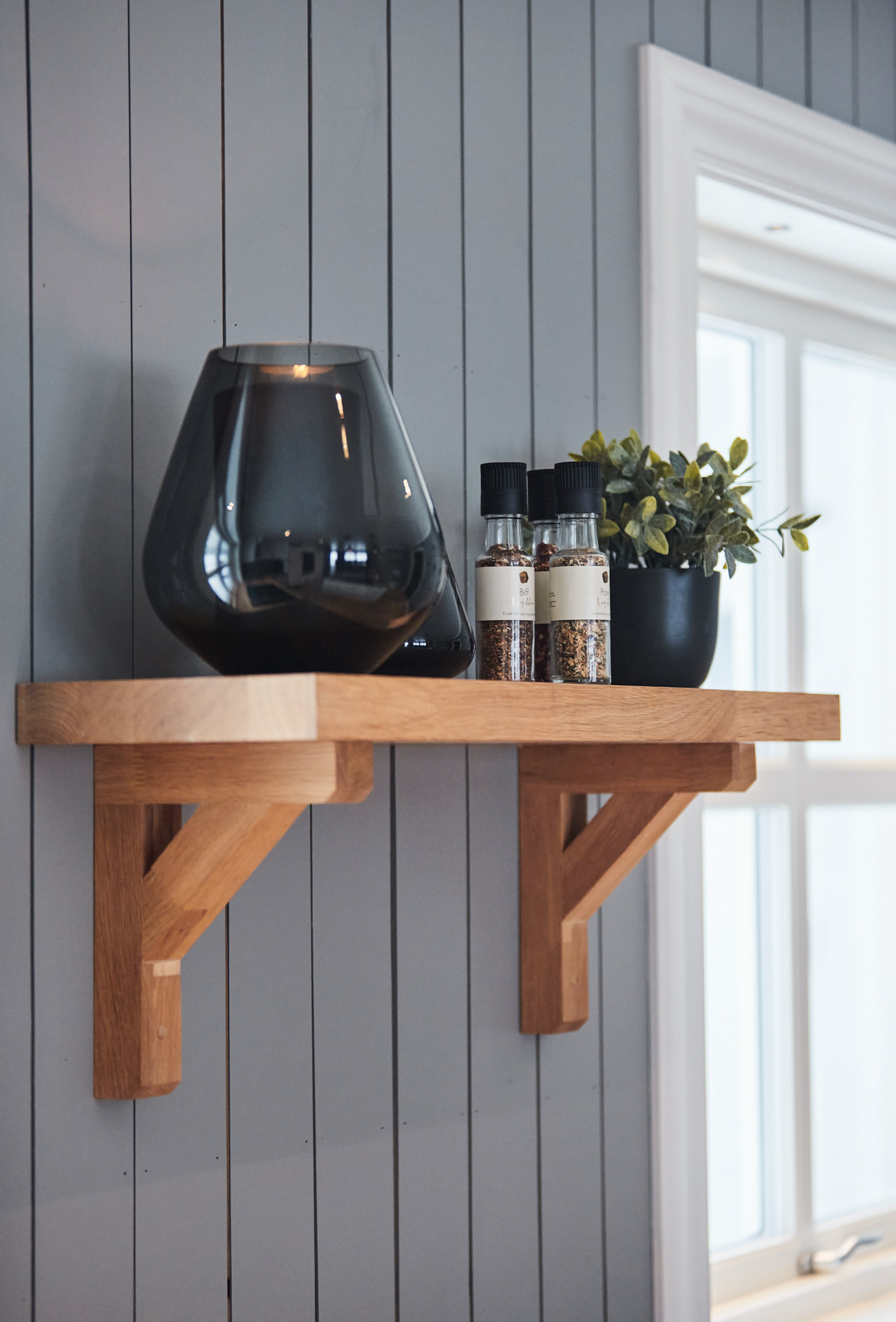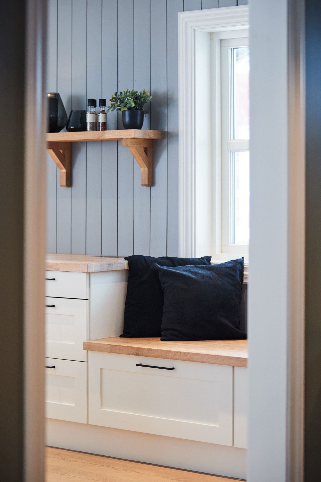 Hylla på veggen er laget av samme materiale og finish som benkene.