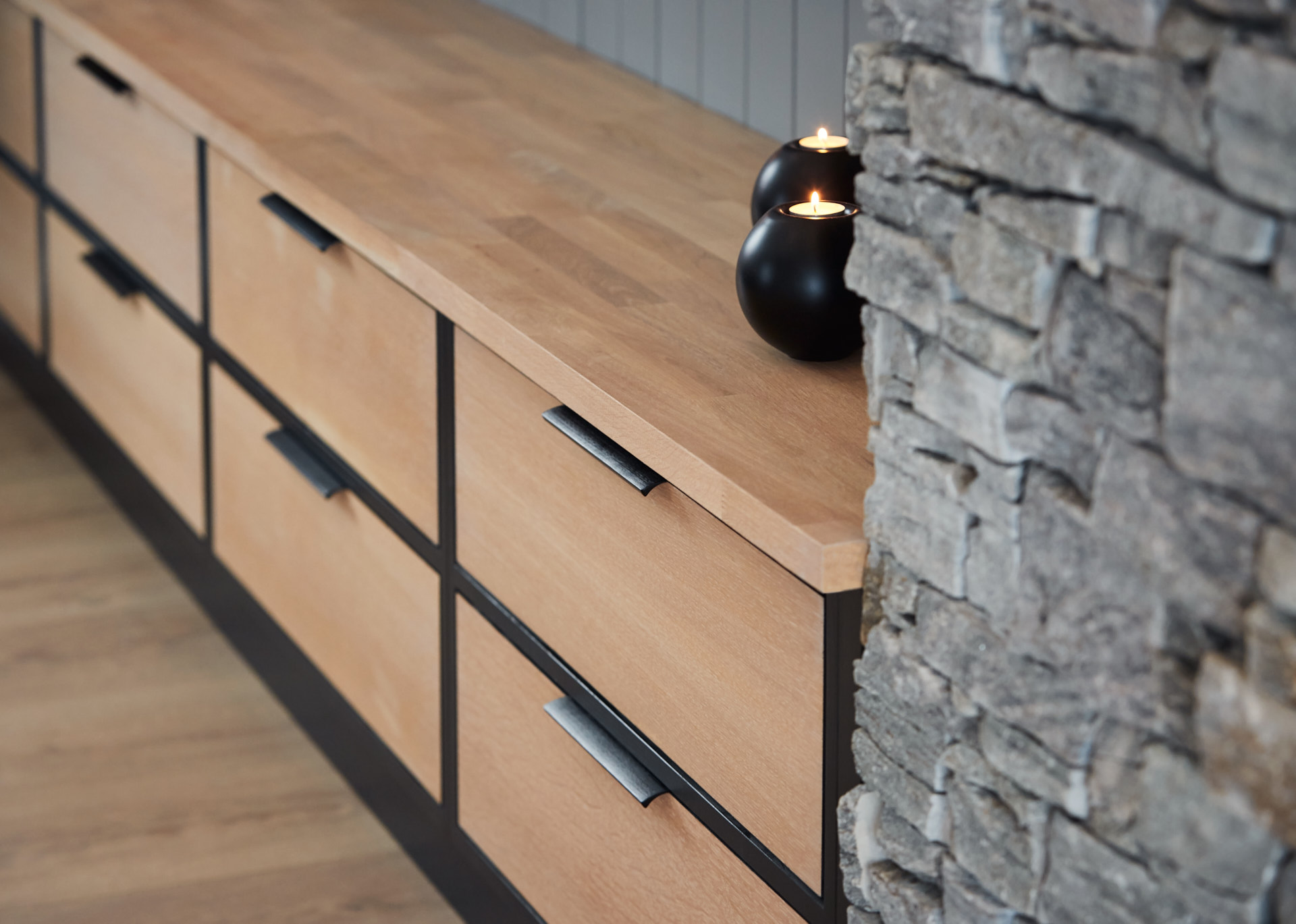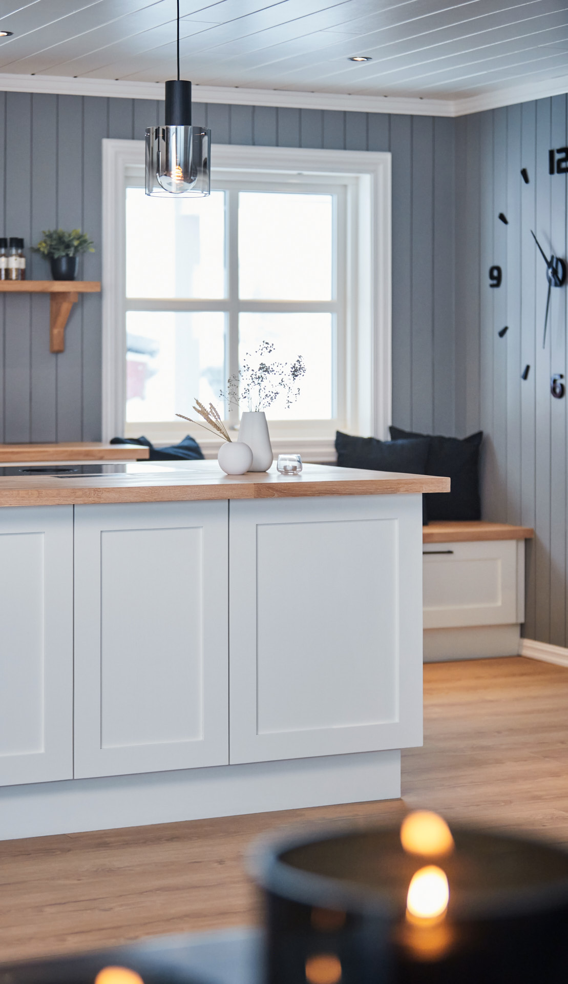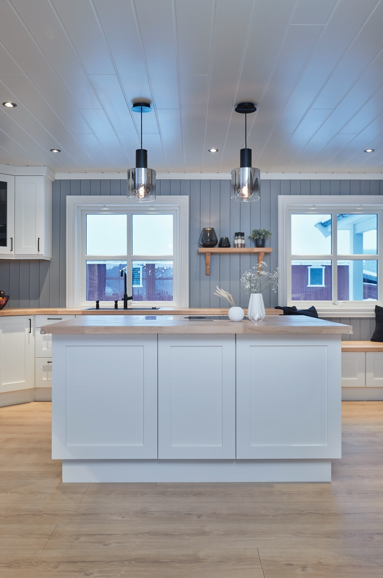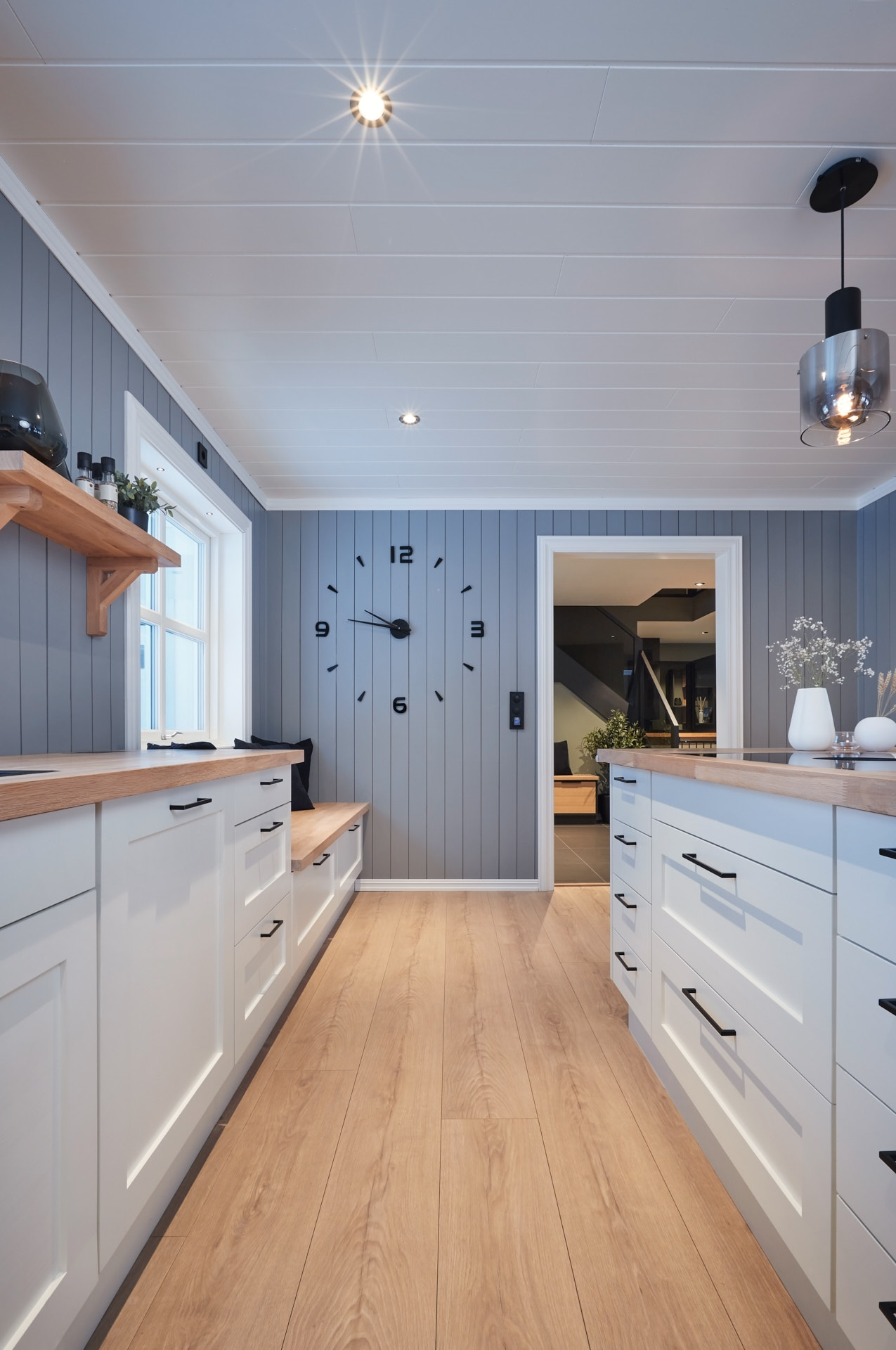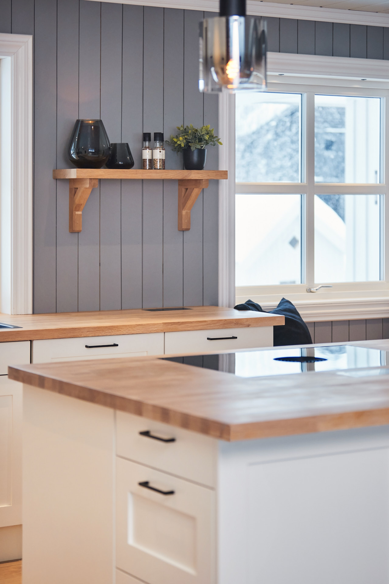 Hylla på veggen er laget av samme materiale og finish som benkene.