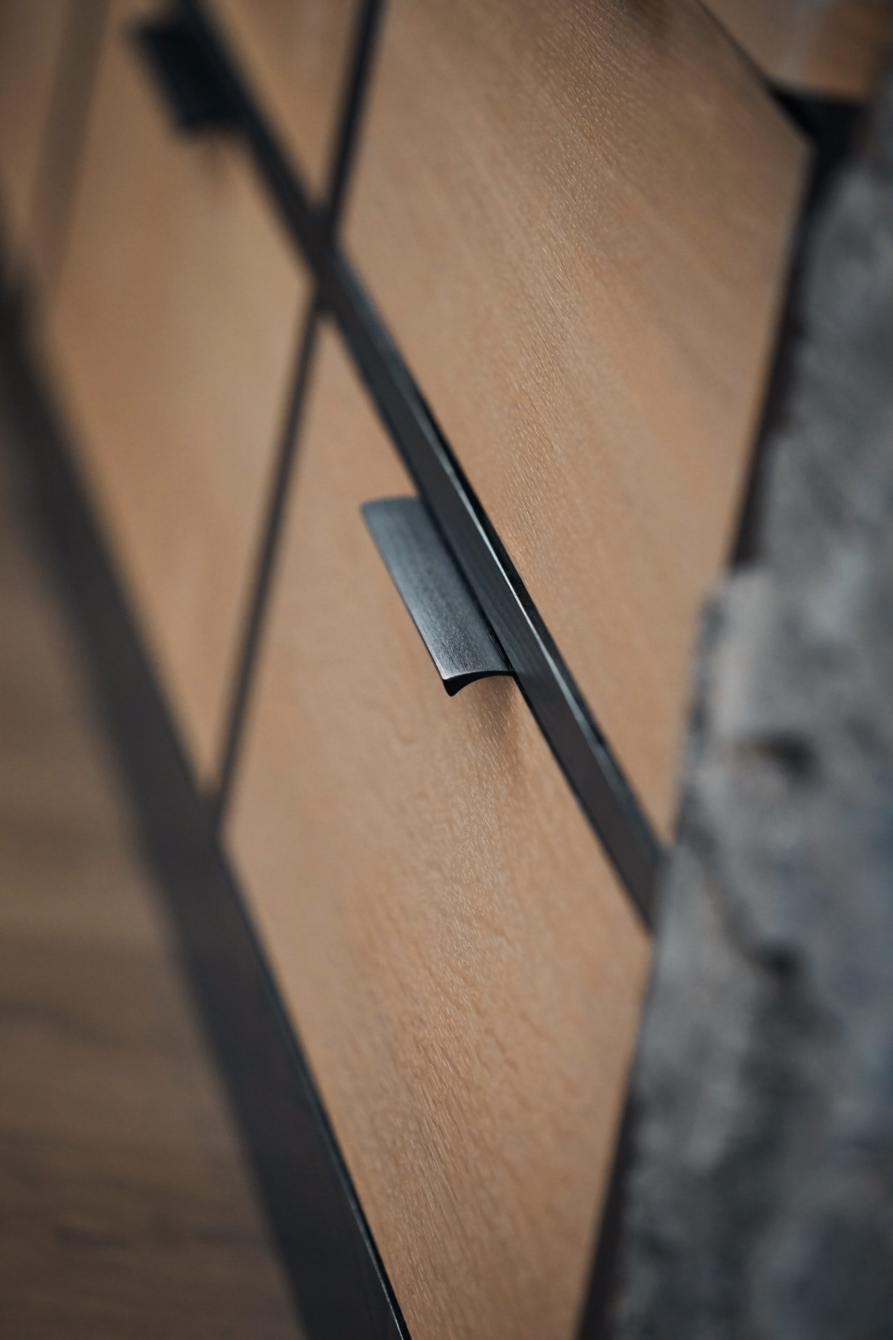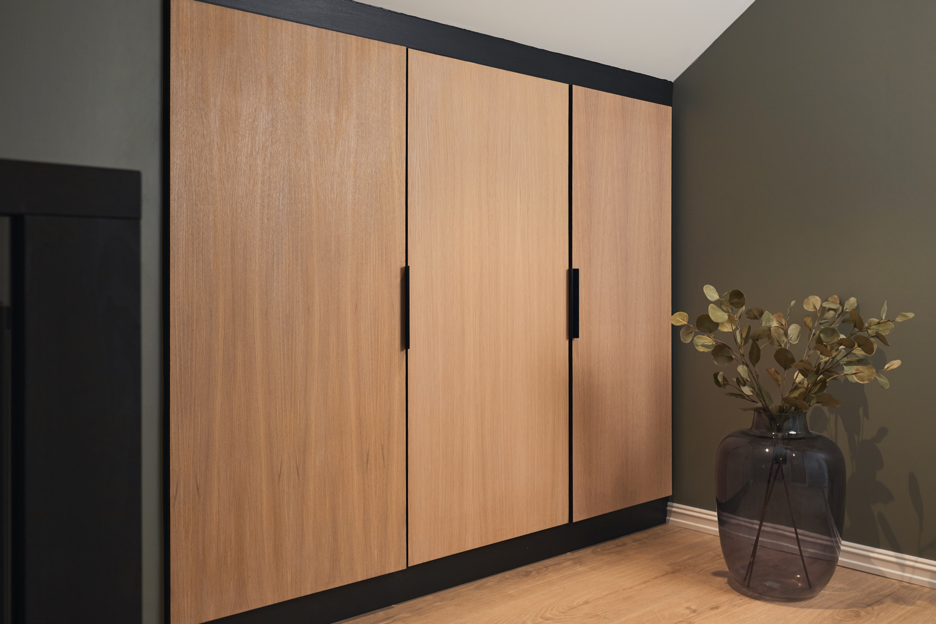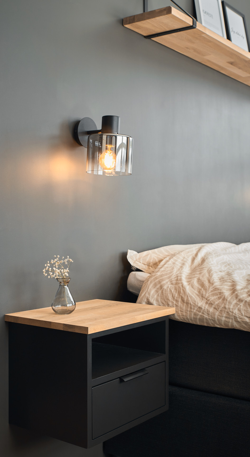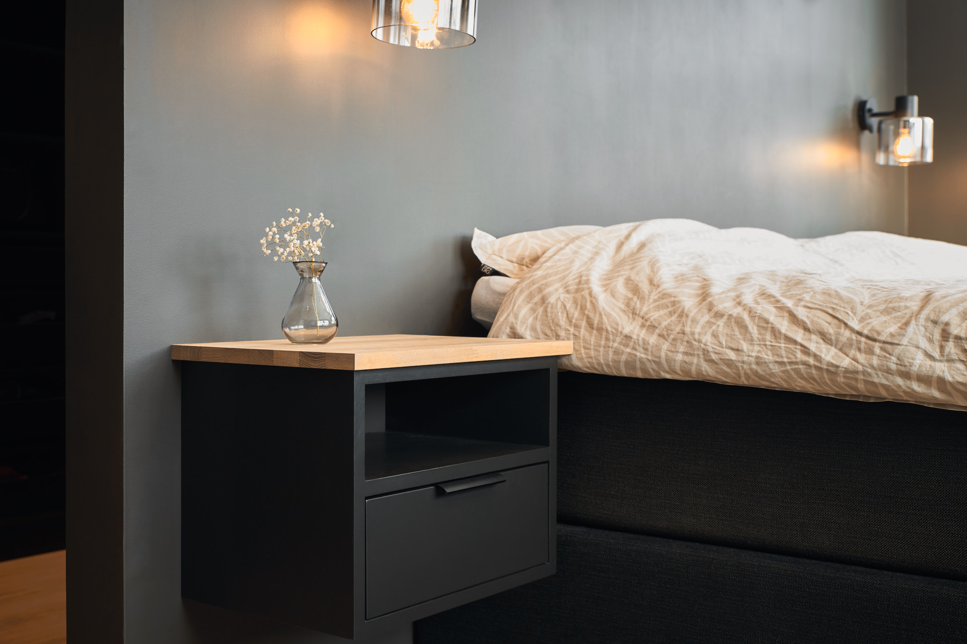 På soverommet finnes to veggmonterte nattbord og en matchende vegghylle. Nattbordene har skrog av furu og fronter av valchromat malt i fargen Dempet sort. Nattbordsplaten er av 2 cm eik.