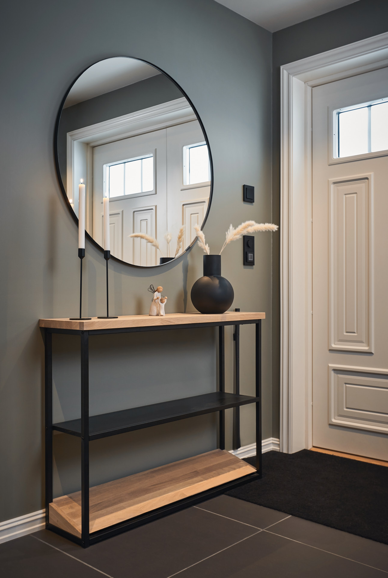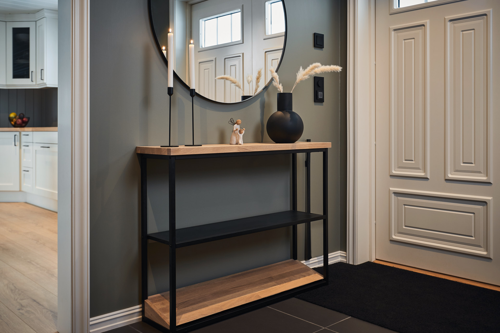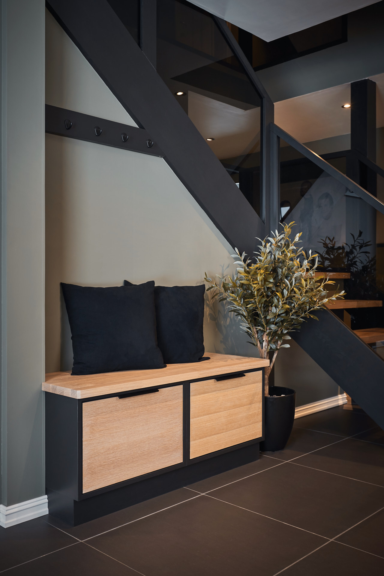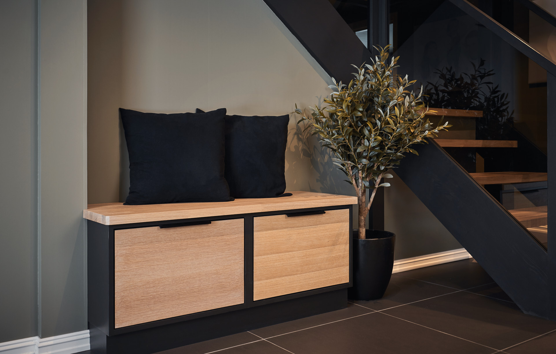I entréen finnes skohylle, sittebenk med to skuffer, og høyskap med to store skuffer i bunnen. De to sistnevnte har skrog av malt furu i fargen Dempet sort og fronter av laminert eik, behandlet med Osmo hvit.
