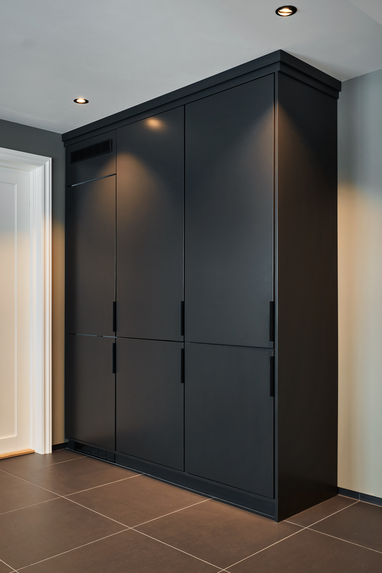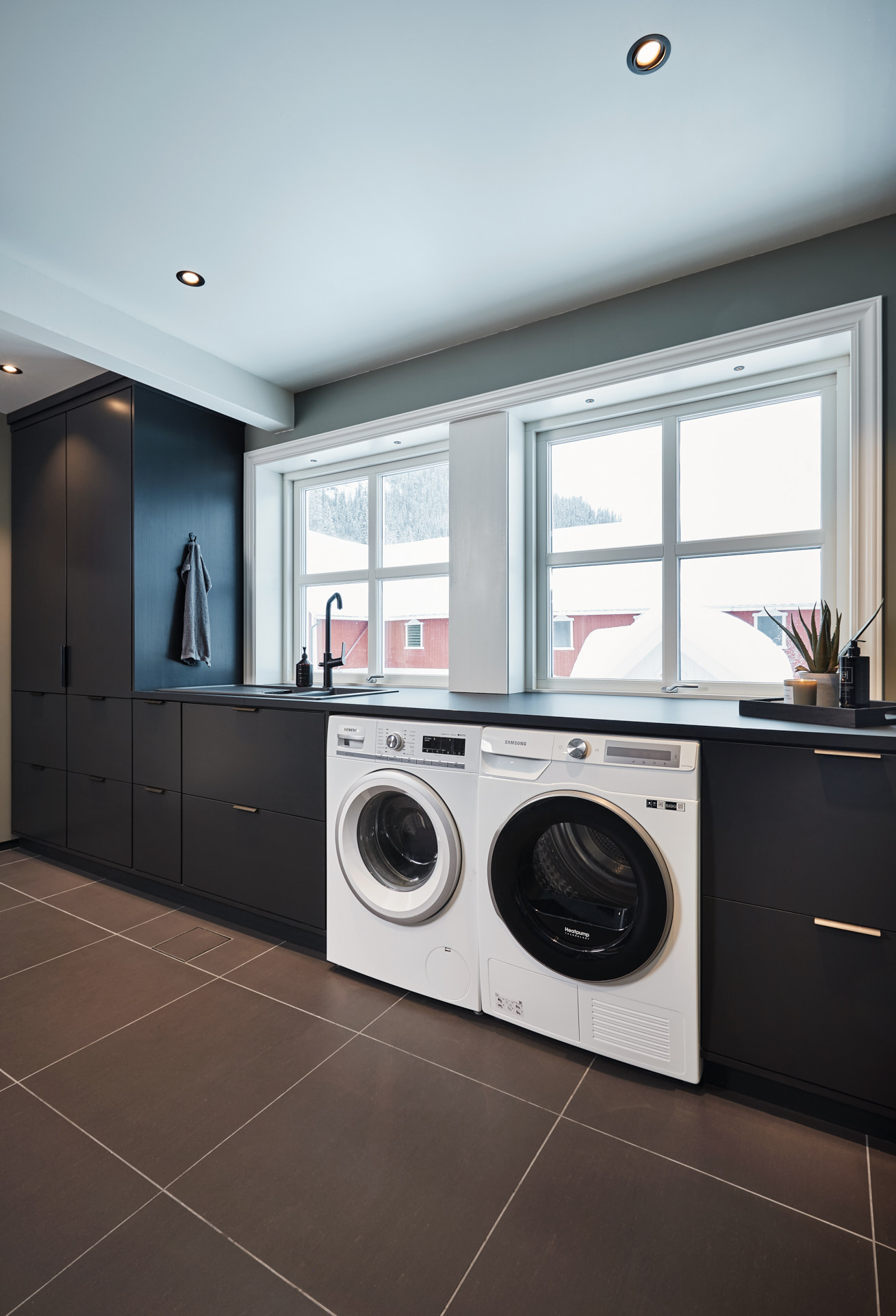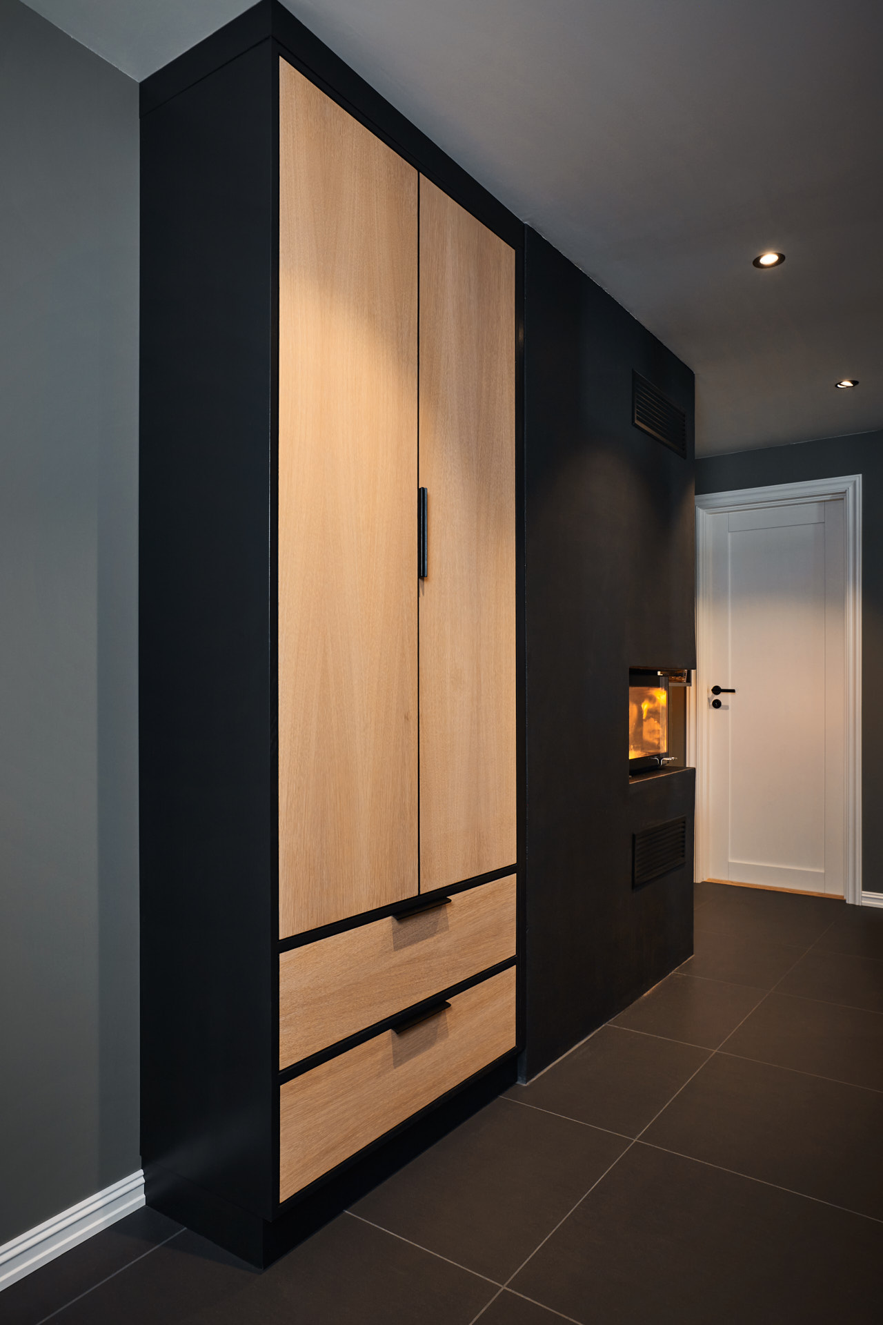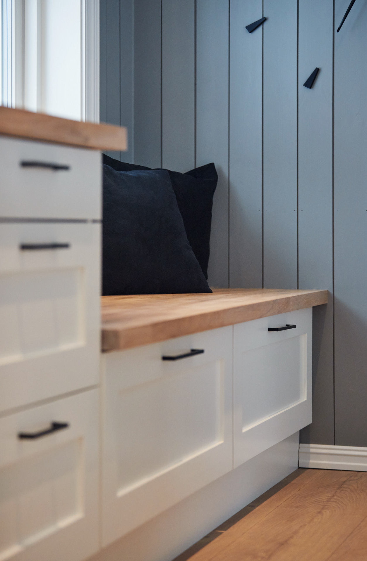 Vaskeromsinnredningen har godt med oppbevaringsplass og en praktisk hylle med knagger og sortering av yttertøy for hele familien som bor her. Innredningen er laget av furu og valchromat, malt i fargen Dempet sort.