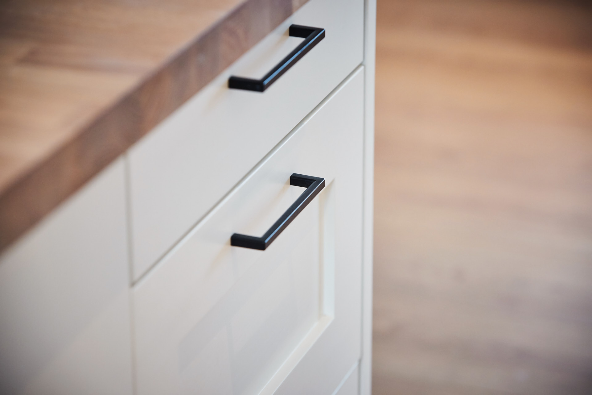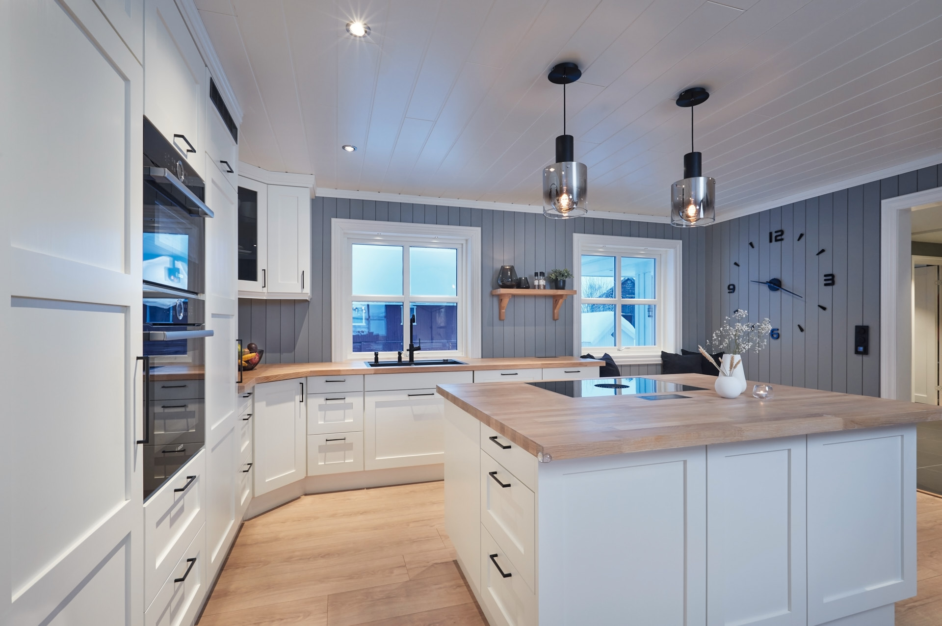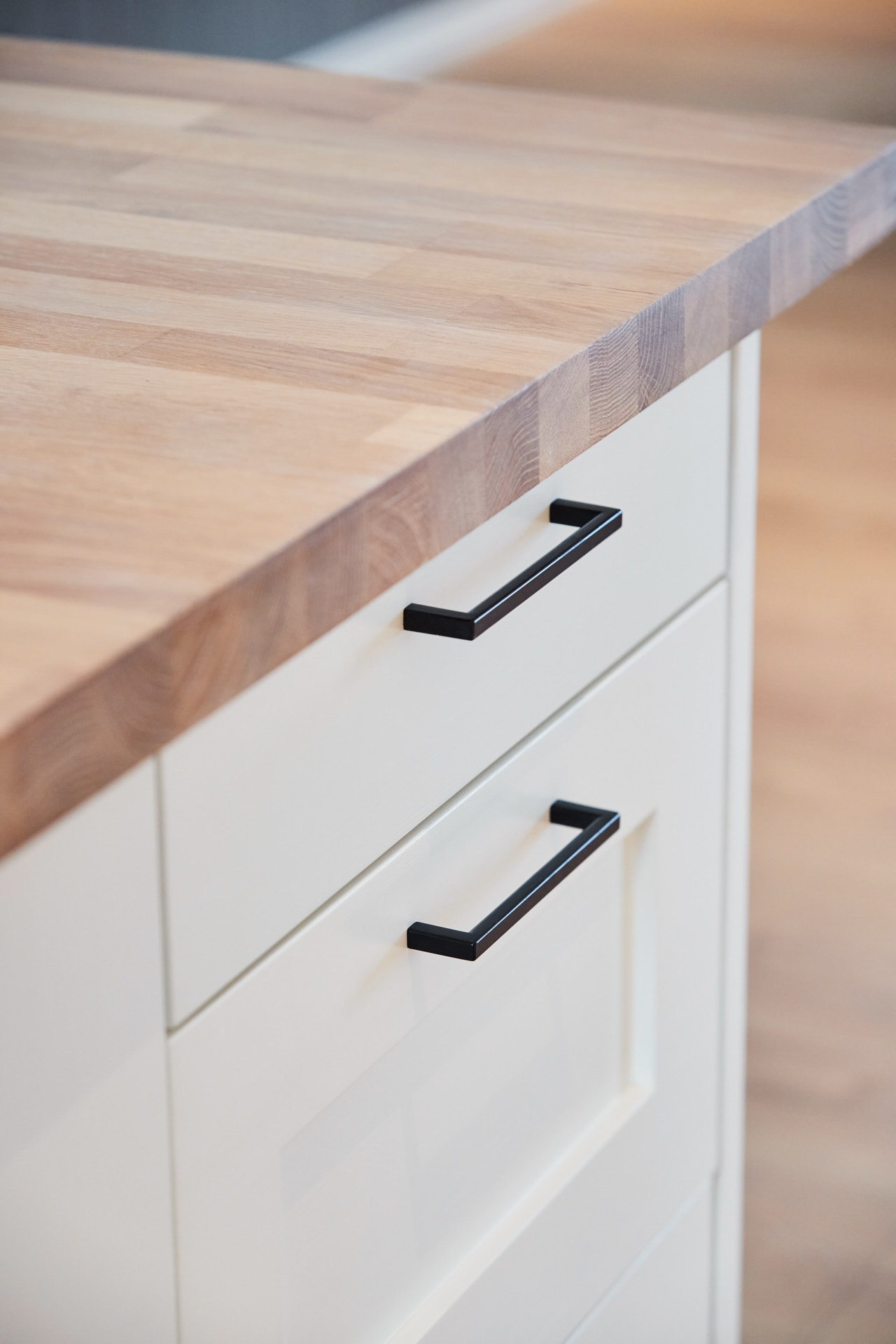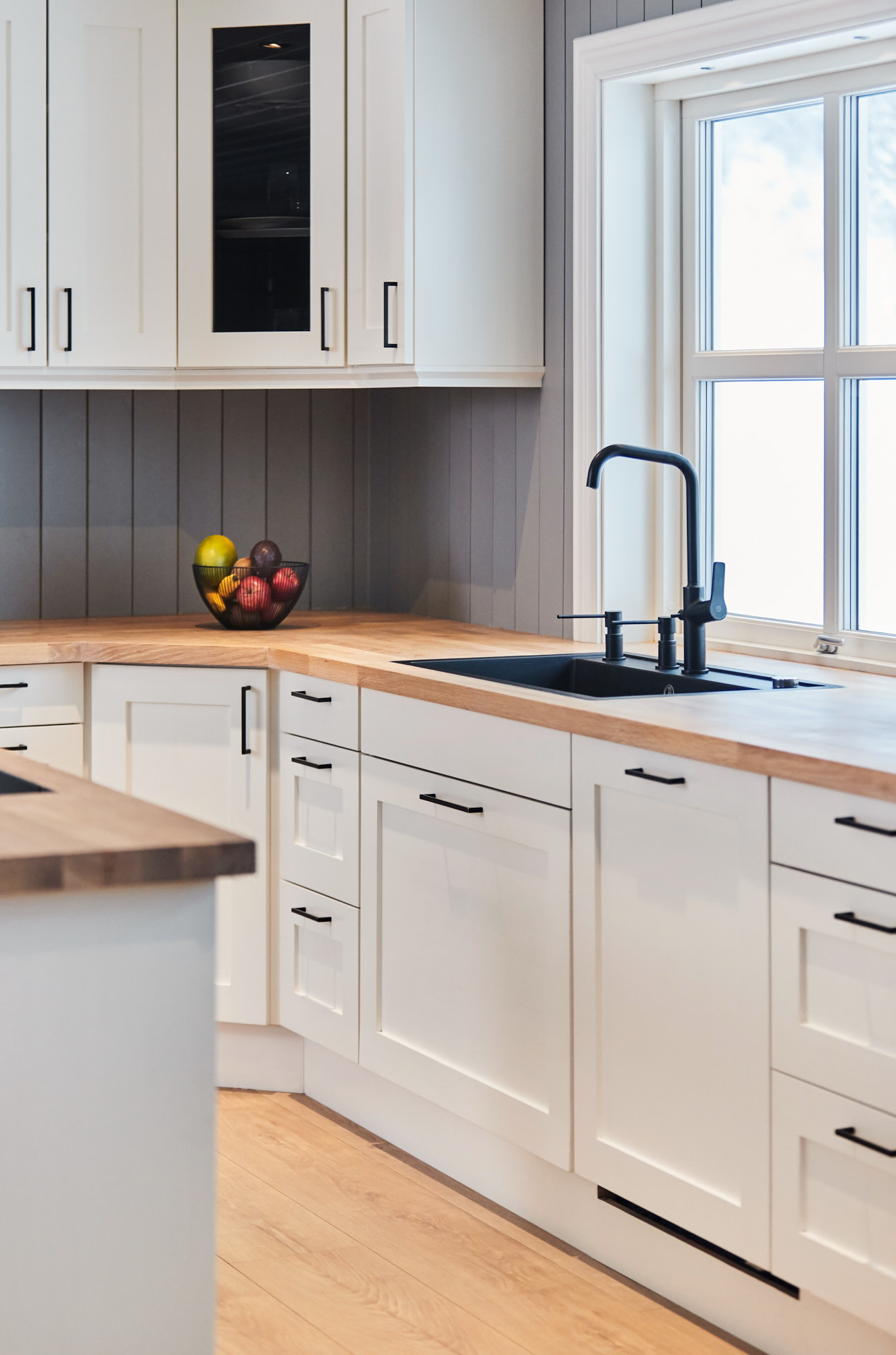 Kjøkkenet i huset er heltre fra skrog til benkeplate. Skrog, skapdører og skuffefronter er av kvistfri furu, malt i fargen Bomull. Benkelplatene er av 4 cm eik, behandlet med Osmo hvit. Ved vinduet i enden av kjøkkenet er det bygget en sittebenk med to skuffer under. Kjøkkenet har en romslig kjøkkenøy, og ellers godt med oppbevaringsplass i skuffer og høyskap, som går til tak. Fronter og dører har profilen vi kaller nr. 7.