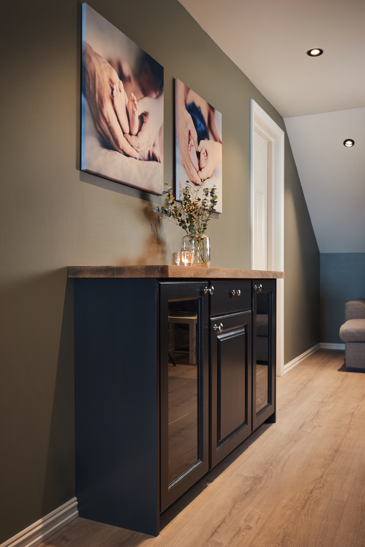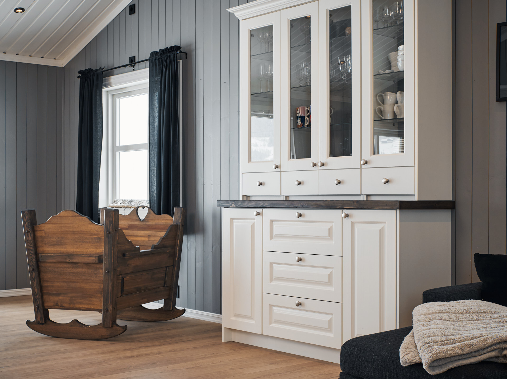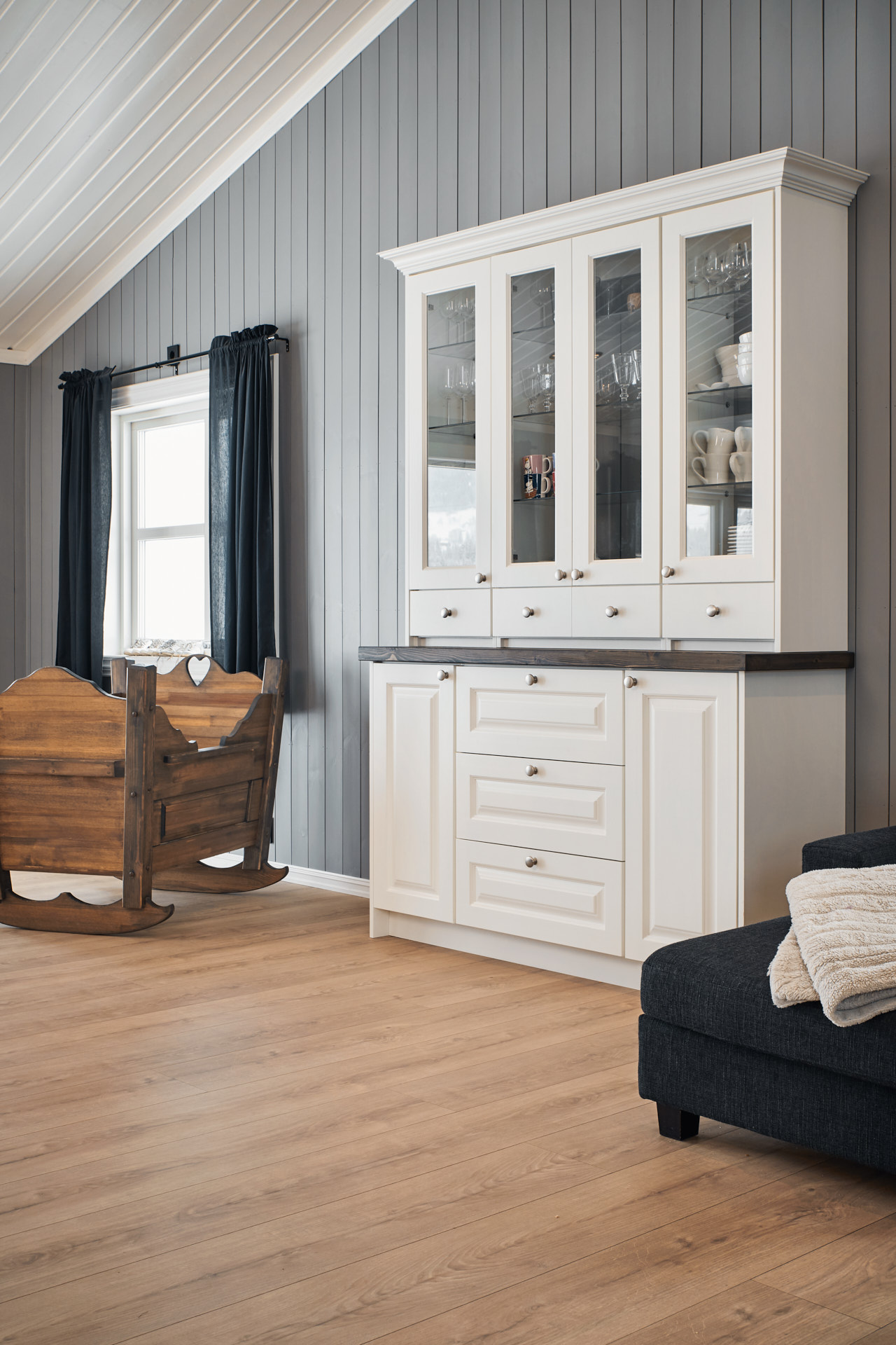 I stua er det en plassbygd TV-benk, et høyt vitrineskap og ei stor vugge. Vugga er beiset med Osmo hellegrå, vitrineskapet er i fargen bomull og TV-benken har skrog malt i Dempet sort og benkeplate av eik behandlet med Osmo hvit.