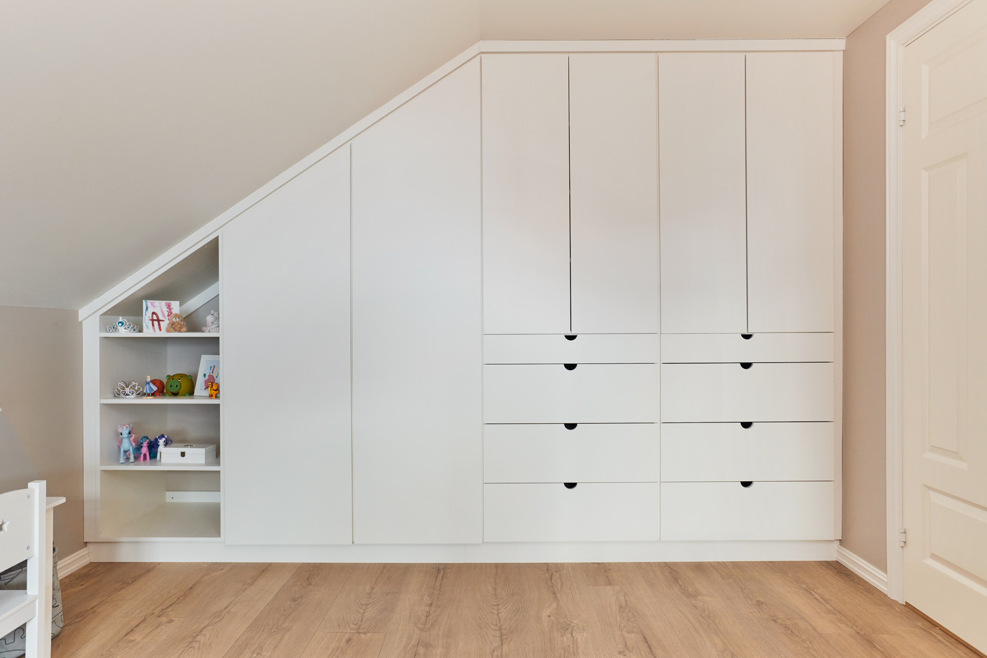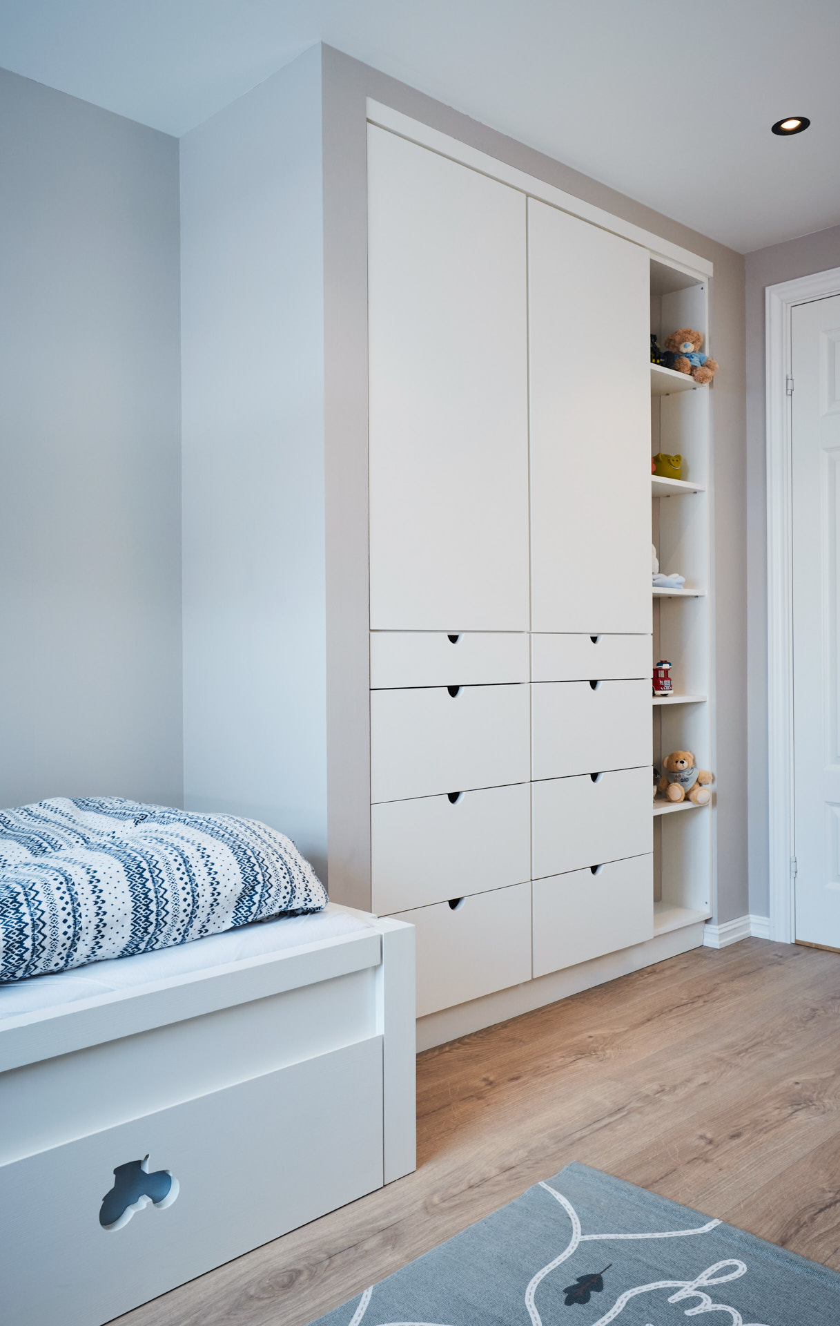 På barnerommene finnes plassbygde garderobeskap, med fronter av solid valchromat. Barnesengene er av furu og har to store skuffer til oppbevaring i bunnen. All innredning på barnerommene har fargen Bomull.