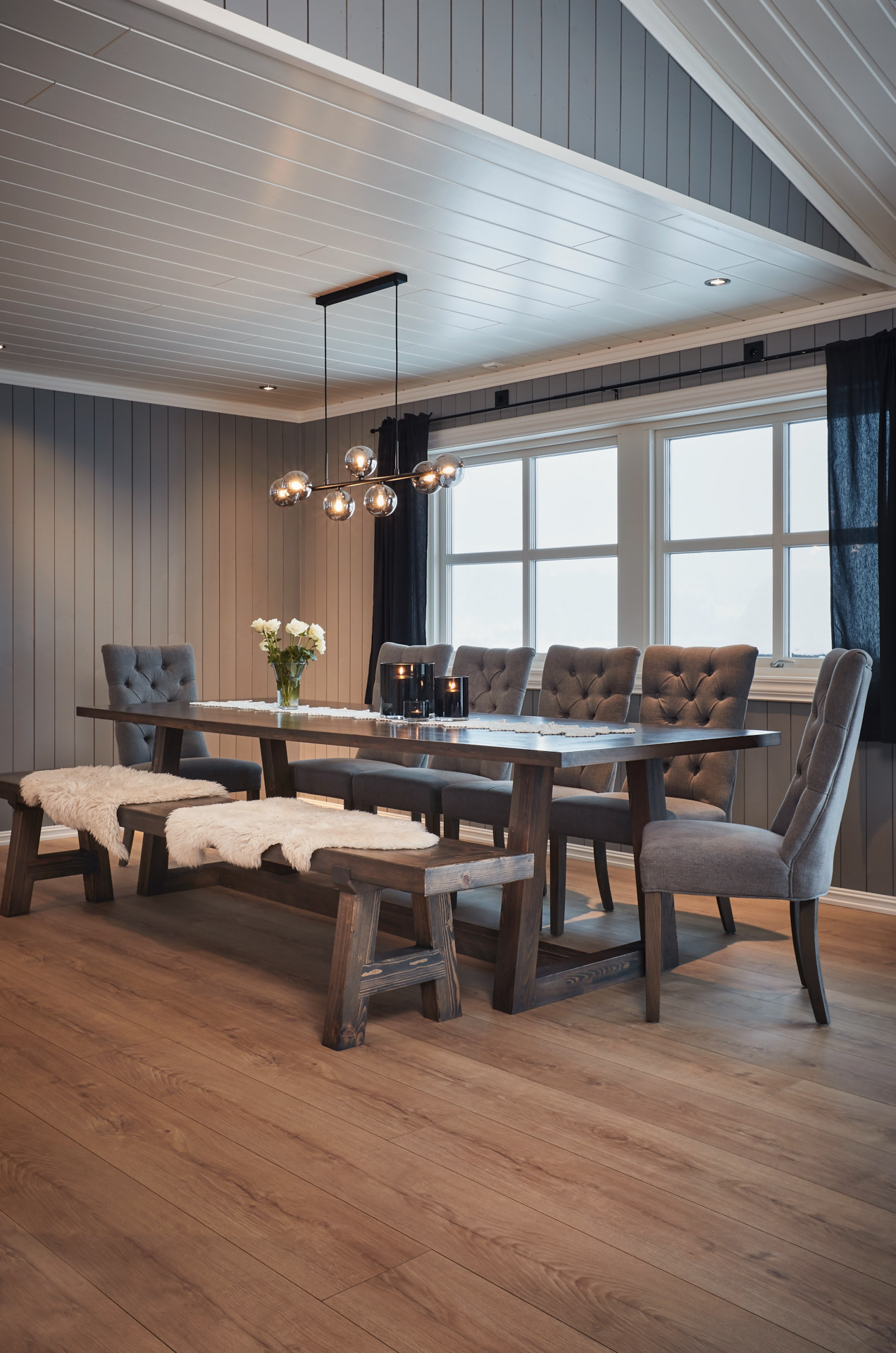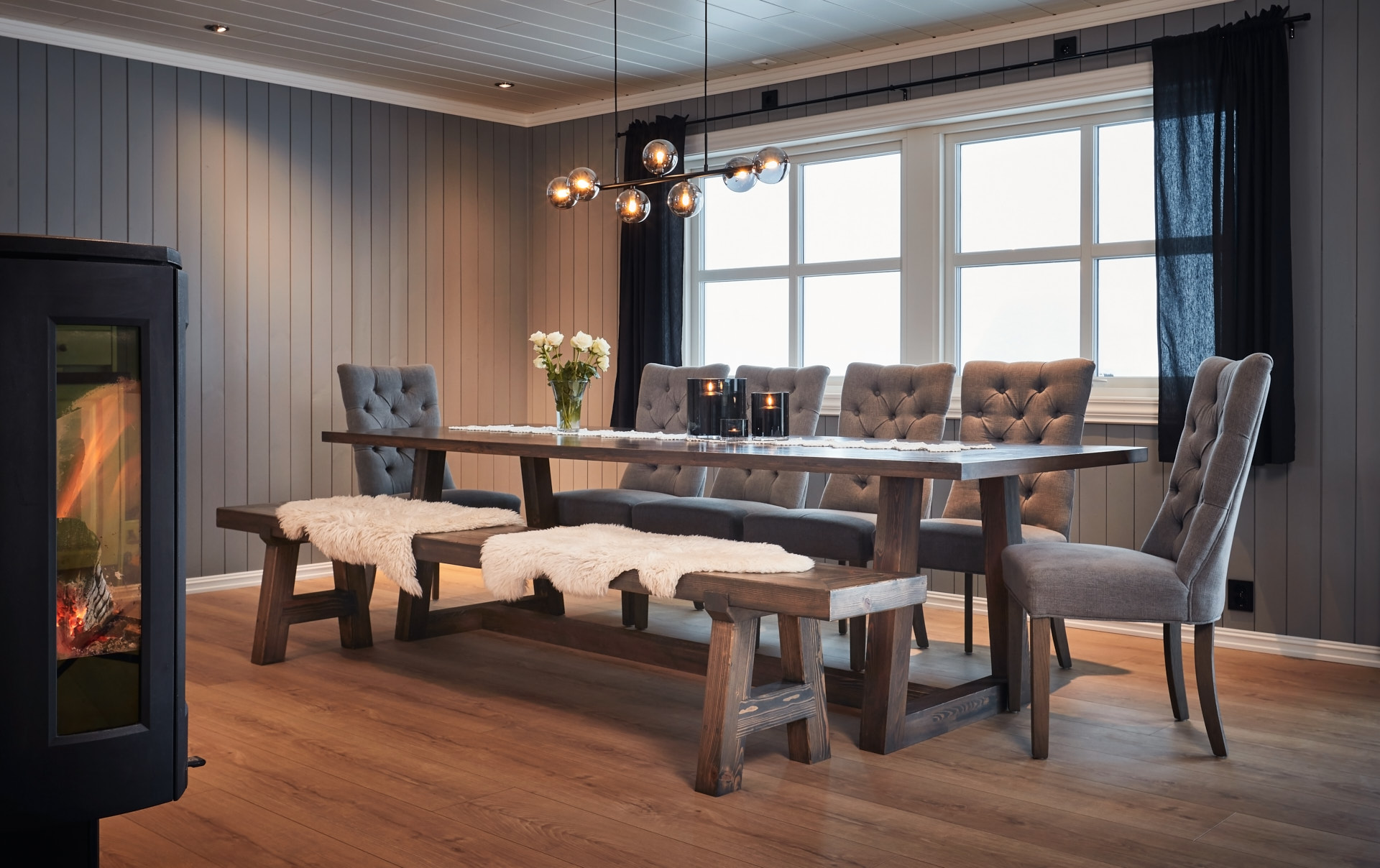 Til spisestuen er det laget et bord som er 270 cm langt, med tilhørende sittebenk. Disse er laget av furu og beiset med Osmo hellegrå.