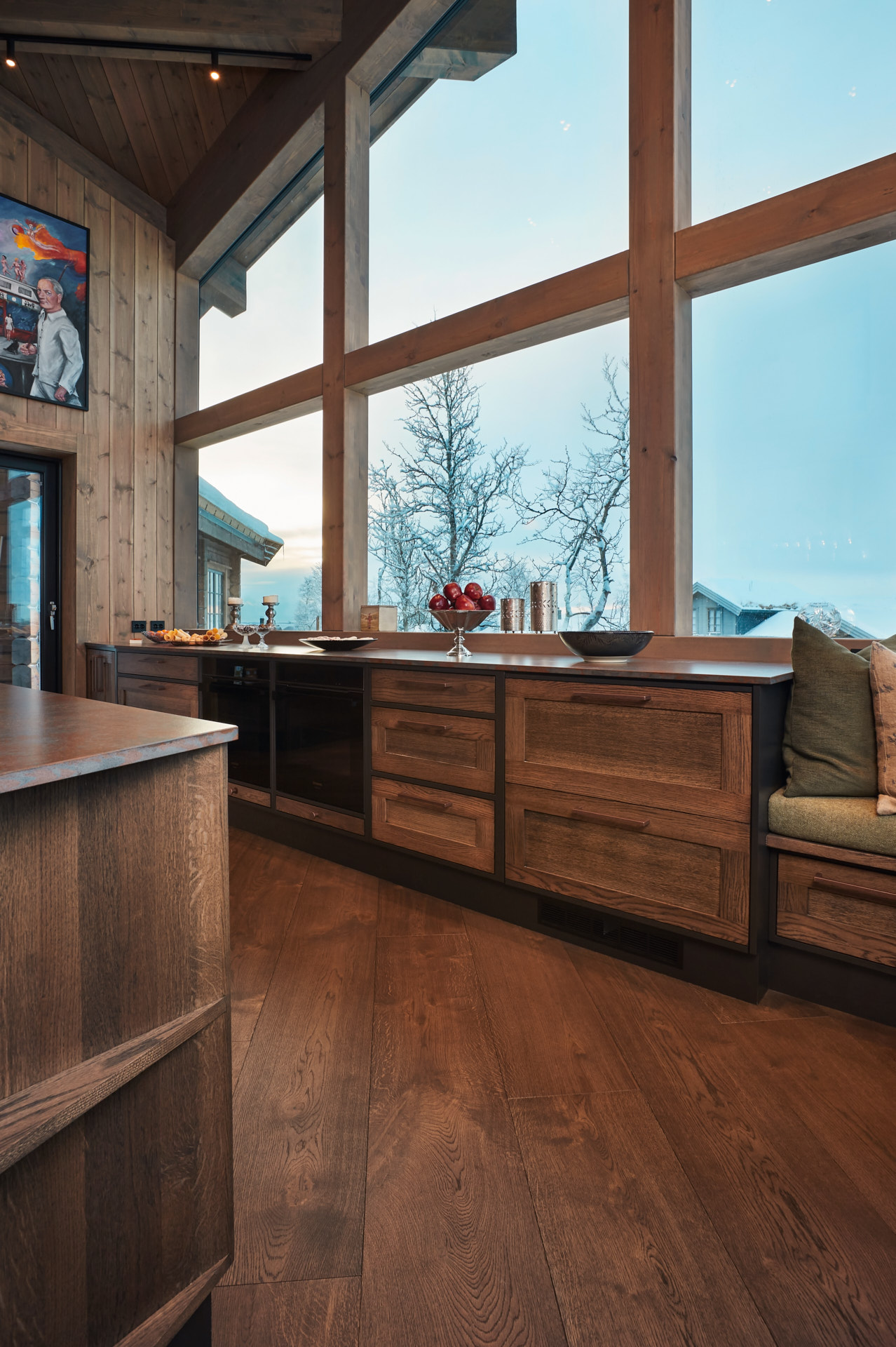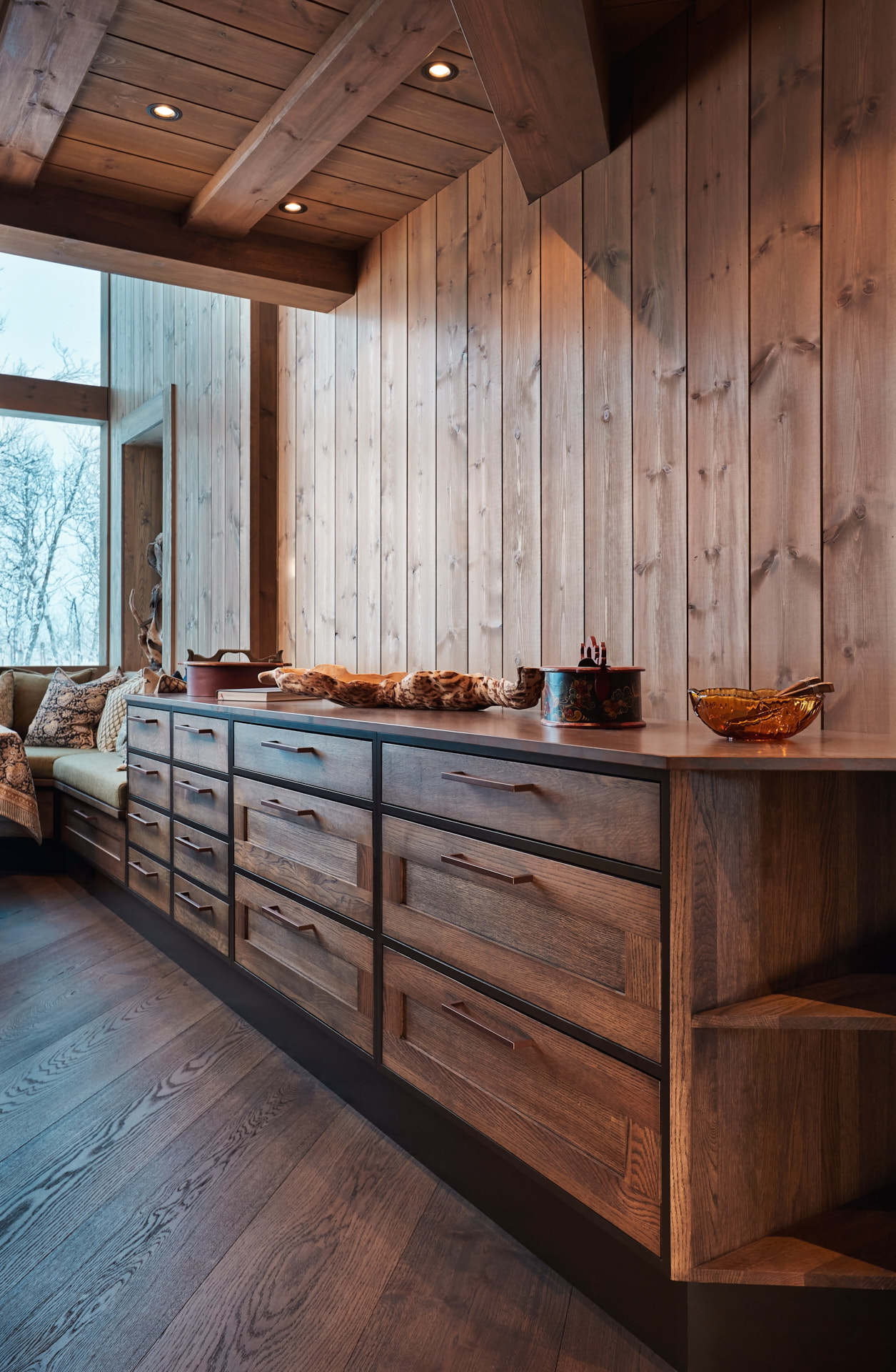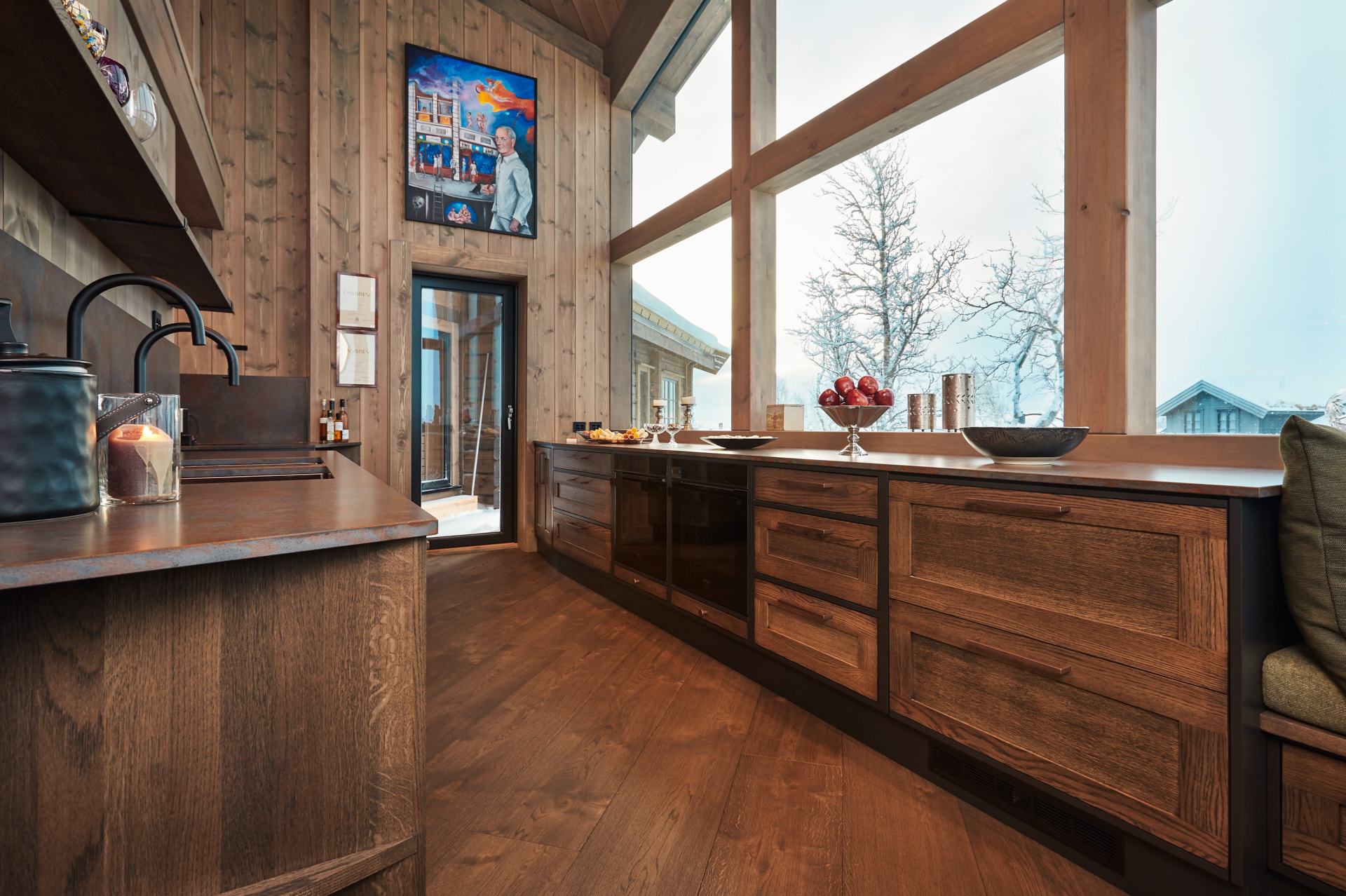 Et prosjekt med stor variasjon og spennende tilpasninger. I denne store hytta har vi levert innredning til alle rom. Hytta er bygget for å romme et helt eget matkonsept.