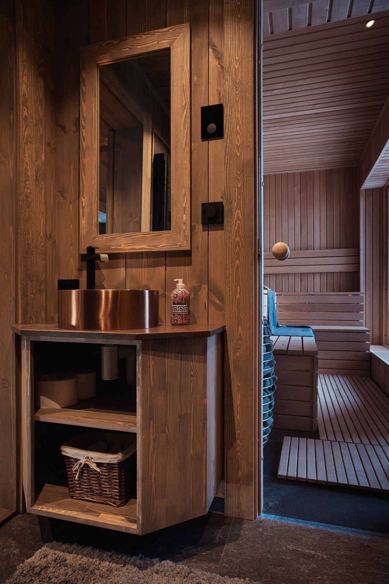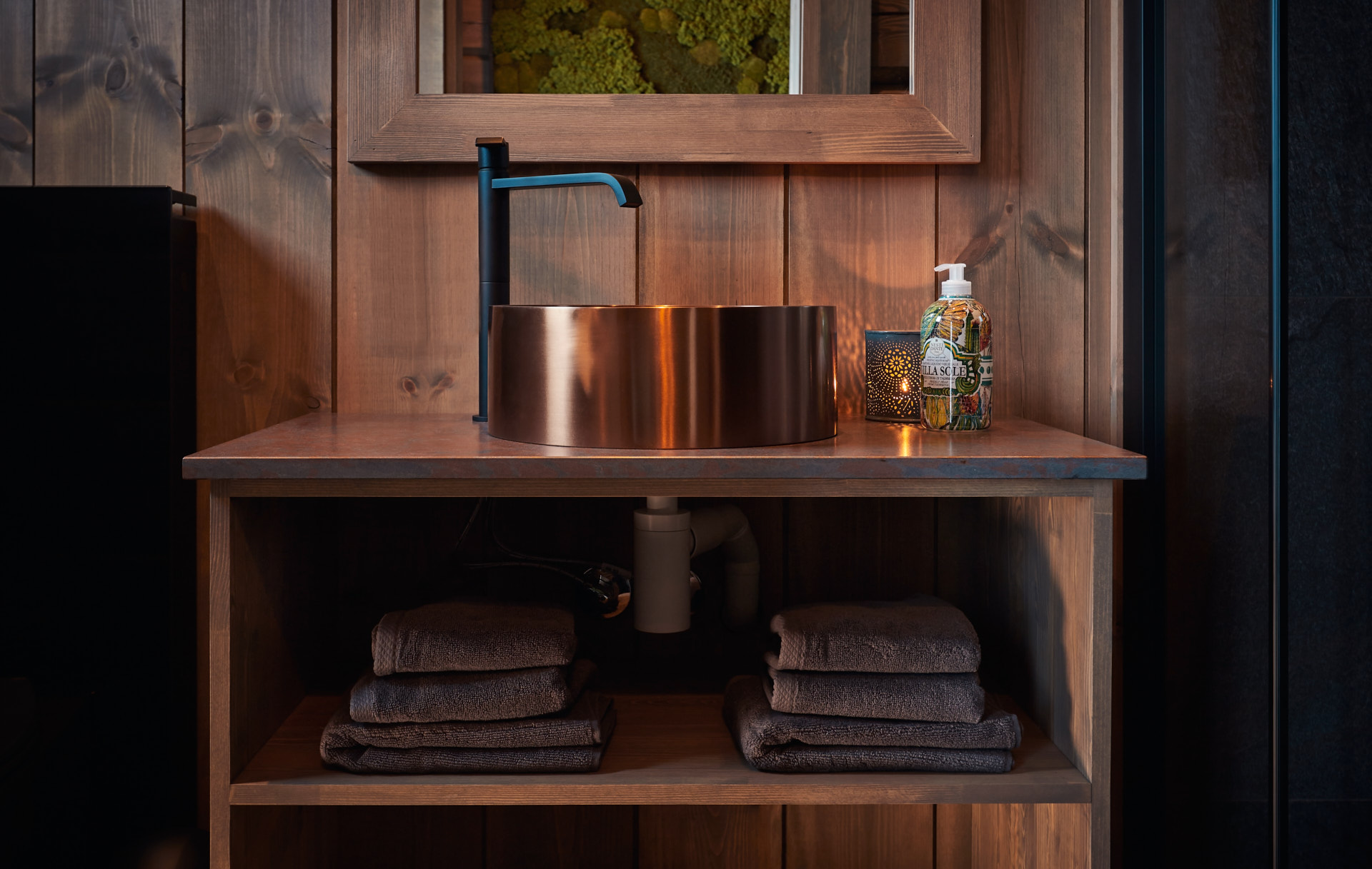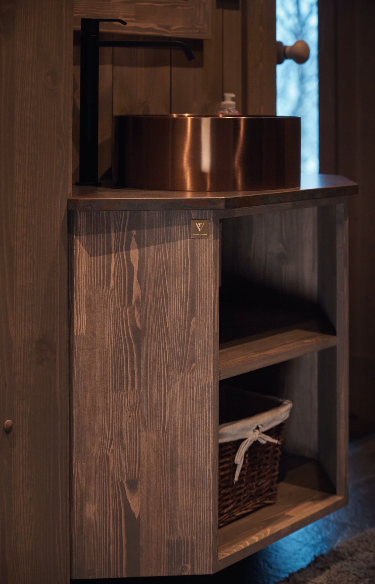 Hvert av soverommene har eget bad. Til disse har vi laget servantskap og speil med ramme i samme materiale og farge som innredningen. Materialet er kvistfri furu, beiset med Osmo, fargen Fjell. Steinplaten på topp er samme som på kjøkkenet.
