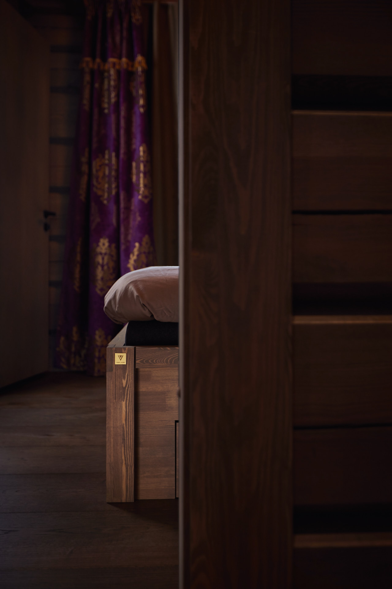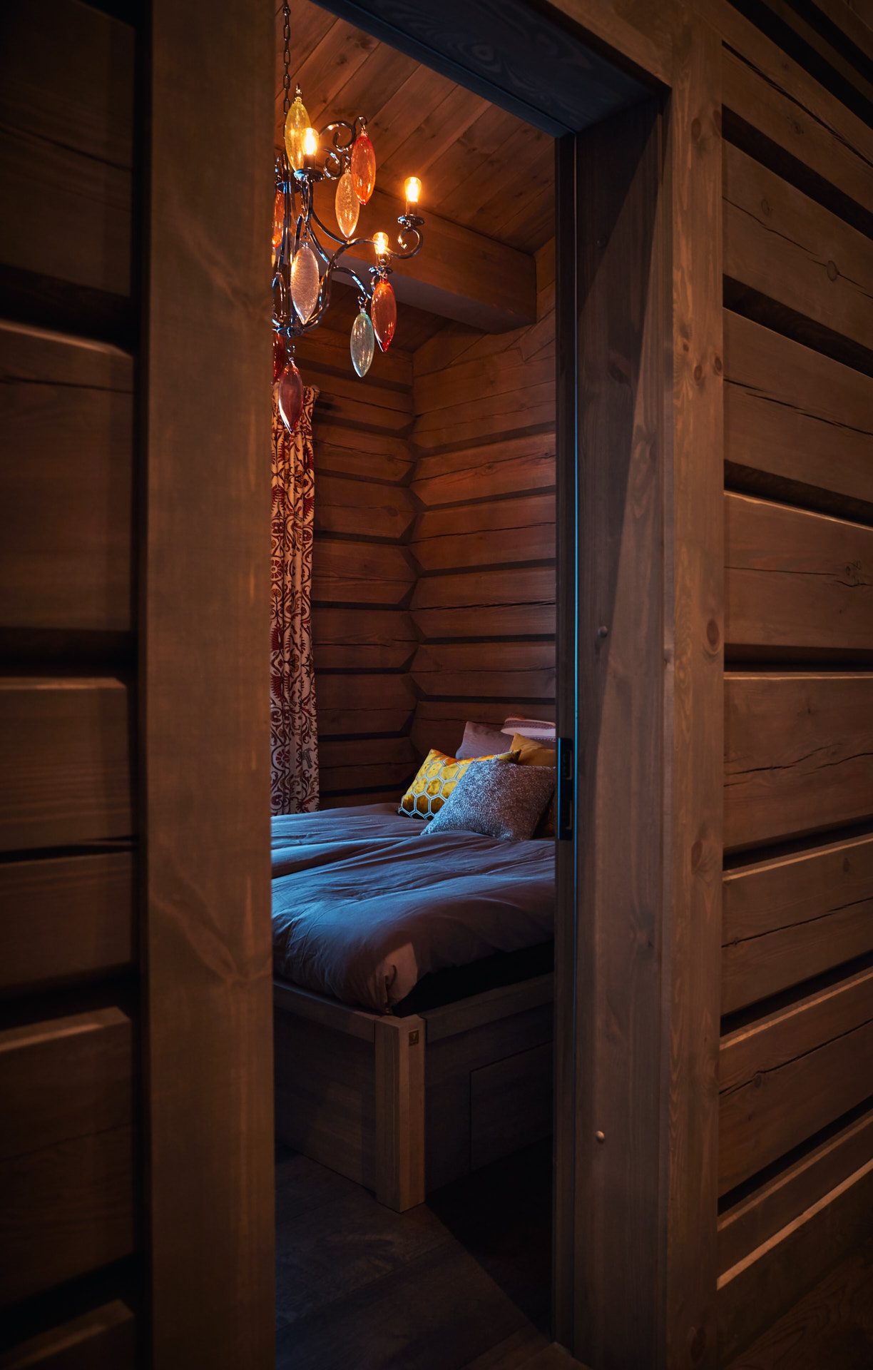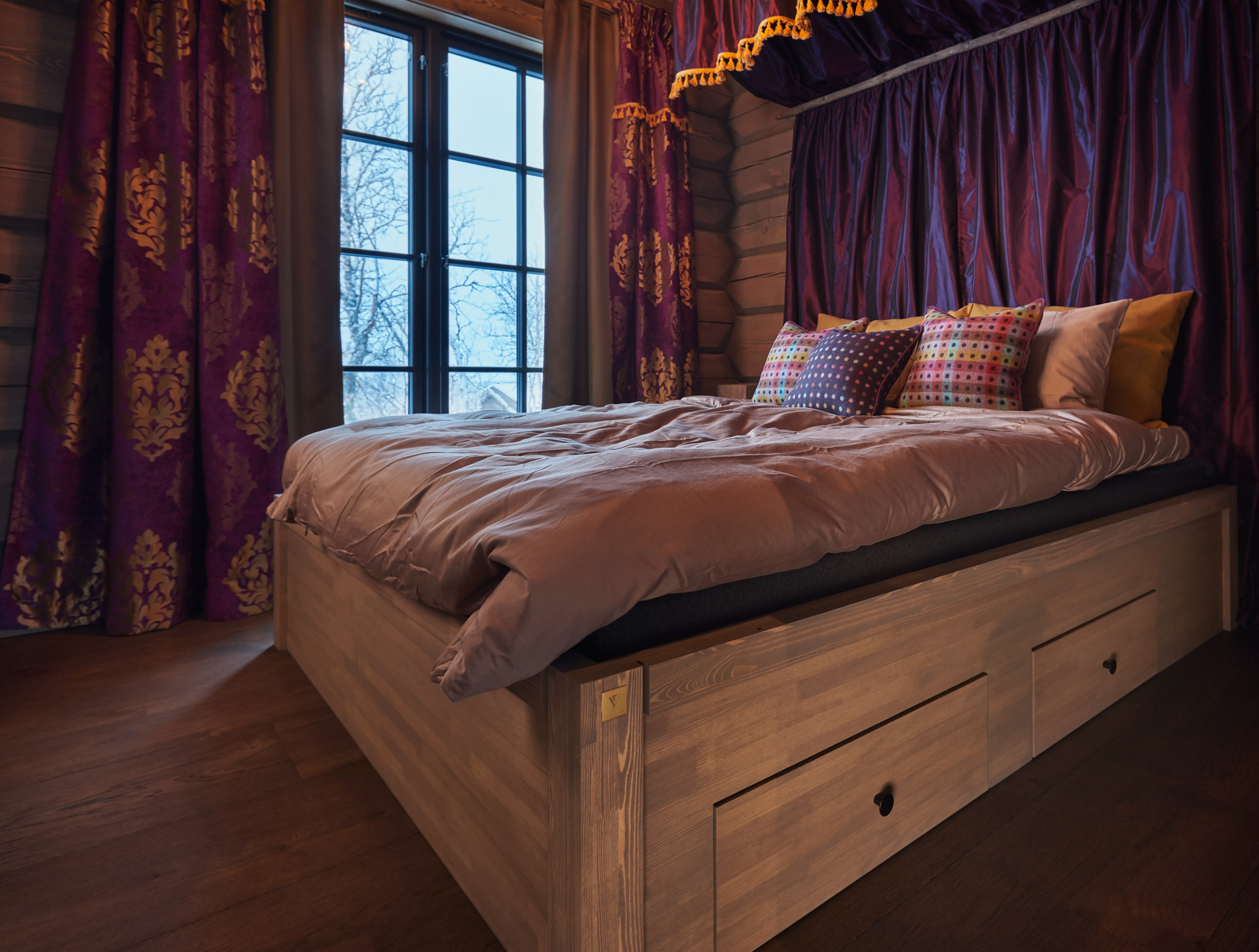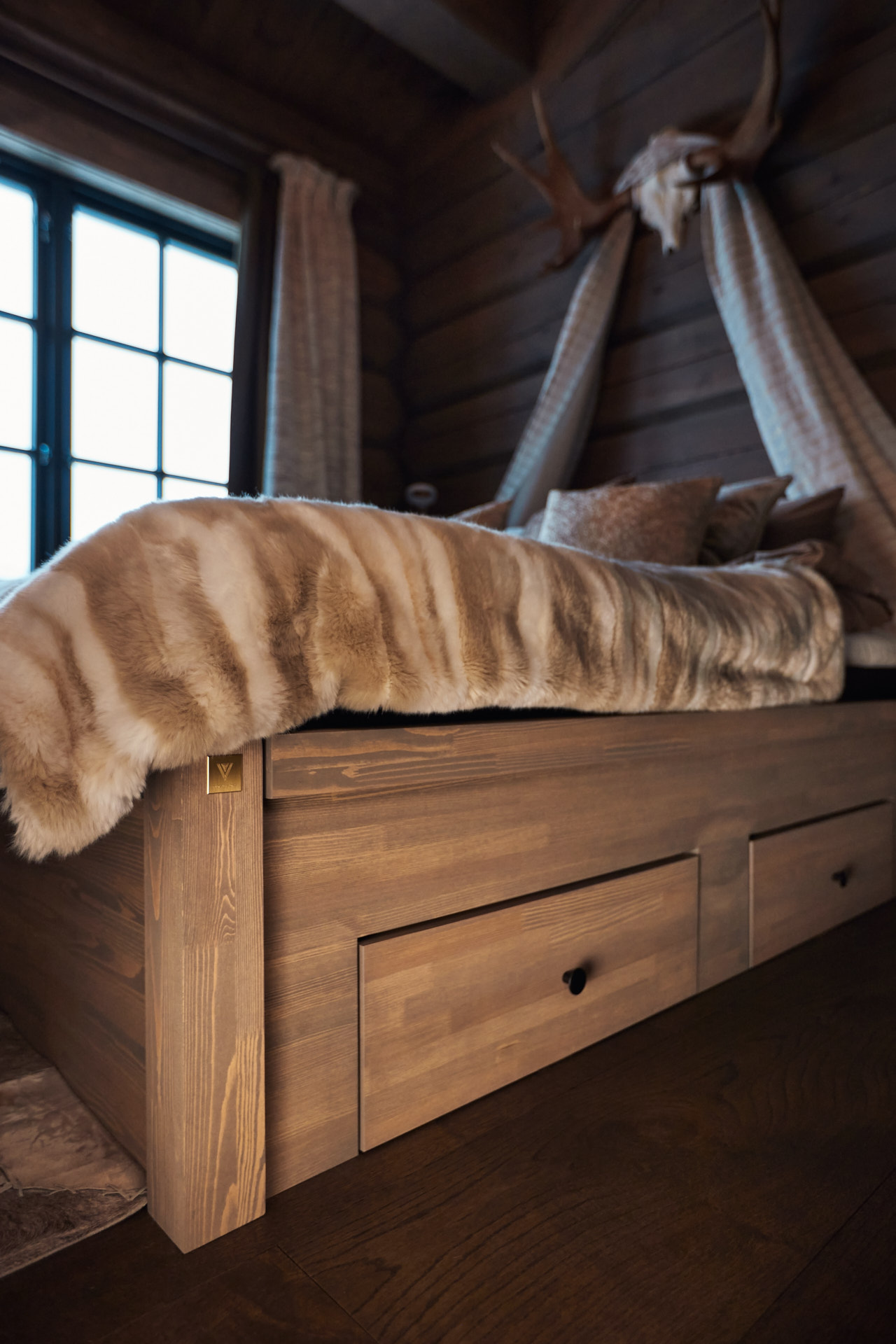 Her er det mange soverom og hvert av disse er utstyrt med senger laget av helstav furu, beiset med Osmo, farge Fjell. Sengene har også skuffer til oppbevaring i bunn.