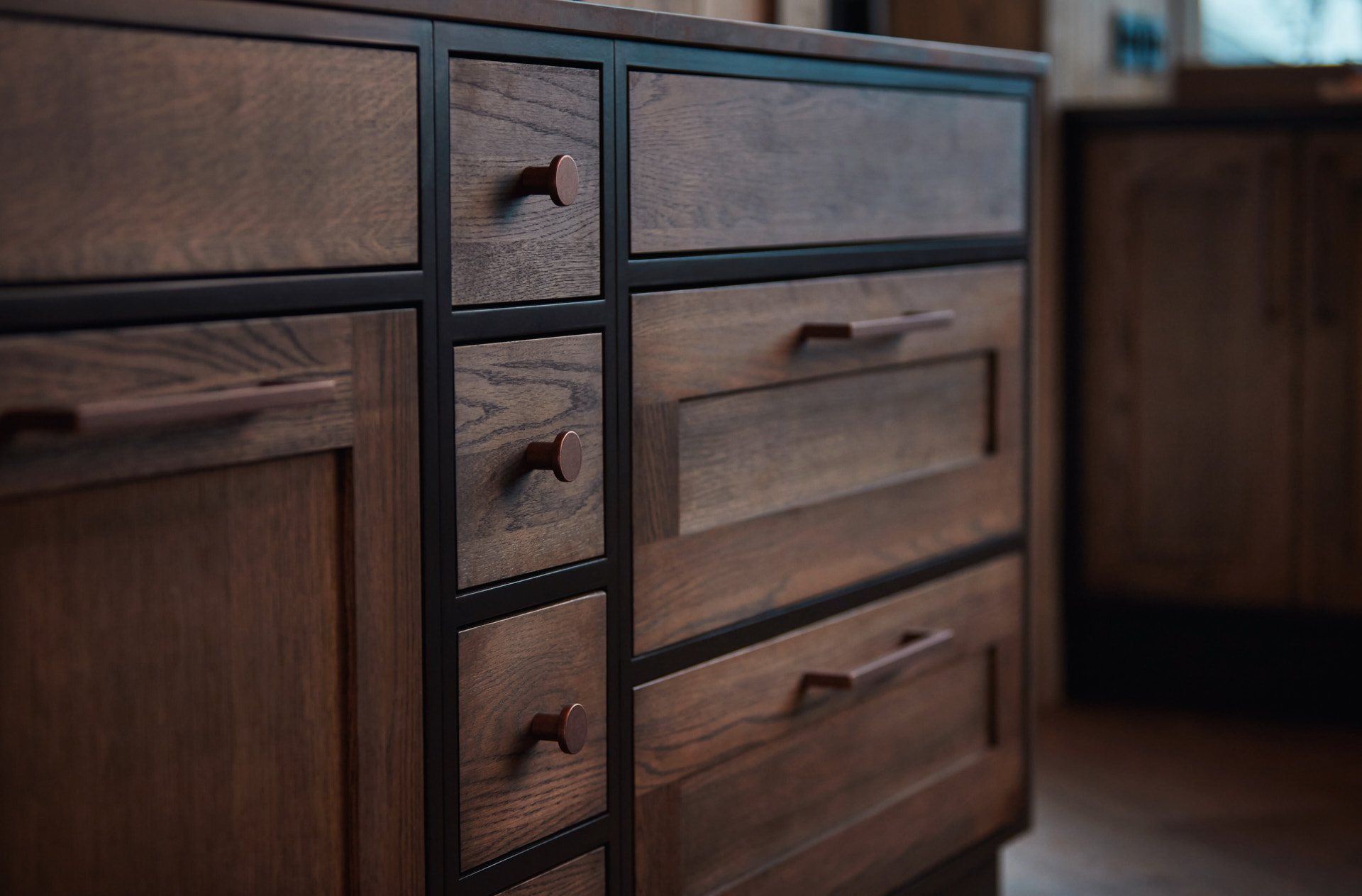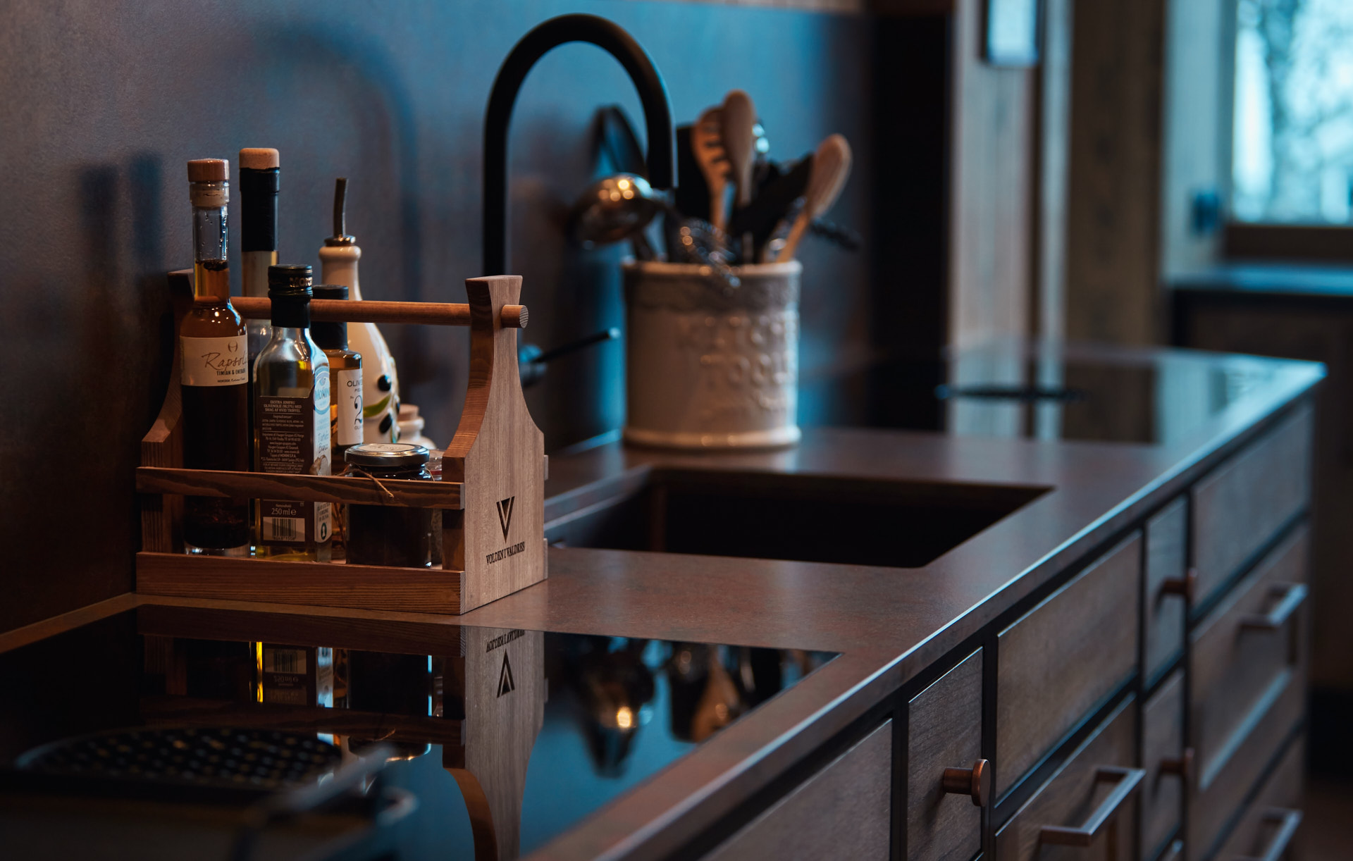 Alle fronter og skap er av helstav eik, som er behandlet med Osmo dekorvoks, fargen sort. Skrogene er laget av kvistfri furu og malt i sort. Benkeplaten er av stein.