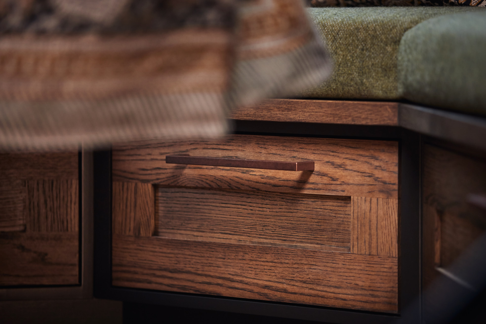 Langs hele rommet er det benk med sitteplasser, med oppbevaringsplass under. Fronter på skuffene har samme utførelse som på kjøkkenet; helstav eik, behandlet med Osmo fargen sort.