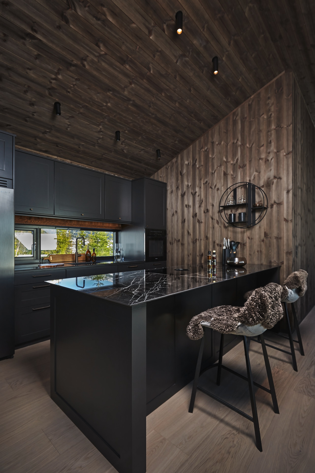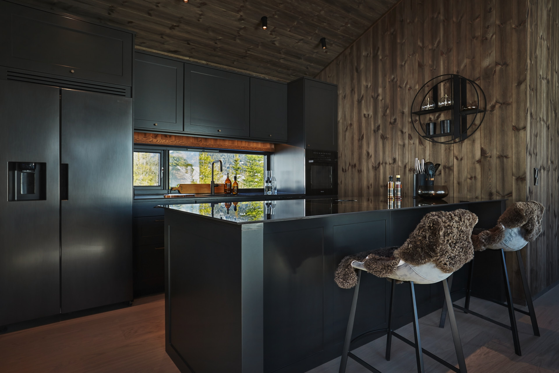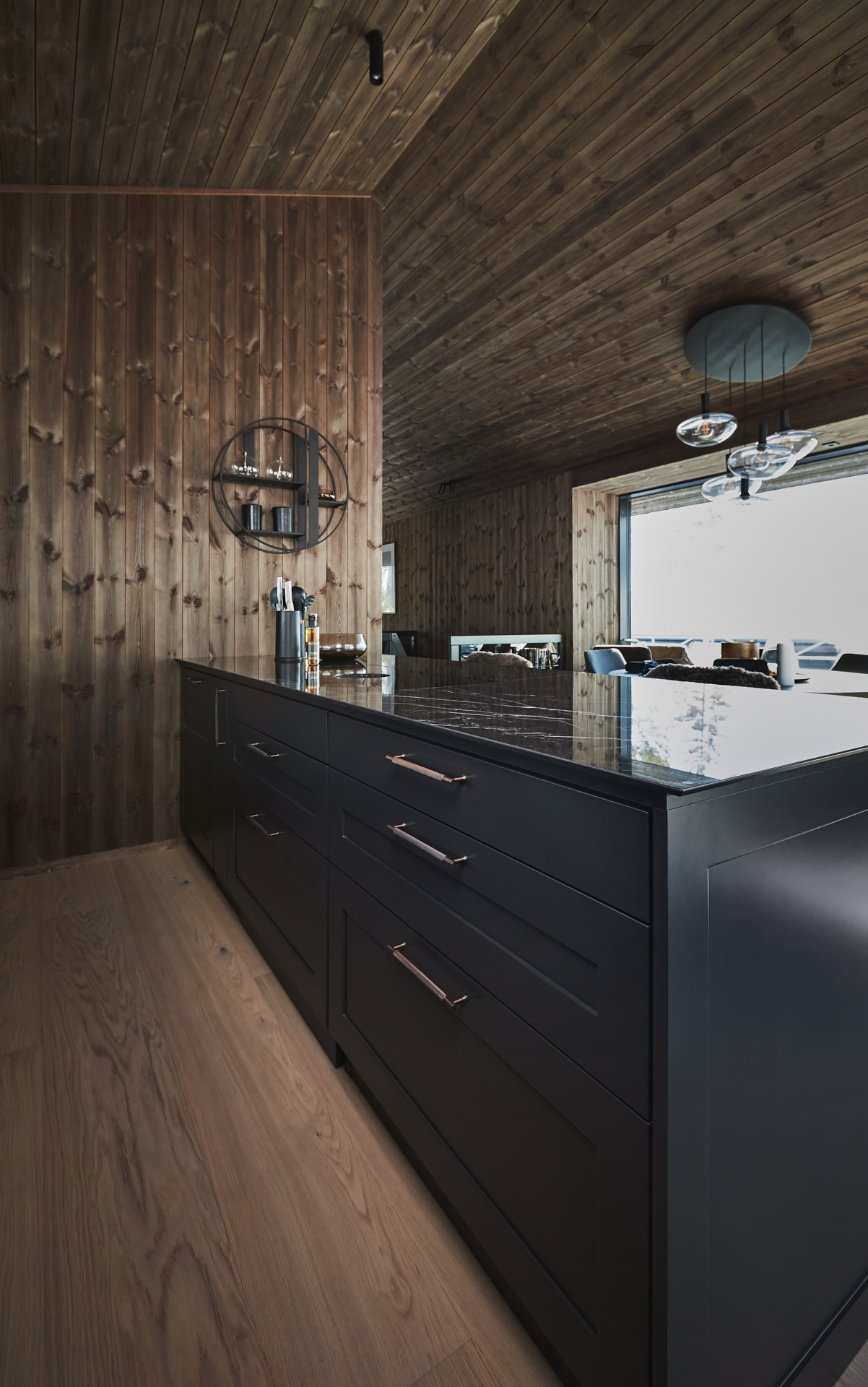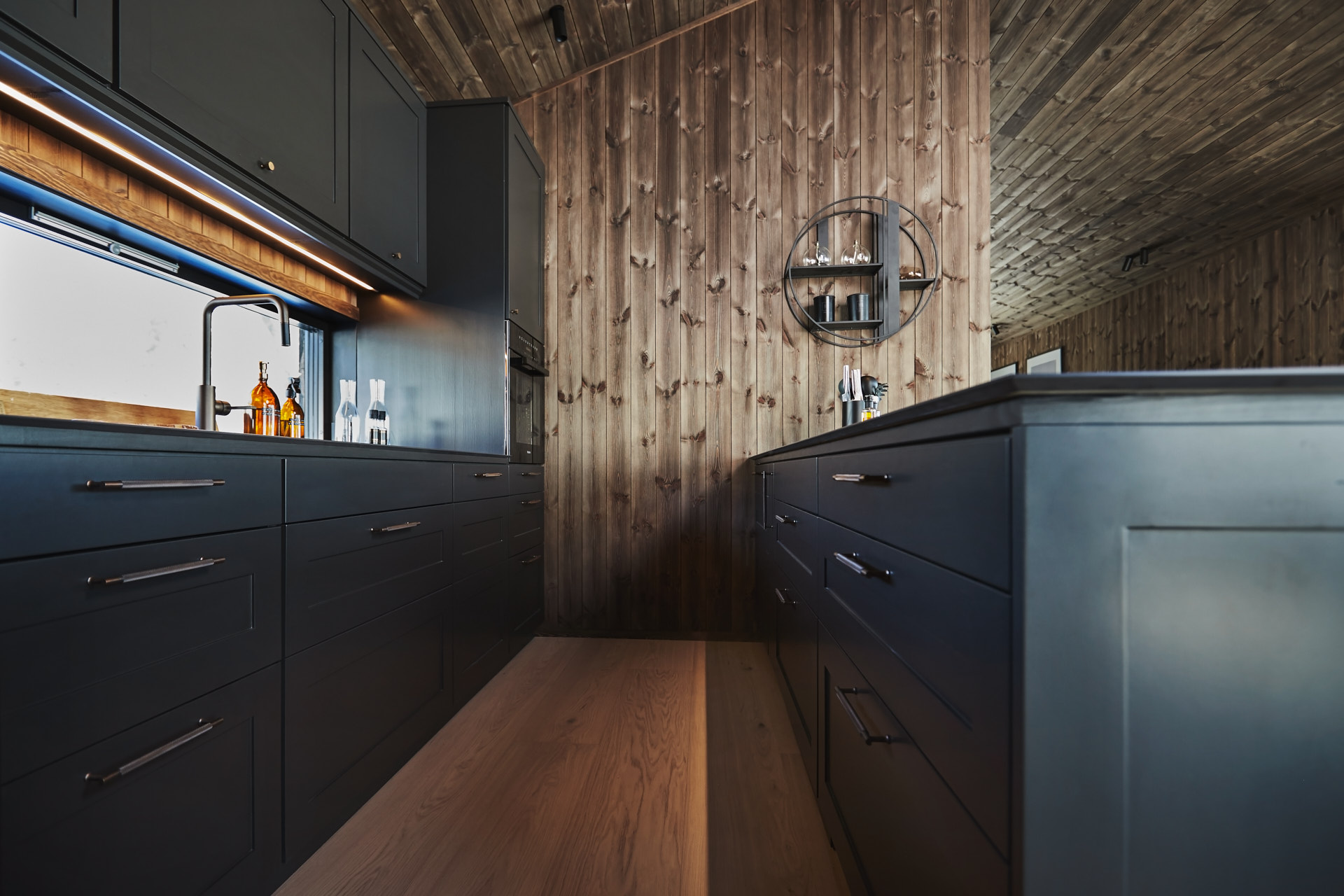 Skreddersydd hytteinnredning. Tilpasset rommene, både praktisk og visuelt. Bygget i moderne stil, med mørke og sofistikerte farger.
