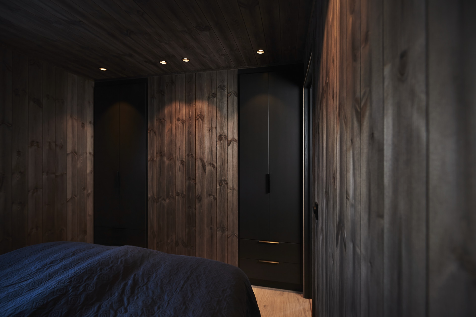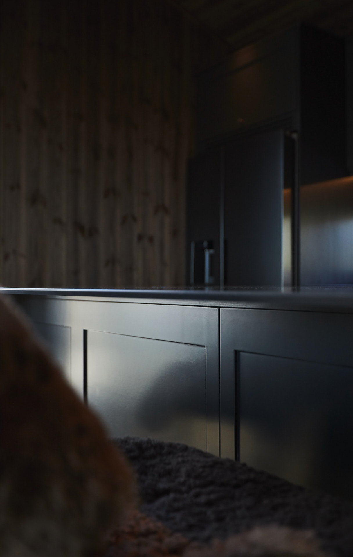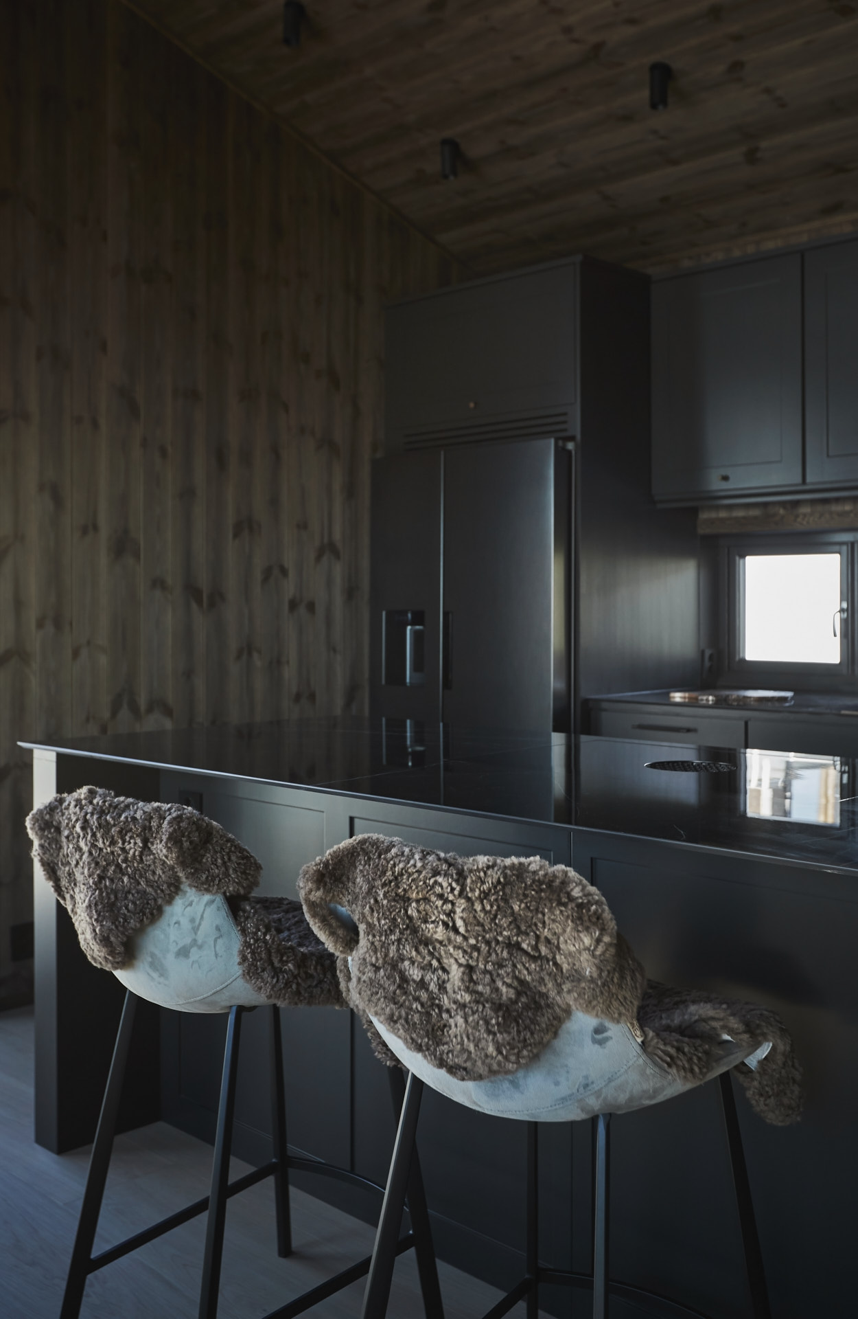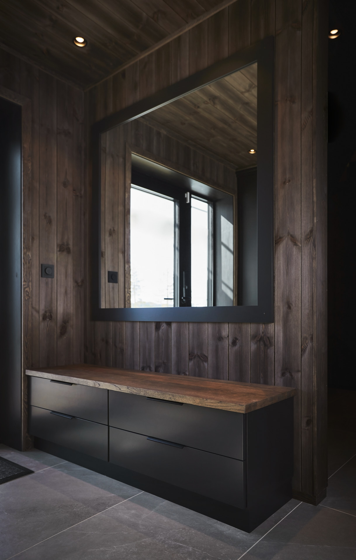 Skreddersydd hytteinnredning. Tilpasset rommene, både praktisk og visuelt. Bygget i moderne stil, med mørke og sofistikerte farger.