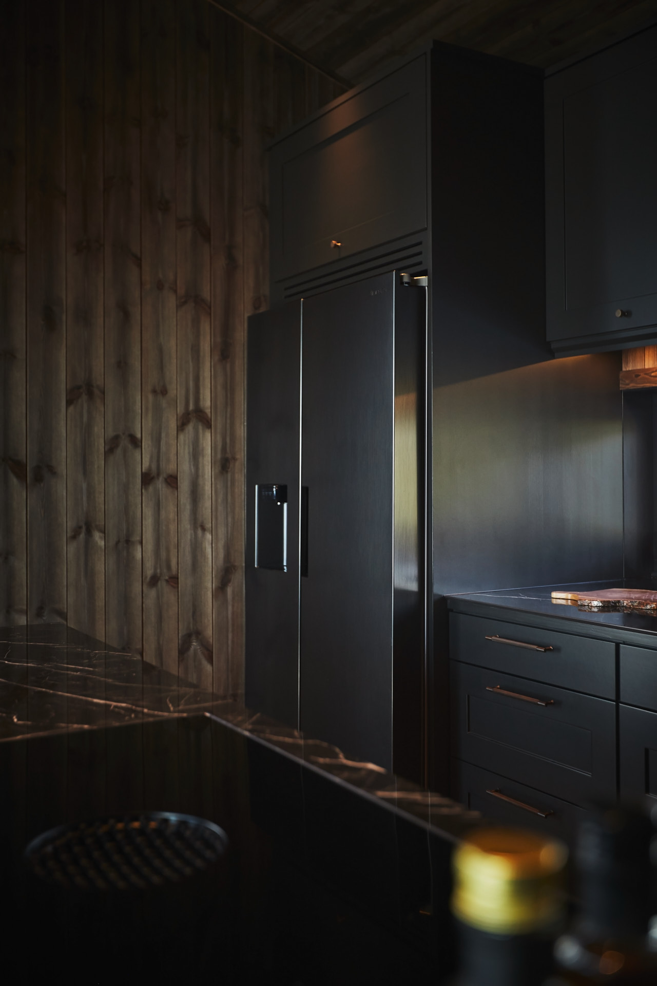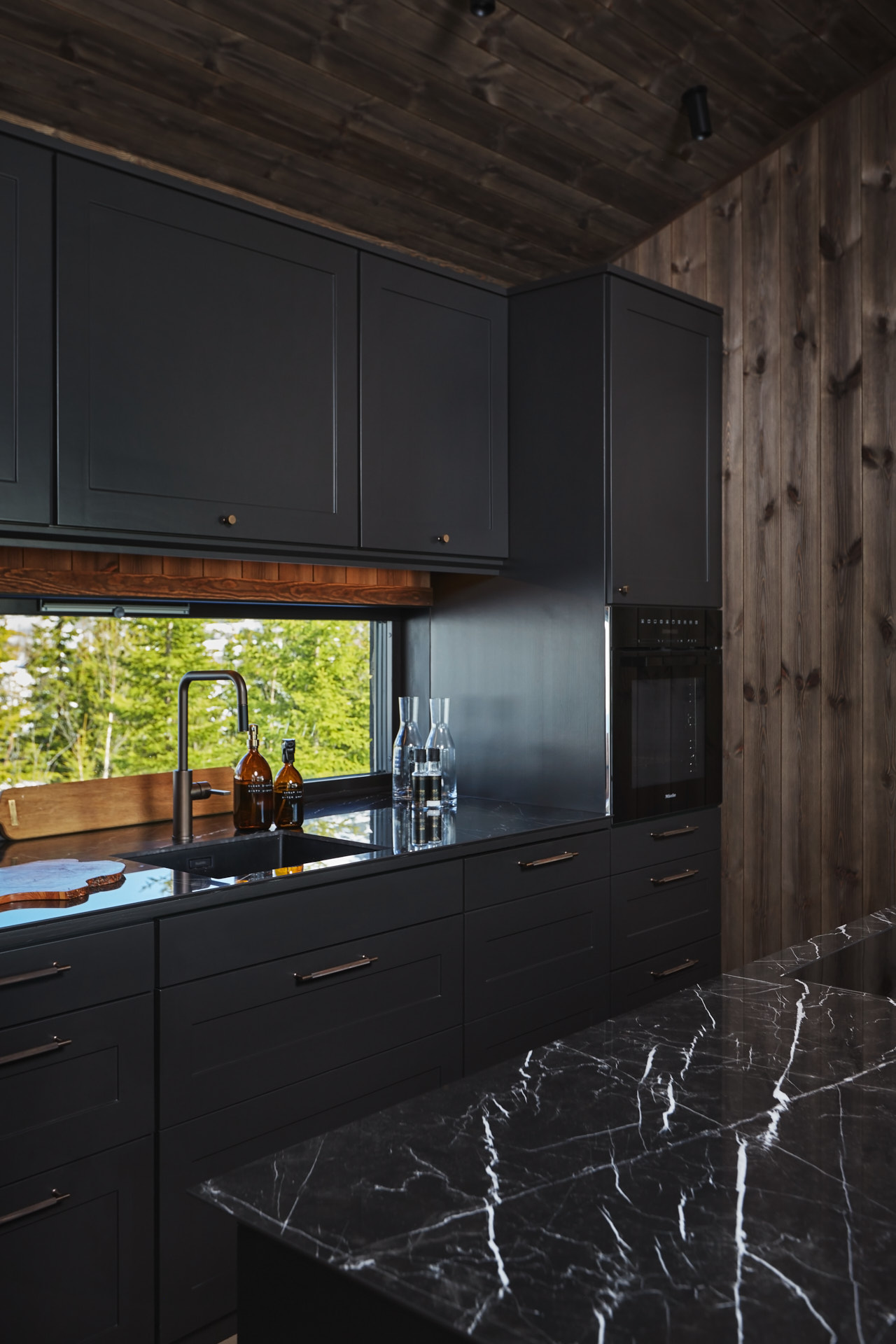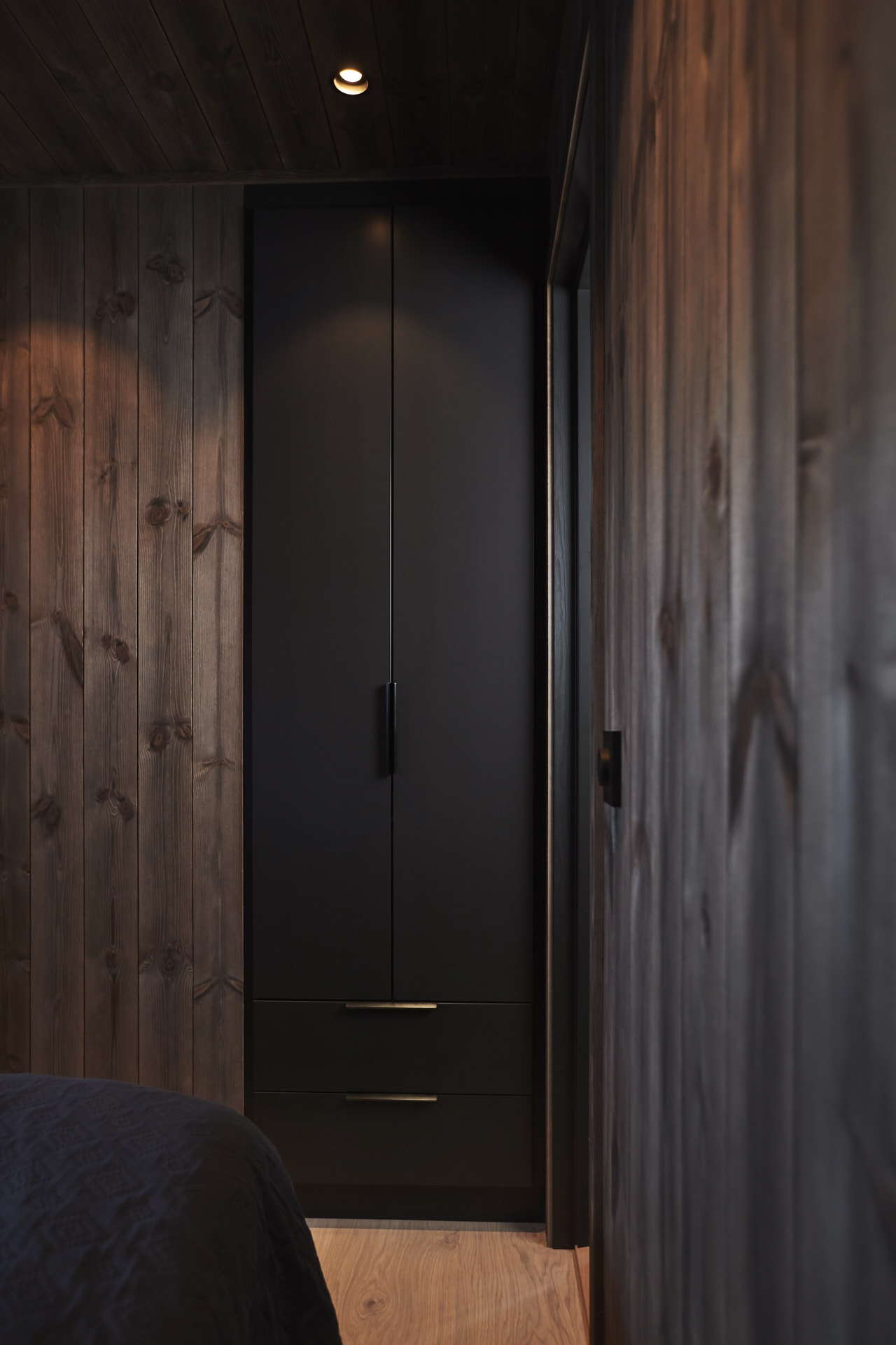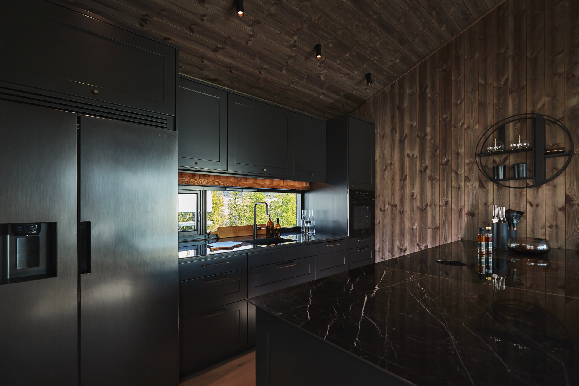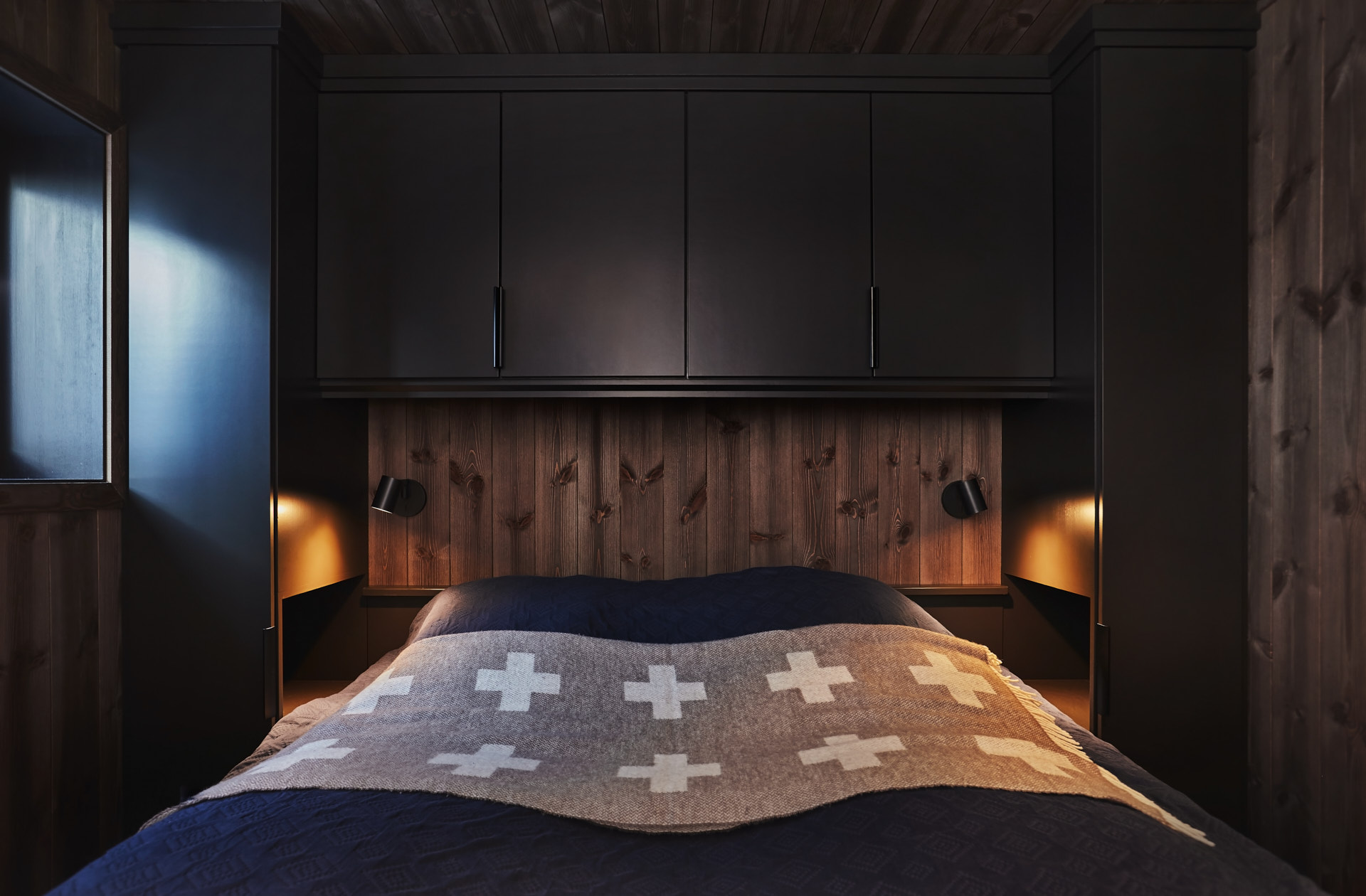 Skreddersydd hytteinnredning. Tilpasset rommene, både praktisk og visuelt. Bygget i moderne stil, med mørke og sofistikerte farger.