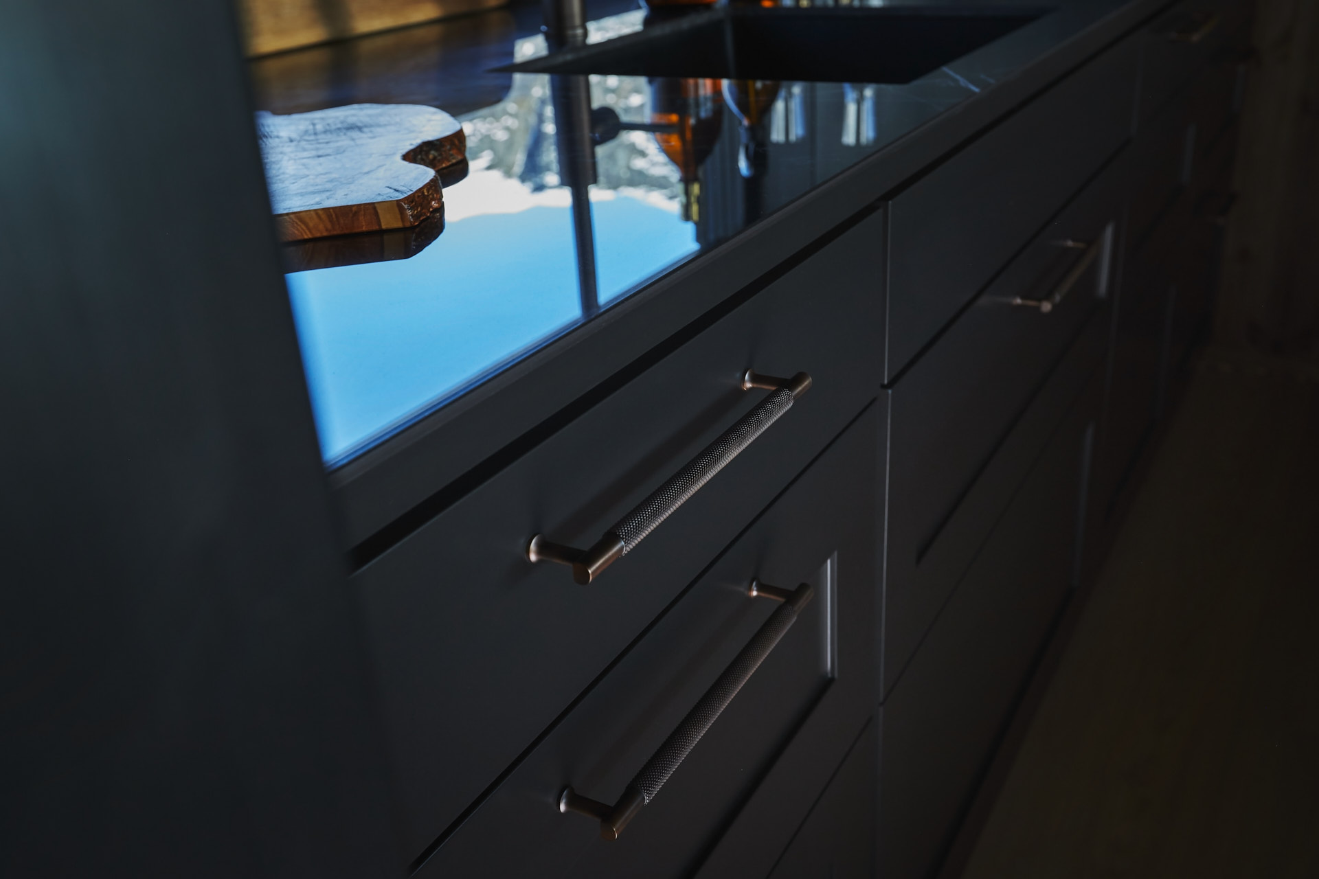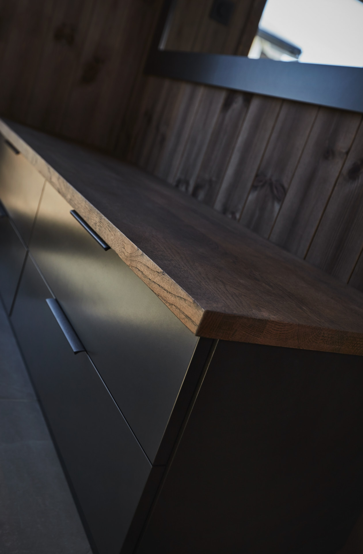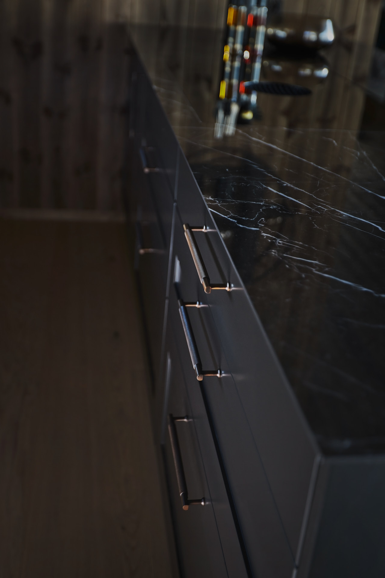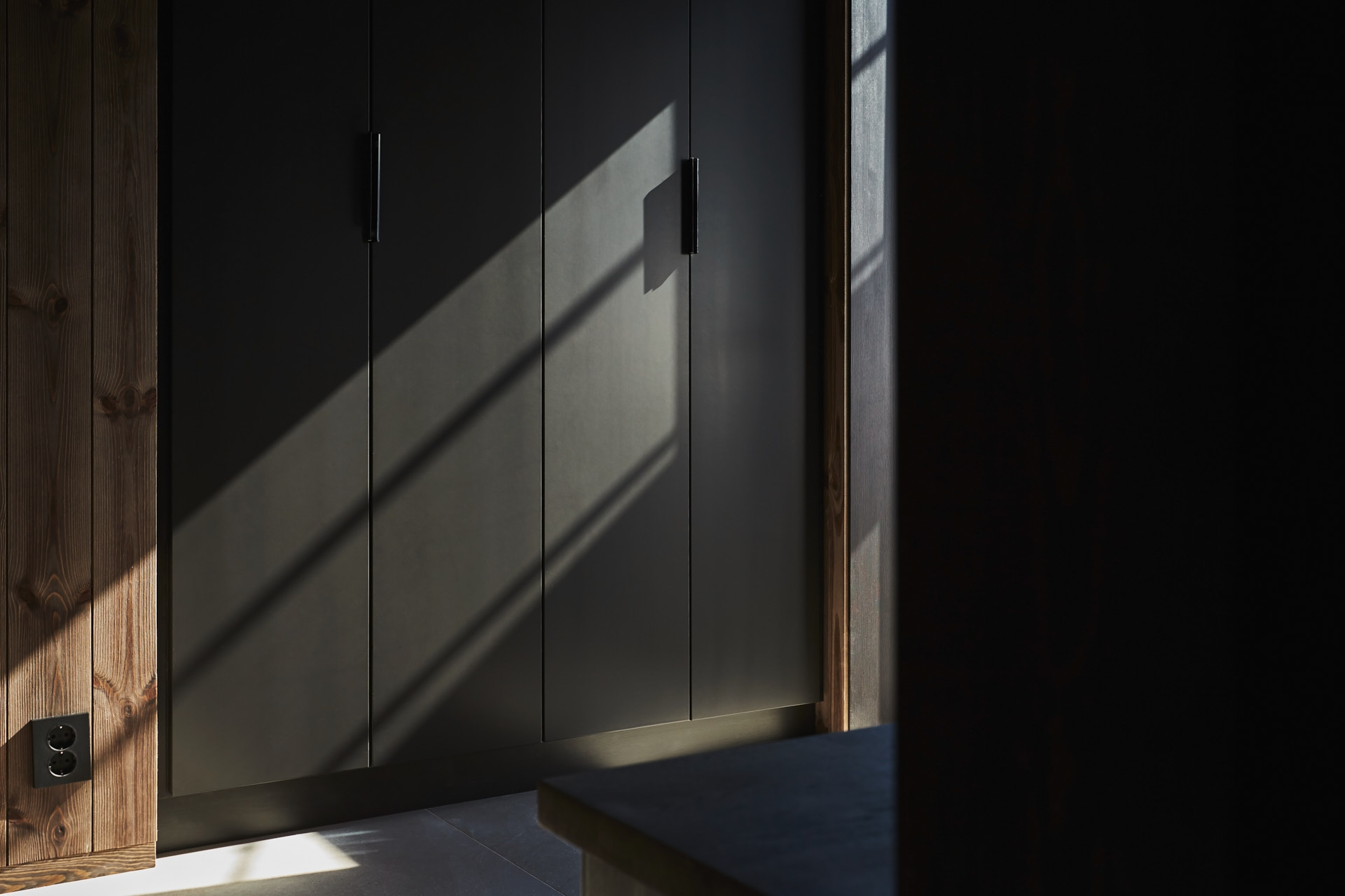 Skreddersydd hytteinnredning. Tilpasset rommene, både praktisk og visuelt. Bygget i moderne stil, med mørke og sofistikerte farger.